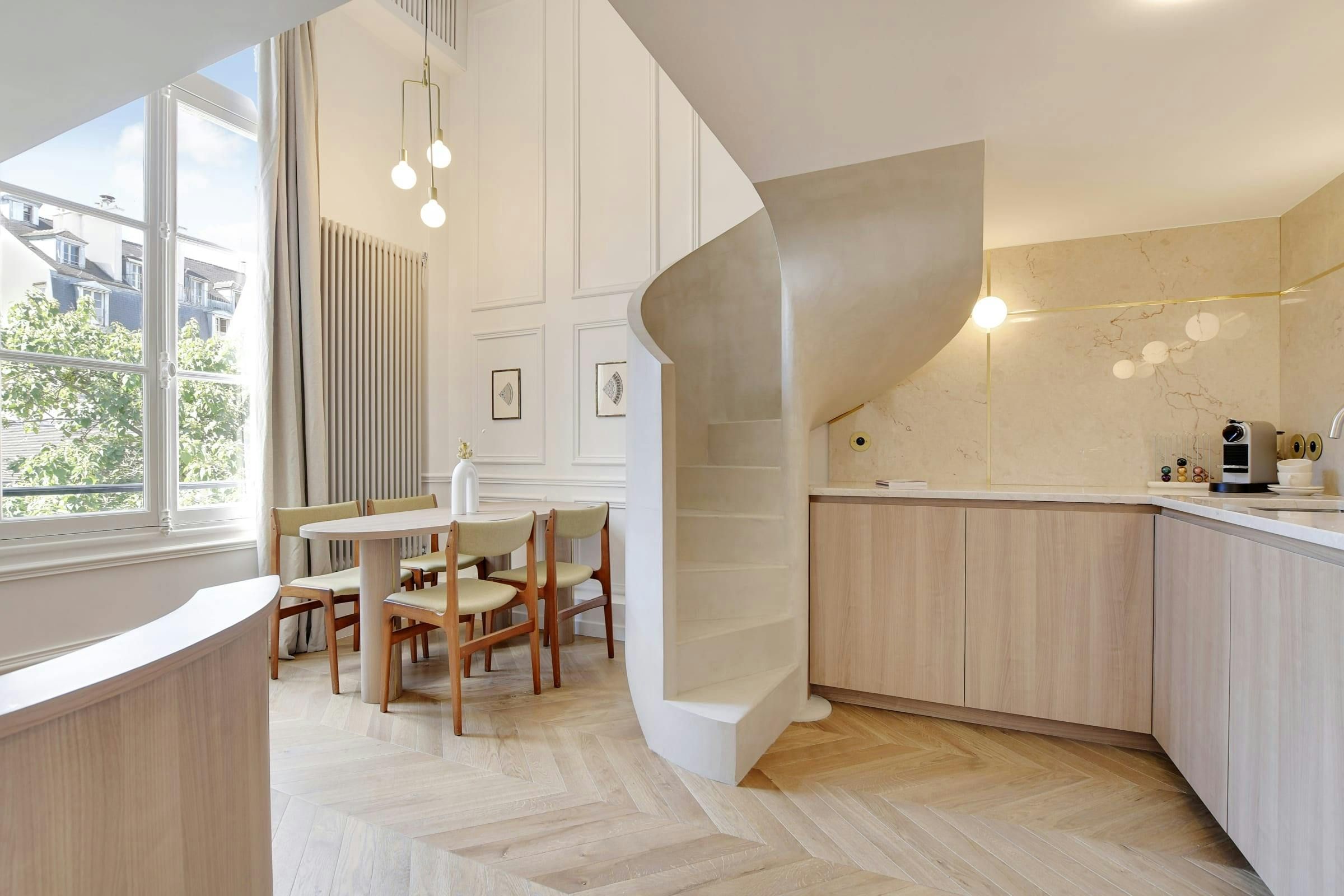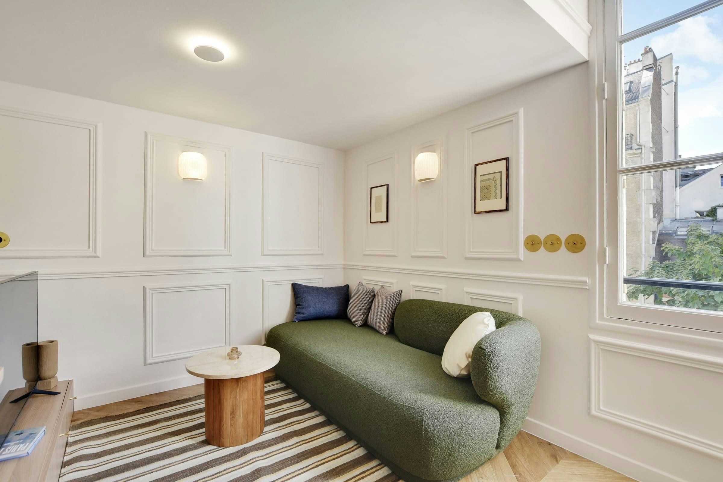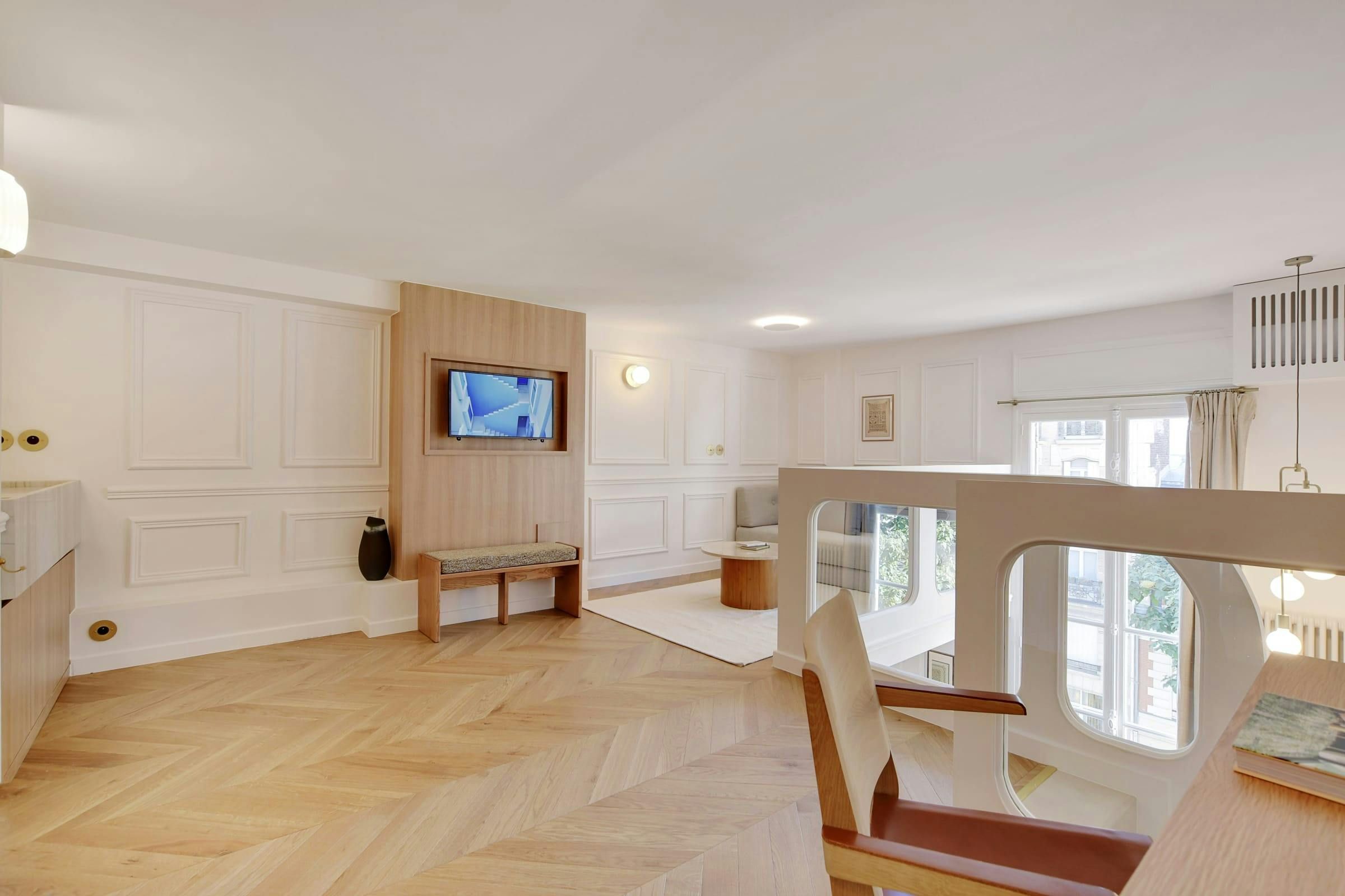 A perfect pad for a solo break or trip for two, this apartment brings comfort and convenience to a stay in Paris. The location is central, the style is elegant, and it has everything you need to feel right at home. A high ceiling and tall windows make the space feel bright and inviting, and the extra lounge on the mezzanine level means there’s more room to stretch out. Head outside to find cosy cafes and refined restaurants, a Metro station moments away, and landmarks within easy walking distance (we’re looking at you, Musée du Louvre).