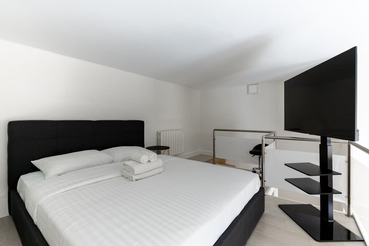 *The bedroom is on the mezzanine level and semi-open to the space below, so privacy is limited.