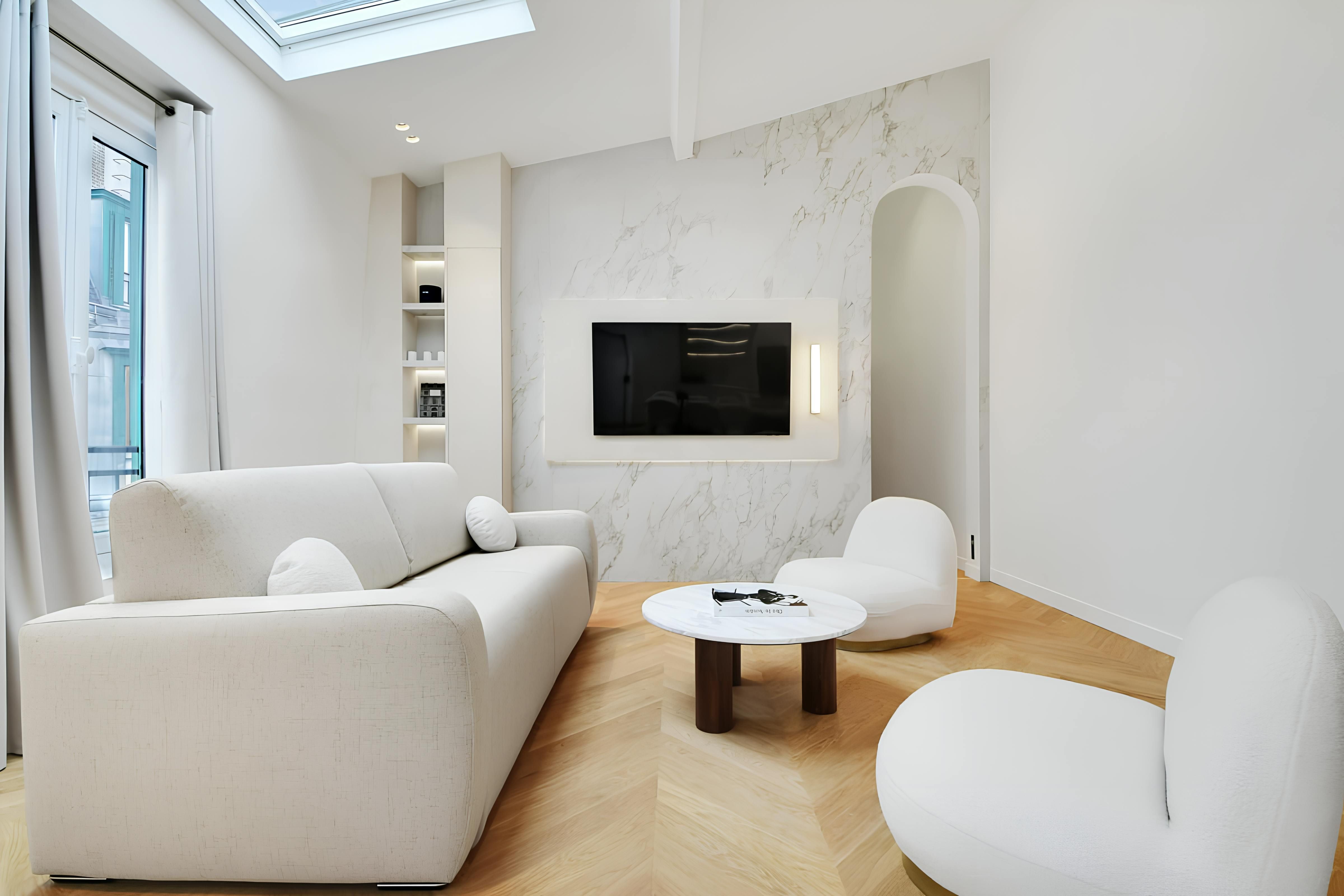 Moments from Rue Montorgueil, this Haussmann apartment makes a stylish, central base in the City of Lights. The design inside is as chic as it is comfortable. We're swooning over the vaulted ceilings – complete with skylights that flood the room with sunshine – while the two en-suite bedrooms look like they belong in a boutique hotel. Two guests will sleep on the sofa bed, which may not be ideal for all, but it gets the job done for short stays. When you're ready to explore, you'll find a metro stop a short walk away, landmarks within easy reach, and shops and restaurants practically on your doorstep.