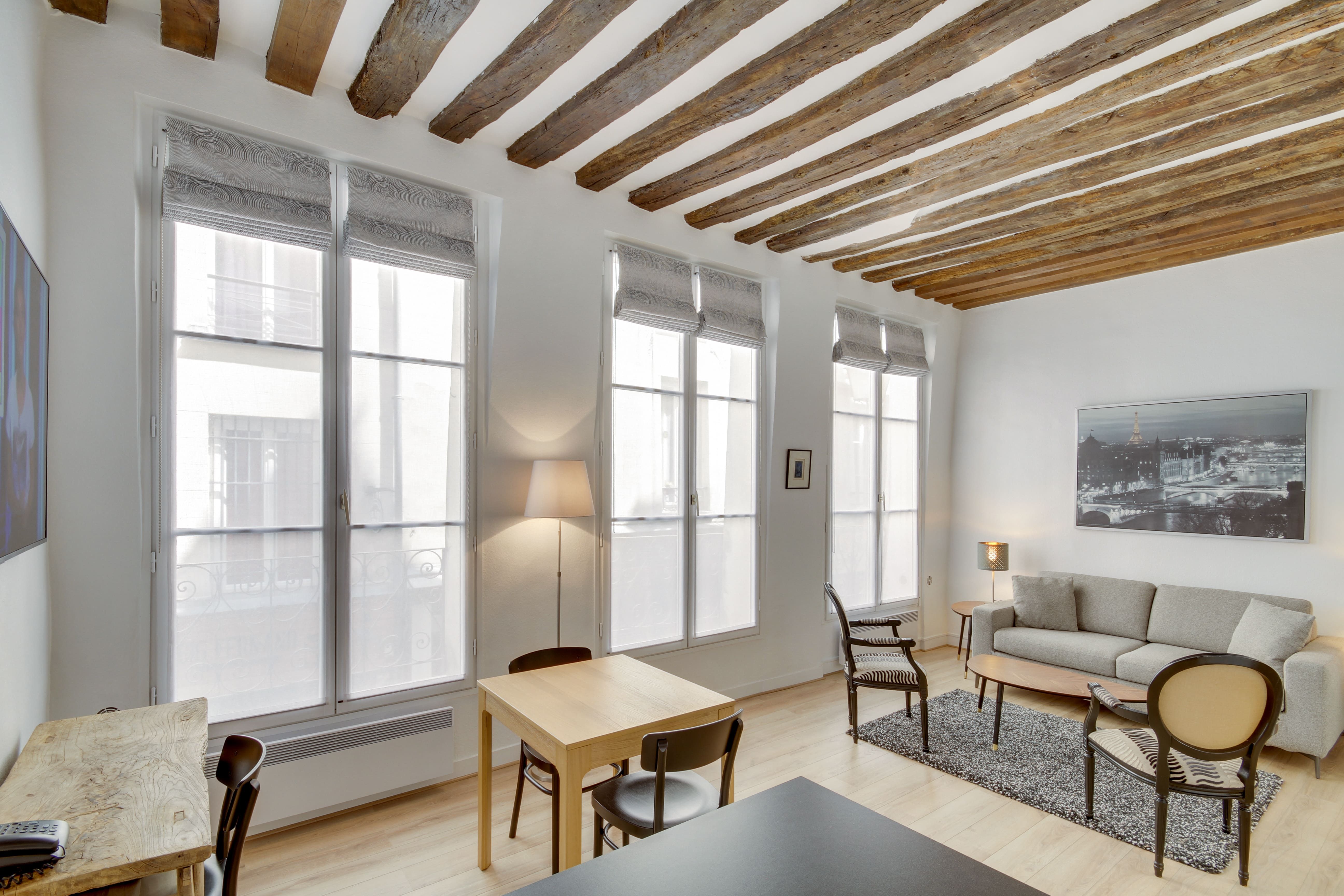 Aimed at business professionals, this home is an ideal base for your time in Paris. The open-plan living space is a great place to relax after a busy day. The kitchen has no oven, but there’s a microwave and hob for when you want to eat in and there are plenty of restaurants and cafes nearby. Le Marais is within walking distance and there are excellent public transport links a short stroll away, so reaching the rest of the city is easy. For days off from work, there’s an array of cultural attractions reachable on foot such as the Musée des Arts et Métiers, Pompidou Centre and the Palais Royal. What a great address this apartment has.