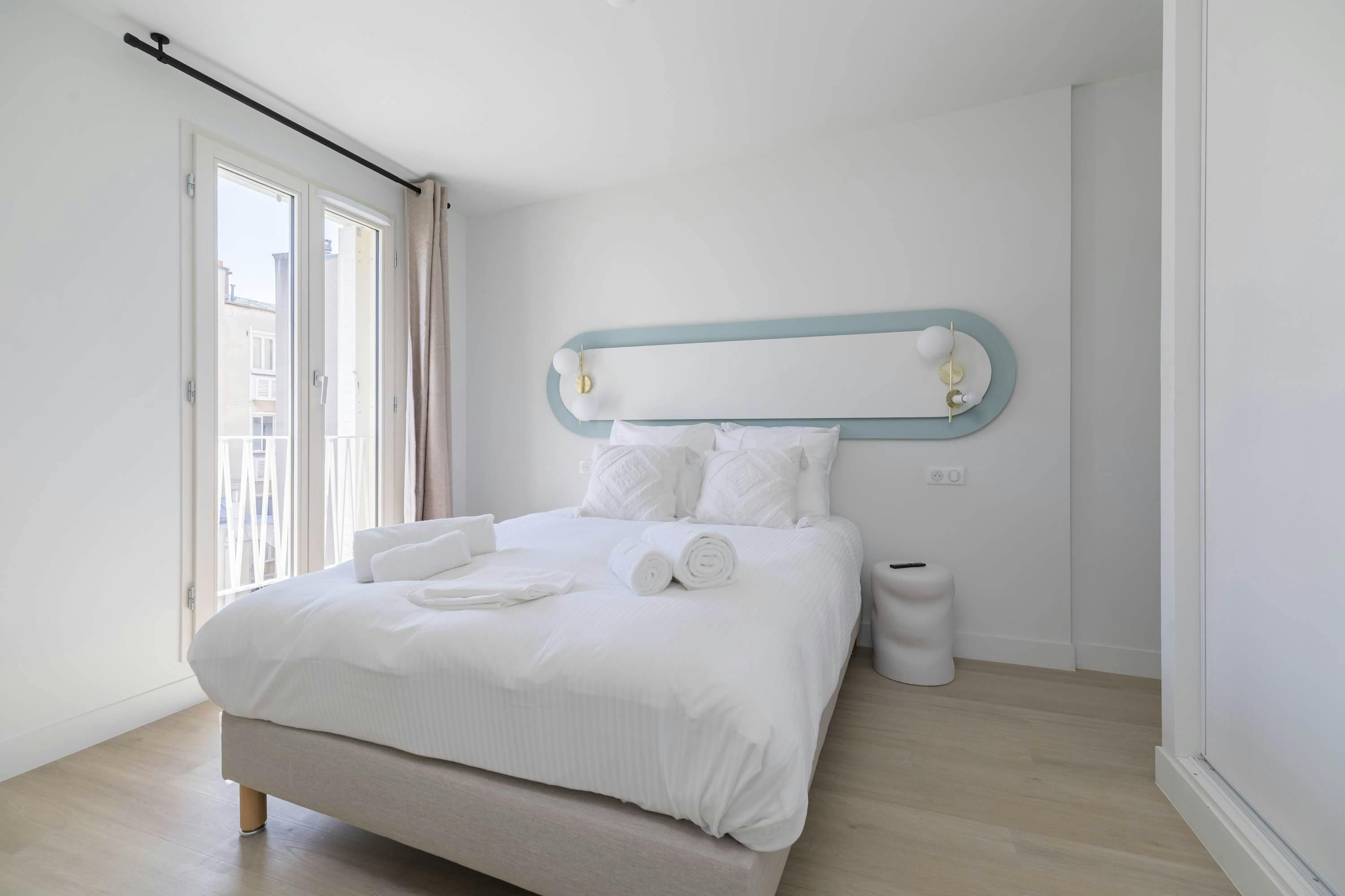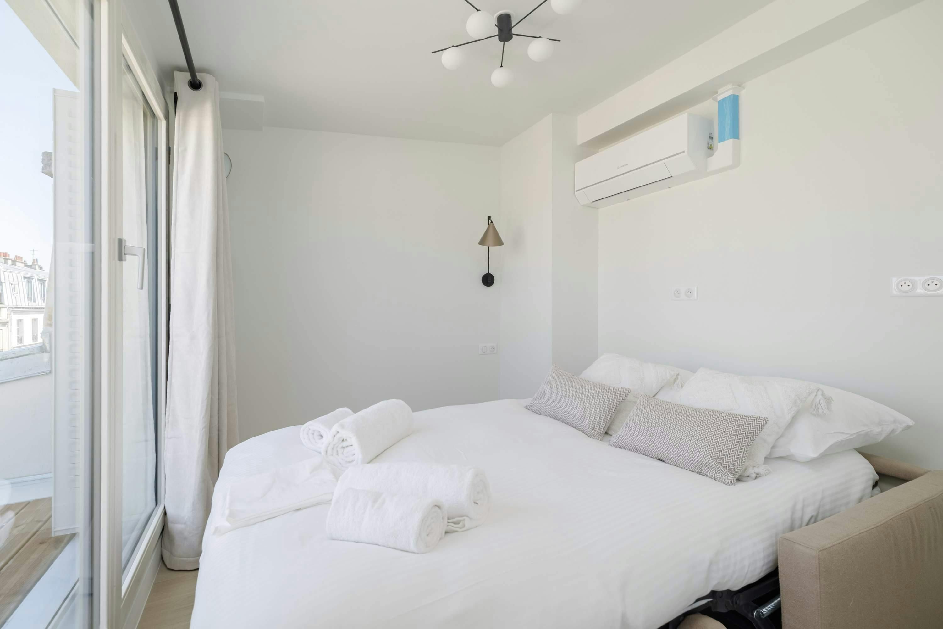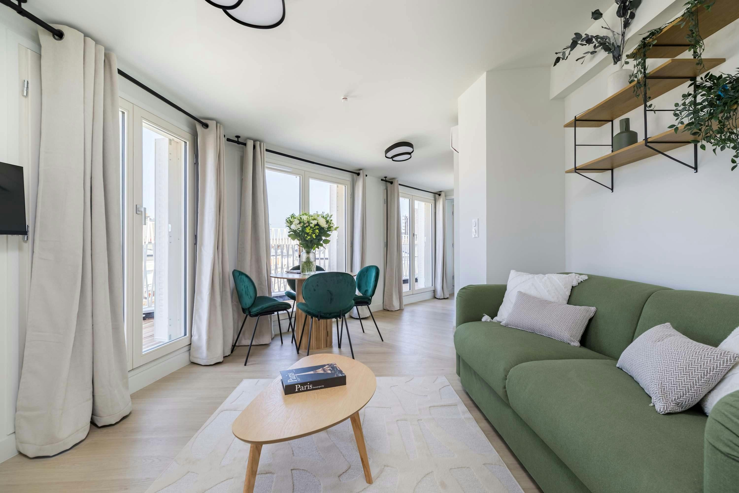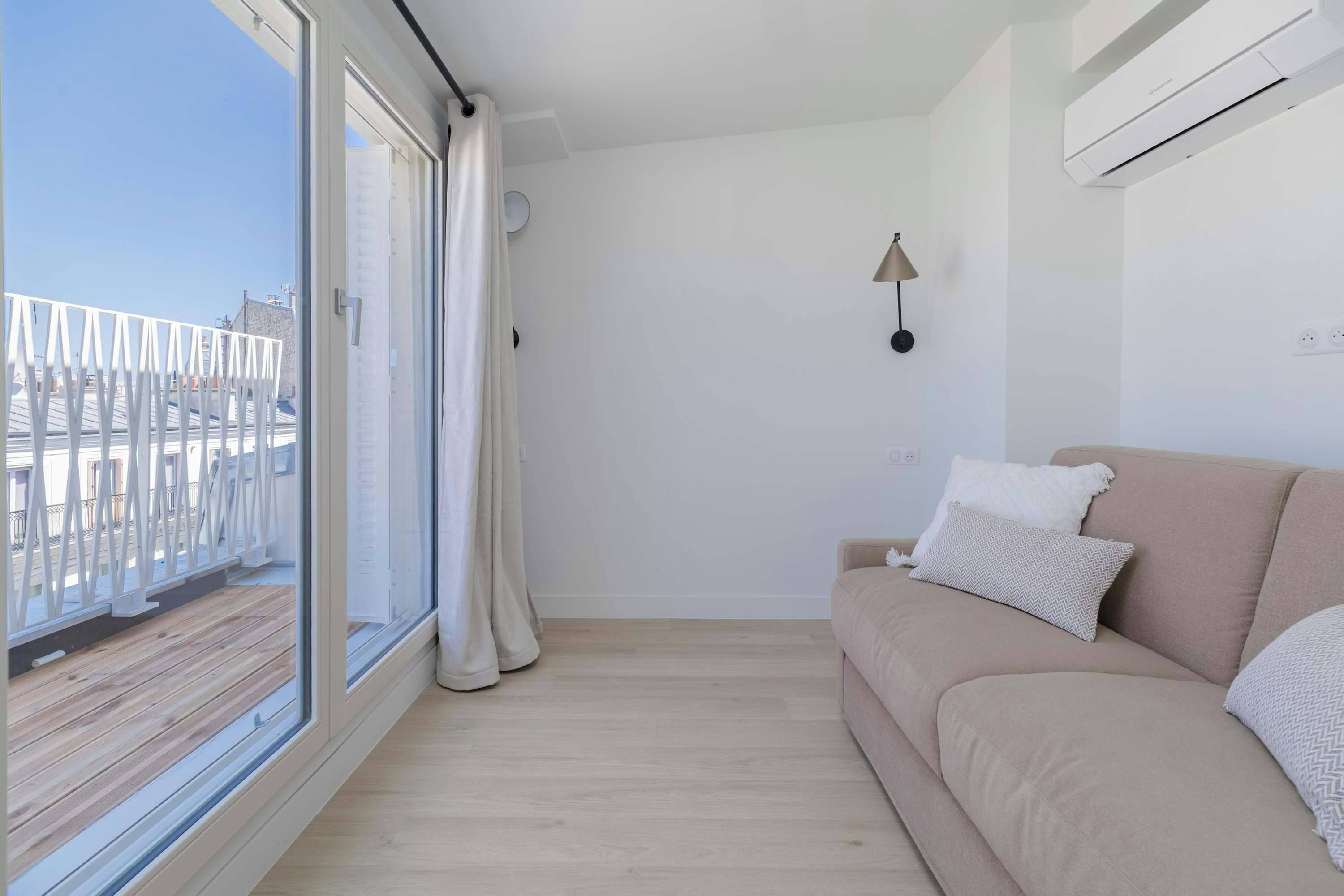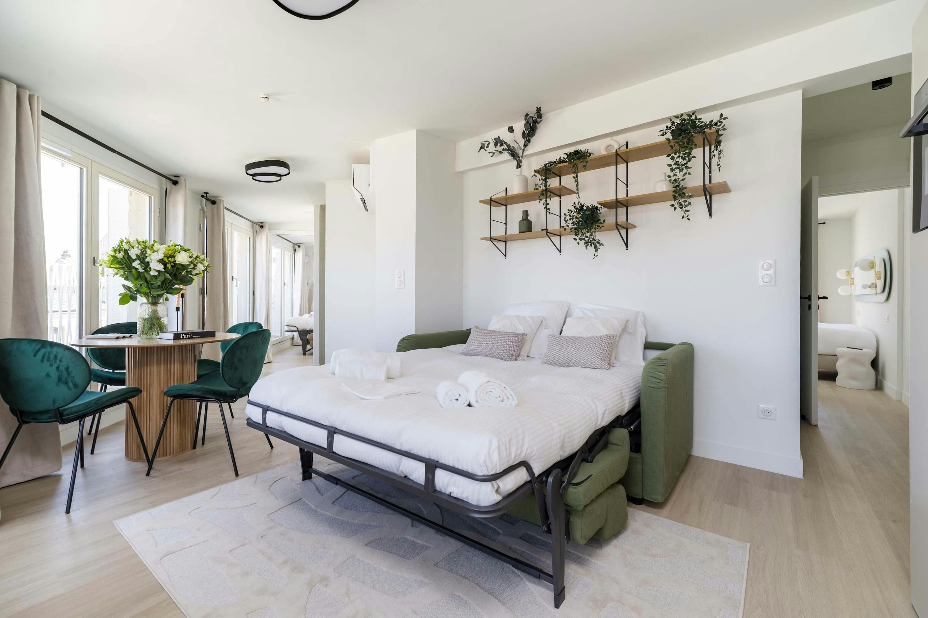 Surrounded by a variety of green spaces, this apartment’s address is perfect for peaceful strolls. Montmartre, with its independent shops and museums, is also within walking distance, or you can easily reach it via the great public transport links nearby. There are plenty of eateries in the locale too, serving cuisine from Indian to Syrian. Back at this apartment, there are views from the balcony of the street’s beautiful Parisian architecture (it’s narrow, so there’s not really room to sit). Another highlight is the bright open-plan living area – this room sleeps two guests on a sofa bed at full occupancy. And one of the bedrooms also has a sofa bed, or it can be used as a second living space.