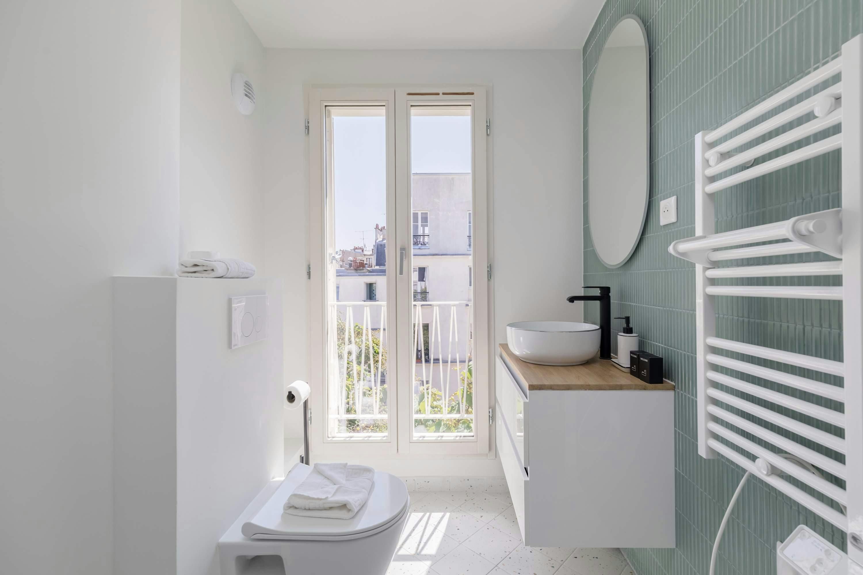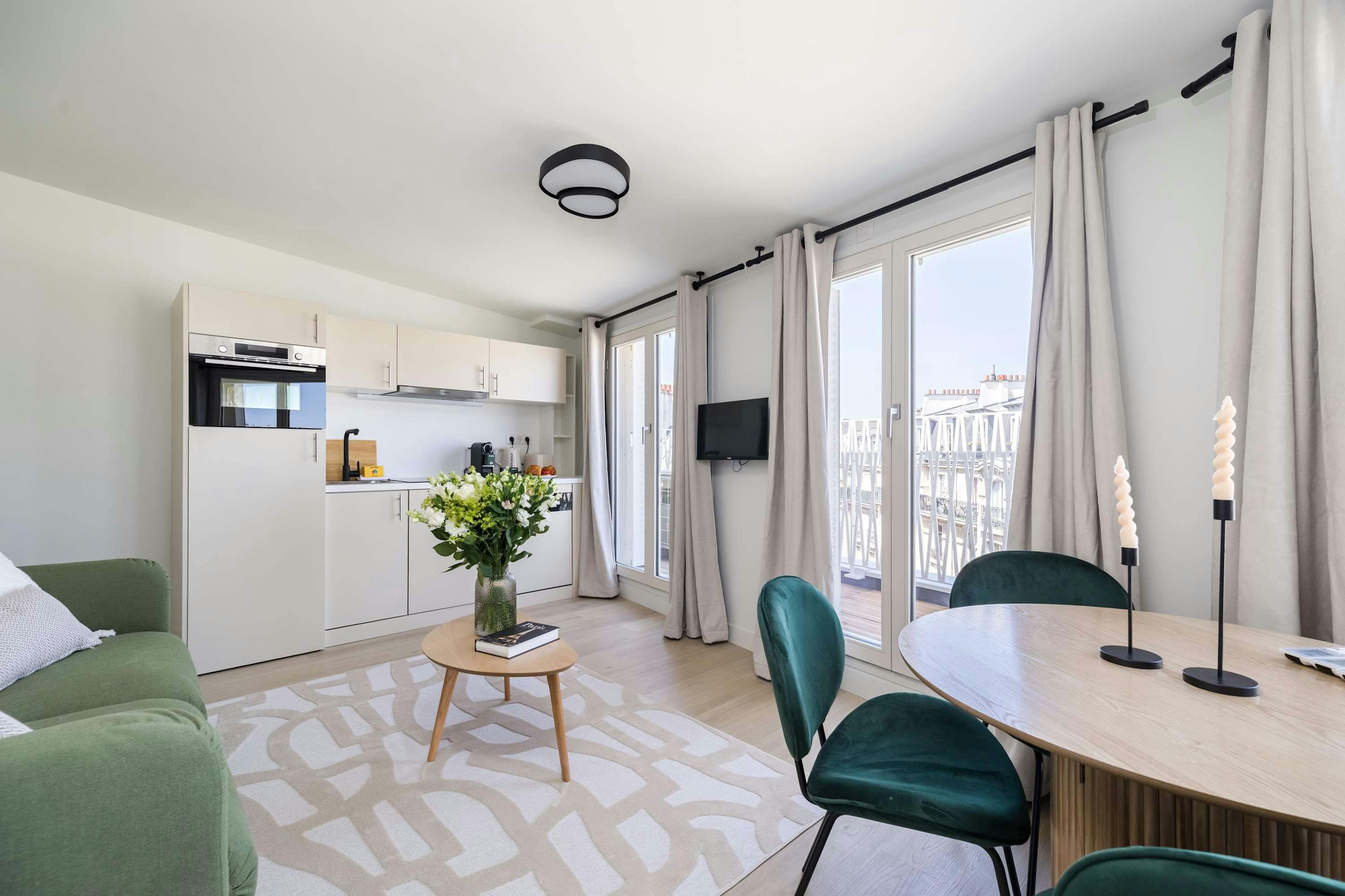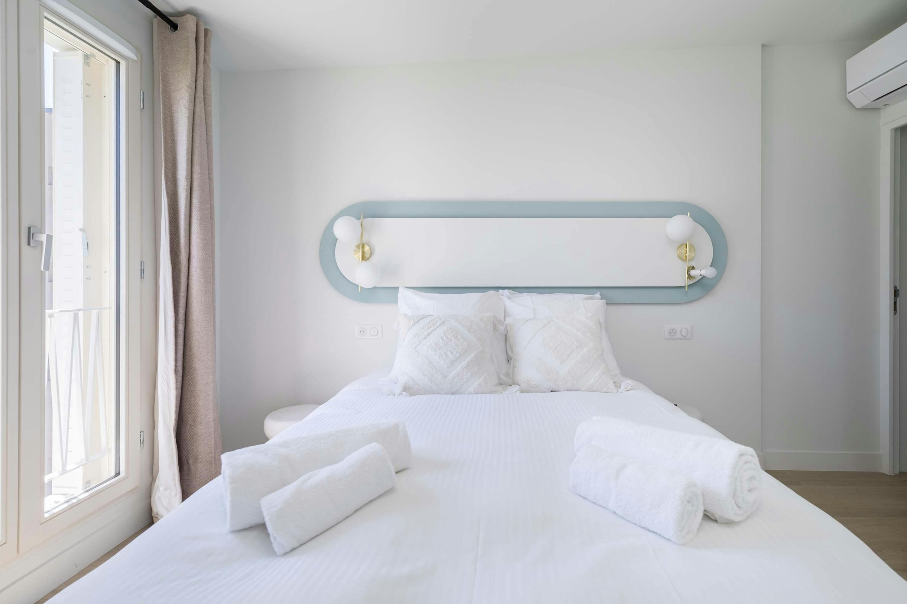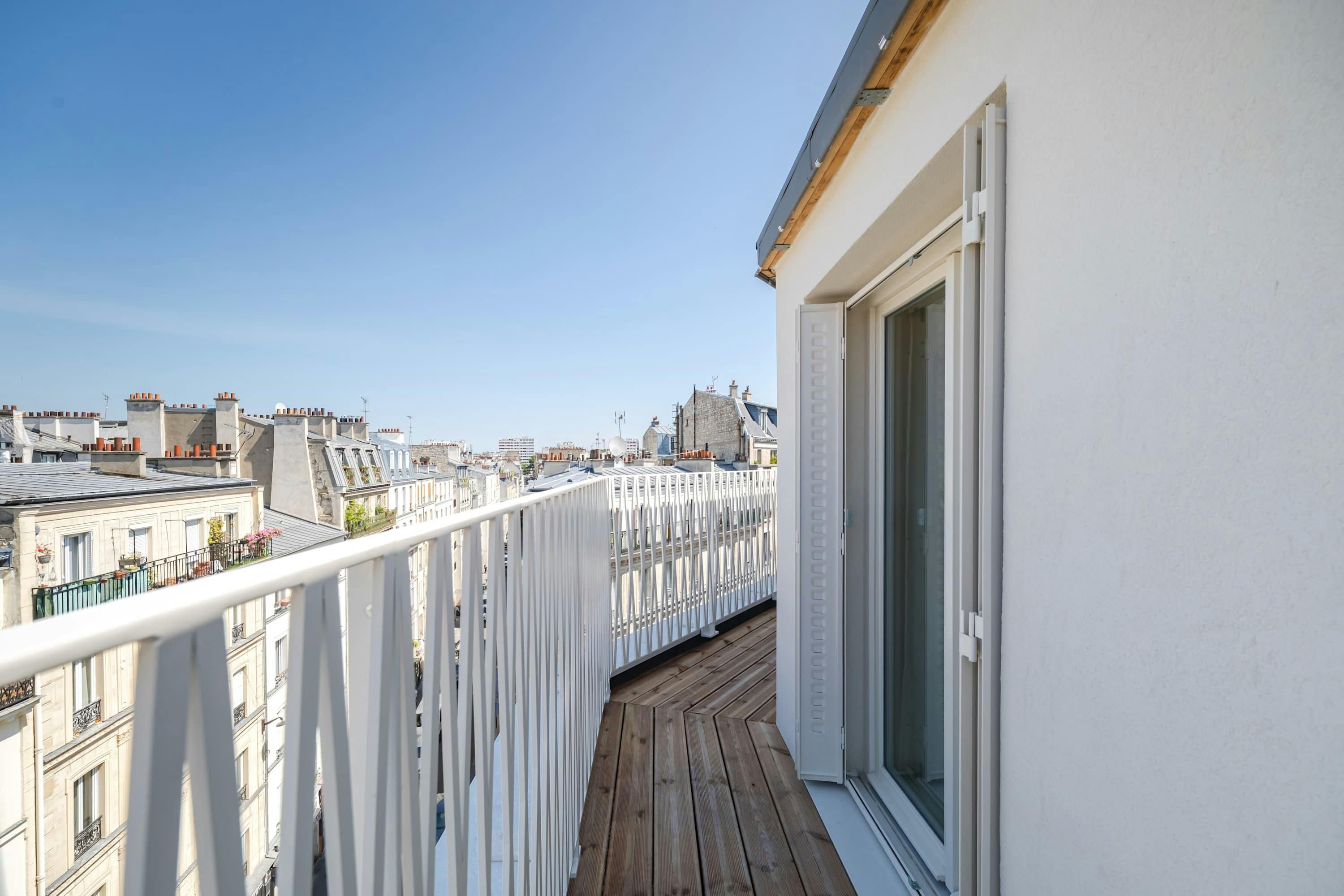 Surrounded by a variety of green spaces, this apartment’s address is perfect for peaceful strolls. Montmartre, with its independent shops and museums, is also within walking distance, or you can easily reach it via the great public transport links nearby. There are plenty of eateries in the locale too, serving cuisine from Indian to Syrian. Back at this apartment, there are views from the balcony of the street’s beautiful Parisian architecture (it’s narrow, so there’s not really room to sit). Another highlight is the bright open-plan living area – this room sleeps two guests on a sofa bed at full occupancy. And one of the bedrooms also has a sofa bed, or it can be used as a second living space.