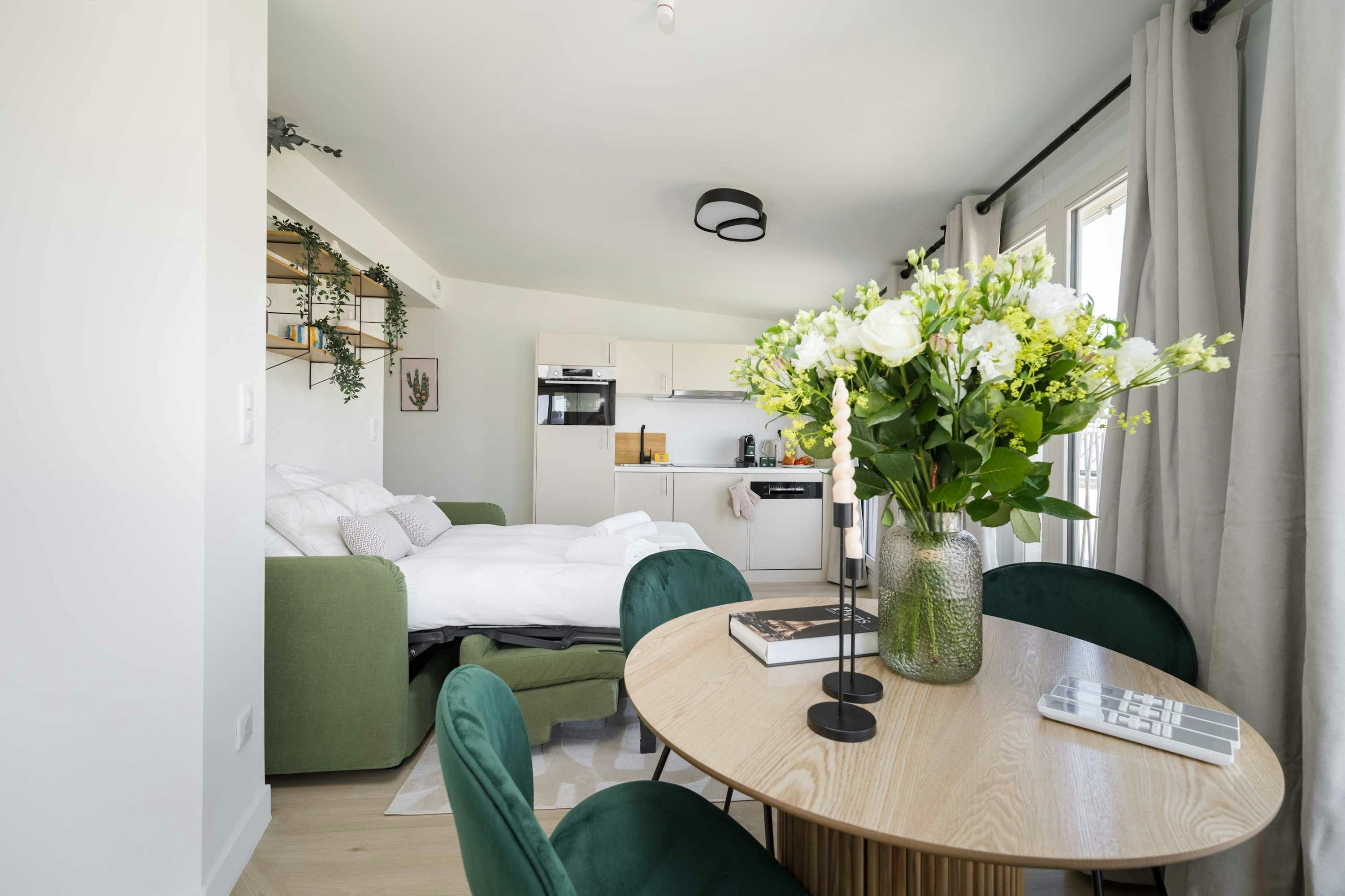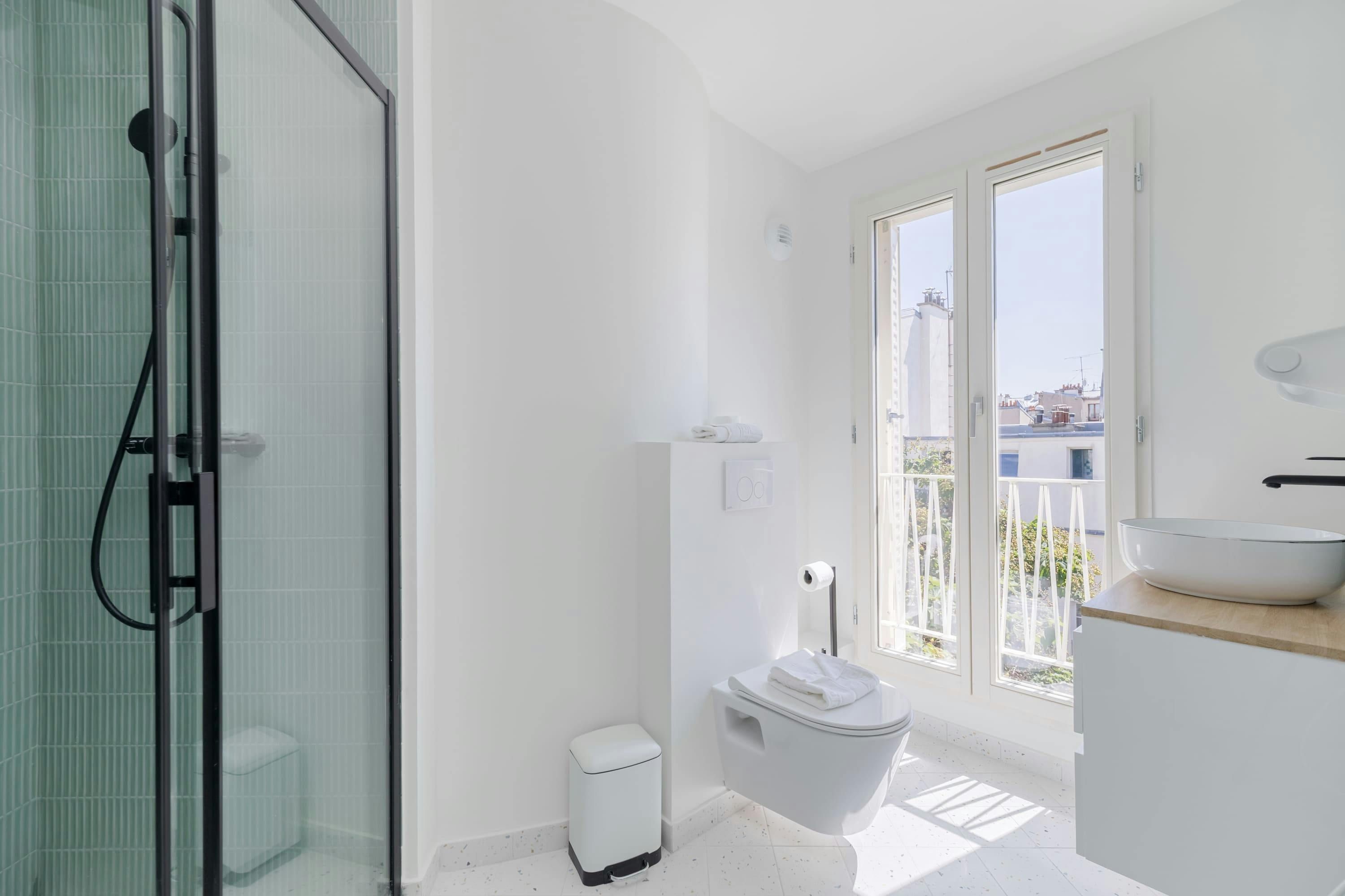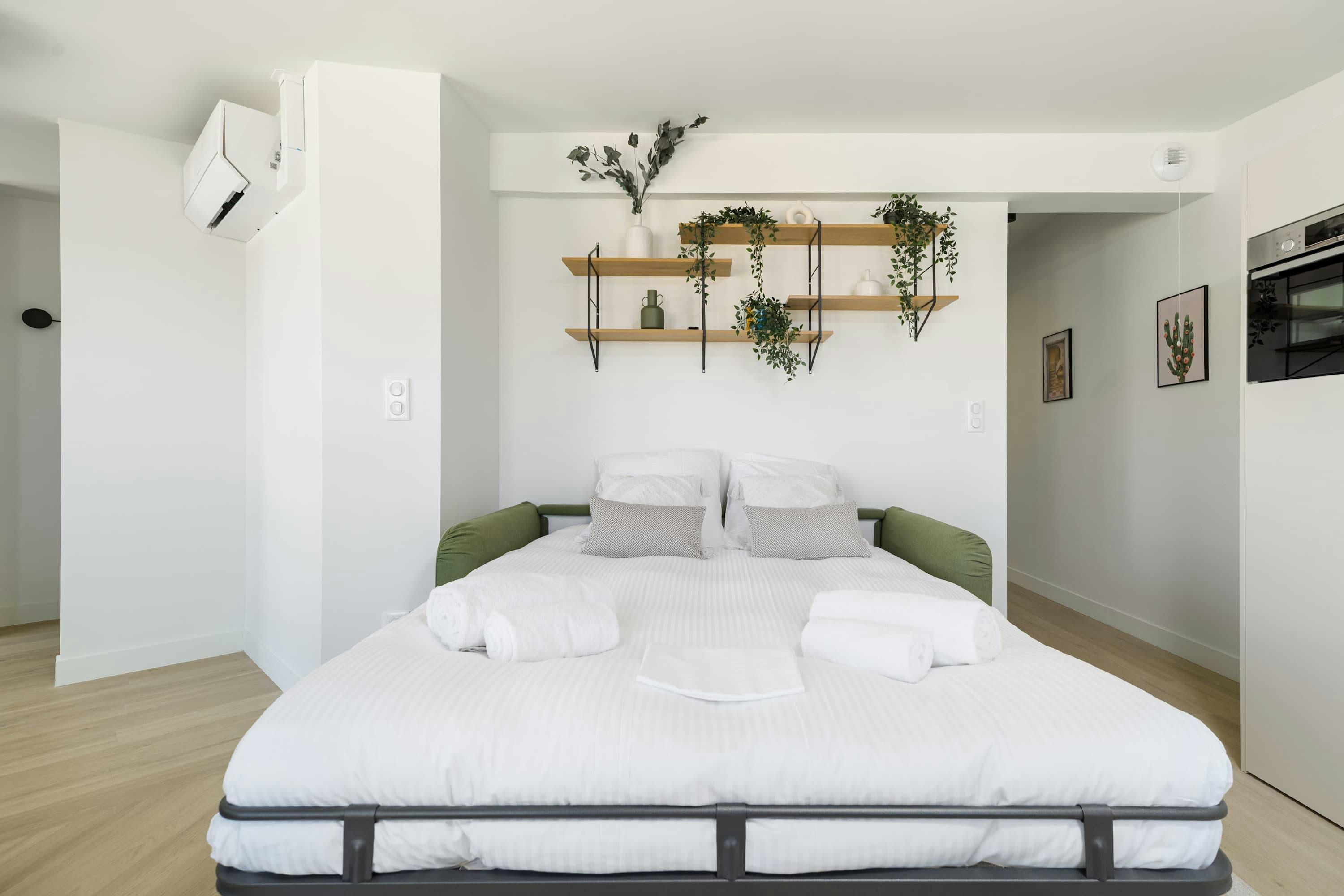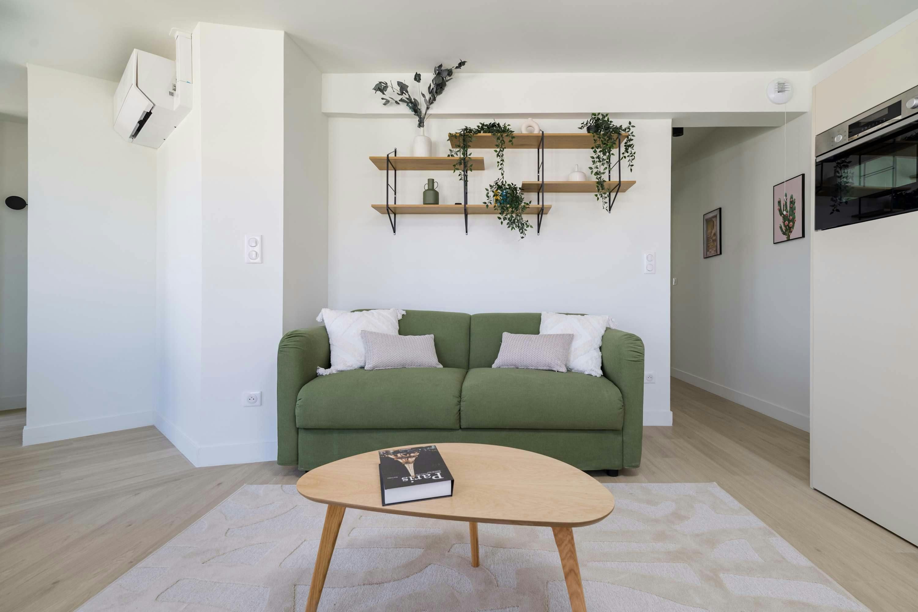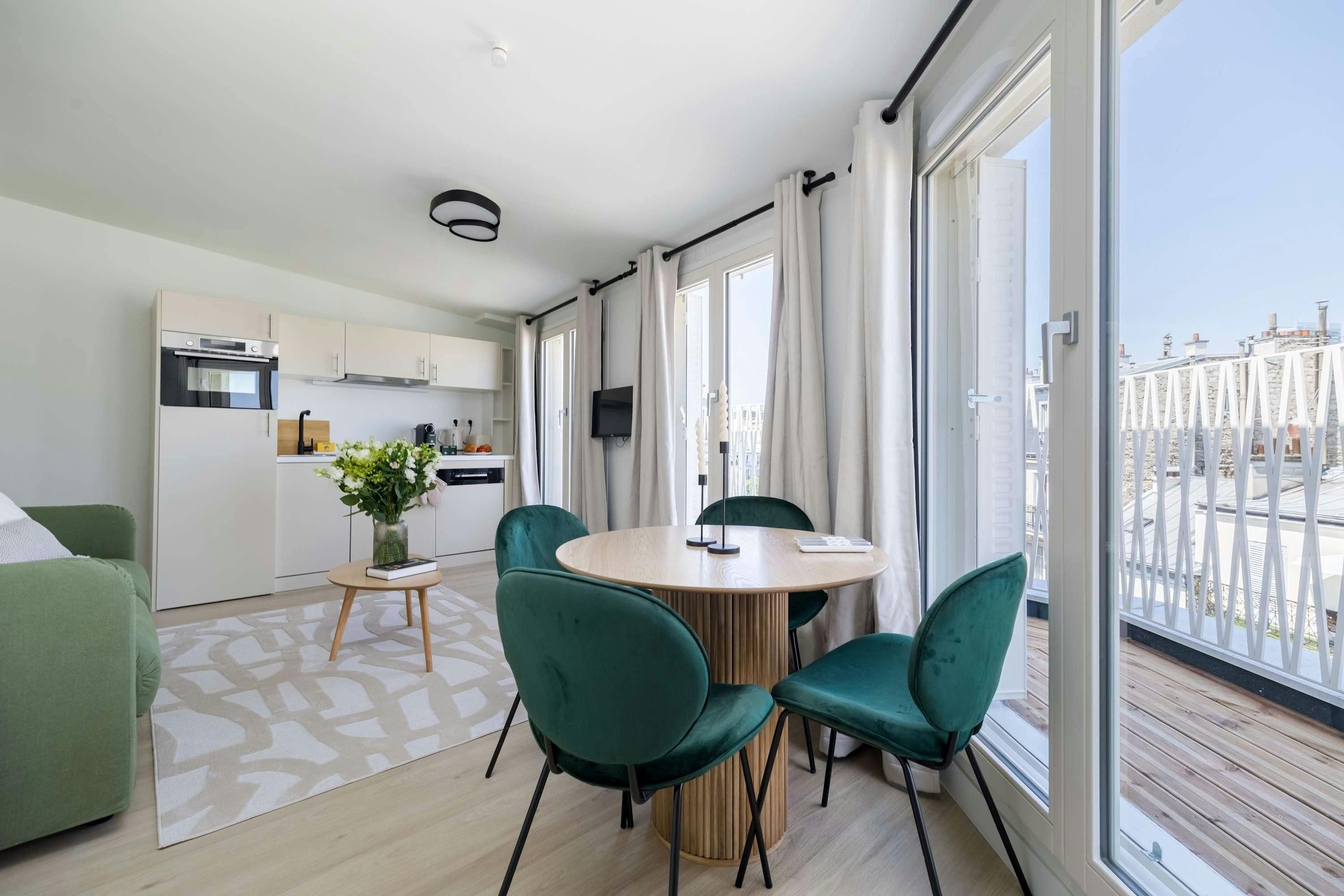 Surrounded by a variety of green spaces, this apartment’s address is perfect for peaceful strolls. Montmartre, with its independent shops and museums, is also within walking distance, or you can easily reach it via the great public transport links nearby. There are plenty of eateries in the locale too, serving cuisine from Indian to Syrian. Back at this apartment, there are views from the balcony of the street’s beautiful Parisian architecture (it’s narrow, so there’s not really room to sit). Another highlight is the bright open-plan living area – this room sleeps two guests on a sofa bed at full occupancy. And one of the bedrooms also has a sofa bed, or it can be used as a second living space.