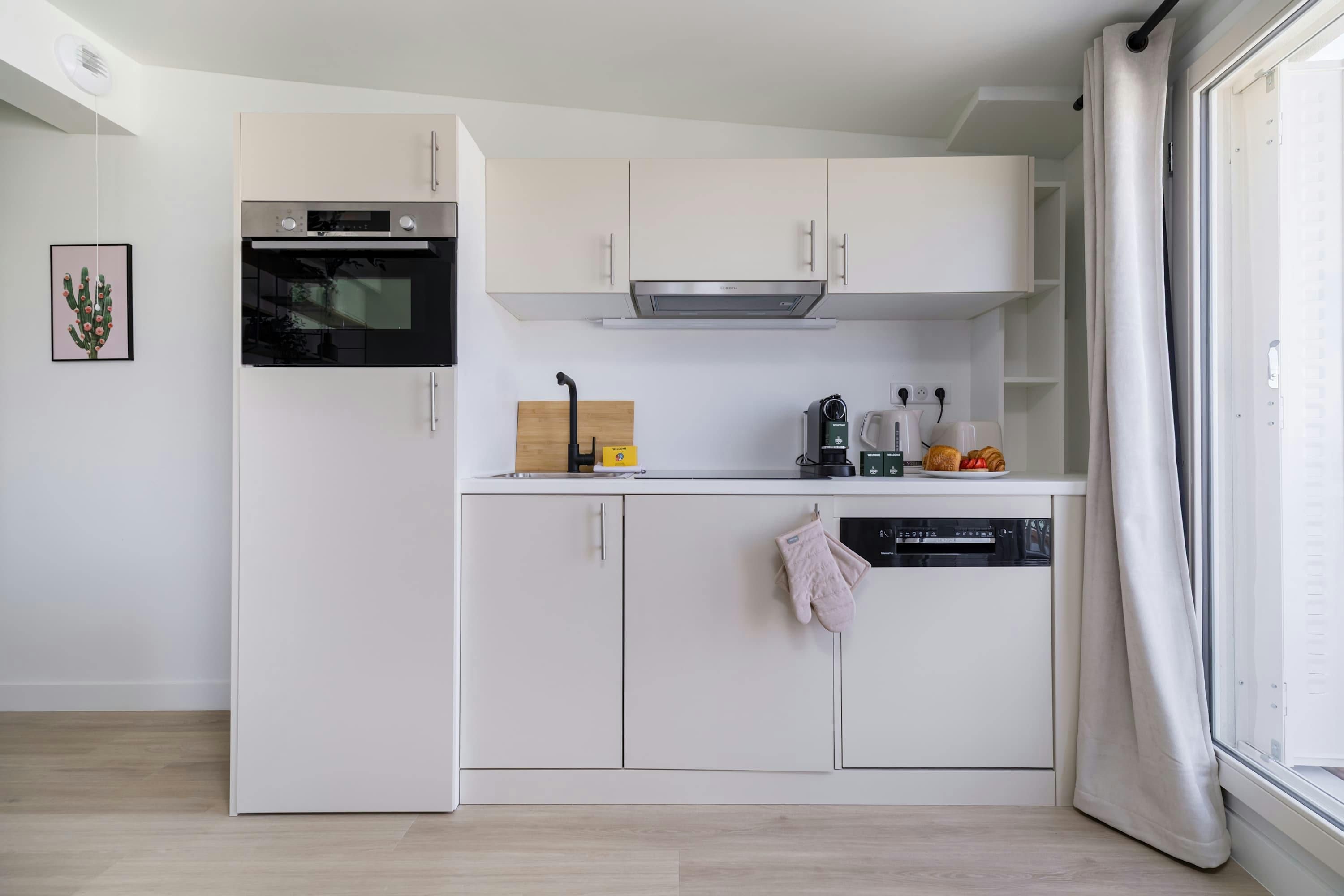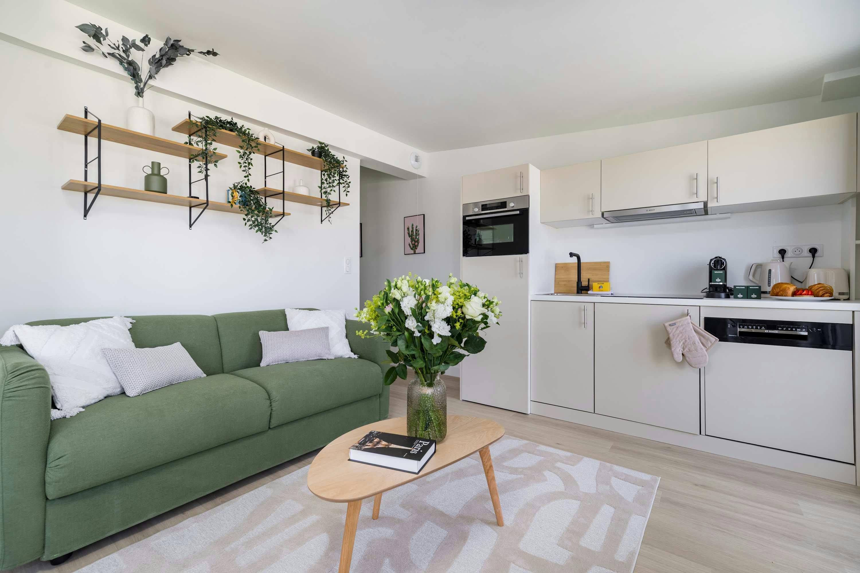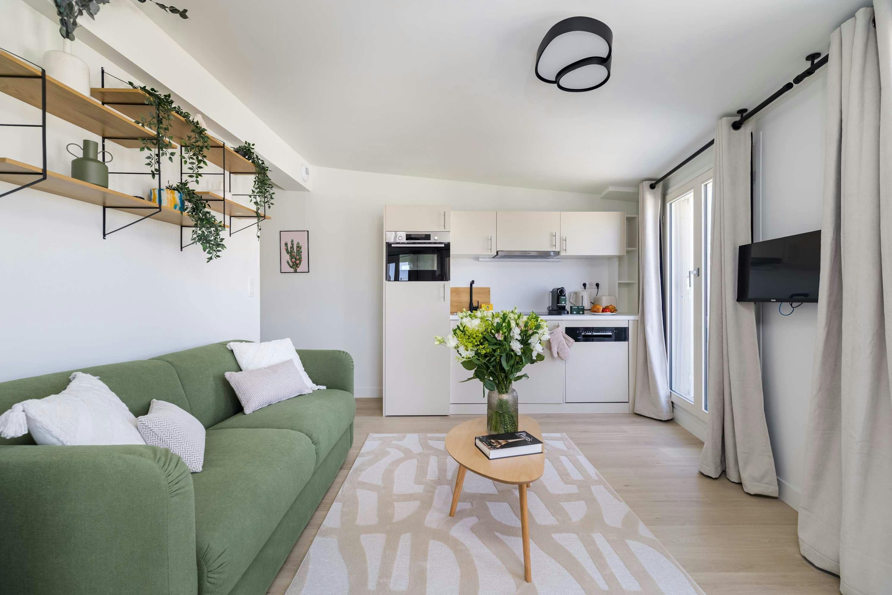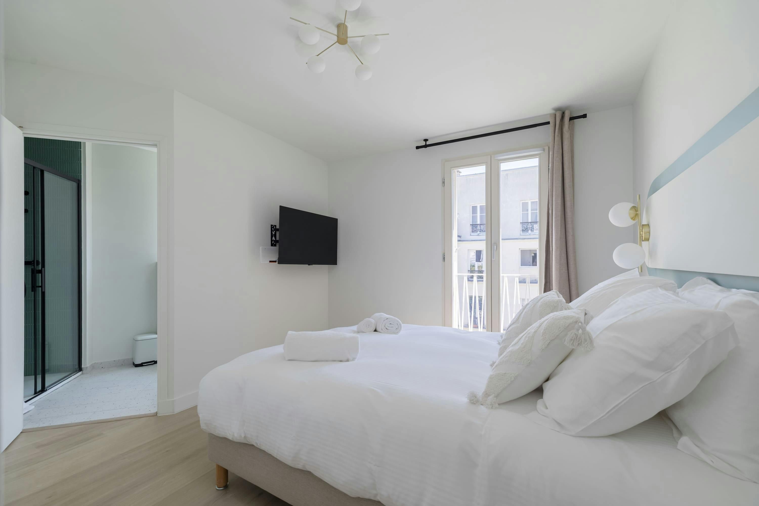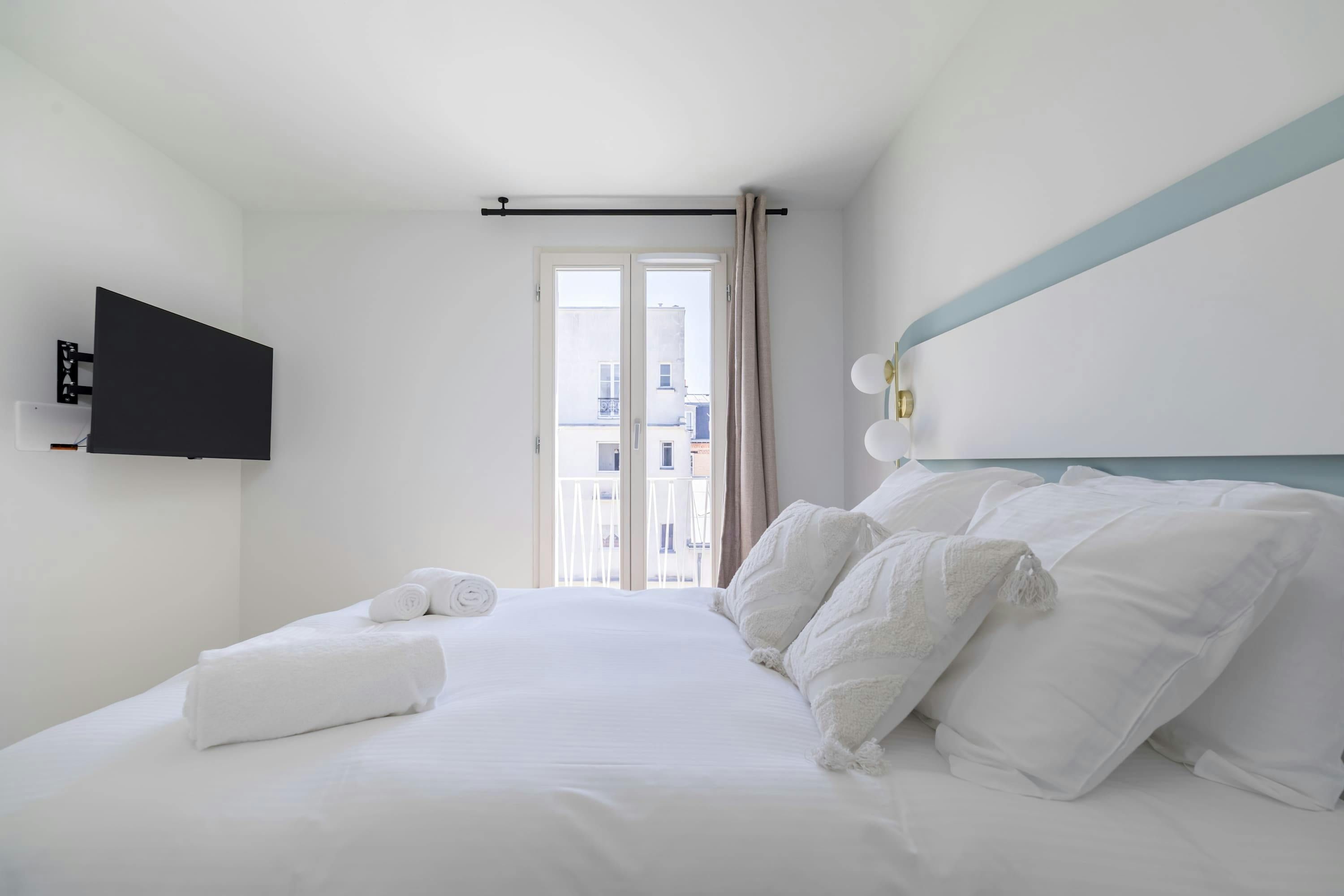 Surrounded by a variety of green spaces, this apartment’s address is perfect for peaceful strolls. Montmartre, with its independent shops and museums, is also within walking distance, or you can easily reach it via the great public transport links nearby. There are plenty of eateries in the locale too, serving cuisine from Indian to Syrian. Back at this apartment, there are views from the balcony of the street’s beautiful Parisian architecture (it’s narrow, so there’s not really room to sit). Another highlight is the bright open-plan living area – this room sleeps two guests on a sofa bed at full occupancy. And one of the bedrooms also has a sofa bed, or it can be used as a second living space.