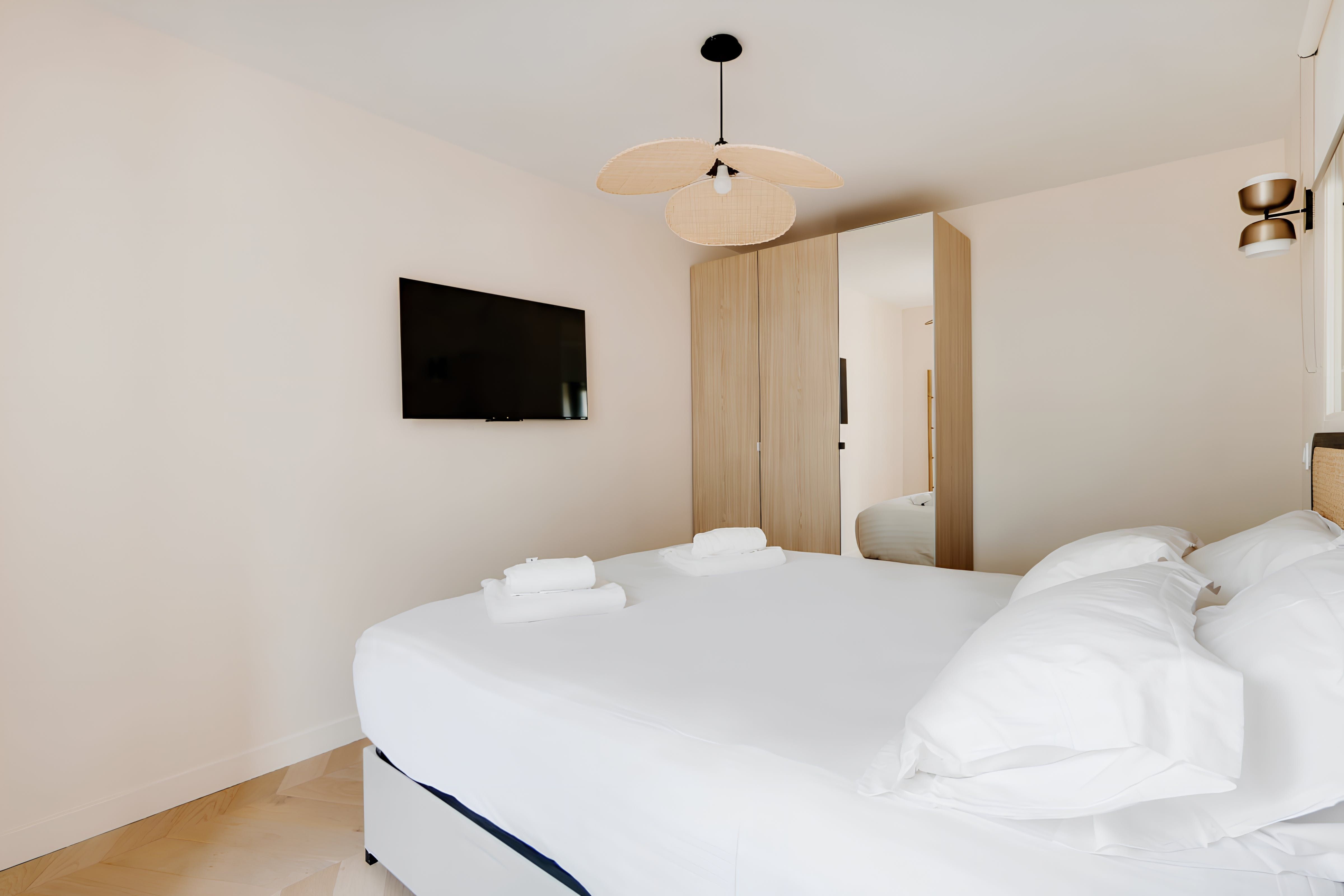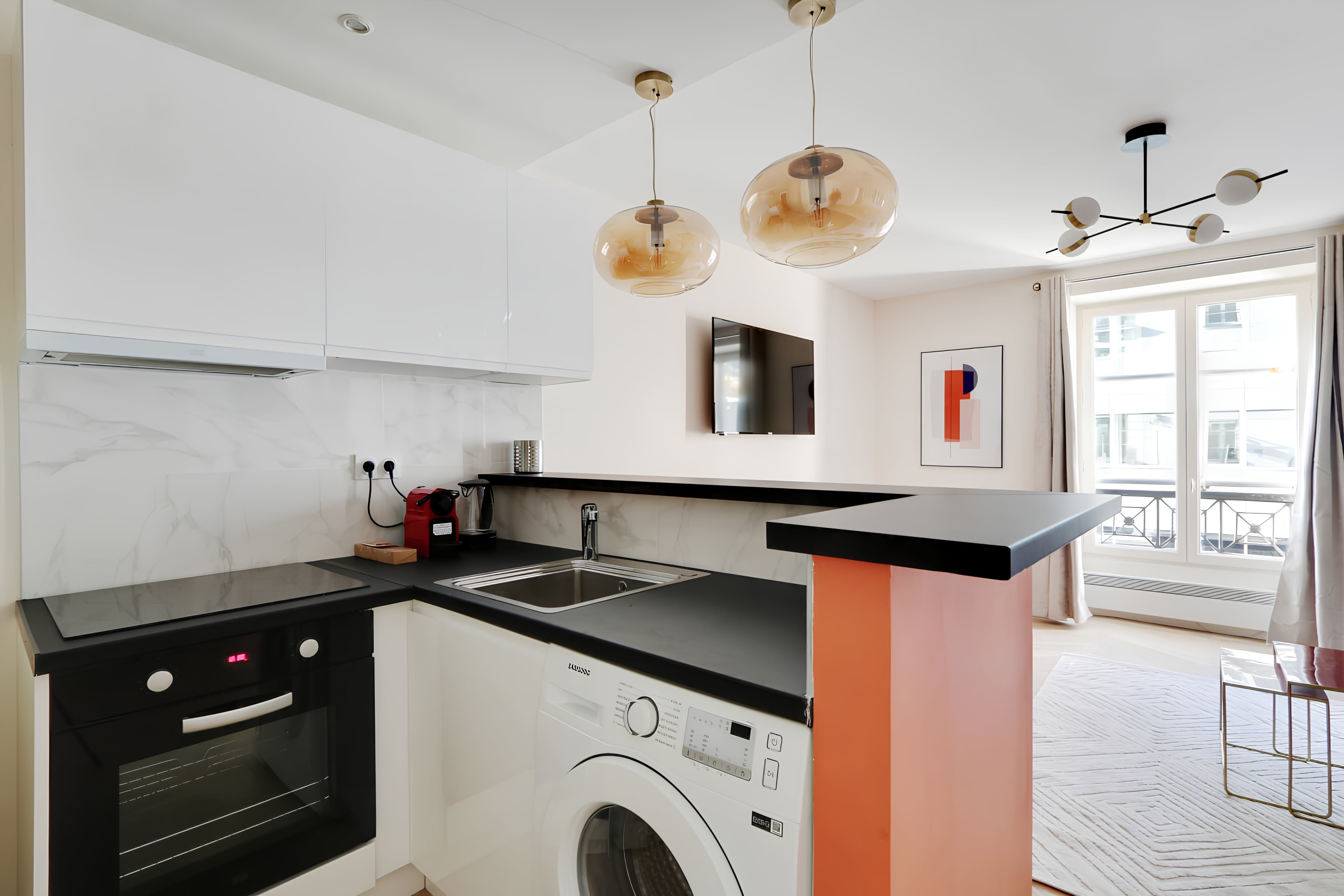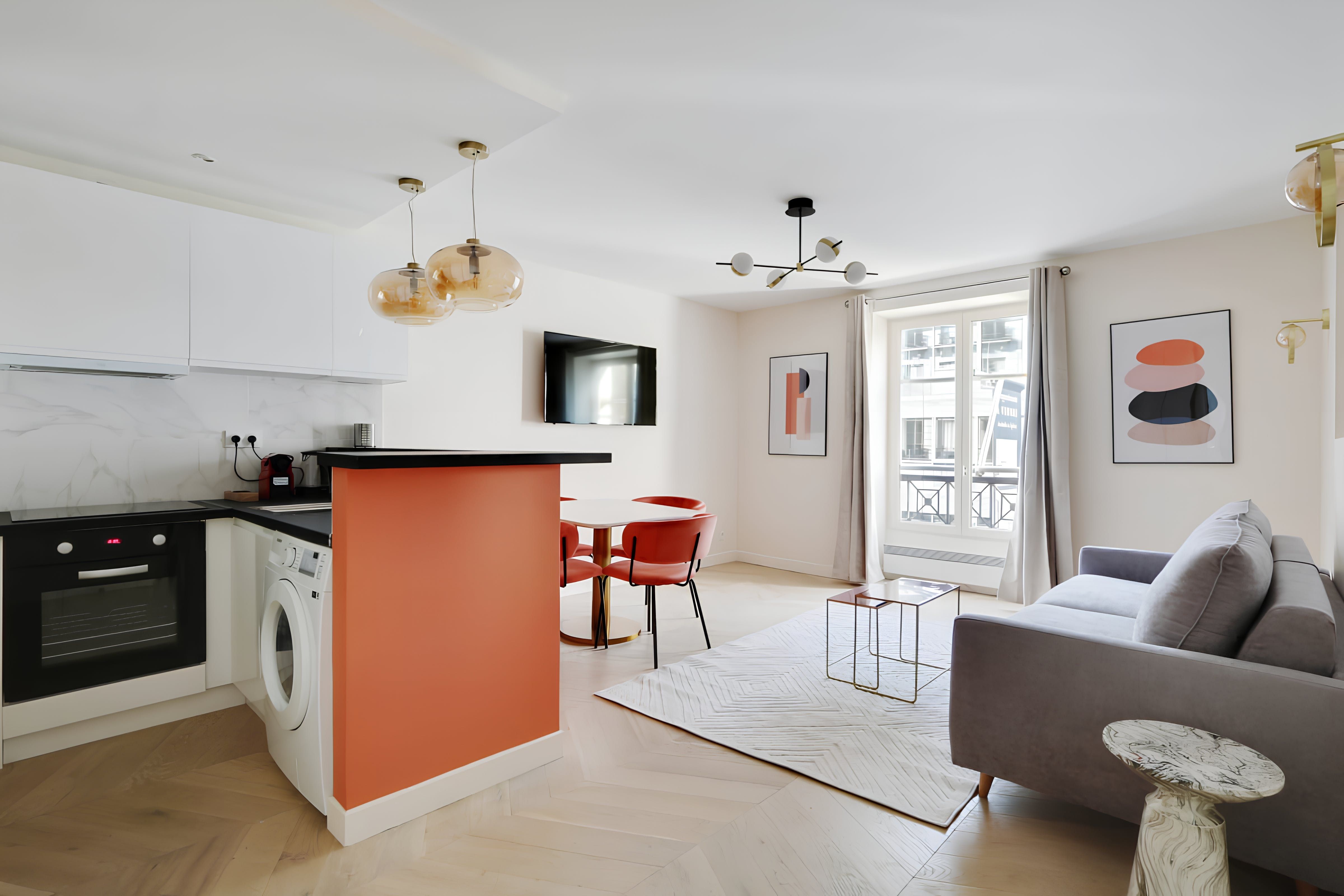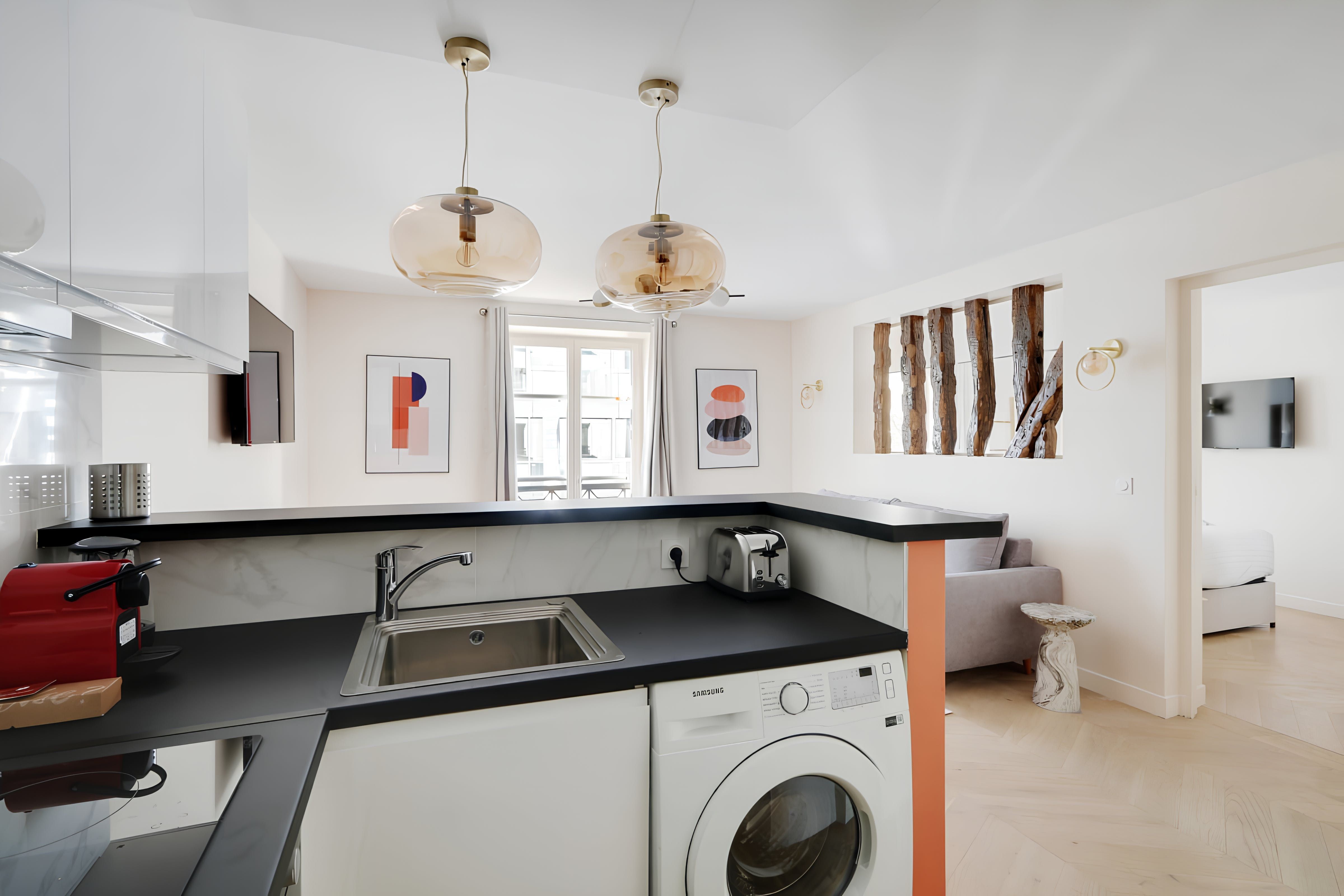 Home truths: *You'll be able to check yourself in here. *At full occupancy, two people will be sleeping on a sofa bed in the living area. *The kitchenette is best suited for preparing light bites rather than larger meals. That said, you'll find some of the area's best restaurants close by. *Note that the bathroom is on the small side. *If you're travelling for work, you won't find a dedicated desk here. However, the dining table doubles up as a laptop-friendly workspace. *Given the home's central spot, expect to hear some street noise throughout your stay. *We recommend skipping the car here and exploring Paris on foot or by public transport instead.