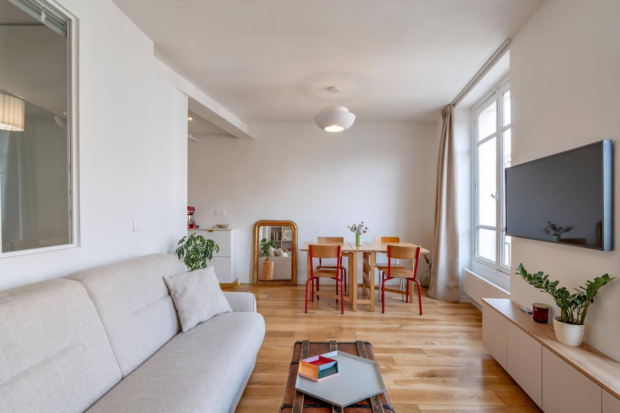 Don’t be put off by this apartment’s slightly off-the-tourist-trail setting in the 10th Arrondissement. With buzzy cafés and bistros on your doorstep and Canal Saint-Martin just moments away for waterfront strolls, you’ll quickly fall for this authentic corner of Paris. Need to be somewhere fast? The Metro is only a few minutes’ walk away. Back home, while compact and with two guests sharing a sofa bed, the apartment makes clever use of space. Our favourite spot? That window seat to watch Parisian life unfold on the boulevard below with a morning coffee – that’s a memory made right here.