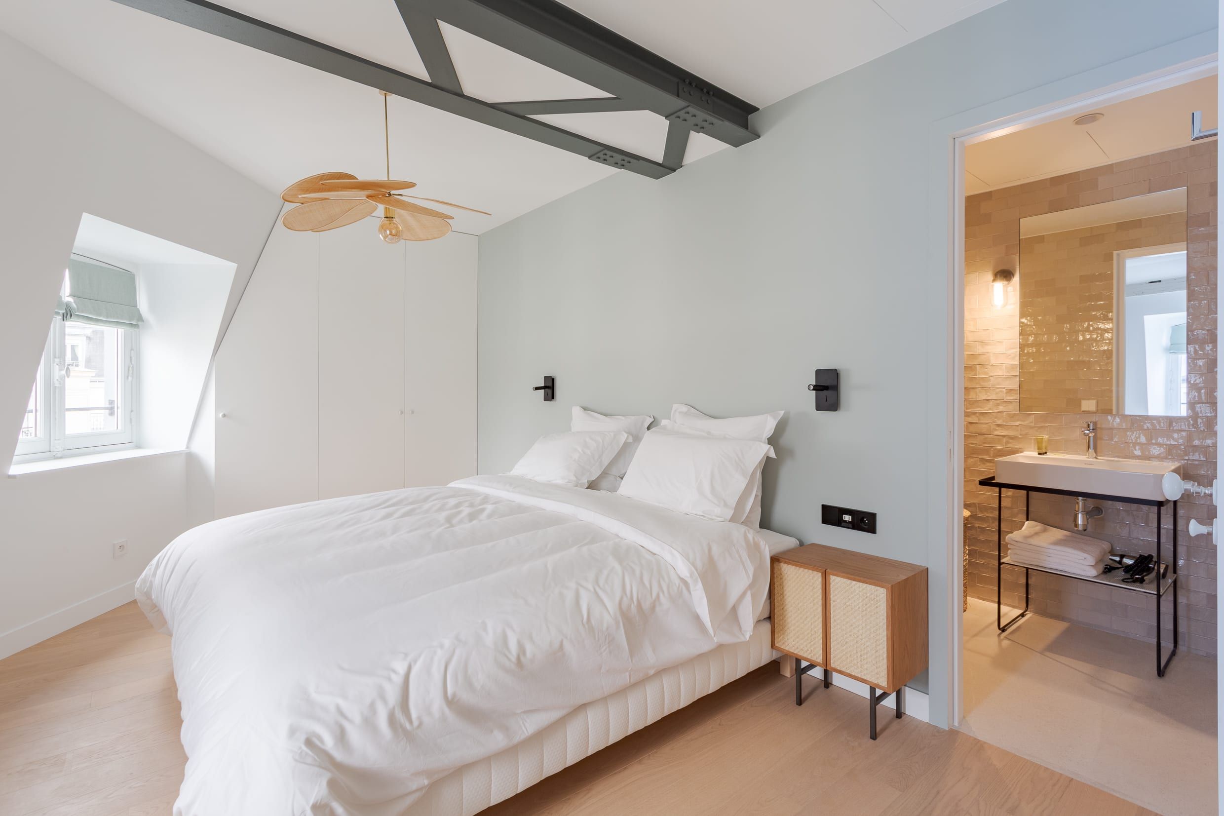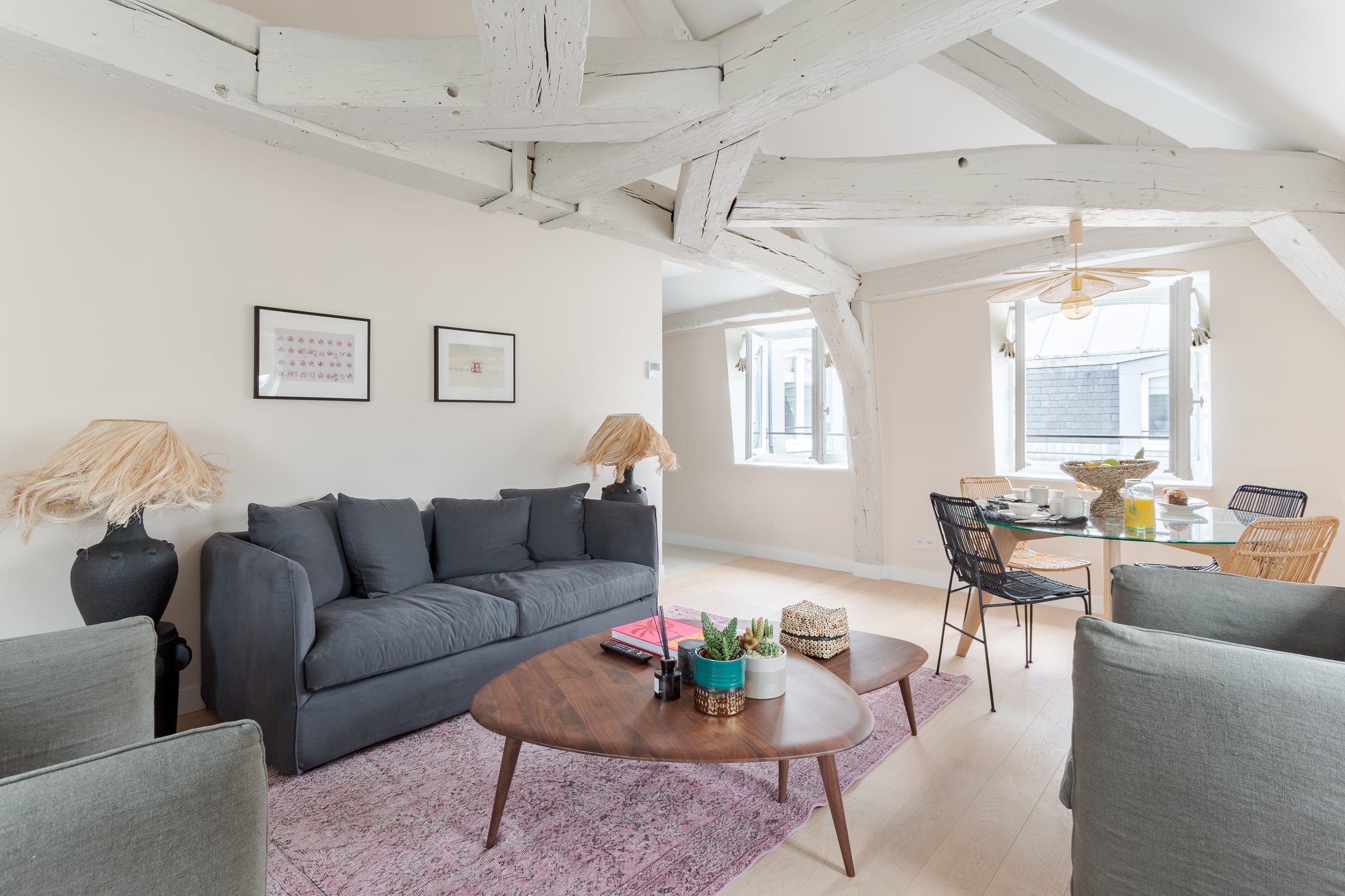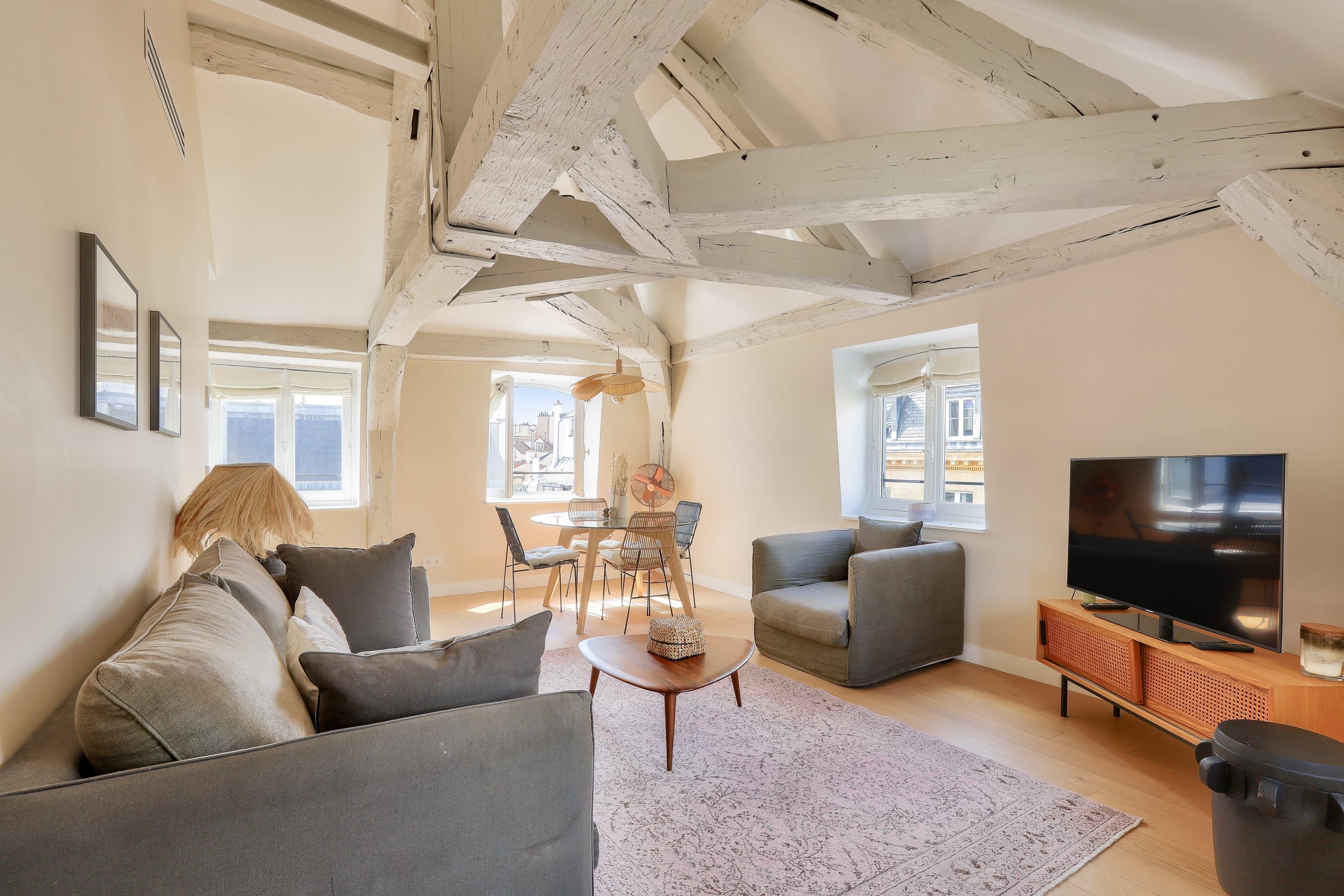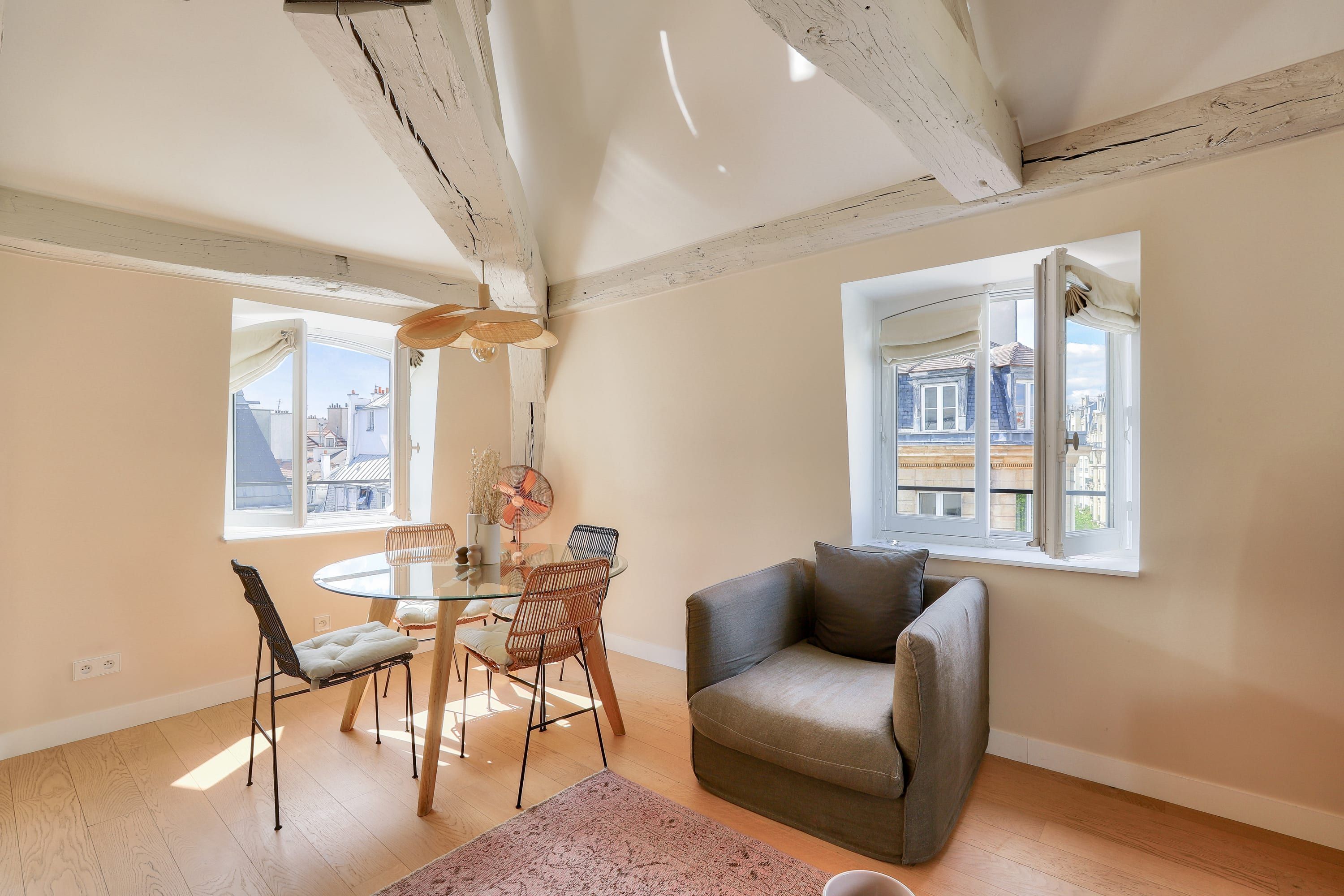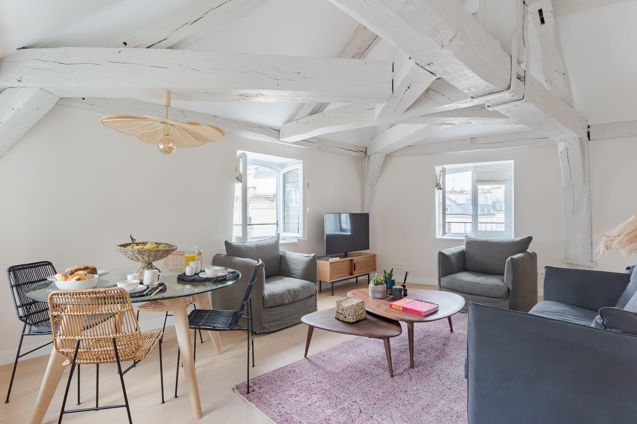 Bright and airy, this tranquil apartment with its beautiful old beams will have you relaxing in no time. Perfect for a couple’s stay in Paris, just bear in mind that if there are four of you, two people will need to sleep on the sofa bed in the living room and share the en-suite bathroom. Still, it’s a small price to pay for such an enviable location. Surrounded by delicious French eateries, trendy boutiques and art galleries, you’ll never be lost for things to do. For jaunts further afield, hop on the metro – Paris’ iconic landmarks are within easy reach.