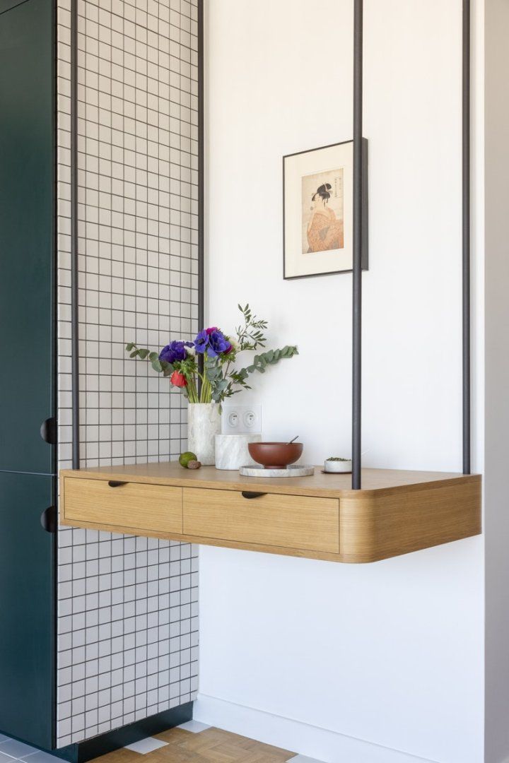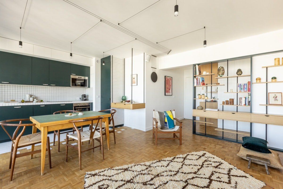 Step through the front door and enter into an effortlessly stylish mid-century pad with floating bookshelves, stunning pendant lighting and a super chic forest green kitchen with a tiled worktop – all set within the open living space.