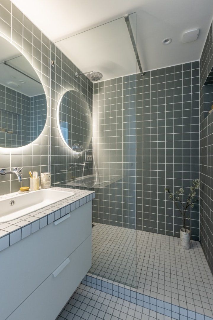 Elsewhere, a spacious bedroom offers a soothing sanctuary to retreat to at the end of the day, while the sleek walk-in shower room continues the theme from the kitchen, with green and white tiles throughout.