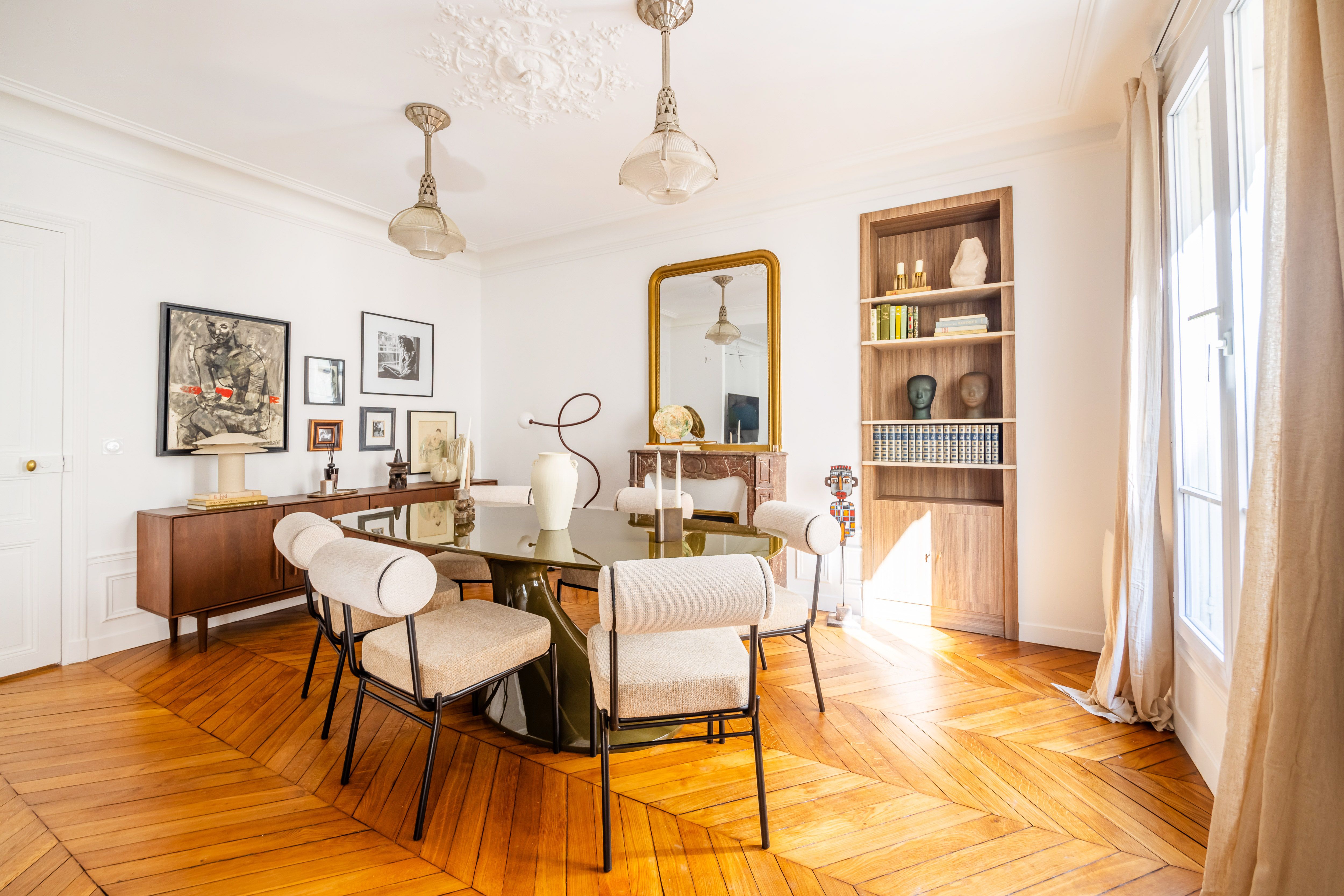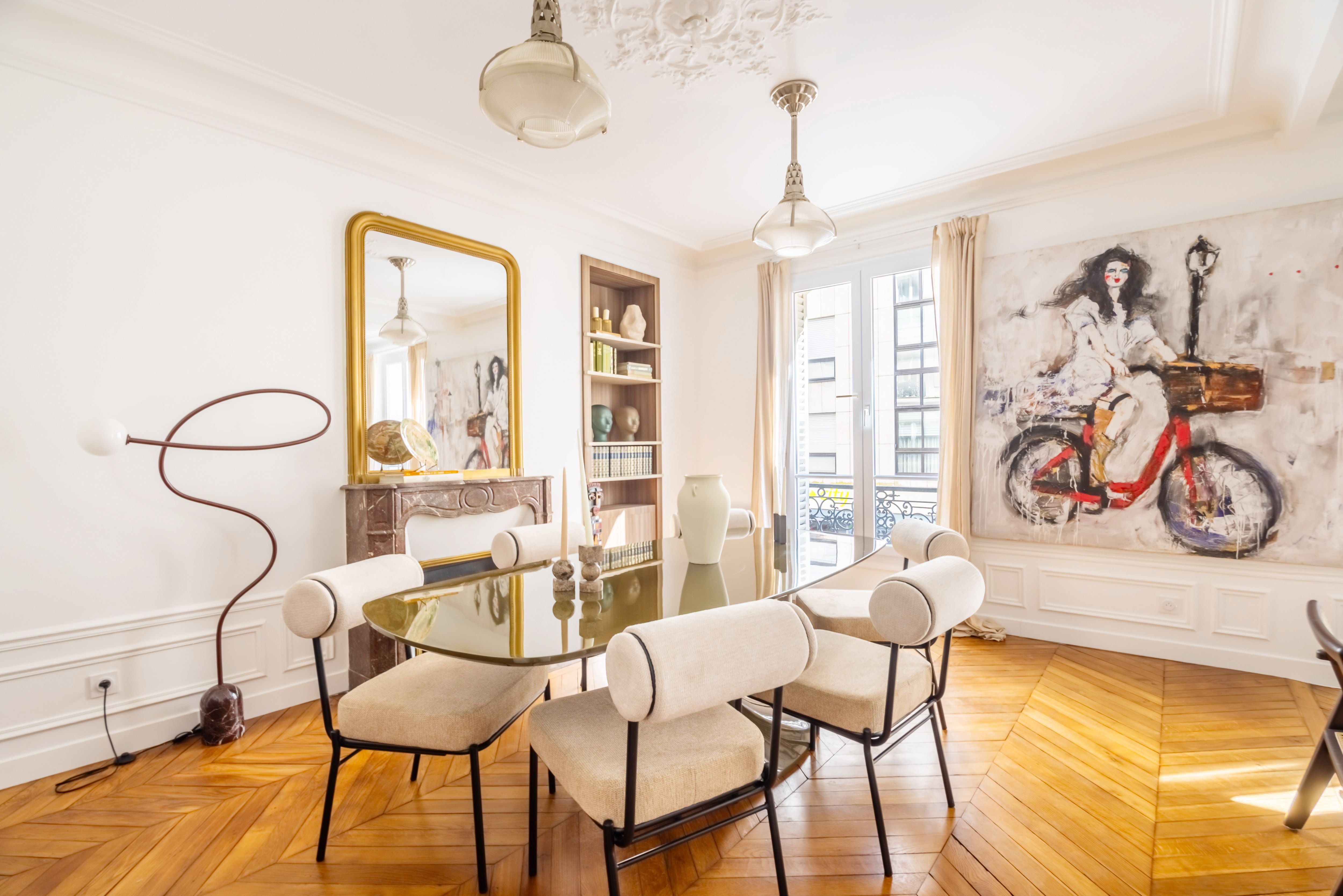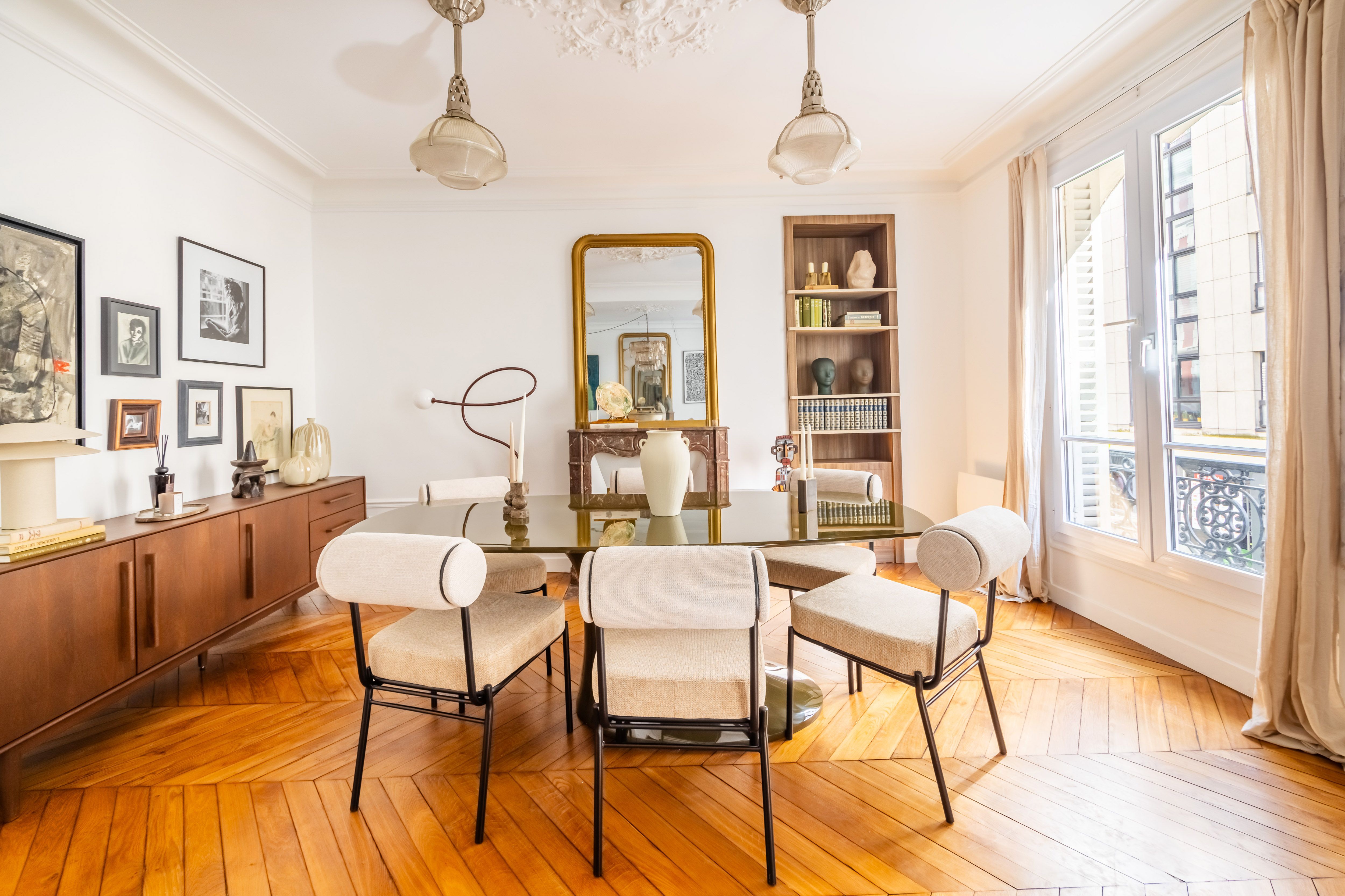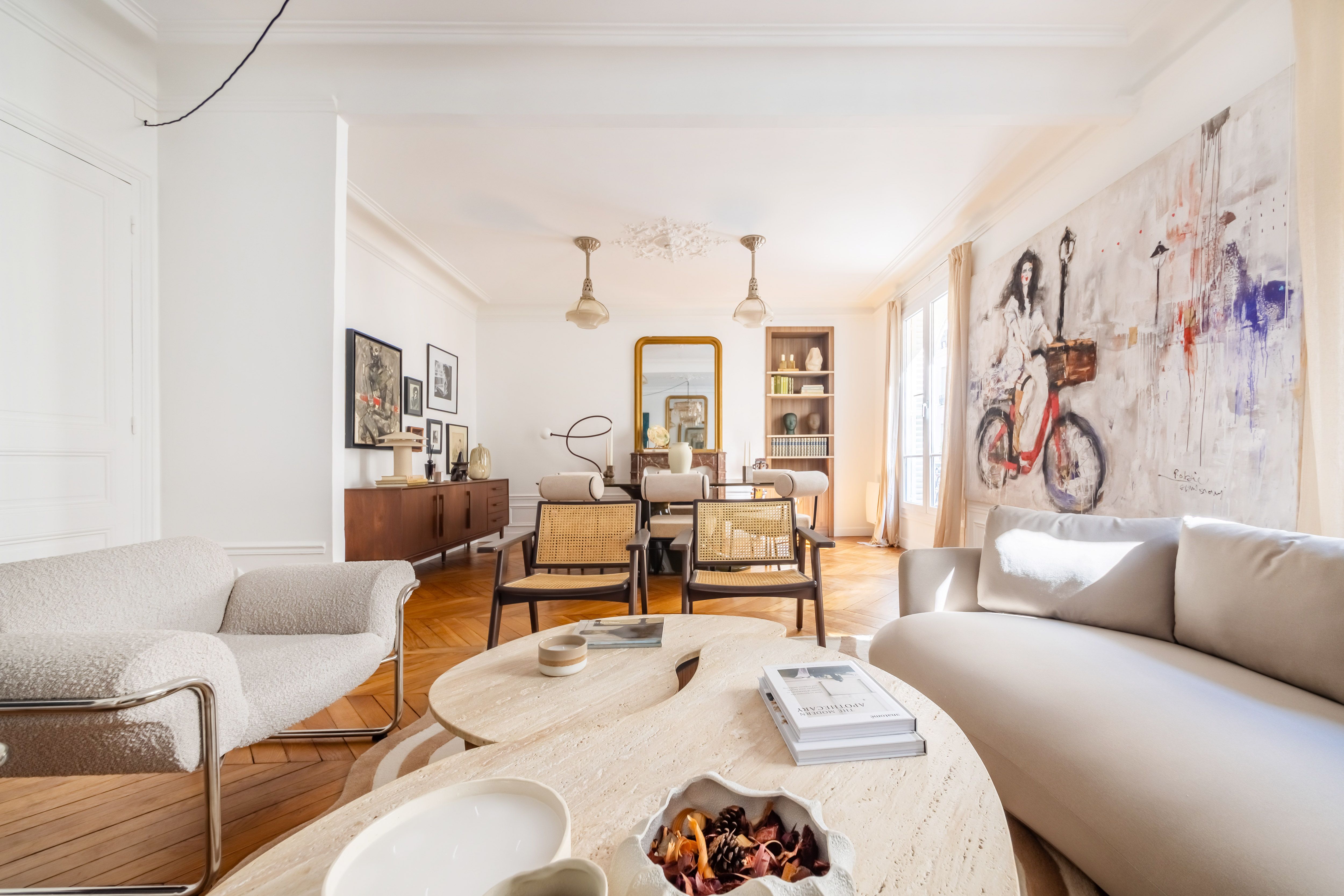 Experience the best of Paris from this beautifully designed apartment. It’s in a classic Haussmann-style building in the 15th arrondissement, with hardwood herringbone floors, vintage-style chandeliers, and elegant moldings. These historic details are offset by interesting artwork. The double living area is perfect for spending time together, with comfortable seating and a chic dining area – and there’s a well-equipped kitchen to cook in. Staying here, you’ll be within walking distance of shops, restaurants, and attractions including the Champ de Mars and the Eiffel Tower – what more could you ask for?