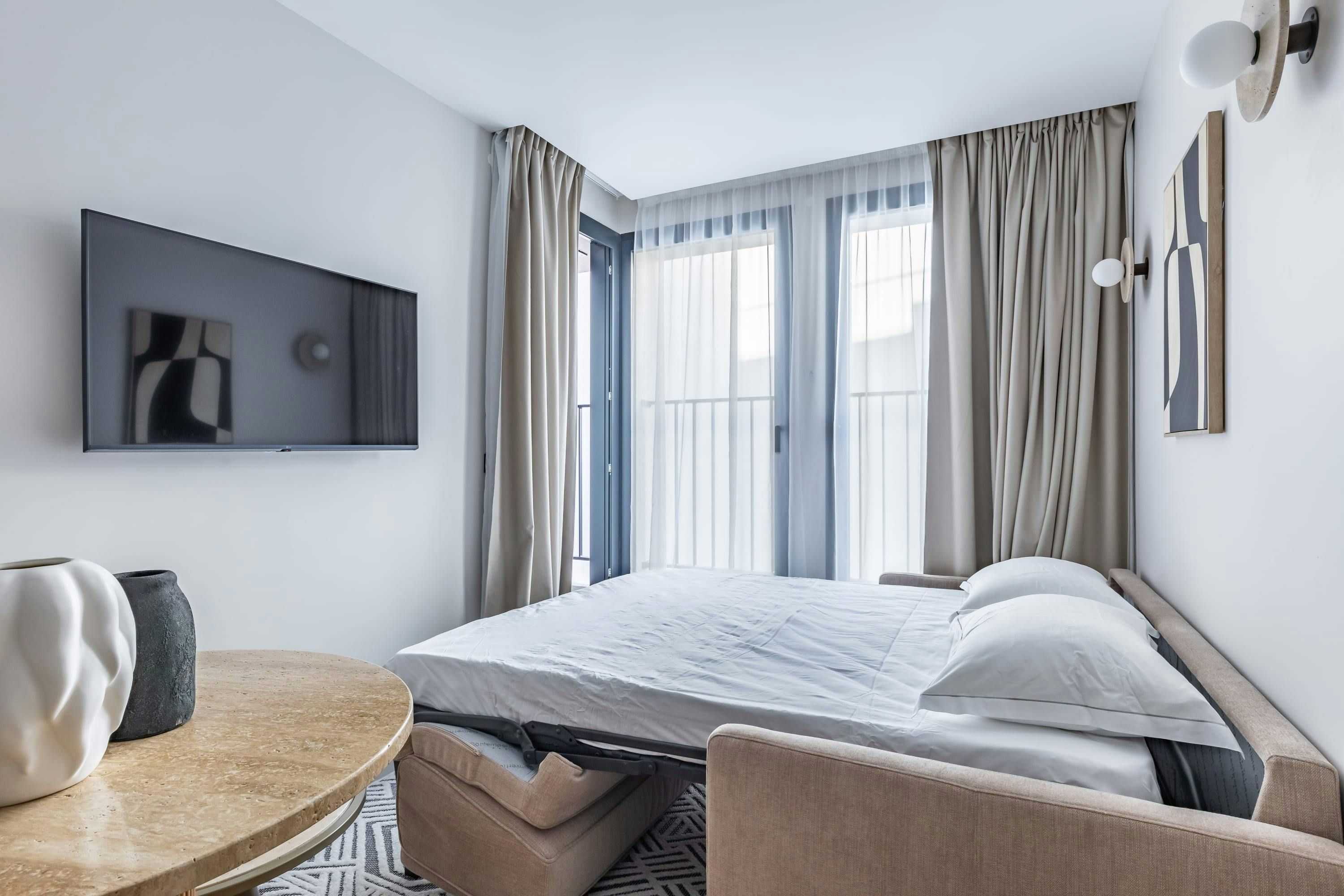 Whether you’re in Paris for business or leisure, this fuss-free pad is an ideal base, nestled between Opera and Madeleine. As a party of four, two will need to sleep on the sofa bed in the living room – otherwise, it’s perfect for couples or solo travellers. The balcony is a nice spot for morning coffee or an evening aperitif, while the on-site gym is a definite plus for those keen to keep on top of their exercise routine. Locally, you’ll find Place Vendôme, the Grand Boulevards and the Opera Garnier within walking distance – just make sure you stop off at some of the delicious eateries en route.