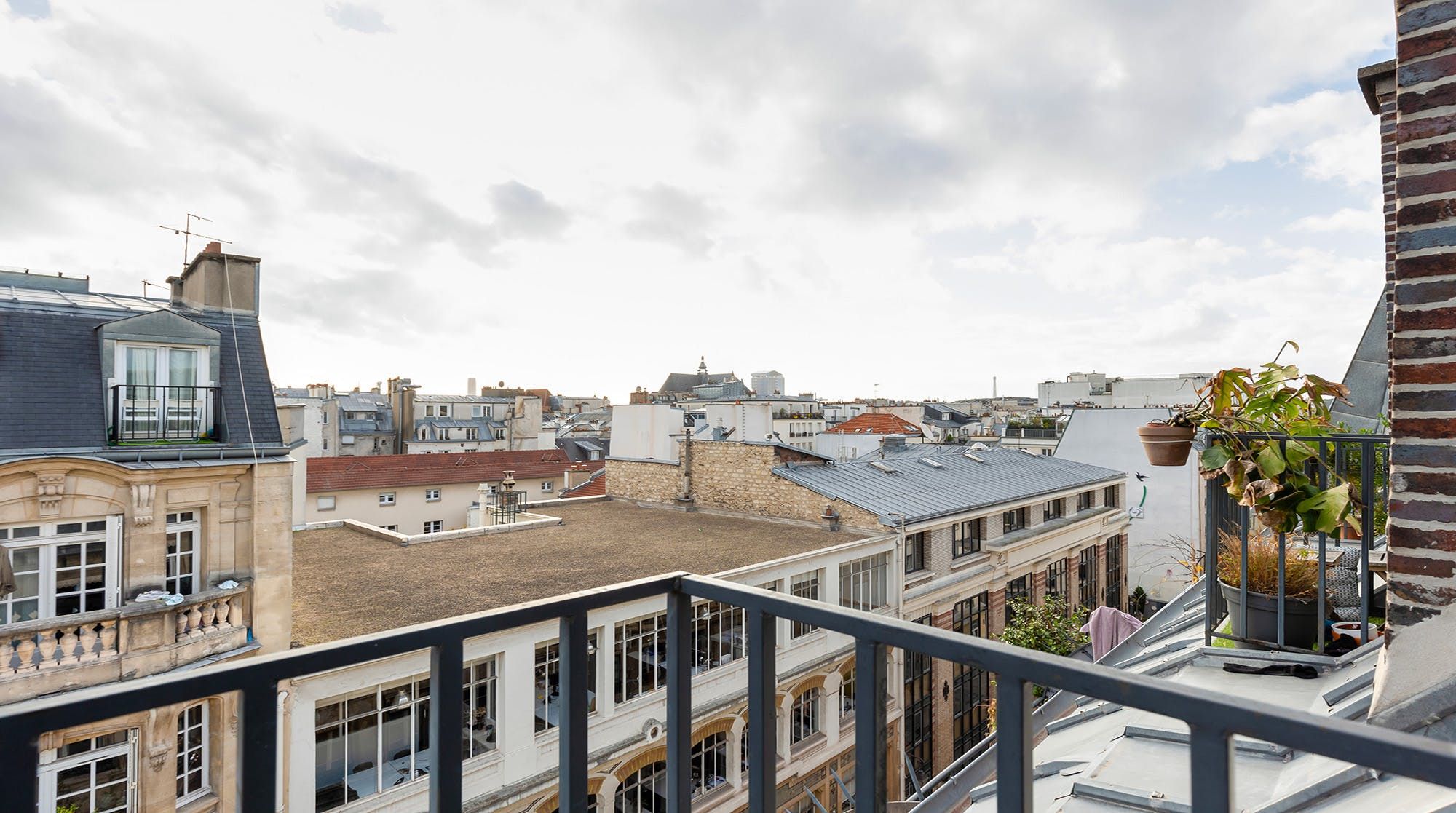 Sitting on the sixth floor with beautiful views over Paris’ rooftops towards the Eiffel Tower, this stunning loft-style apartment has classic Parisian prettiness written all over it.
