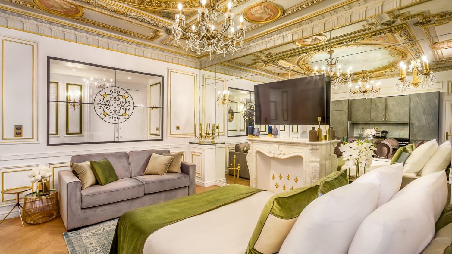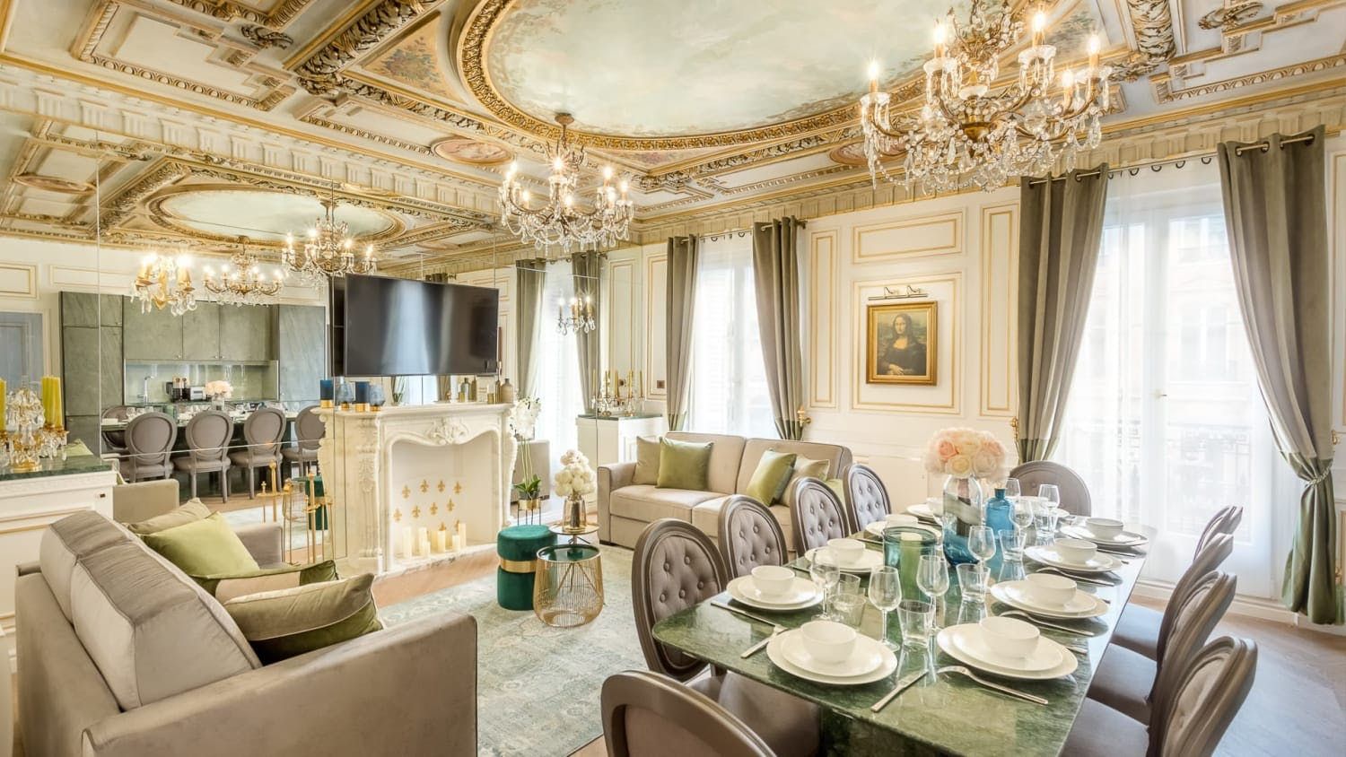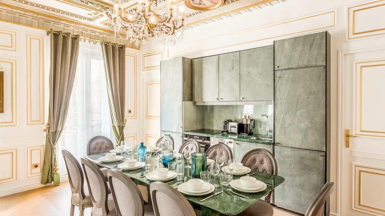 Quite literally dripping in gold, spectacular hand-painted original features, including mouldings gilded with gold leaf, retain hundreds of years of history encapsulated in this home. Listed as a heritage monument, the building dates back to the reign of King Louis XIV and has since been redesigned by a Parisian architect, allowing guests and residents to immerse themselves in French history, alongside all the contemporary comforts of modern-day luxury living. When we say "luxury", that's exactly what we mean, as the apartment is decked out in plush beds and sofas, antique furniture and one-of-a-kind artwork throughout. With copious restaurants, bars and cafes – all within walking distance, you'll have plenty of options when it comes to sampling the local cuisine. That being said, you'll certainly want to make the most of the opulent dining area in your Parisian home too, so sit down to a French banquet of dreams one evening for an unforgettable experience of pure indulgence. Bon appetit! The night doesn't end there – follow your dinner of great food and wine with a relaxing soak in one of the cosy jacuzzi bathtubs.