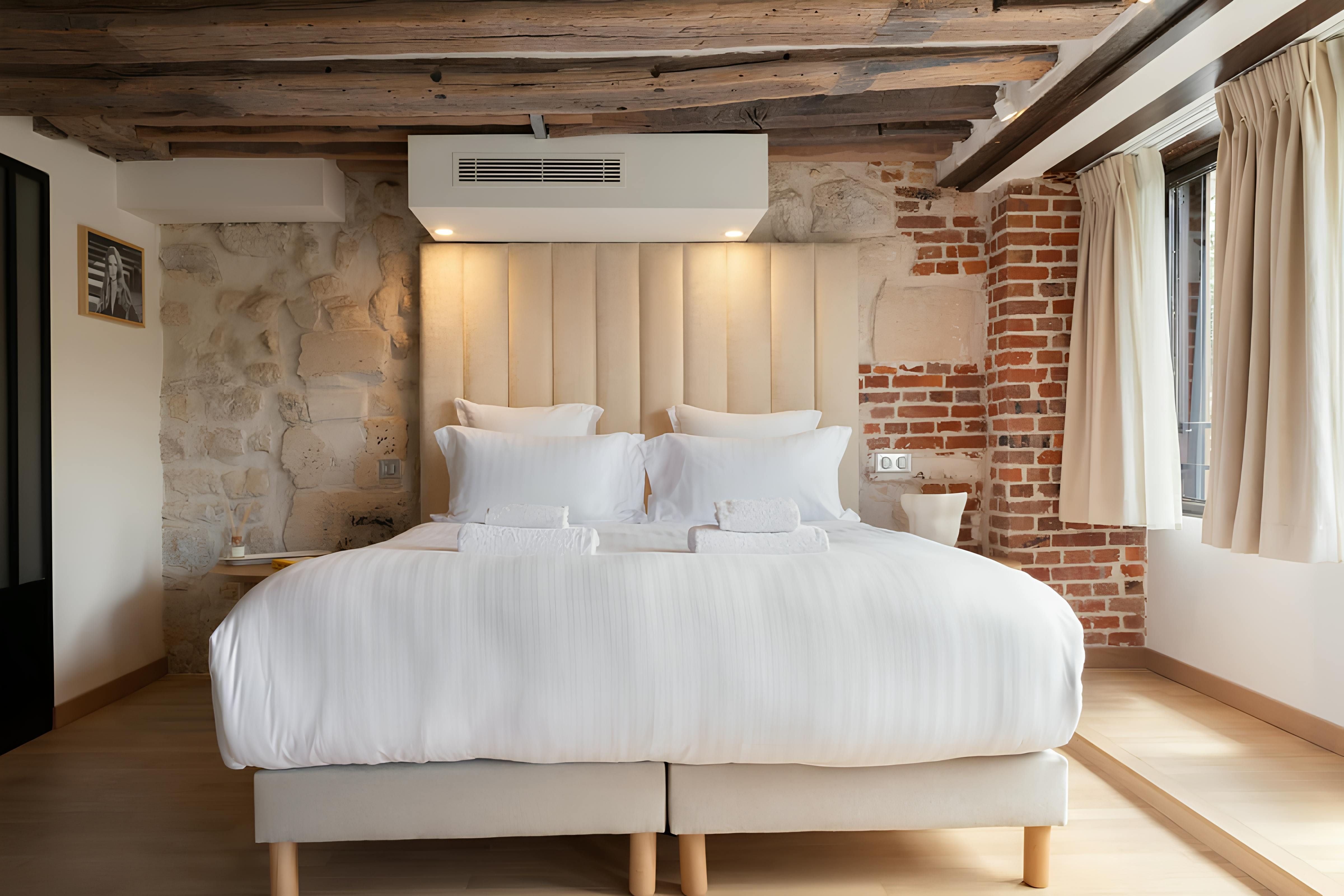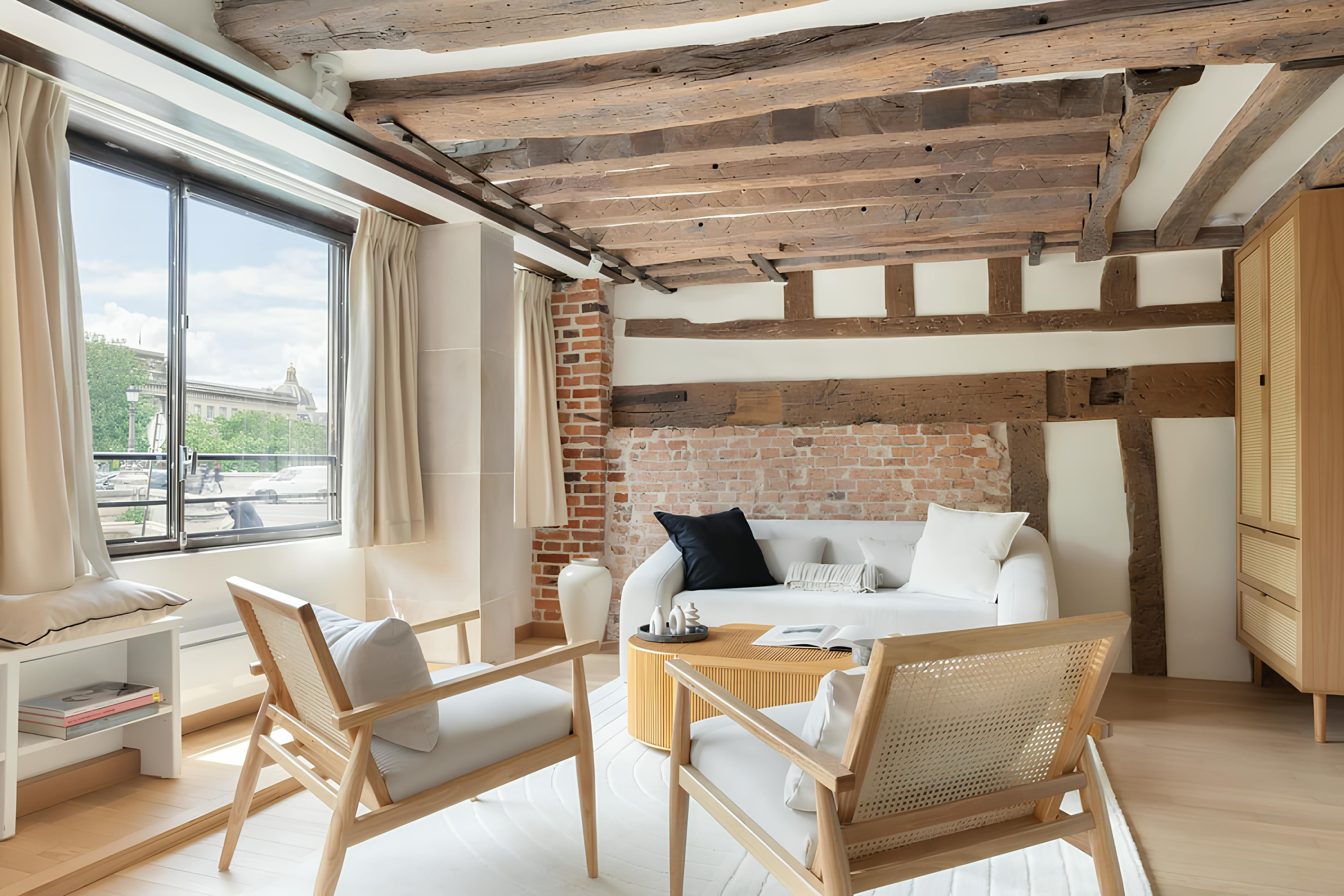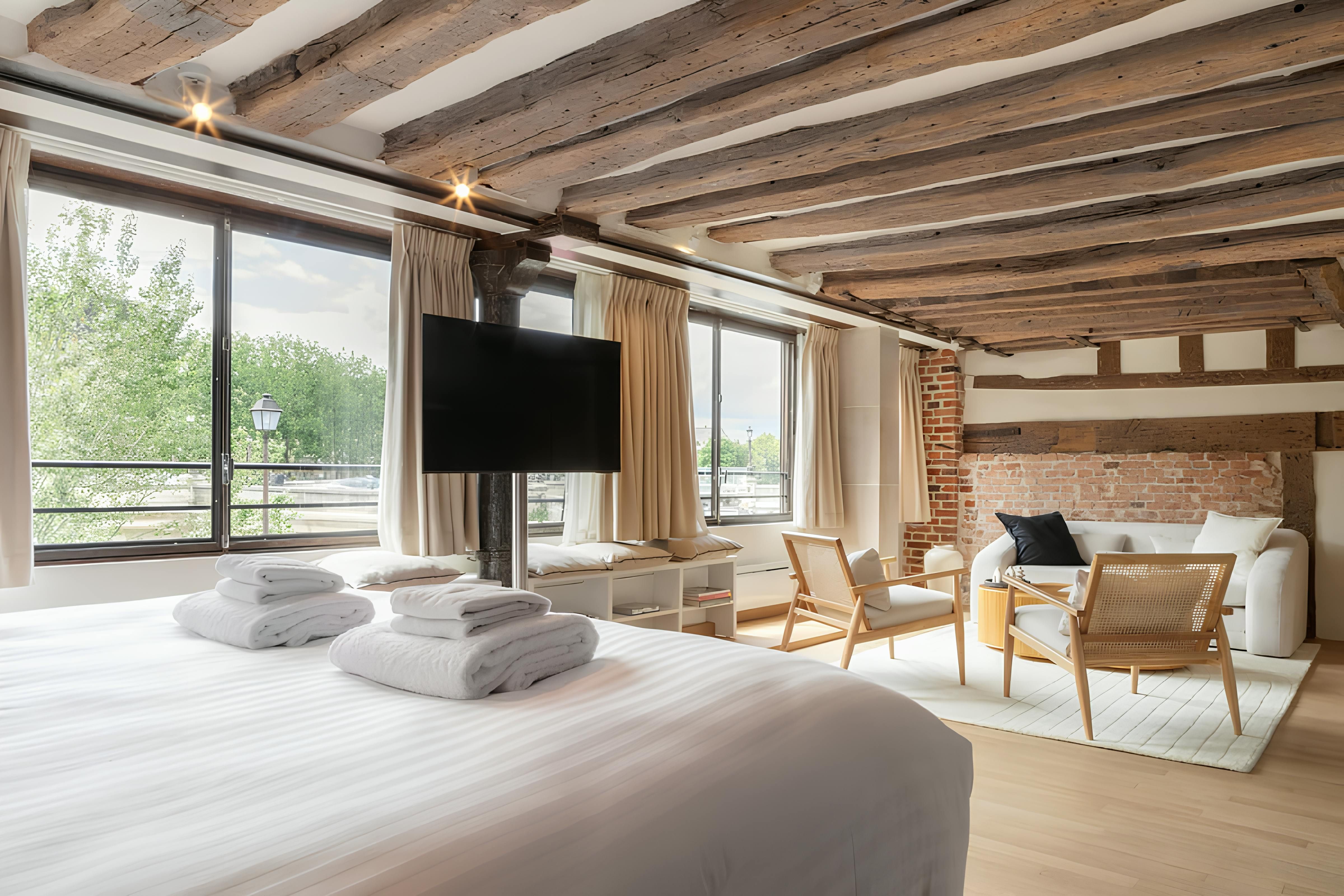 Experience island life in Paris – this studio apartment is located on the Île de la Cité. You can go for walks along the River Seine or visit the Sainte-Chapelle or Notre Dame – both are within walking distance. Alternatively, cross the Pont Neuf and browse the art at the Louvre Museum. Housed in a beautiful building, this air-conditioned studio offers views over the Parisian skyline. We also love the character features such as the stone walls and beams. All in all, this place has everything you need for a comfy stay in the City of Light.
