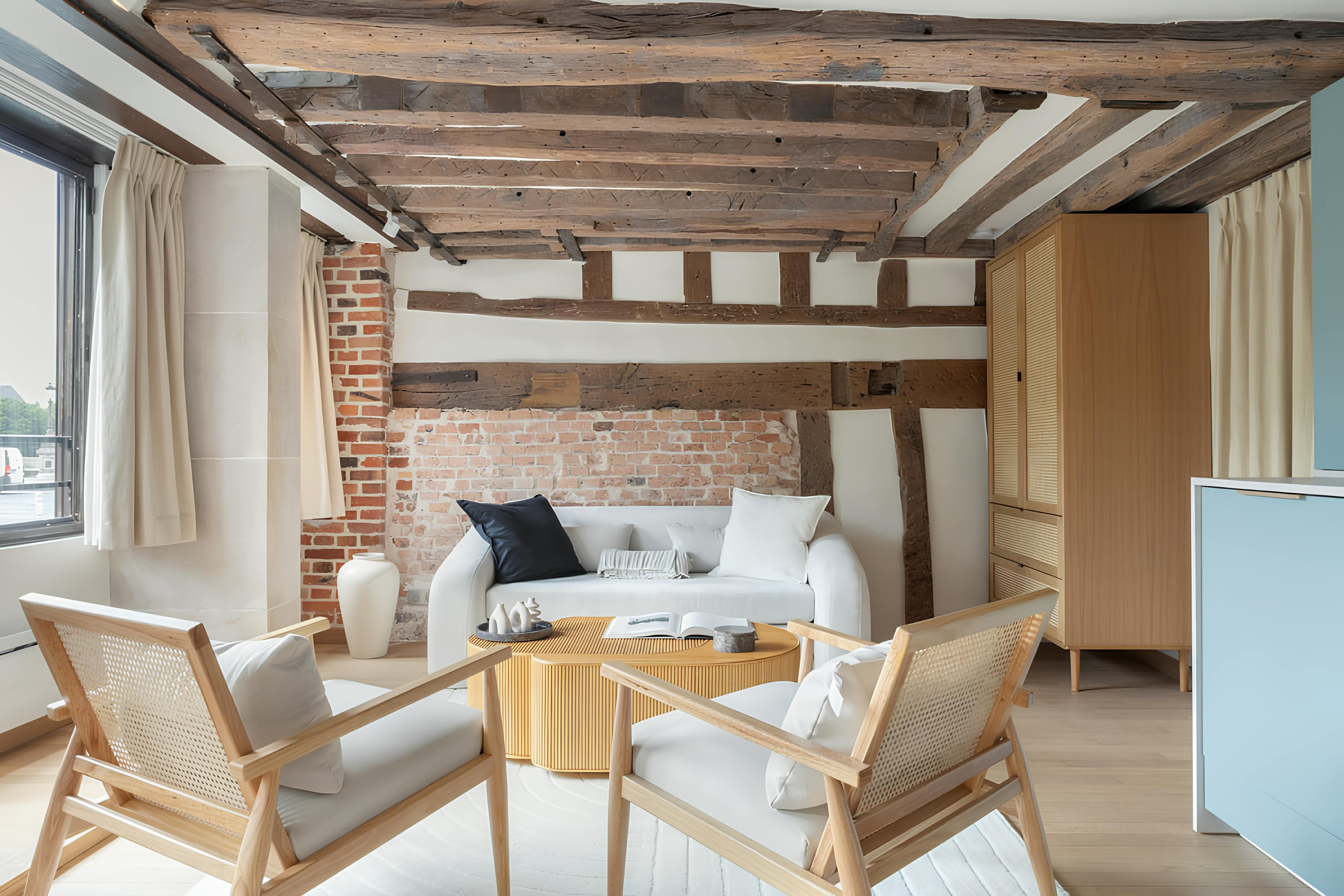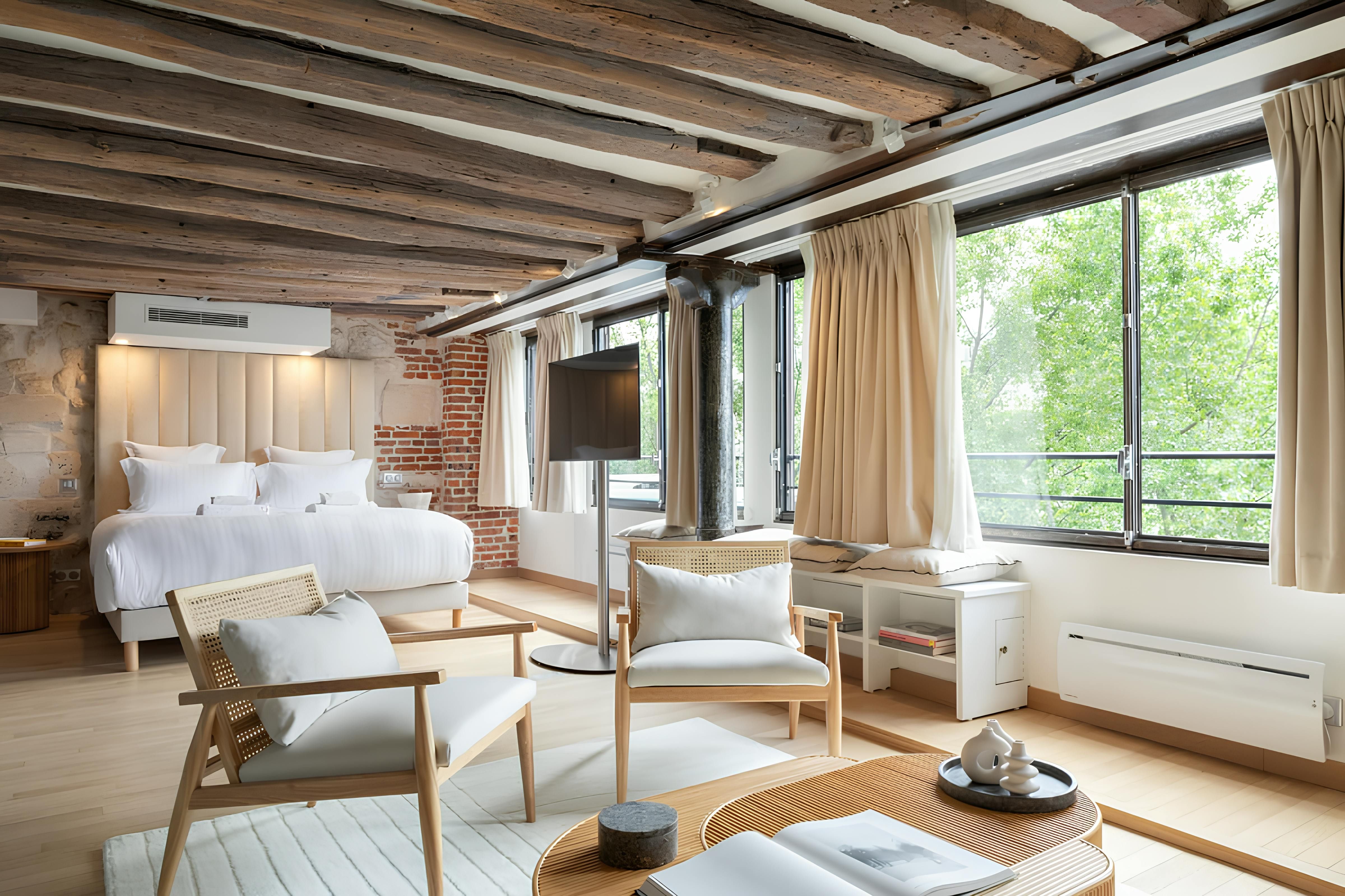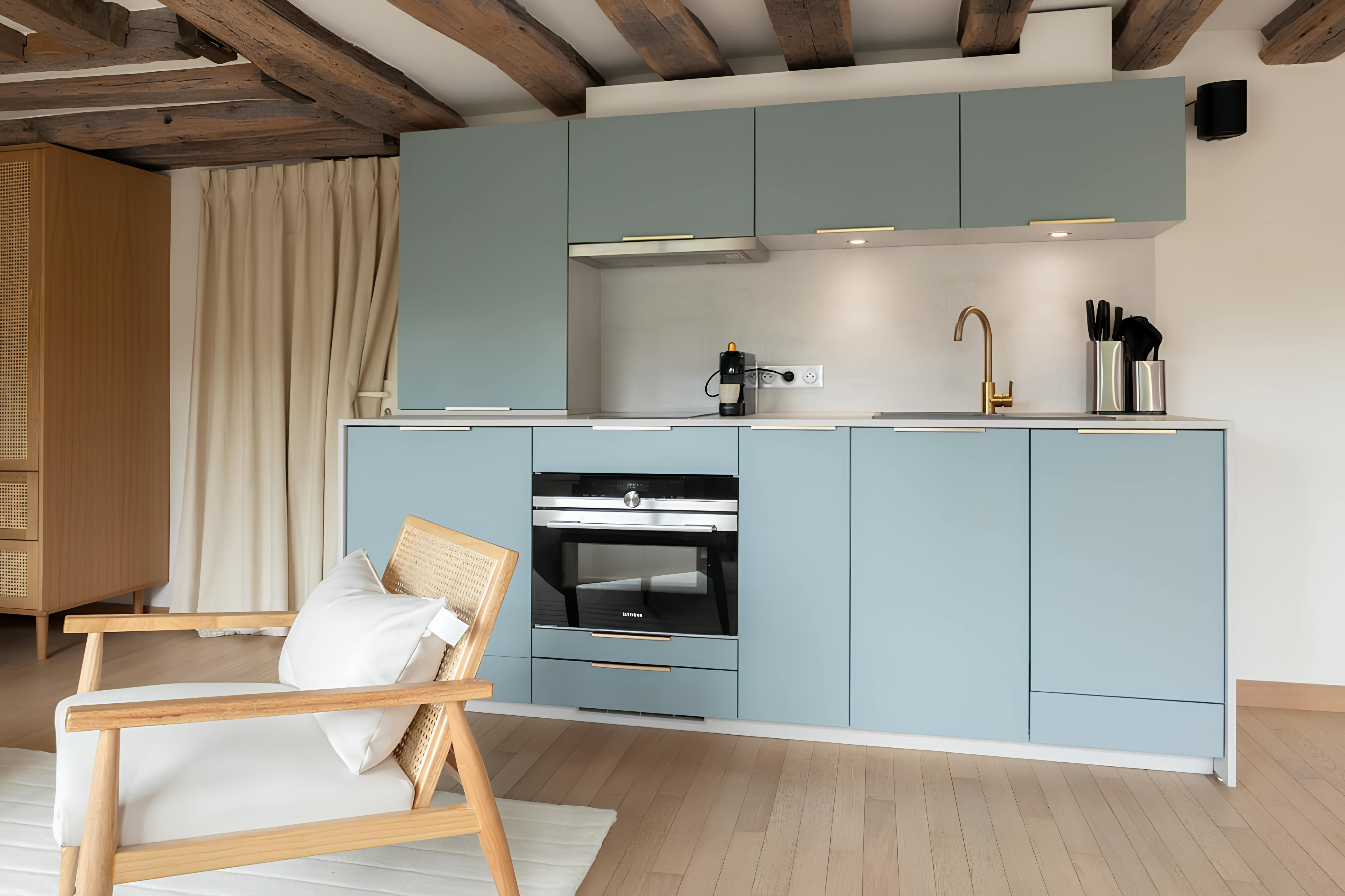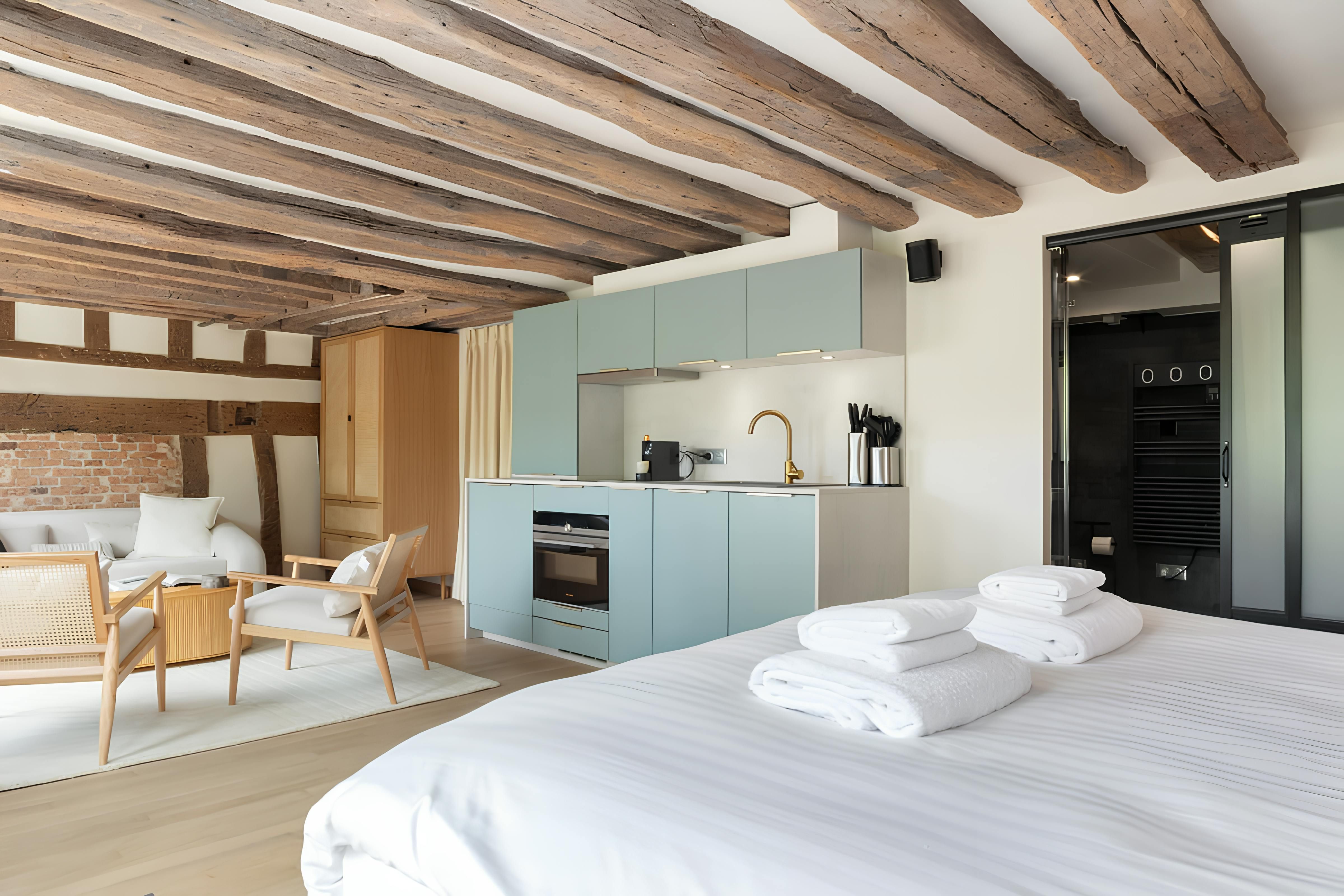 Experience island life in Paris – this studio apartment is located on the Île de la Cité. You can go for walks along the River Seine or visit the Sainte-Chapelle or Notre Dame – both are within walking distance. Alternatively, cross the Pont Neuf and browse the art at the Louvre Museum. Housed in a beautiful building, this air-conditioned studio offers views over the Parisian skyline. We also love the character features such as the stone walls and beams. All in all, this place has everything you need for a comfy stay in the City of Light.