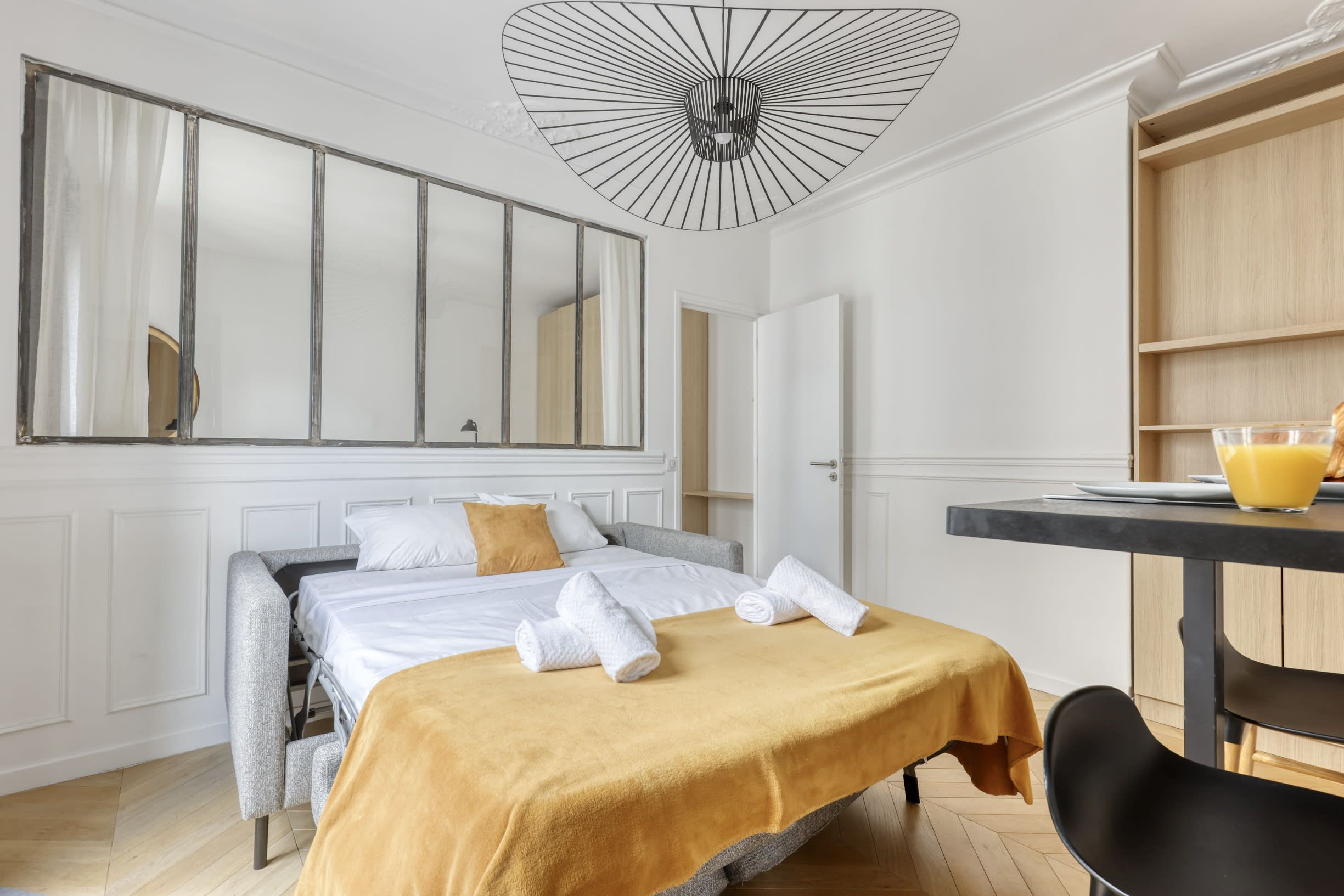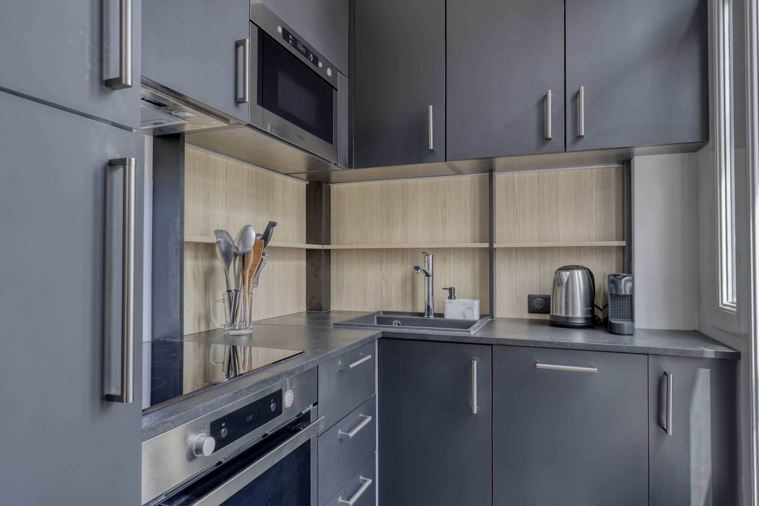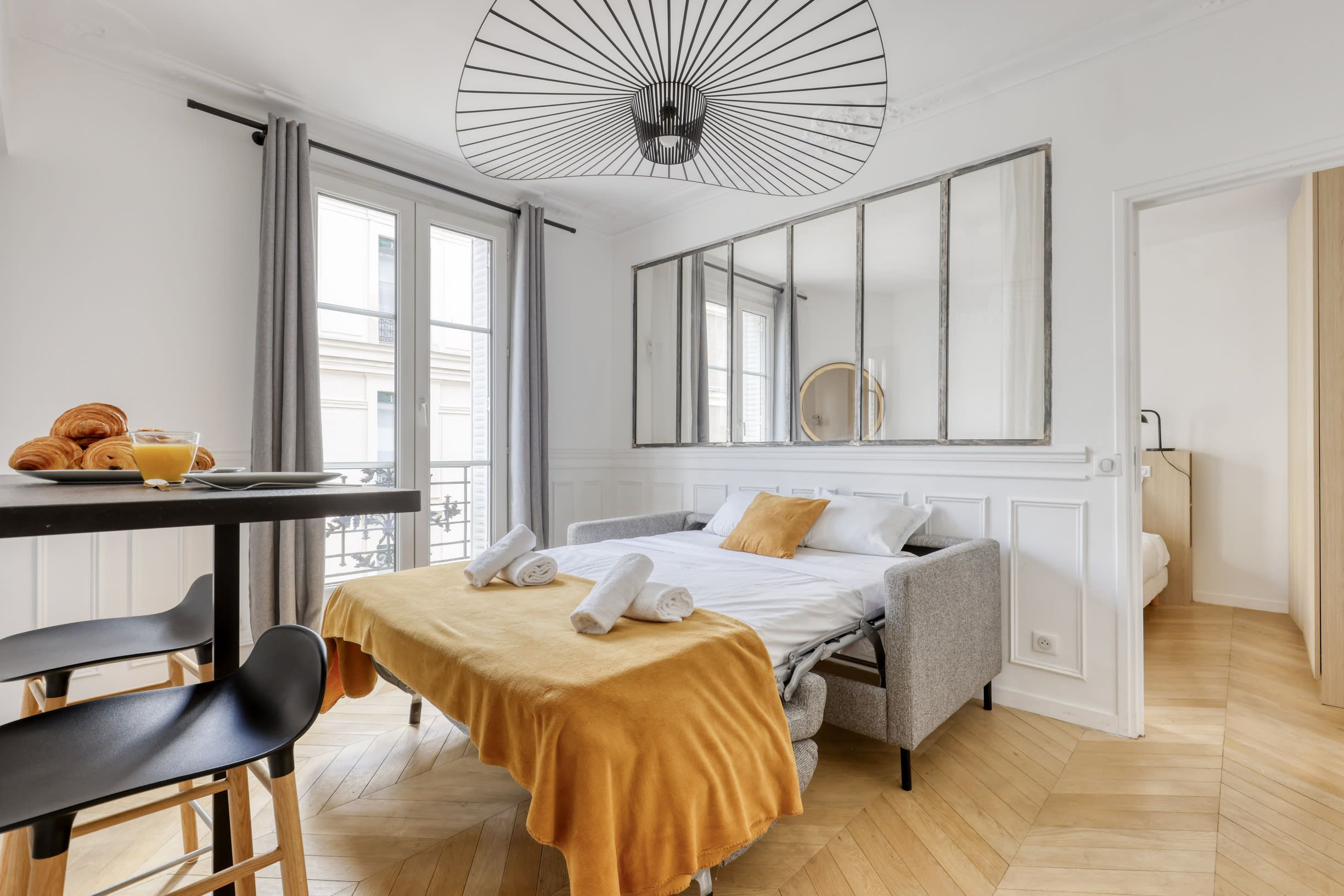Located in the 15th arrondissement, this apartment is within walking distance of the Champ de Mars and the iconic Eiffel Tower. The River Seine and the Parc André Citroën are also reachable on foot when you feel like a stroll. You’ll find plenty of shops, and typically Parisian cafes, bars and restaurants in the vicinity as well. The apartment itself has a bright living room (this space also sleeps two guests on a sofa bed at full occupancy). There’s a separate compact but well-appointed modern kitchen here, too, perfect for cooking some Parisian cuisine.