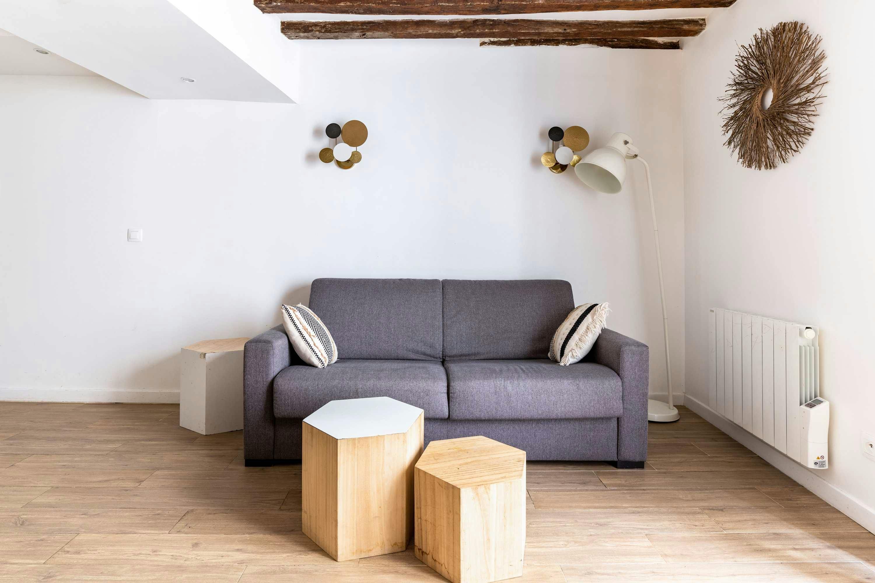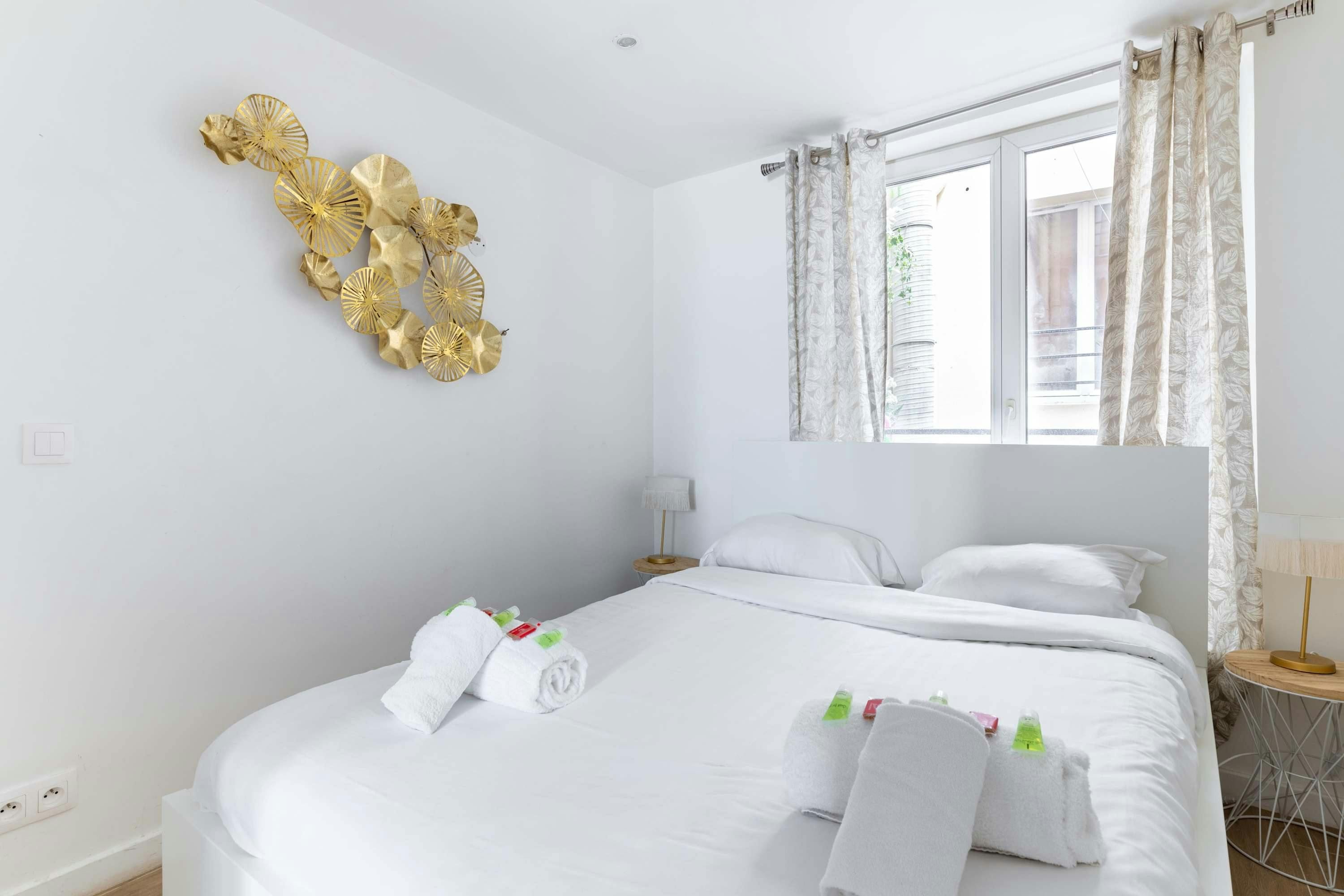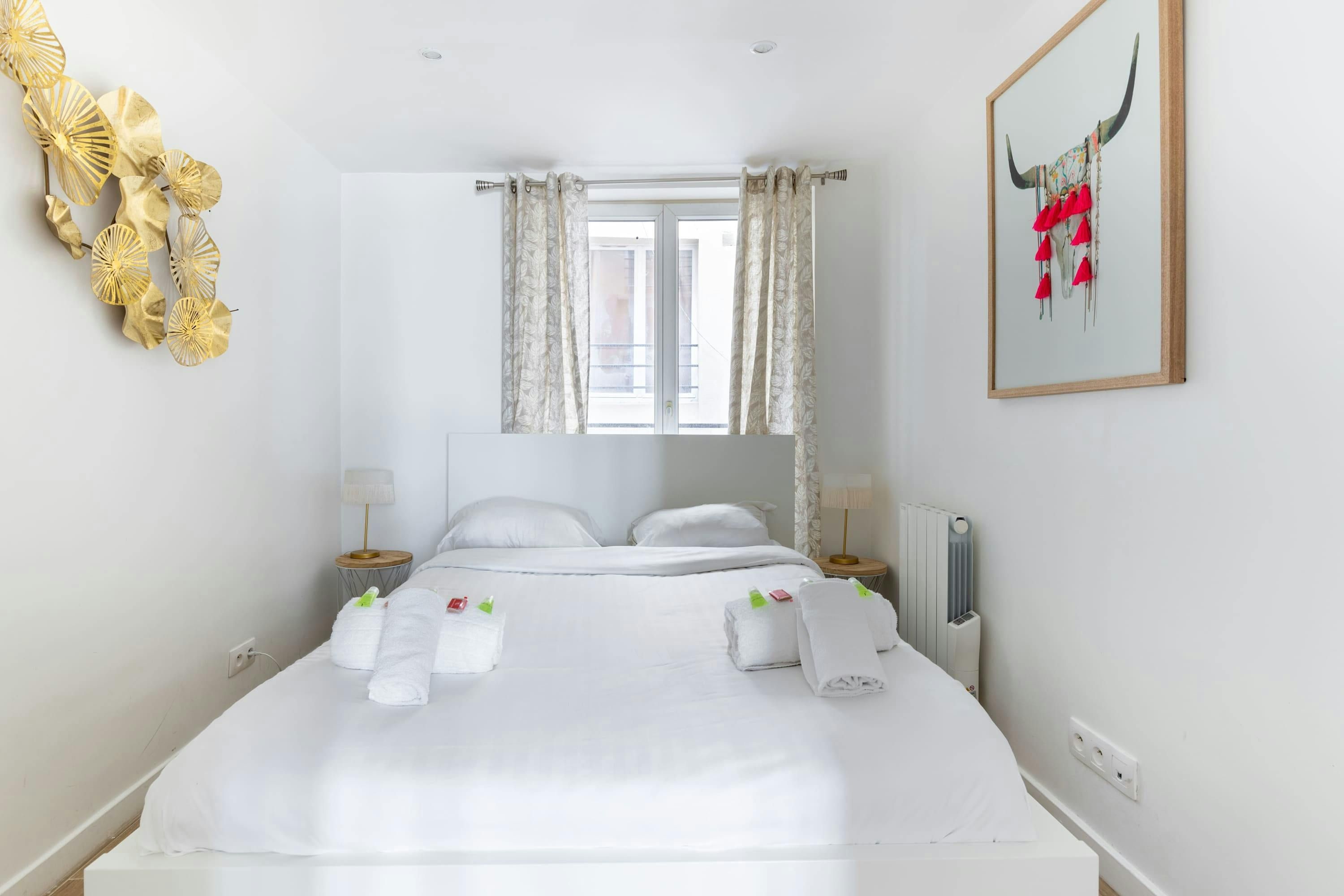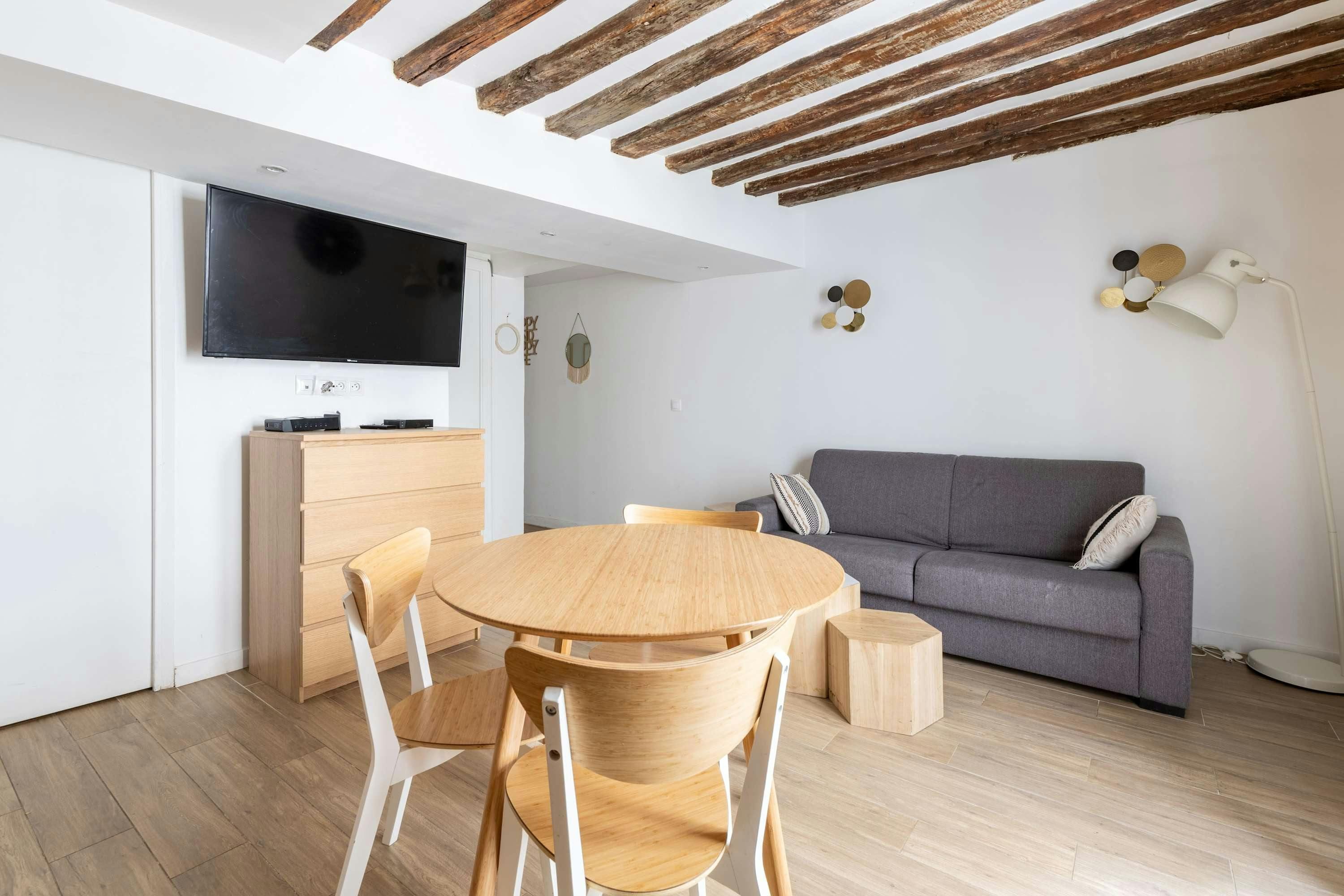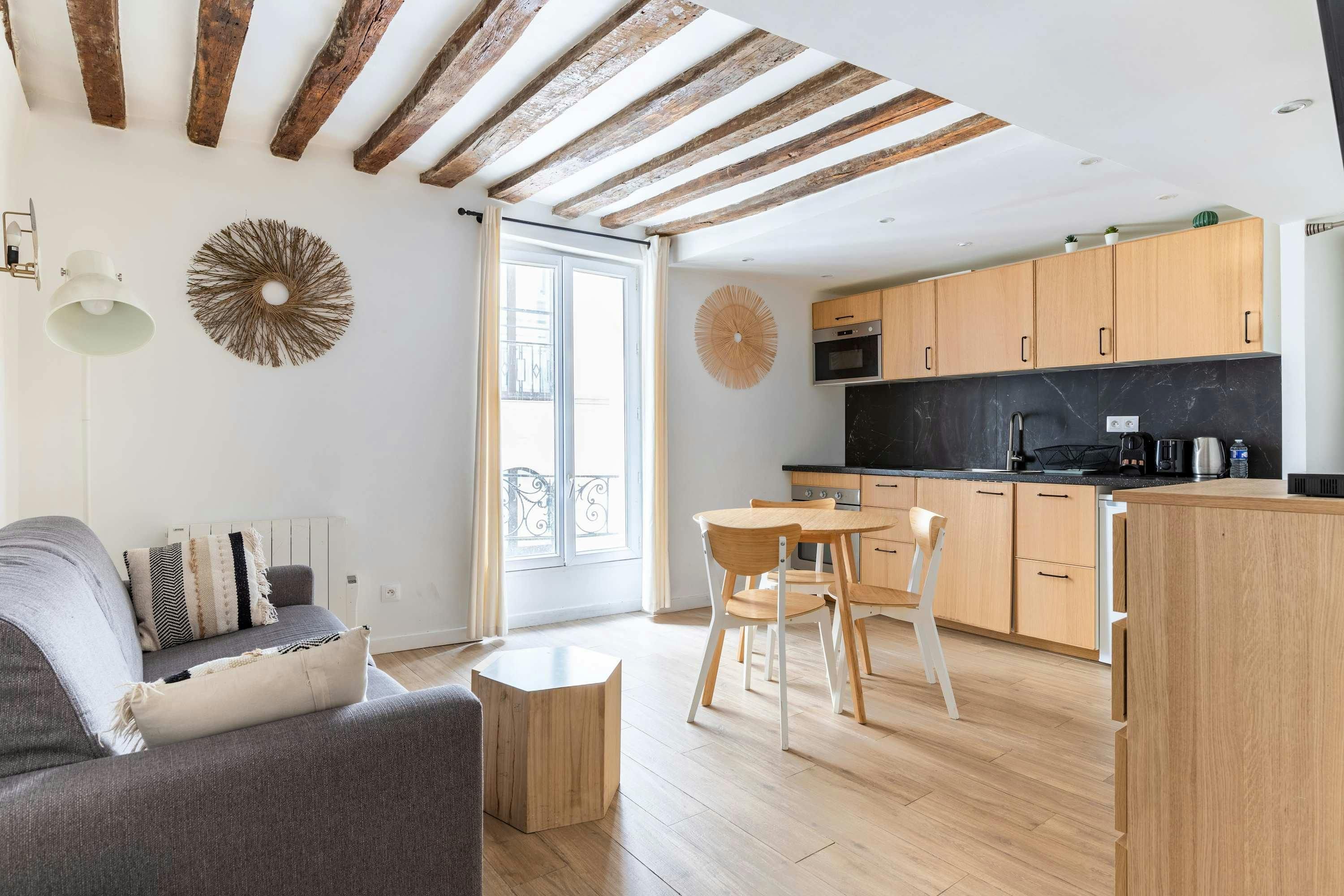 Located in the vibrant Grands Boulevards district, this apartment places you close to concert venues, theatres, shops, and restaurants. You'll also be within walking distance of key attractions such as the Louvre Museum, the Pompidou Centre, and the Palais-Royal. The apartment features an open-plan living area filled with character. This space also sleeps guests three and five on a sofa bed. One other thing to note. The bedroom is somewhat compact, but it provides everything you need for a comfortable night's sleep.