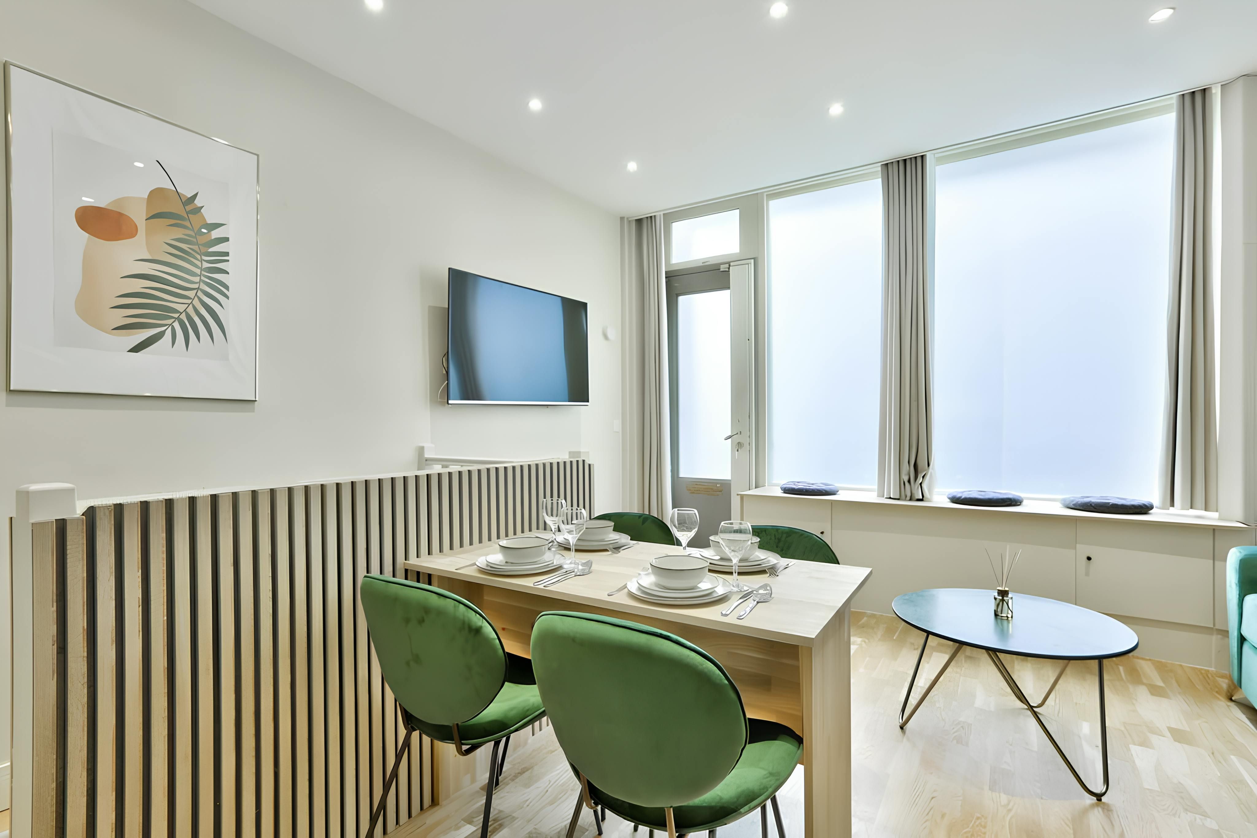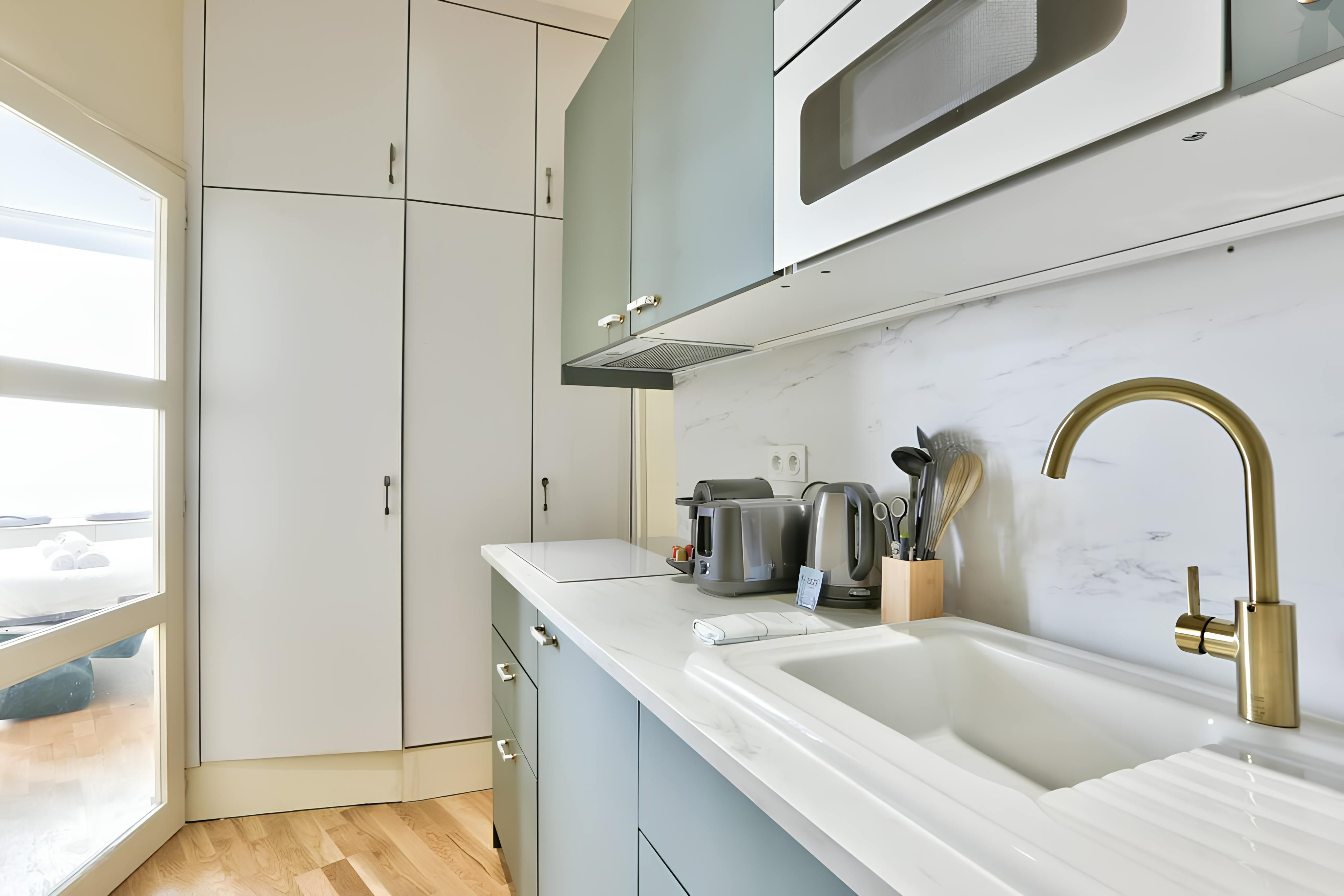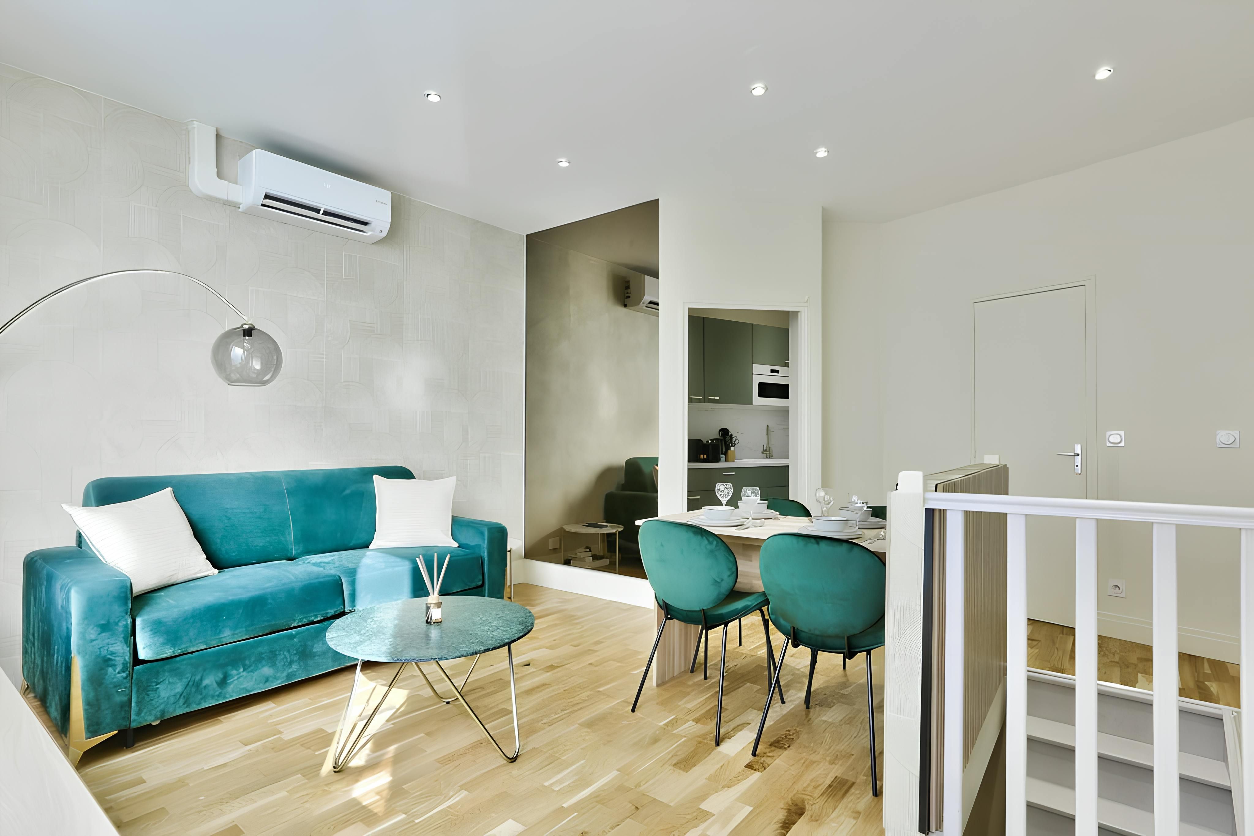 This cosy apartment is in Paris’ 15th Arrondissement, less than ten minutes’ walk from the Eiffel Tower. In fact, you can spot the Iron Lady as soon as you turn the corner of your boulevard. How’s that for a welcome to Paris? A renovated shop, the apartment is at street level, but frosted windows afford some privacy in the living room while letting the light in. The full kitchen is in a separate space, ideal when the sofa bed is in use. You’ll find the bedroom in the basement where a lack of windows would suit those who like it truly dark to sleep.
