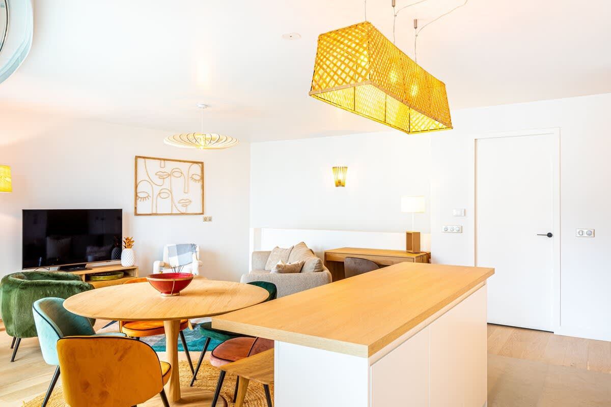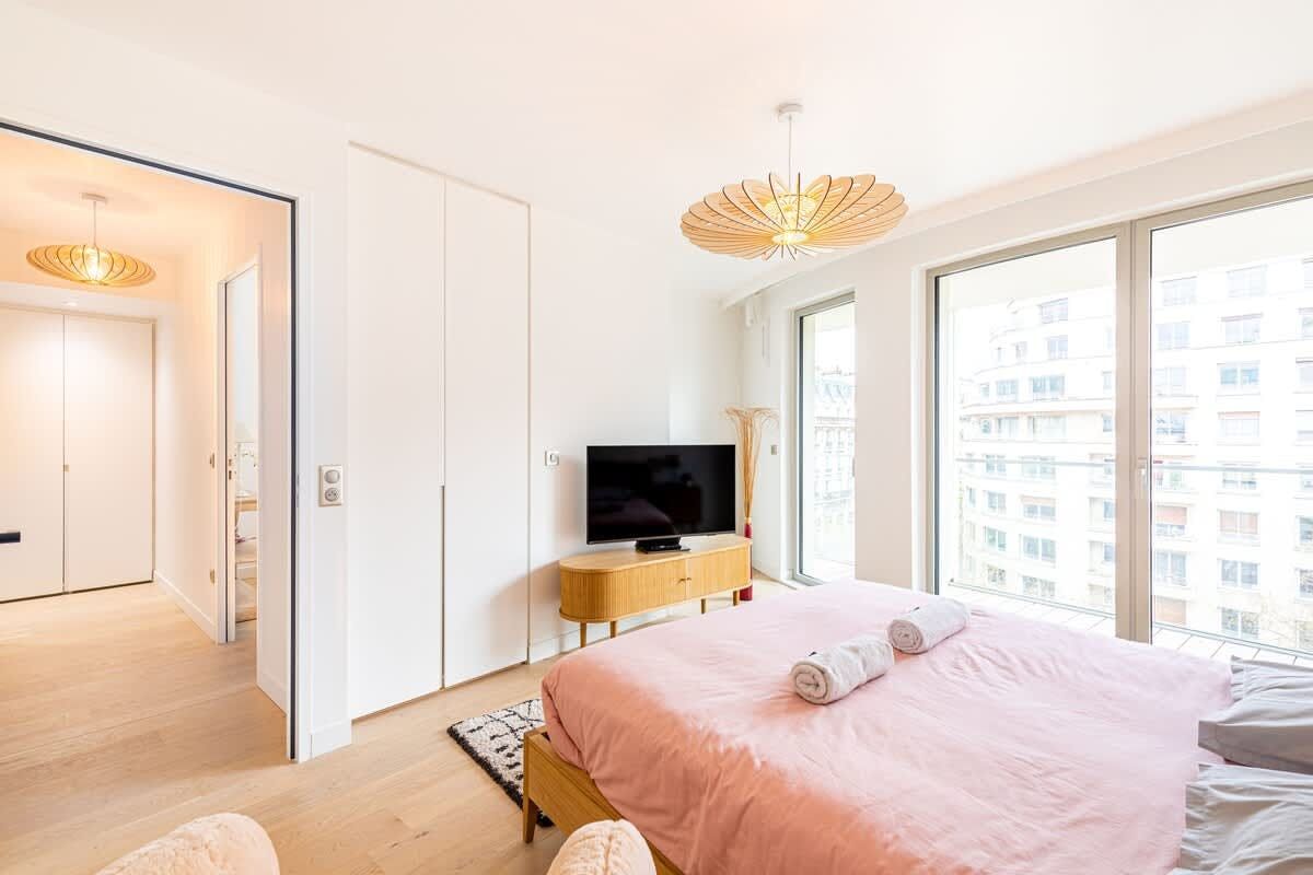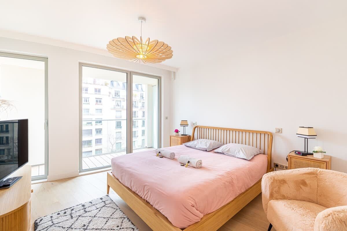 Whether you're here for work or play, this colourful apartment is the perfect base. It has two balconies – one with bistro seating for morning coffees or evening drinks – and an open-plan kitchen and living area with a breakfast bar and dining table (both double up nicely as a desk if you need it). Location-wise, it's in the tranquil neighbourhood of Boulogne Billancourt, a short walk from the Bois de Boulogne and the banks of the Seine. When you're ready to explore the rest of the city, the metro stop is right outside your door.