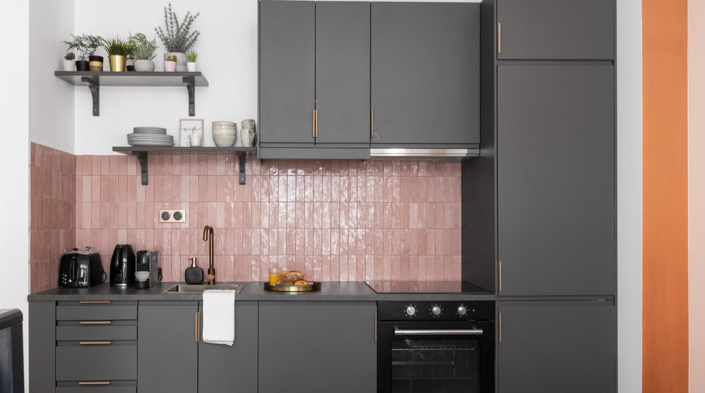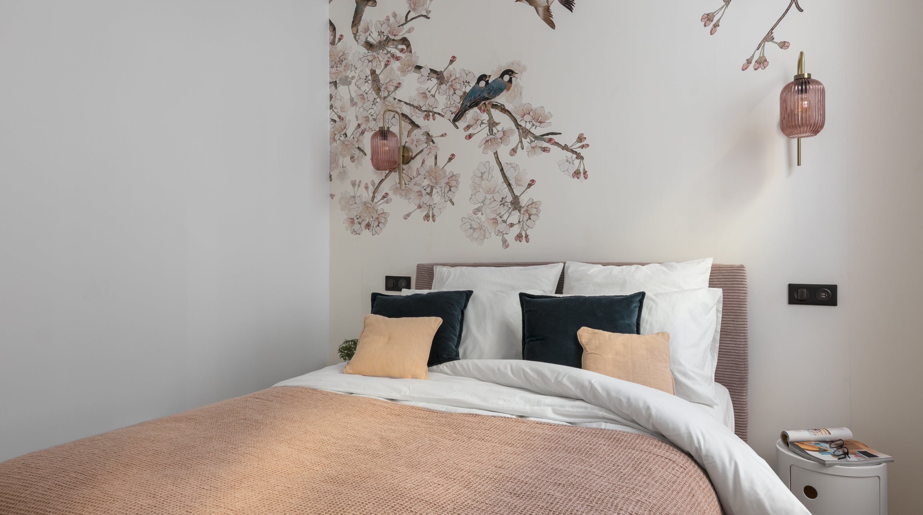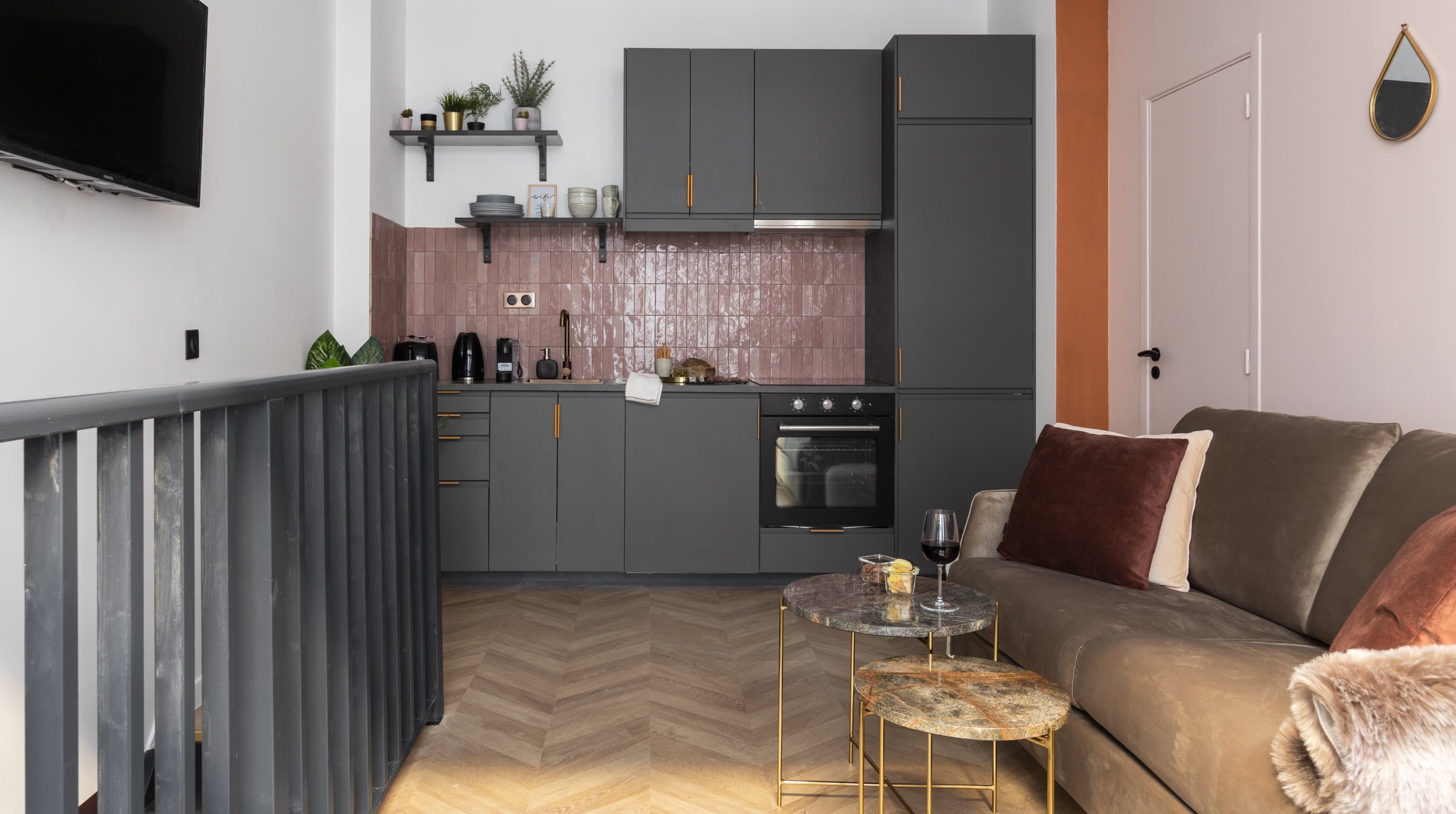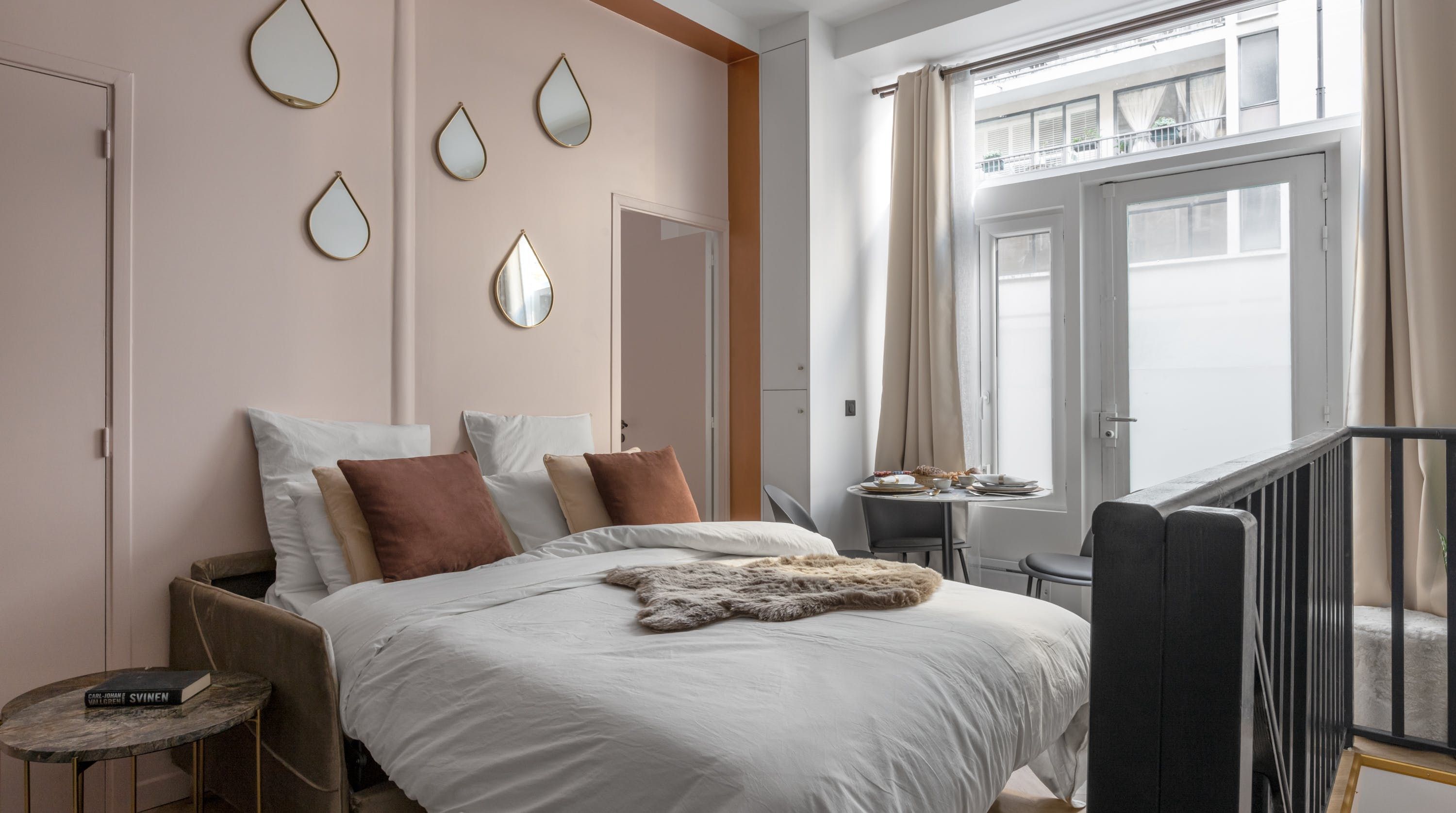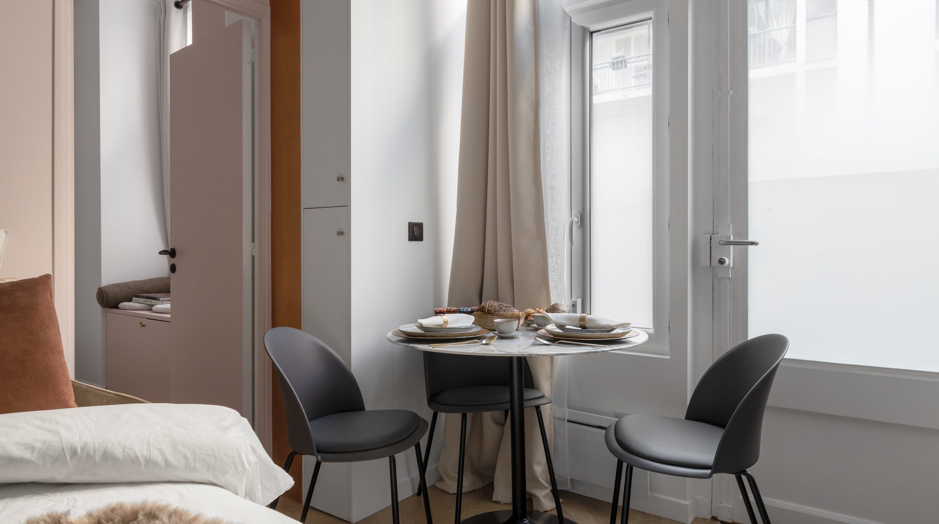 Back inside, this home packs a decorative punch with a neutral palette offset by soft pink accents, bold wallpaper prints and traditional parquet flooring. We love the pink backsplash in the kitchenette – perfectly suited for whipping up your morning croque madame or simply loading the oven with pain au chocolats. After a day exploring, eating and drinking, return to one of the cosy, beautifully decorated bedrooms for a delightful night's sleep, knowing the sights of the city of lights are just outside.