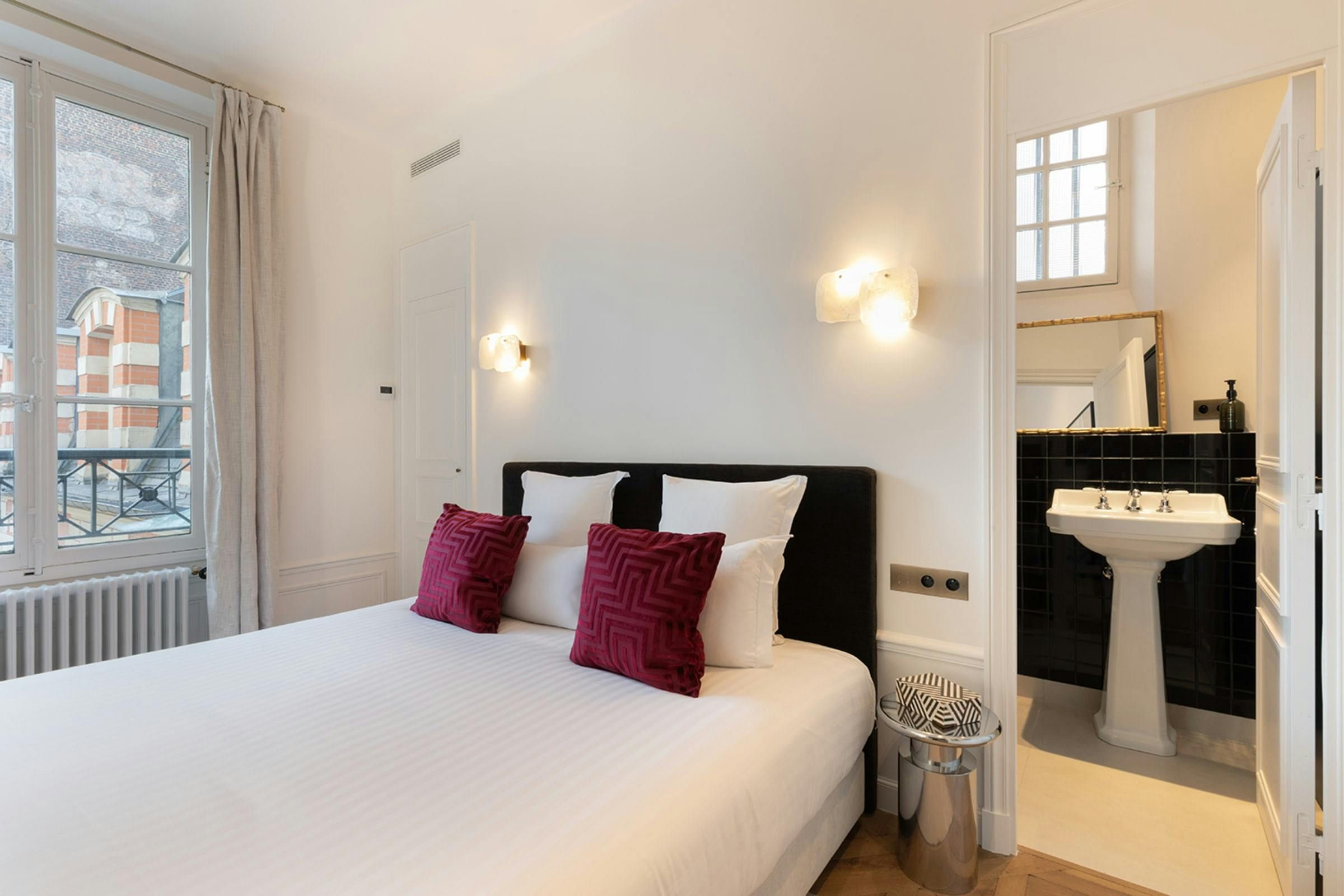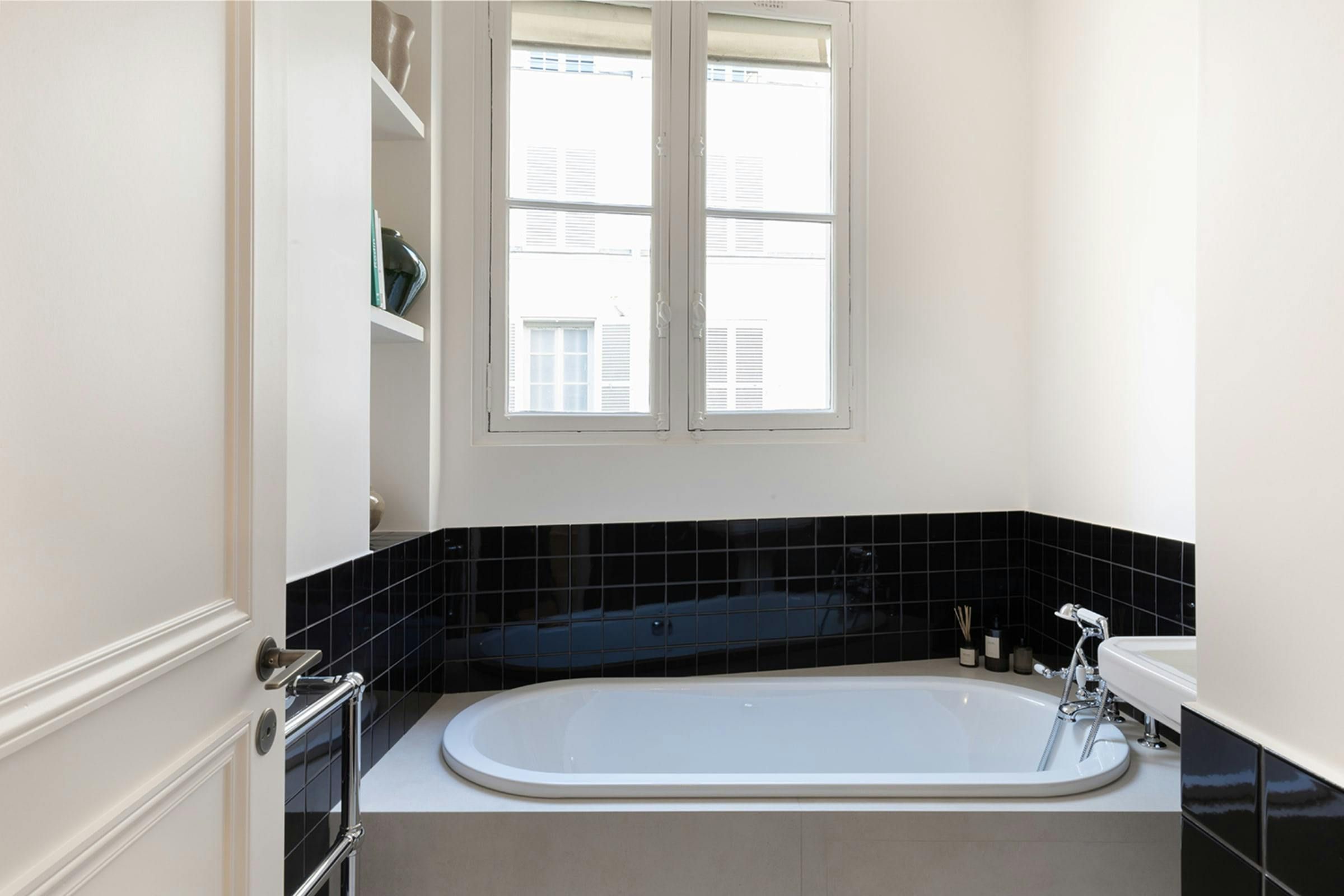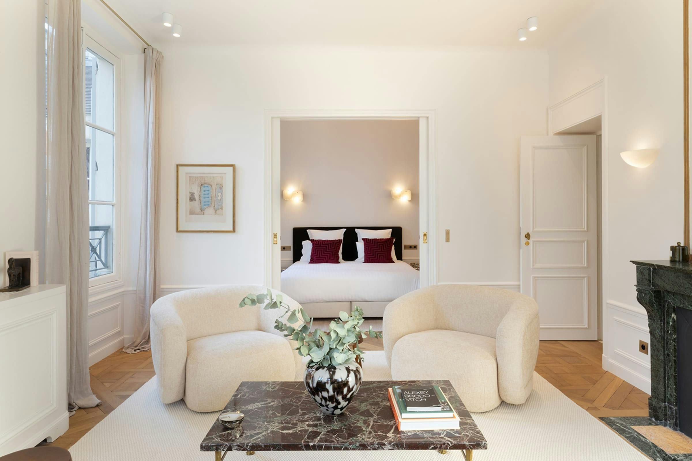 Set on one of the most prestigious streets in Paris, this architect-designed apartment lives up to its stylish surroundings. The living space is bathed in sunlight, creating a luxe place to kick back and unwind. There's a small but perfectly formed kitchen, as well as a pair of bedrooms with handy en-suite bathrooms. Saint-Germain-des-Prés is one of the city's most celebrated neighbourhoods for a reason. Here, sidewalk cafes, antique bookshops, and delicious eateries are at your fingertips. You can stroll to Notre Dame, the Louvre, and Musée d'Orsay, while nearby metro stations make getting around the capital a cinch.