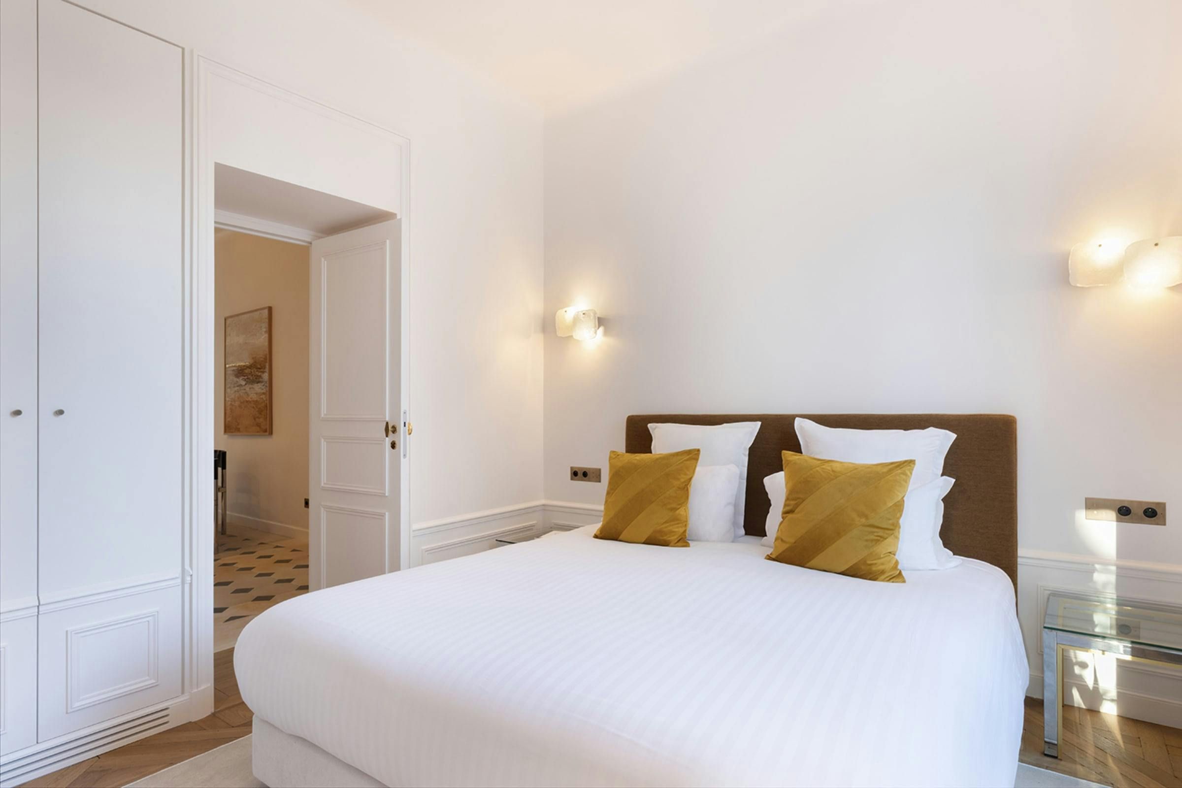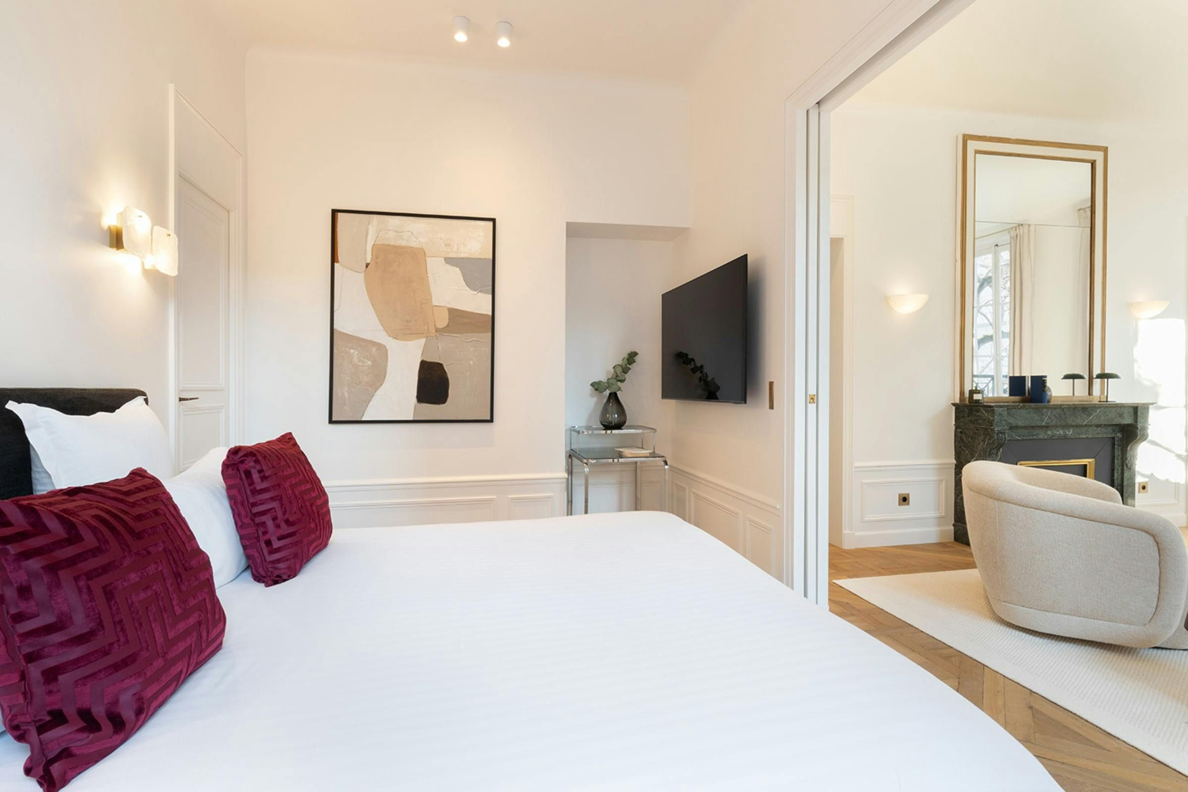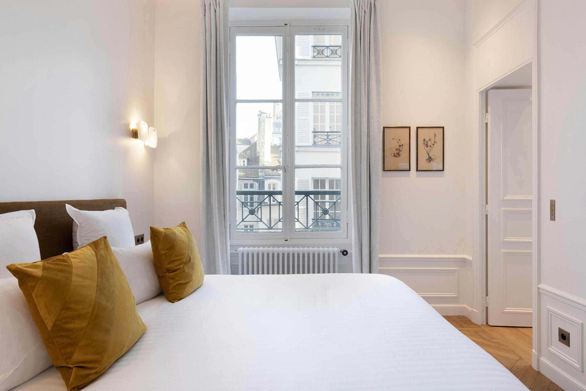 Set on one of the most prestigious streets in Paris, this architect-designed apartment lives up to its stylish surroundings. The living space is bathed in sunlight, creating a luxe place to kick back and unwind. There's a small but perfectly formed kitchen, as well as a pair of bedrooms with handy en-suite bathrooms. Saint-Germain-des-Prés is one of the city's most celebrated neighbourhoods for a reason. Here, sidewalk cafes, antique bookshops, and delicious eateries are at your fingertips. You can stroll to Notre Dame, the Louvre, and Musée d'Orsay, while nearby metro stations make getting around the capital a cinch.