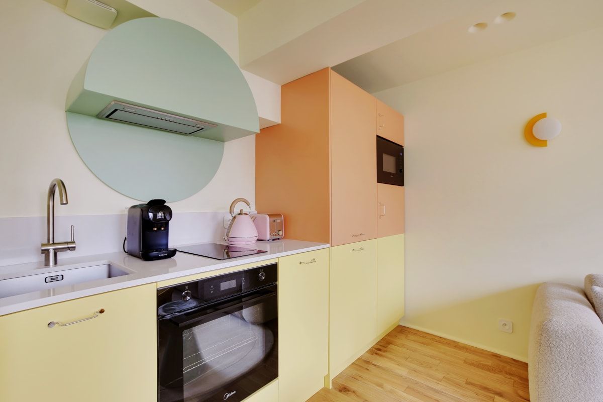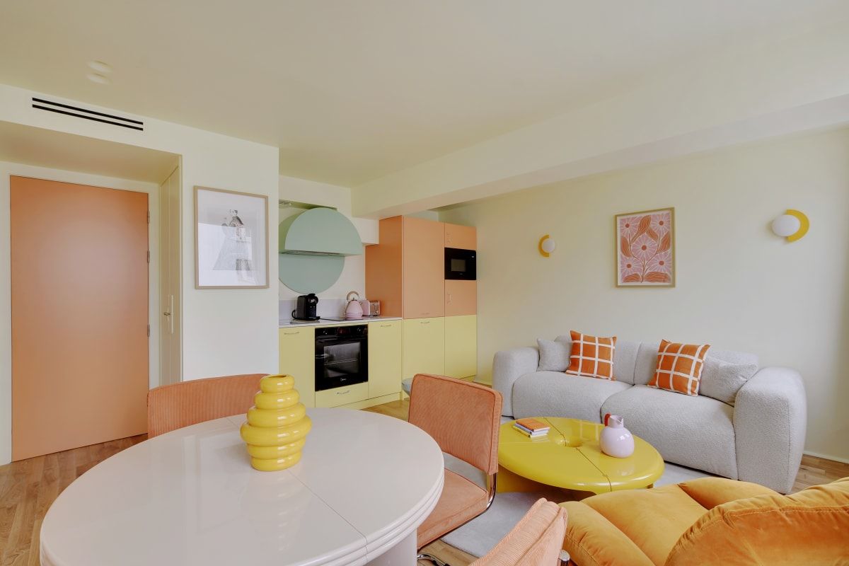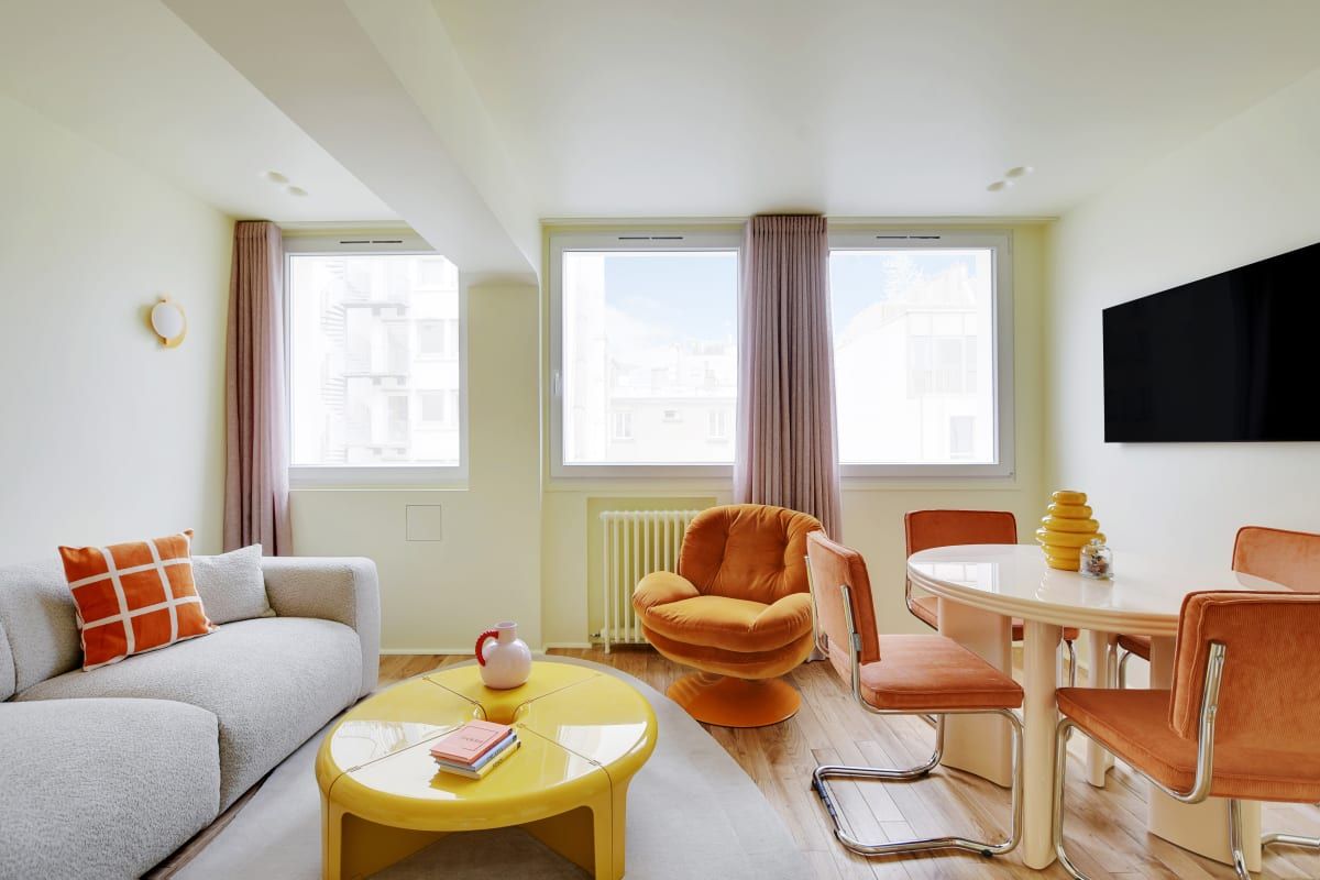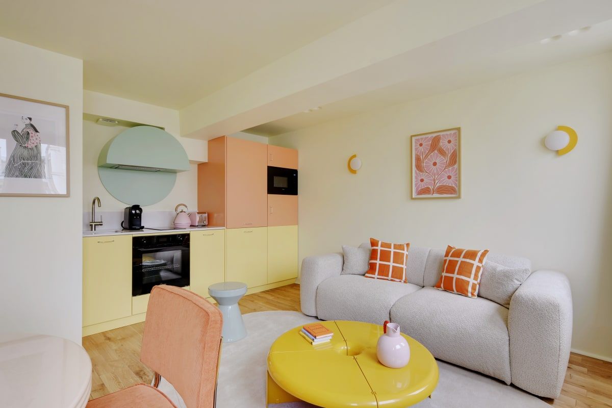 For a colourful base in Paris, this apartment is an excellent choice. It’s conveniently located just off the Champs-Élysées, close to the Arc de Triomphe and Jardin des Tuileries, right in the thick of the action. From here, you can explore all of Paris on foot or by using the Metro. The apartment has a retro feel, thanks to the colourful decor – it’s candy-coloured and cute. The open-plan living, dining, and kitchen space has a sofa bed for two guests– it’s not the most private option, but we think it works for a city break. The daily maid service helps to keep things tidy.