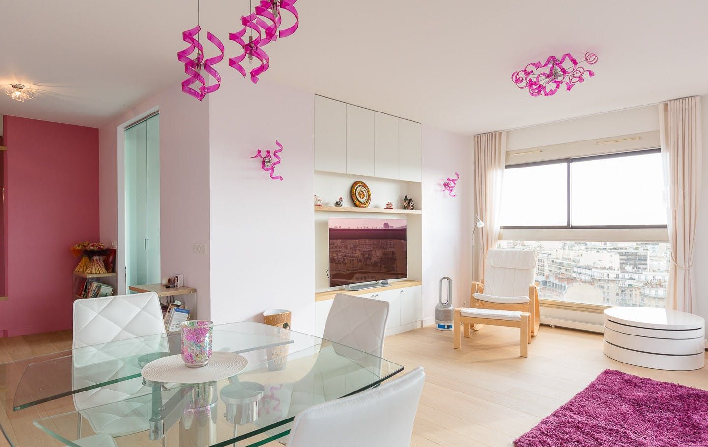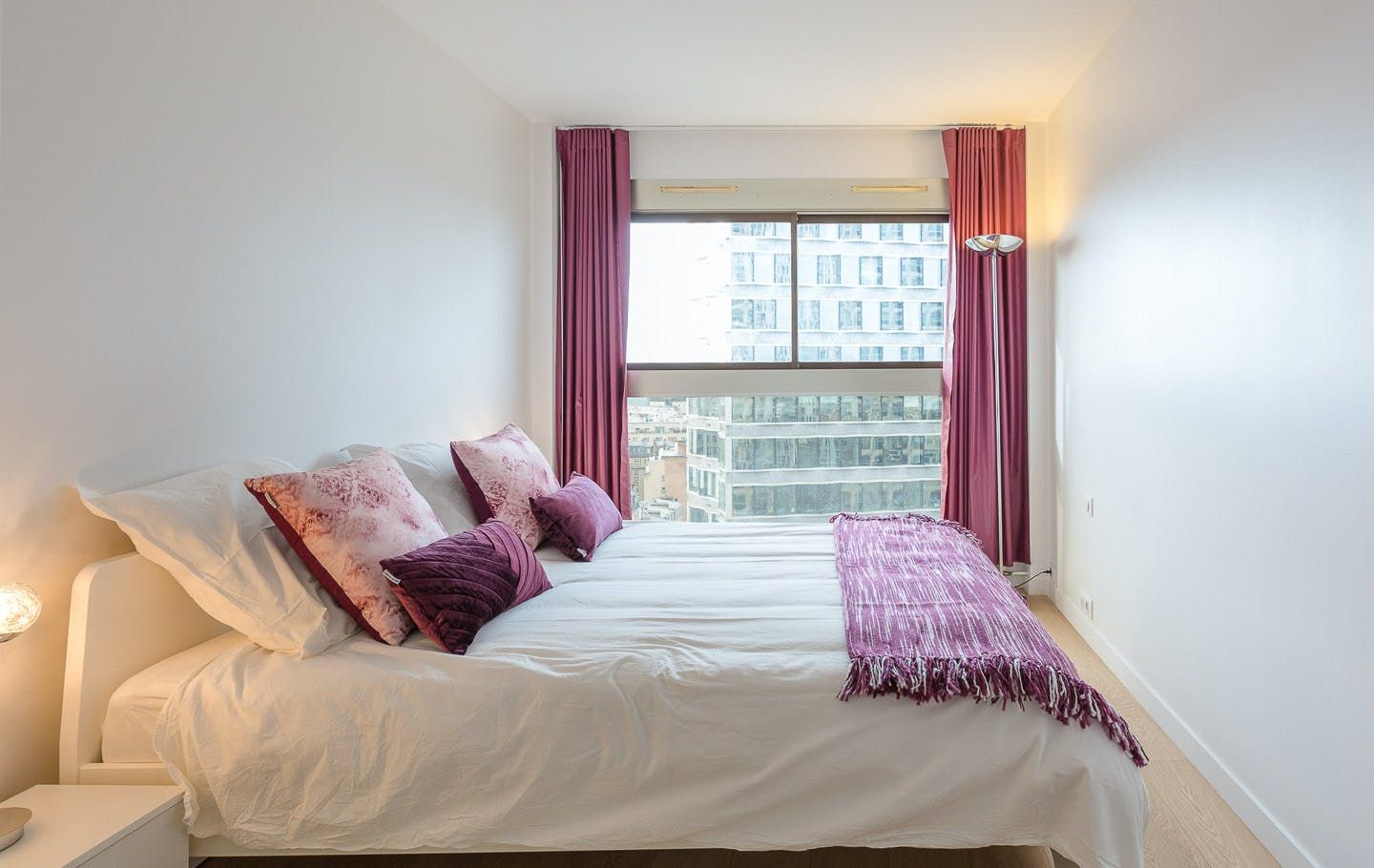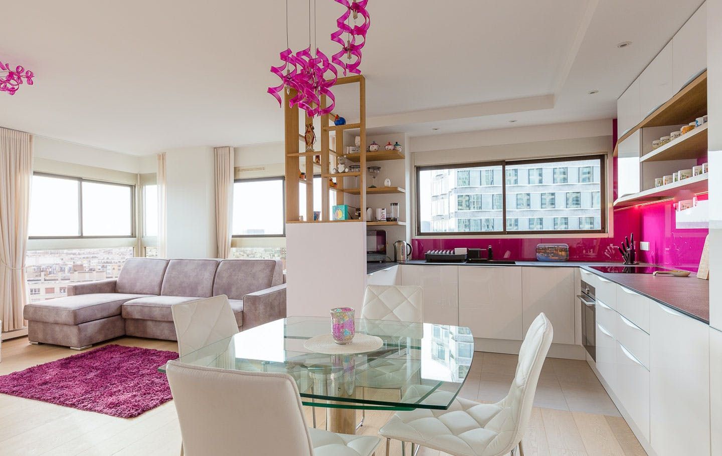 If pink is your favourite colour, you're in for a treat. This high-floor apartment in the heart of the 15th arrondissement is modern, smart and decorated in a mix of cool whites and hot pinks. From the moment you walk in the door, you're greeted with a cheerful hallway full of bespoke storage (in pink, of course) and a big mirror to check your outfit before a big night out. But it's far from this home's only selling point. Move through into the open-plan living and kitchen space and you'll be struck by the floor-to-ceiling windows giving unparalleled views across the rooftops of Paris. Minimalist and neat, it's an easy place to feel right at home in, whether it's cooking in the contemporary kitchen, eating together at the glass dining table or lounging with a cup of coffee on the sofa – all the while gazing across this most fabulous of cities. With spacious bedrooms, each with its own impressive views from bed, and each with a dedicated bathroom, it's a great choice if you want to make the most of Paris.