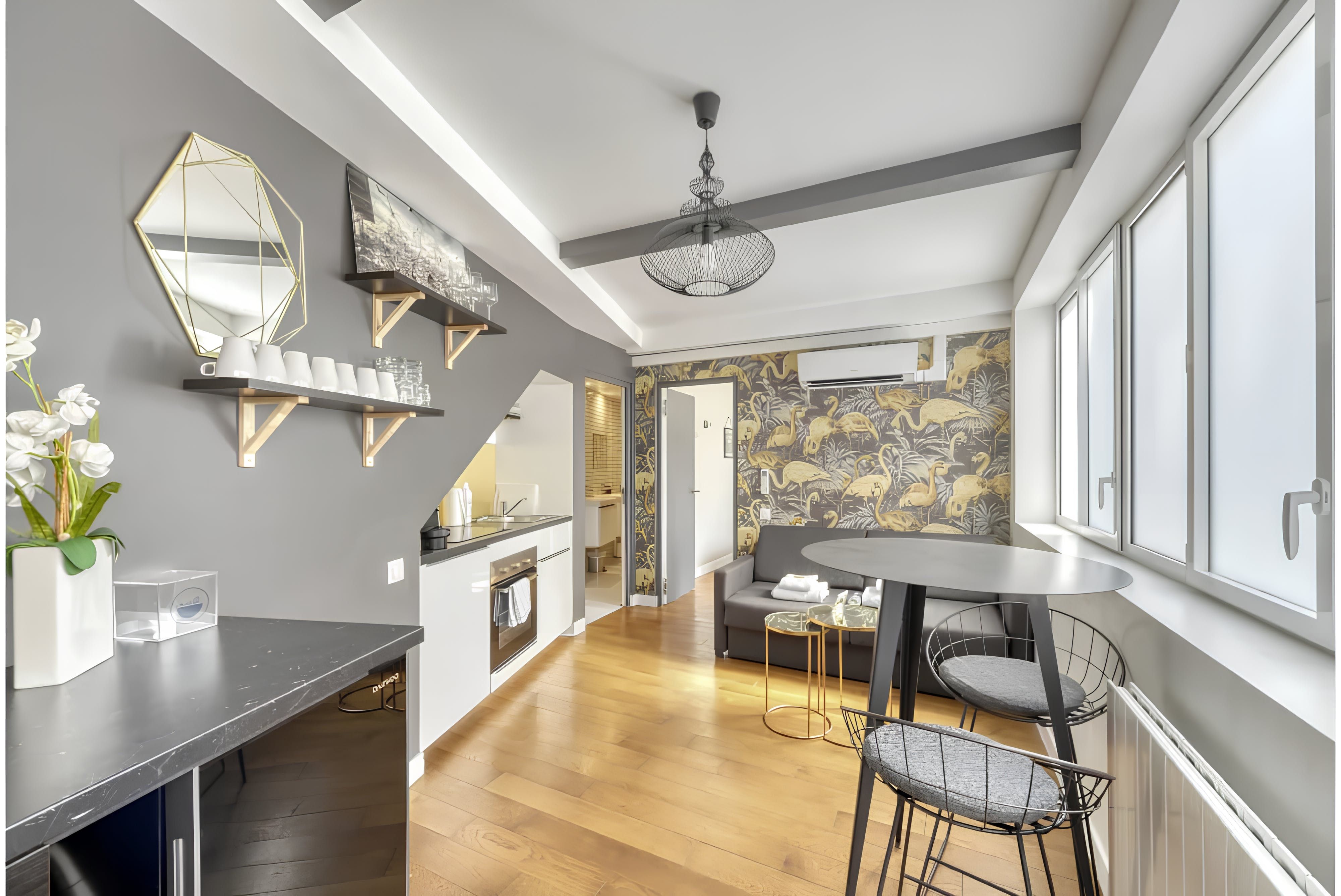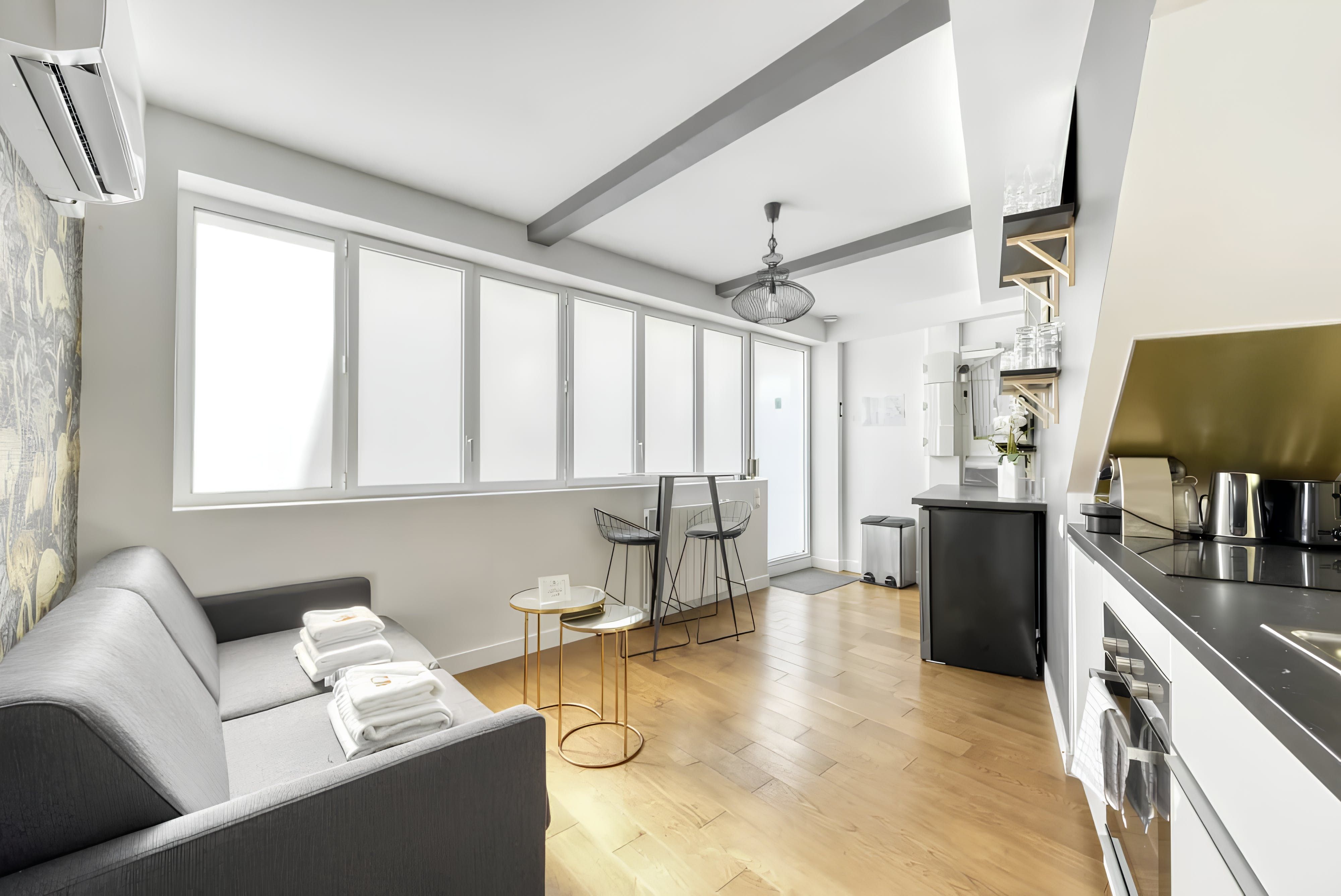 Home truths: *At full occupancy, two people will be sleeping on the sofa bed in the living area. Keep in mind that there's only enough dining space for two guests. *The terrace is shared with the building's other residents. *The kitchenette is only suitable for preparing light bites. *This home is short on wardrobe space, so we'd recommend packing light. *Given the home's central spot, expect to hear some street noise throughout your stay. *There's no desk here, but the dining table doubles up as a laptop-friendly workspace. *Please respect quiet hours between 10pm and 9am. *You'll be able to check yourself in here.