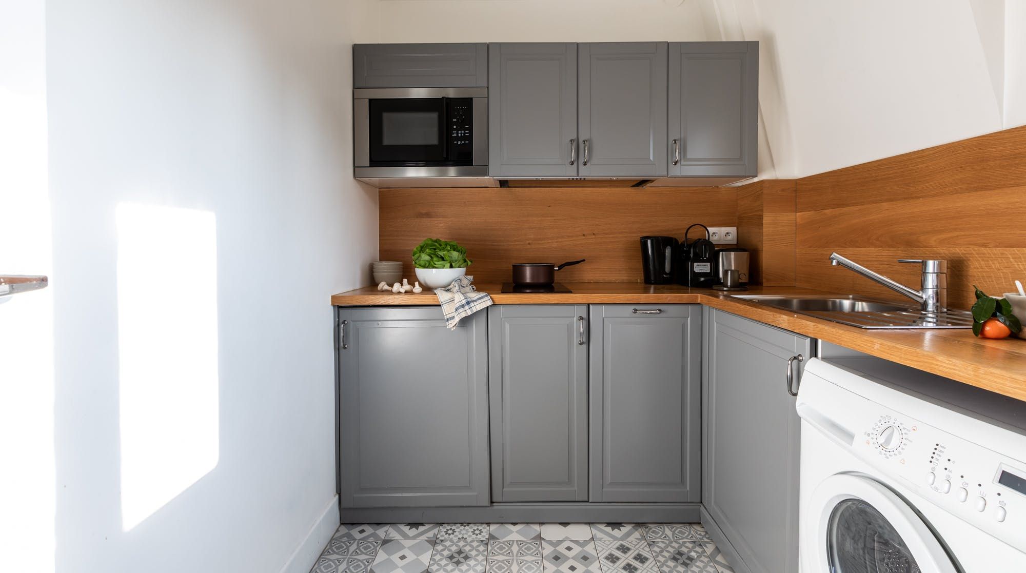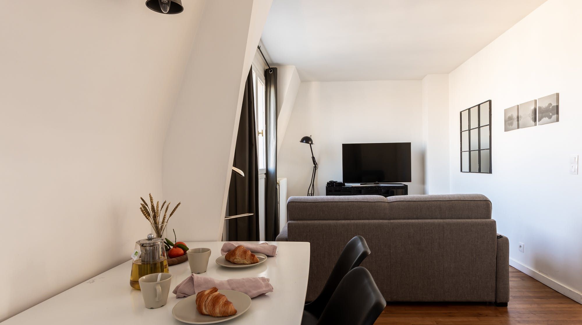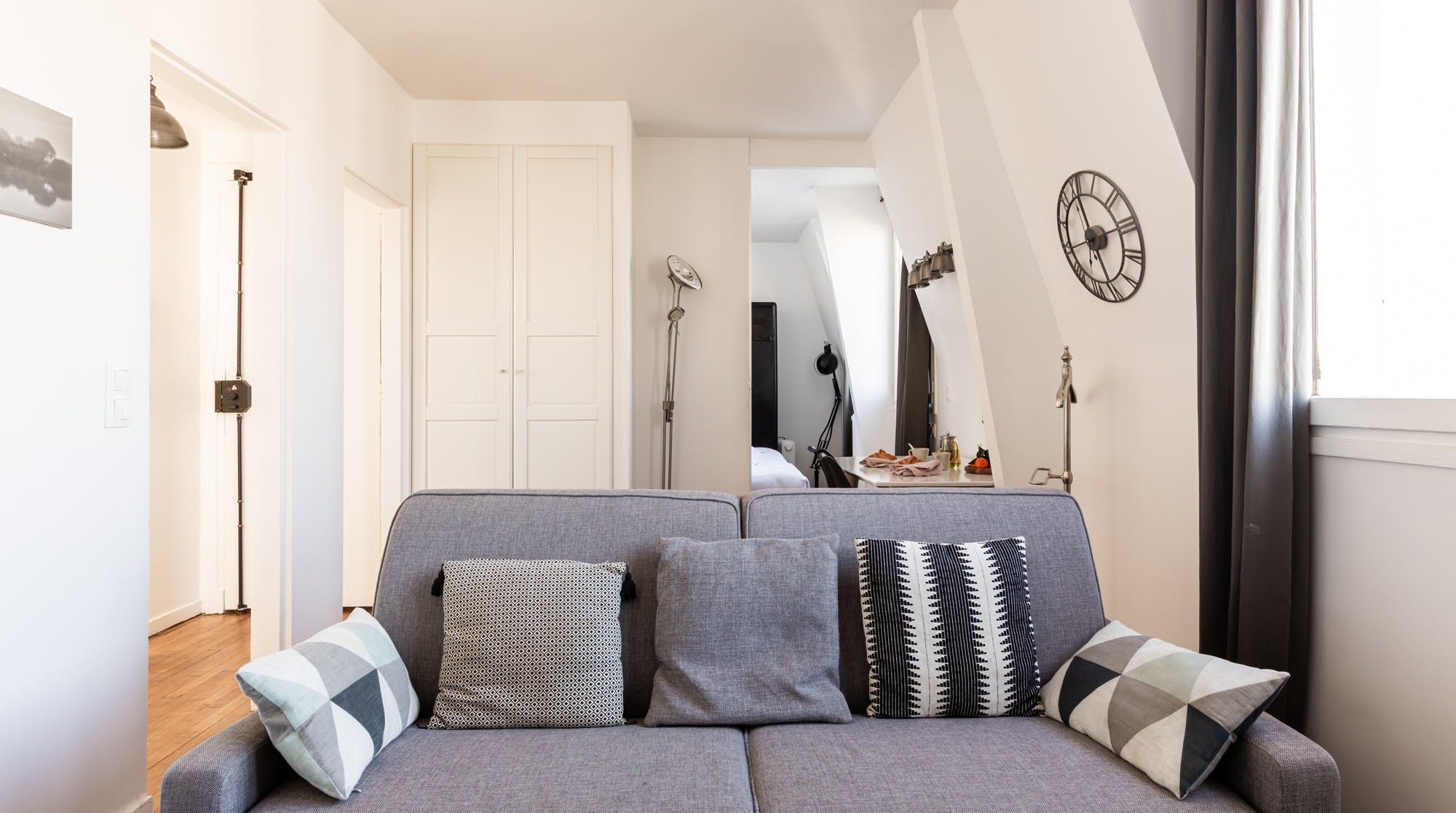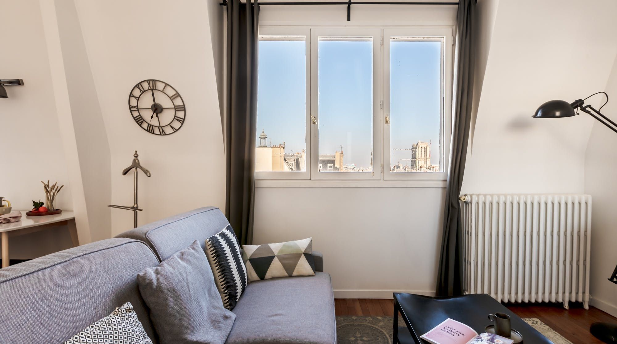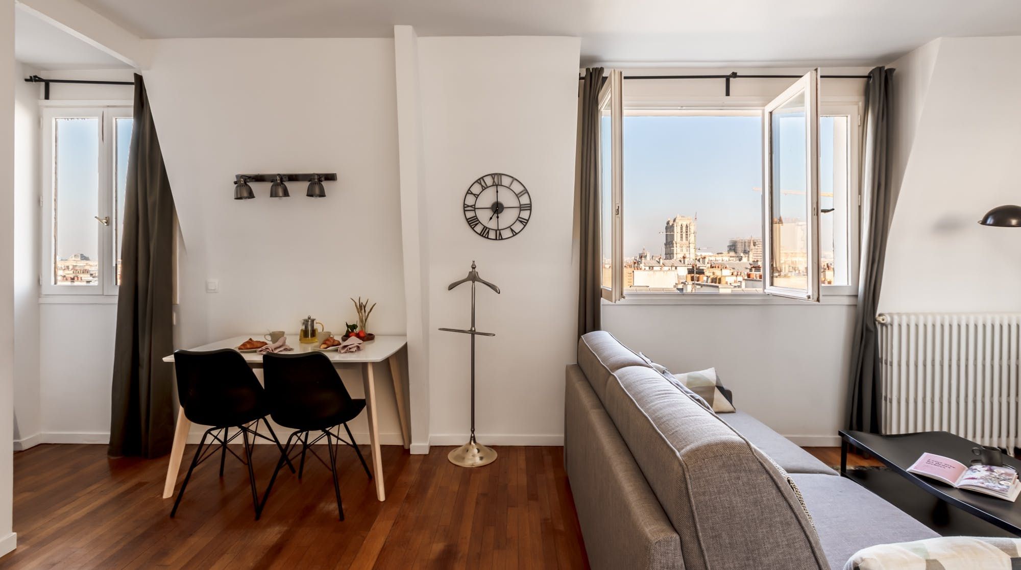 This pocket-sized flat may be snug, but trust us, the scenery more than makes up for it. From the window, you'll have a birds-eye view of Notre Dame in the distance, standing tall over Paris' rooftops. It's a striking peek across the city, and combined with the generous amount of natural light and simple aesthetic, it makes a stay here feel unique. Following a long day exploring, come home and unwind with a glass of wine on the sofa or a quick nibble around the dining table. There's not heaps of space – in fact, two guests will be sleeping on the sofa bed – but the location is excellent. Situated on a quiet street in the Latin Quarter, you're just a short walk from the Seine, Luxembourg Gardens and, of course, Notre Dame. We love this culturally-rich area – it's ripe with eateries, cafes and charming shops frequented by Sorbonne students – and all the major sights are either a quick metro ride or stroll away.