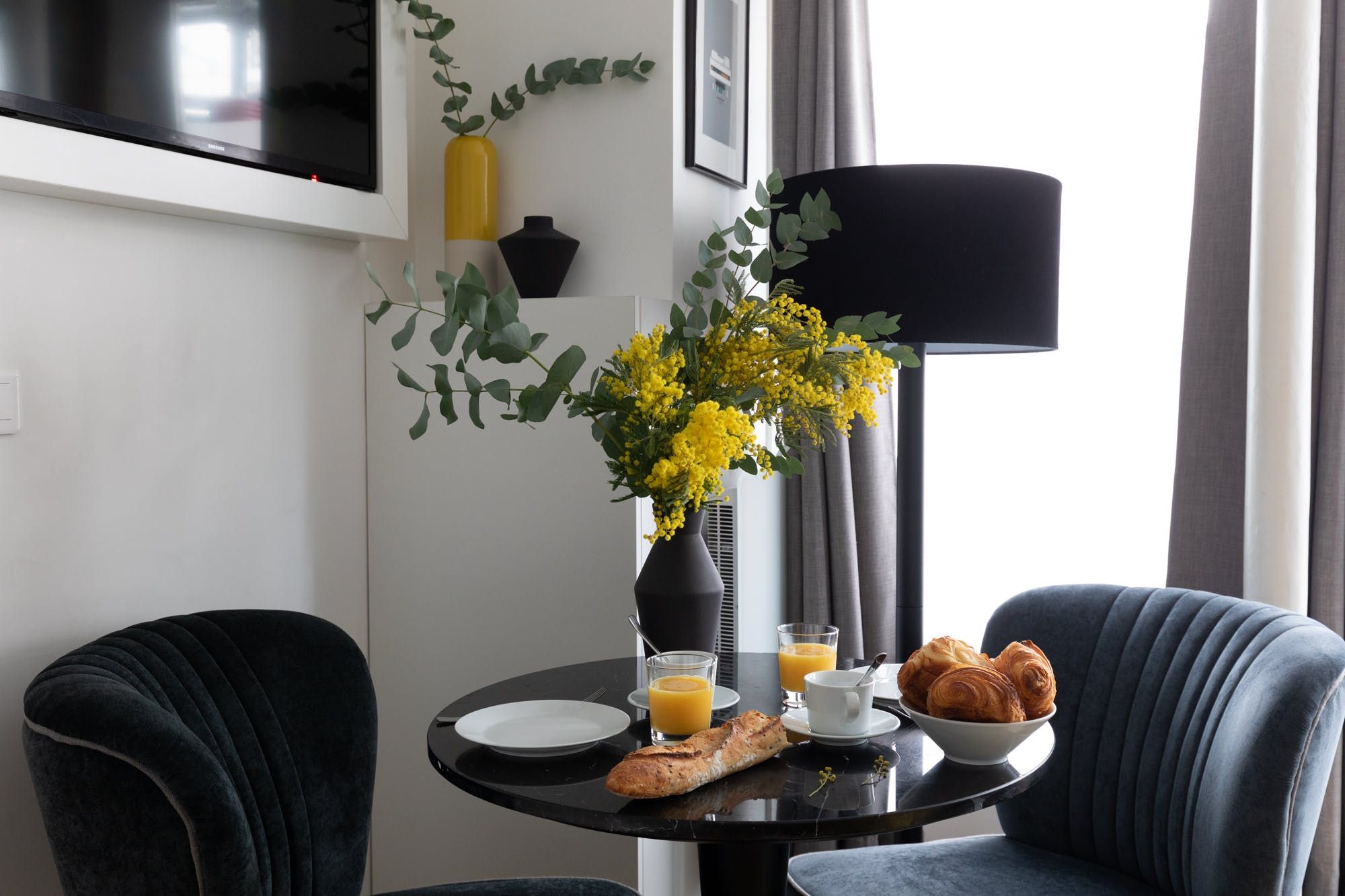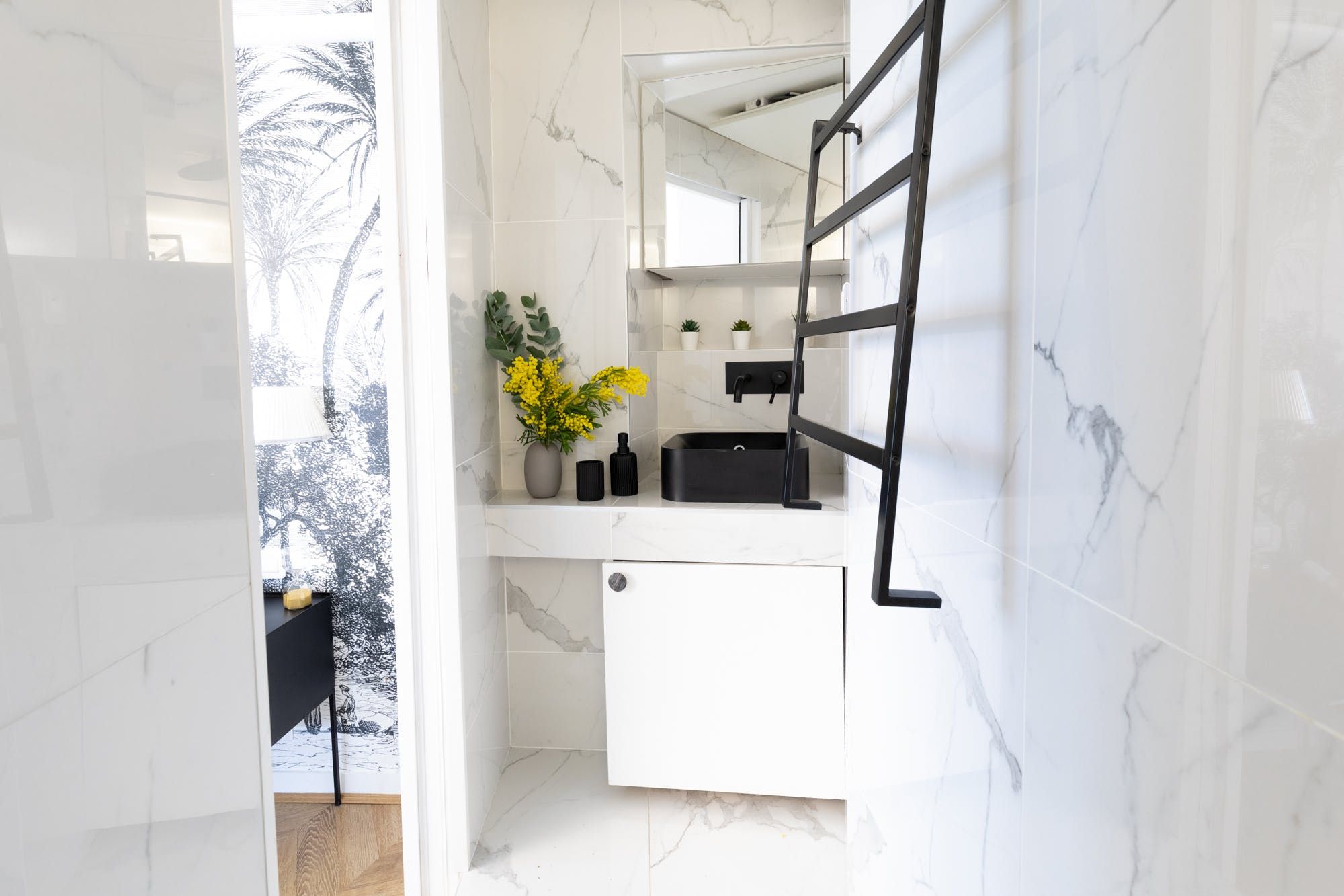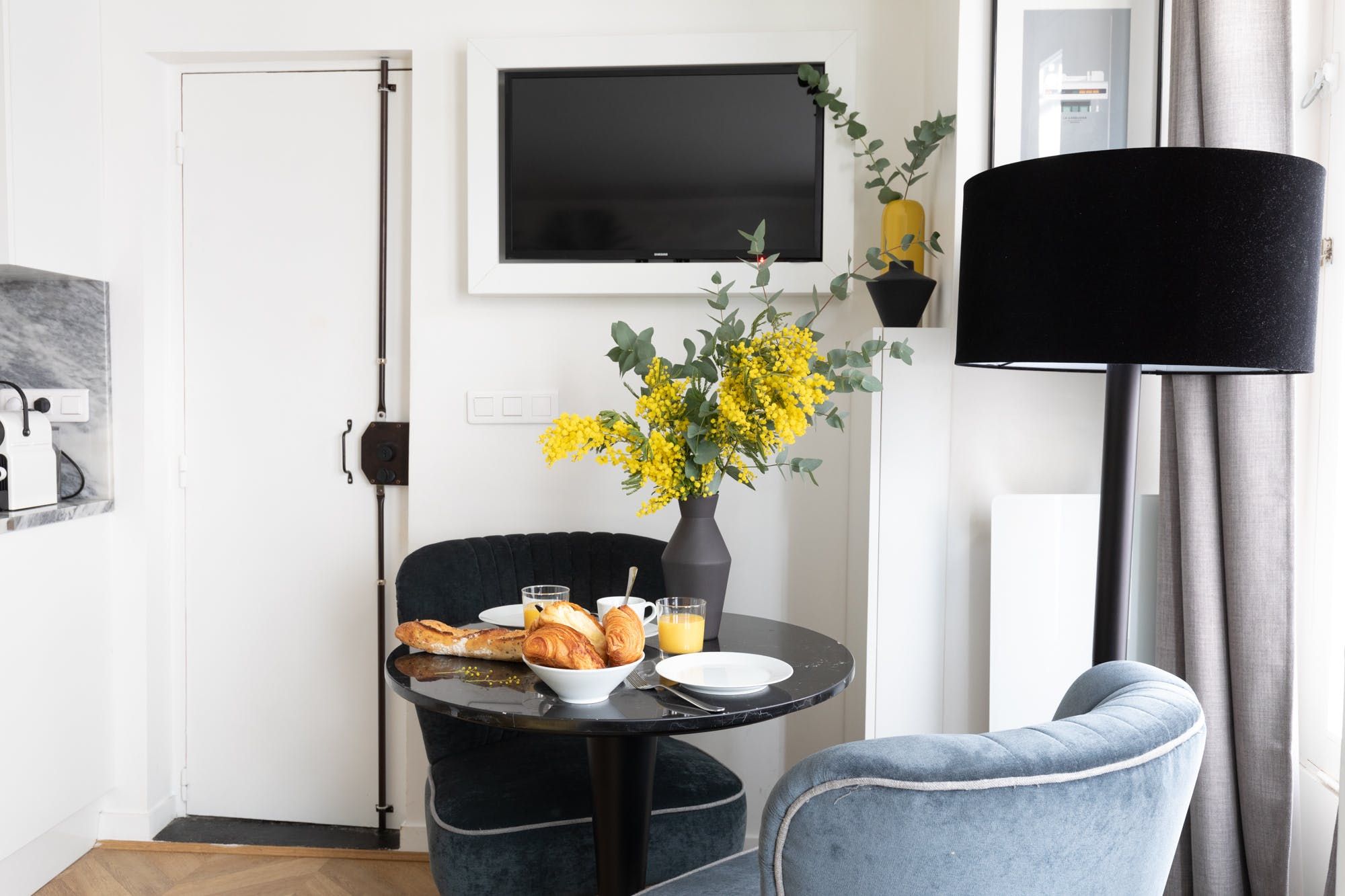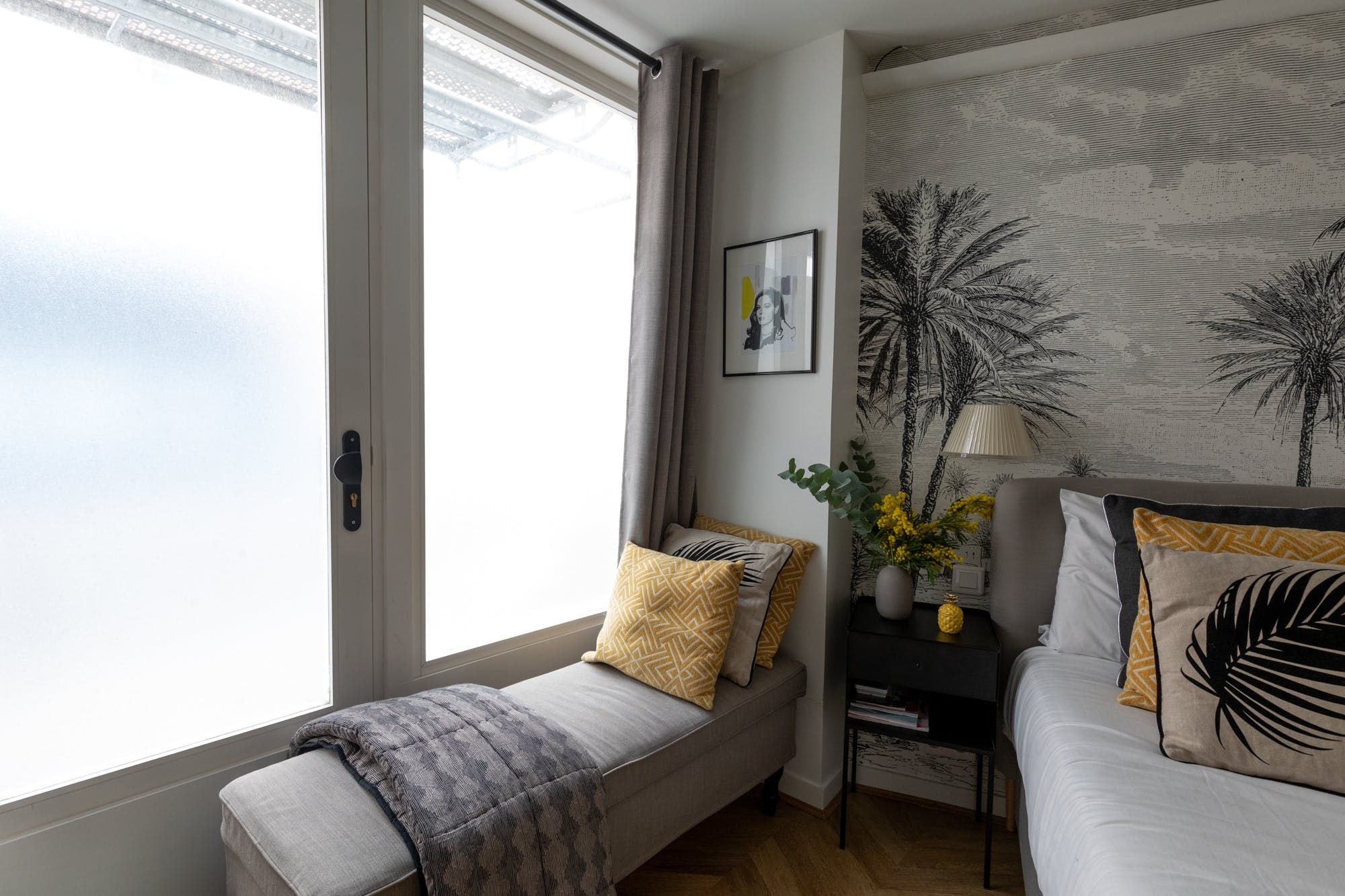 Located in a quiet street in Paris’ Sentier neighbourhood, this elegant apartment that was once a shop is an ideal base for those wanting to get the most out of the city’s history and culture. Though compact, this luxurious space packs a decorative punch with its palm feature wall, sumptuous bed and sleek details. You’ll feel positively aristocratic lounging on the chaise longue with a glass of bubbly after a day of seeing the sights, while the chic little dining table provides the perfect start to the day over coffee and croissants from a local bakery. With a white marble bathroom boasting a rainfall shower that looks like it belongs in a boutique hotel, you’re all set to experience the city in debonair style. Outside of your home, you’re a fourteen-minute walk from the Marais’ cobbled streets lined with vintage shops and cosy restaurants, a twenty minutes stroll from both the Canal Saint-Martin and the Louvre, while those with a penchant for sweet treats will rejoice in the Musée du Chocolat, a three-minute walk from your door.