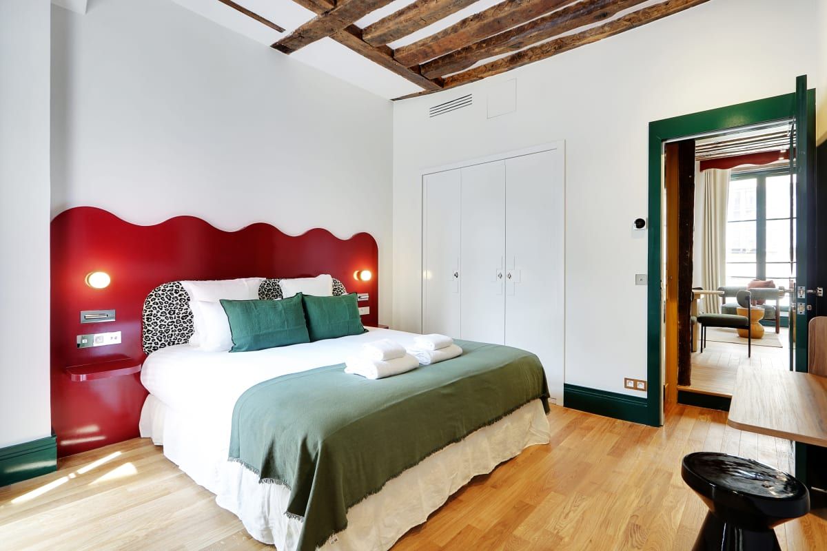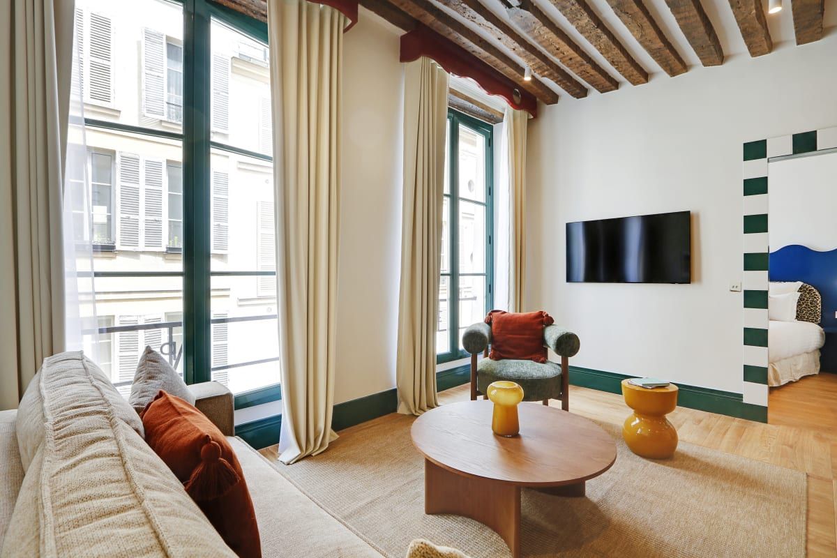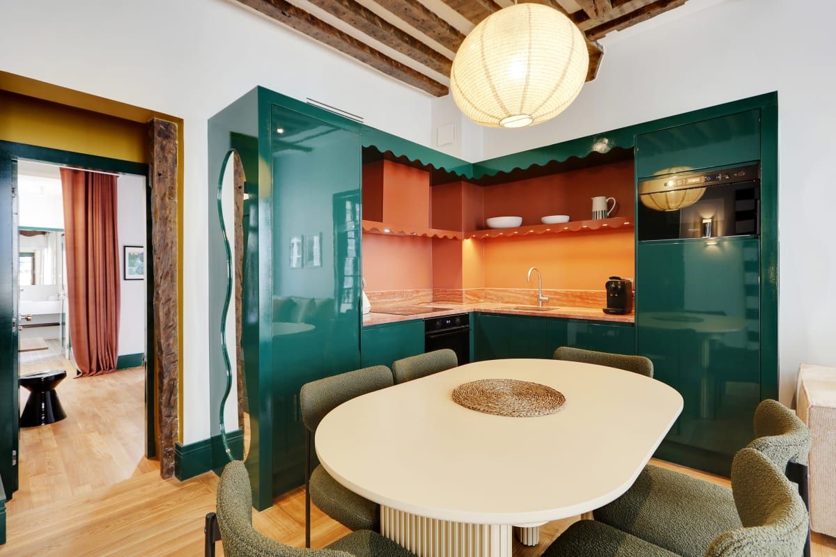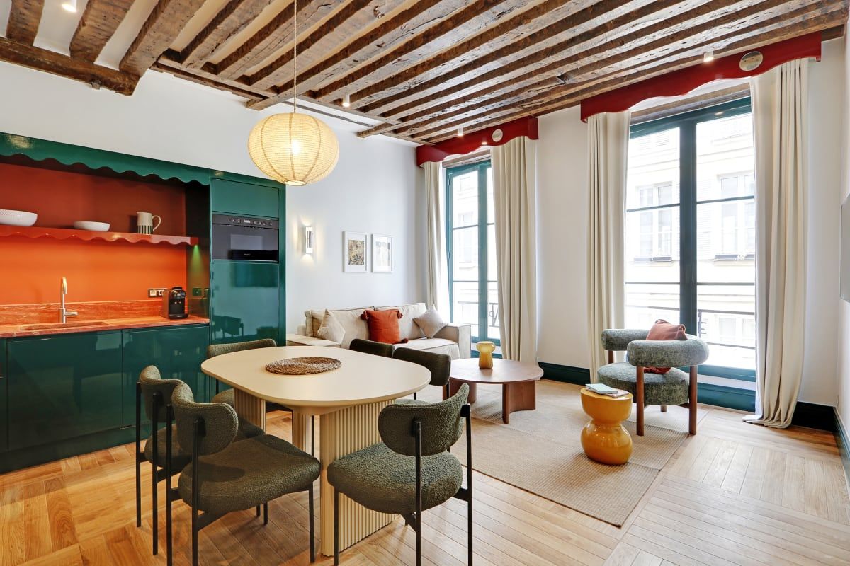 In vibrant Saint-Germain, this serviced apartment is a perfect fit for a fuss-free stay. For starters, the location is excellent. This neighbourhood has something for everyone – independent shops, gourmet eateries, postcard-pretty sidewalk cafes. It's also a short walk from some of the city's most famous landmarks, including the Louvre and Notre Dame. Though it's not the biggest – especially when the sofa bed is in use – the design perfectly blends contemporary with charm. We love the green accents and the characterful wooden beams. Daily maid service is also a huge perk – no wonder it caught our eye.