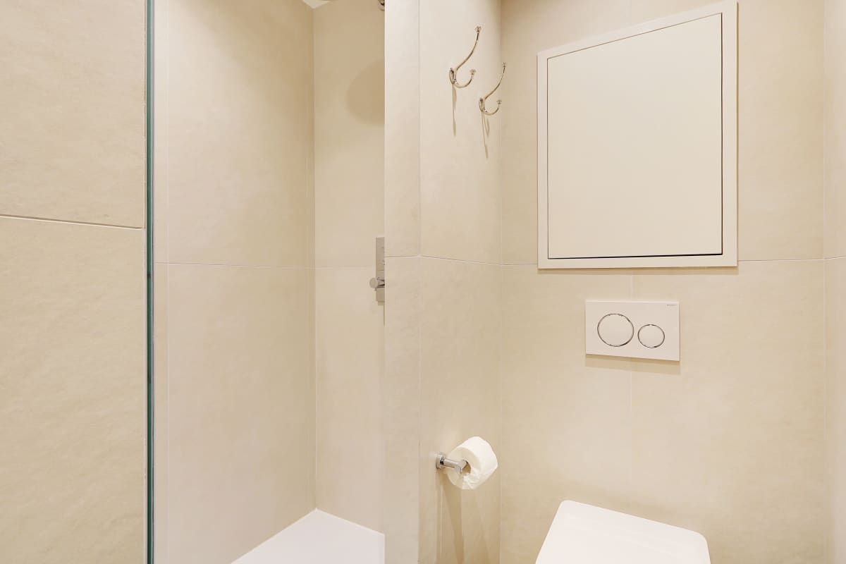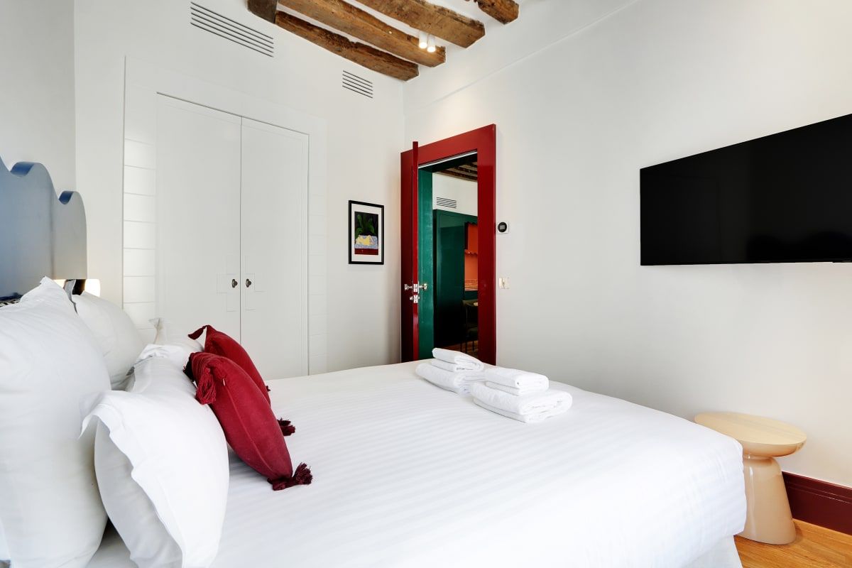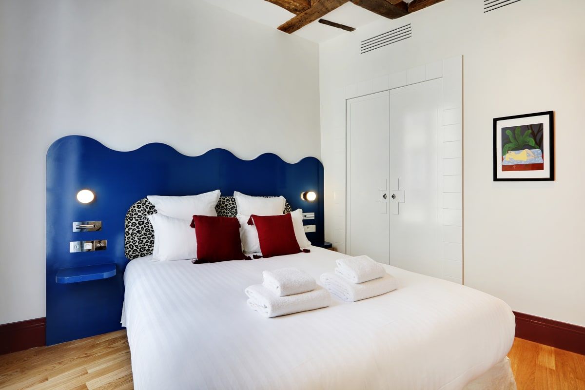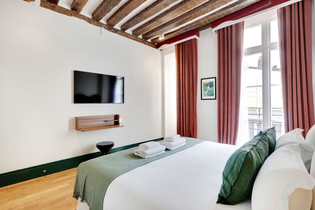 In vibrant Saint-Germain, this serviced apartment is a perfect fit for a fuss-free stay. For starters, the location is excellent. This neighbourhood has something for everyone – independent shops, gourmet eateries, postcard-pretty sidewalk cafes. It's also a short walk from some of the city's most famous landmarks, including the Louvre and Notre Dame. Though it's not the biggest – especially when the sofa bed is in use – the design perfectly blends contemporary with charm. We love the green accents and the characterful wooden beams. Daily maid service is also a huge perk – no wonder it caught our eye.