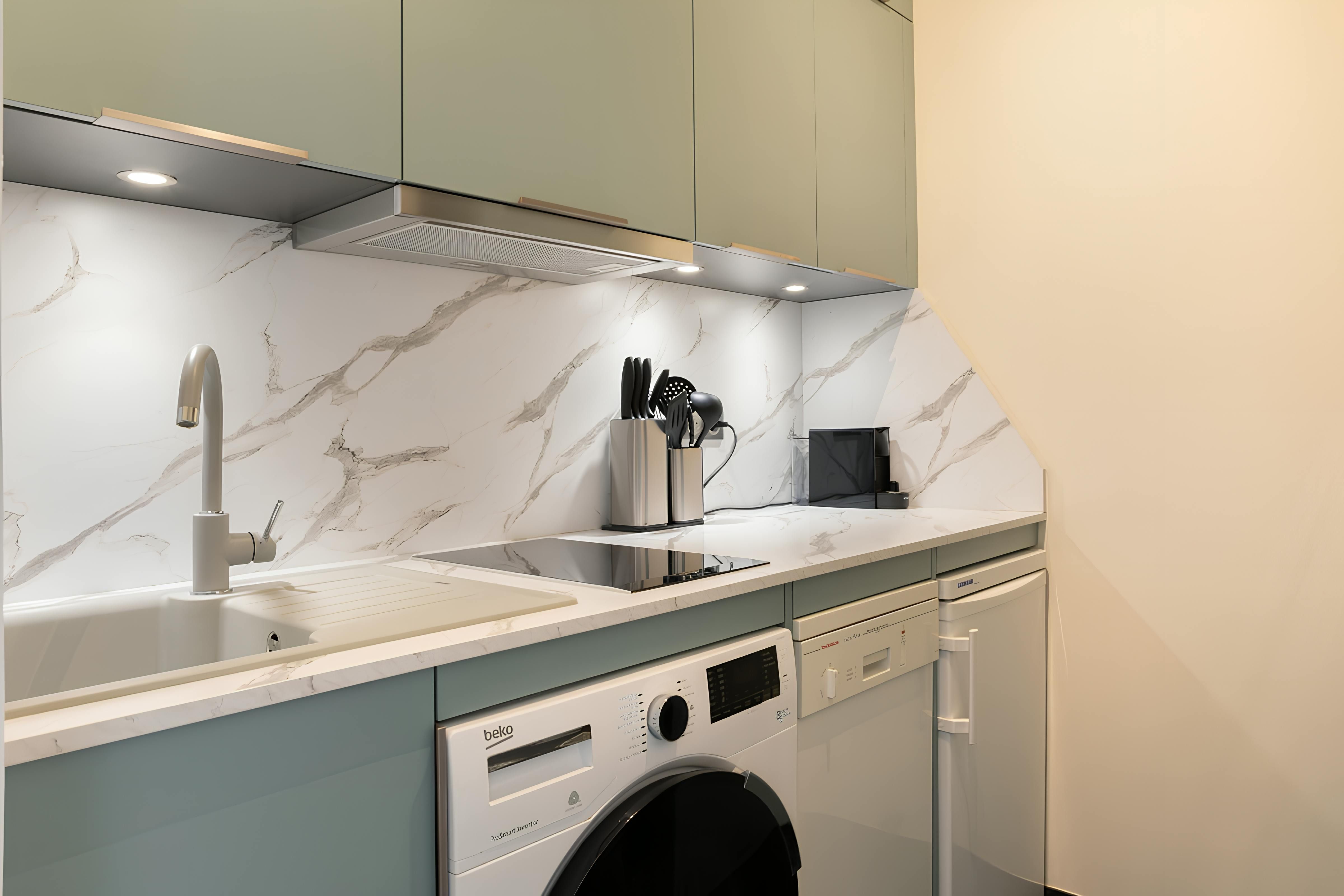 *The kitchen is compact and has no dining area. We think it’s better suited to prepping lighter bites than large meals. You’ll find plenty of eateries within walking distance.