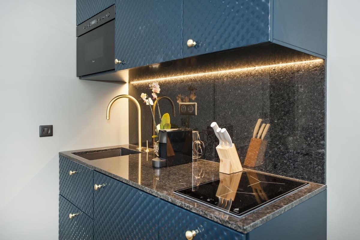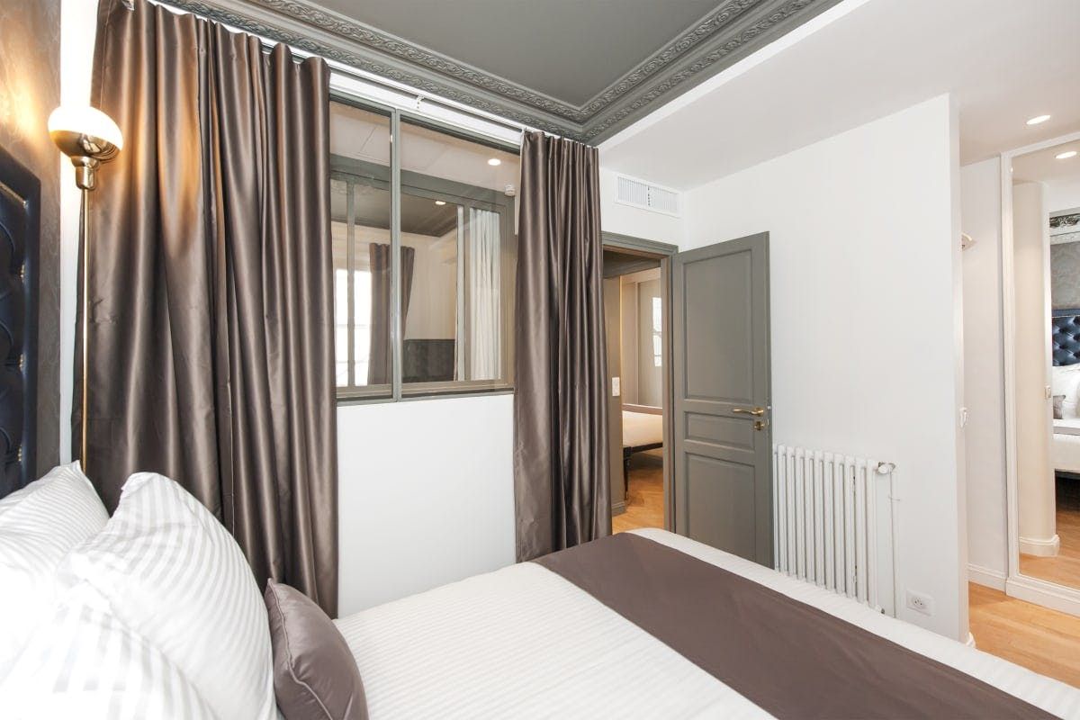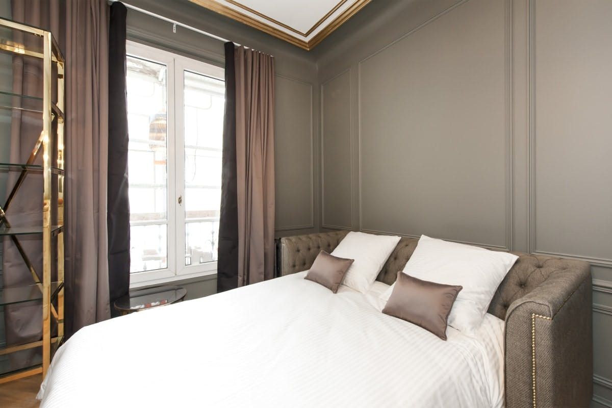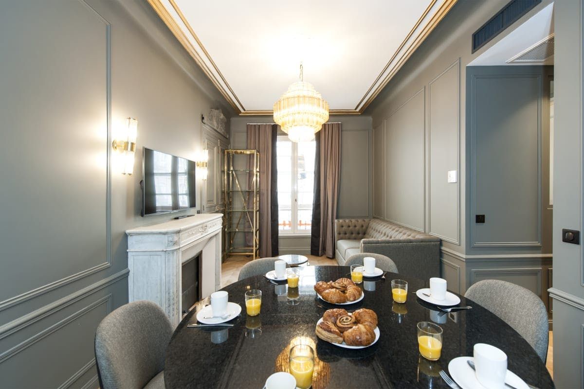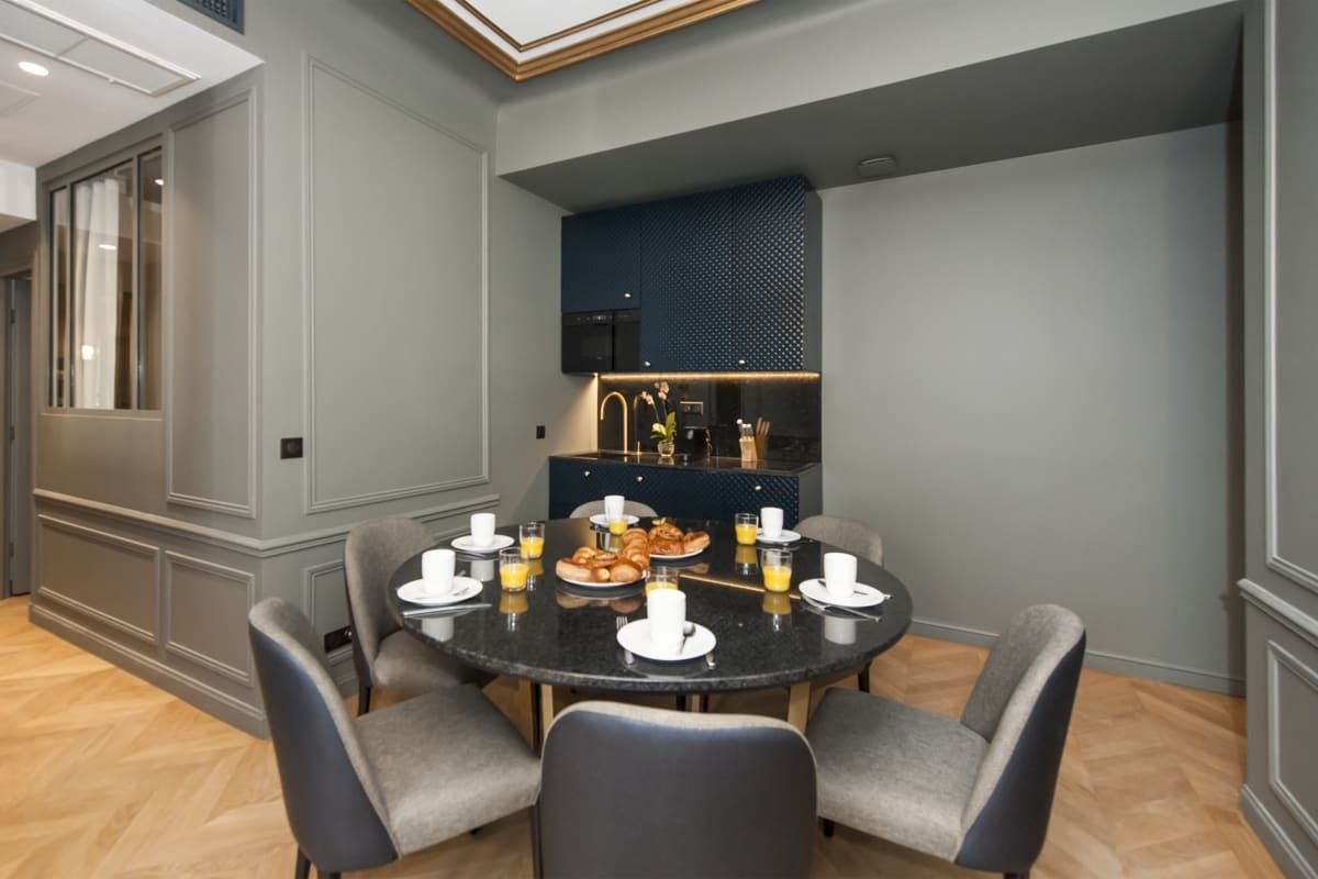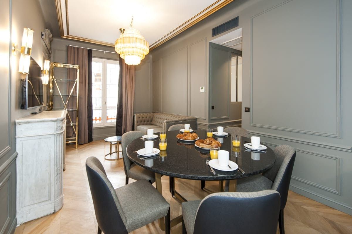 This place emanates Parisian elegance – the living room is tastefully decorated and features a comfy sofa, sleek wooden floors and stylish light fixtures. Lounge about and enjoy family times and movie evenings here – you can also share delicious meals at the dining table, a perfect spot to start a new day with some mouth-watering pastries and freshly-brewed coffee.