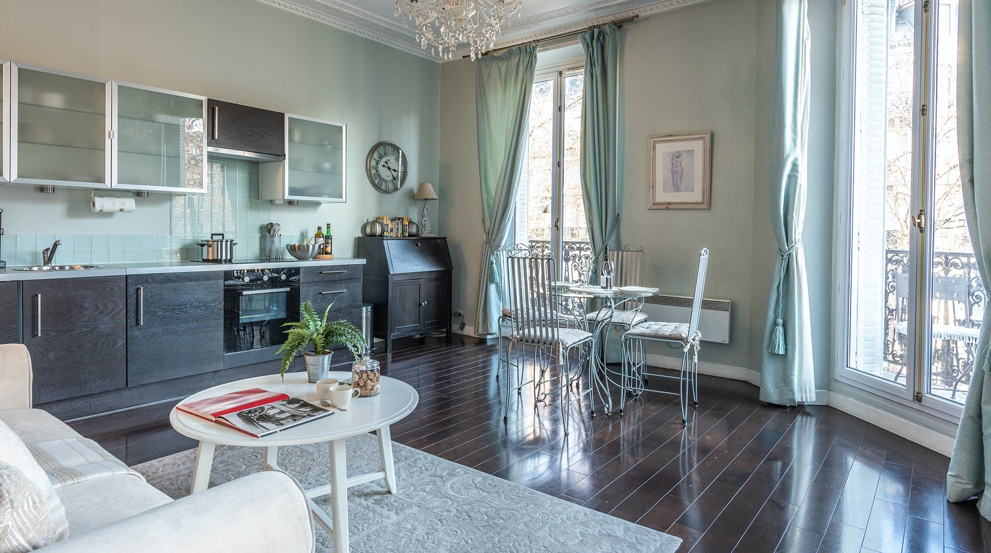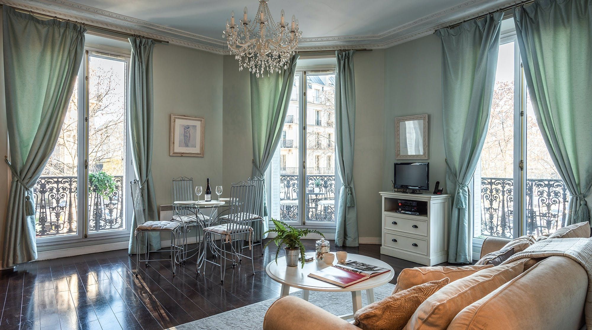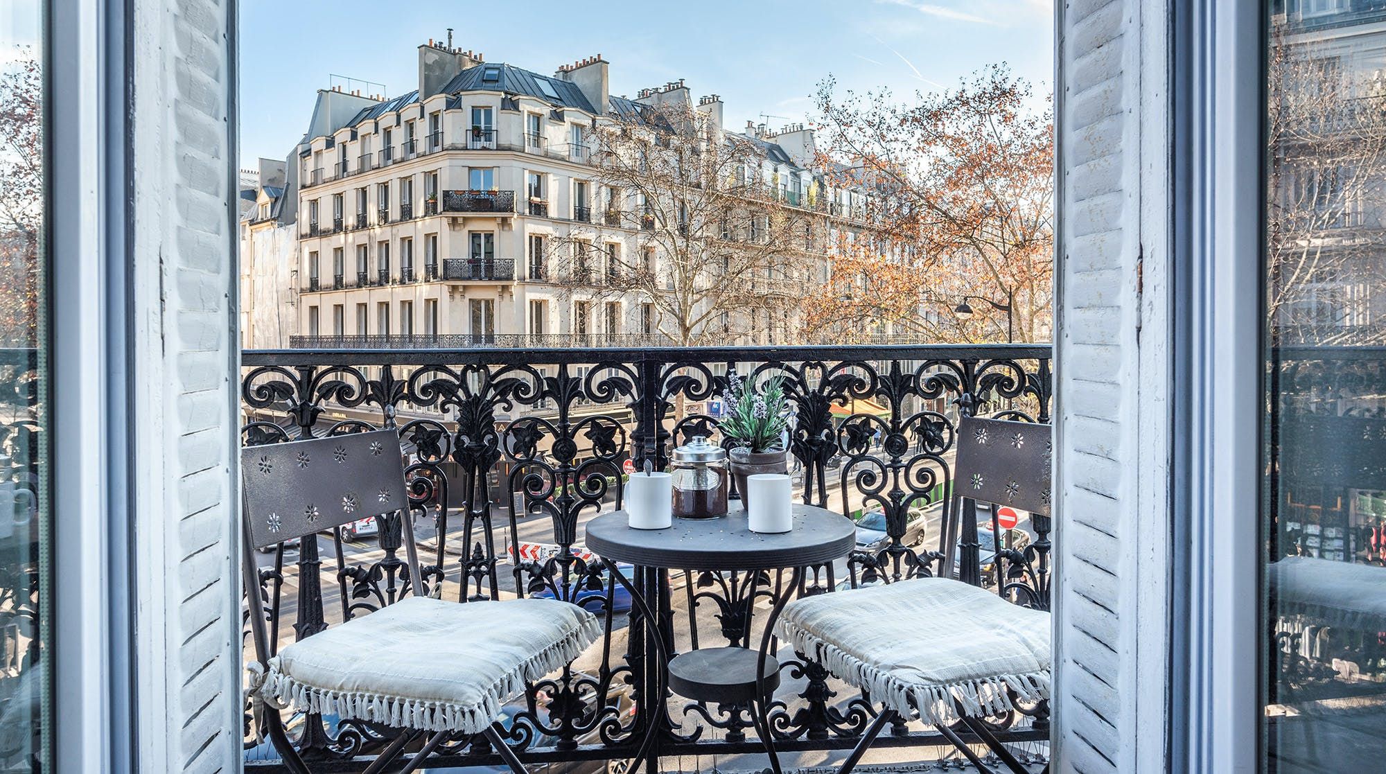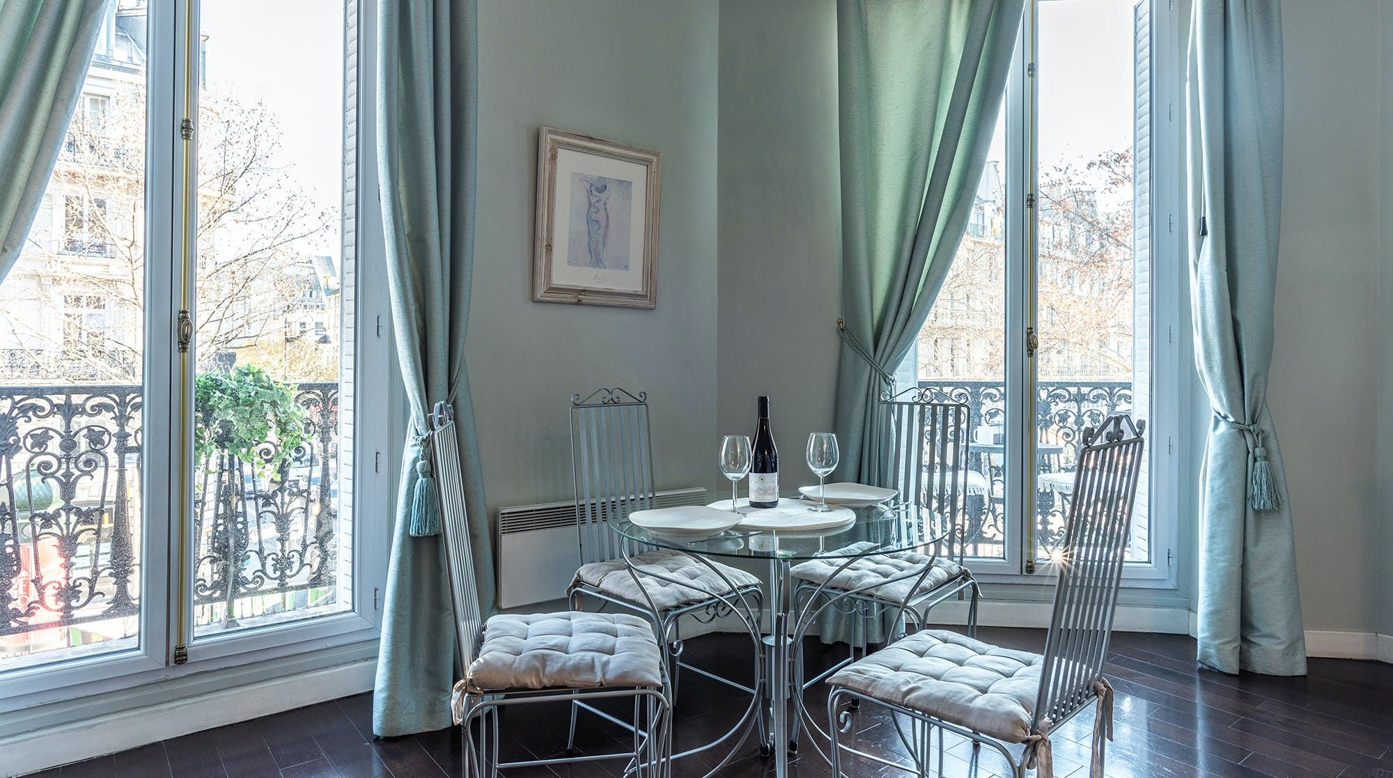If you're looking for an elegantly Parisian pad in the heart of the hustle and bustle of one of the city's most thriving areas, then this place is for you. Located on the border of three uniquely characterful districts (1st, 2nd and arrondissement) you'll get to sample three different quintessentially Parisian atmospheres through leisurely walks around the local area. And with the nearest metro stop just a two-minute walk away, you'll be as equally well-connected to the rest of what Paris has to offer in no time. The beautifully refined apartment combines classic French architectural highlights with contemporary colours and design. Housed in a historic Haussmannian style building, some of the original features include the enormous French doors which open out onto a Juliet balcony that wraps around the entire living room. Head out to the Parisian Rue Montorgueil or Rue Rambuteau, just a five-minute stroll away, to pick up some fresh produce for a delicious lunch on the balcony.
