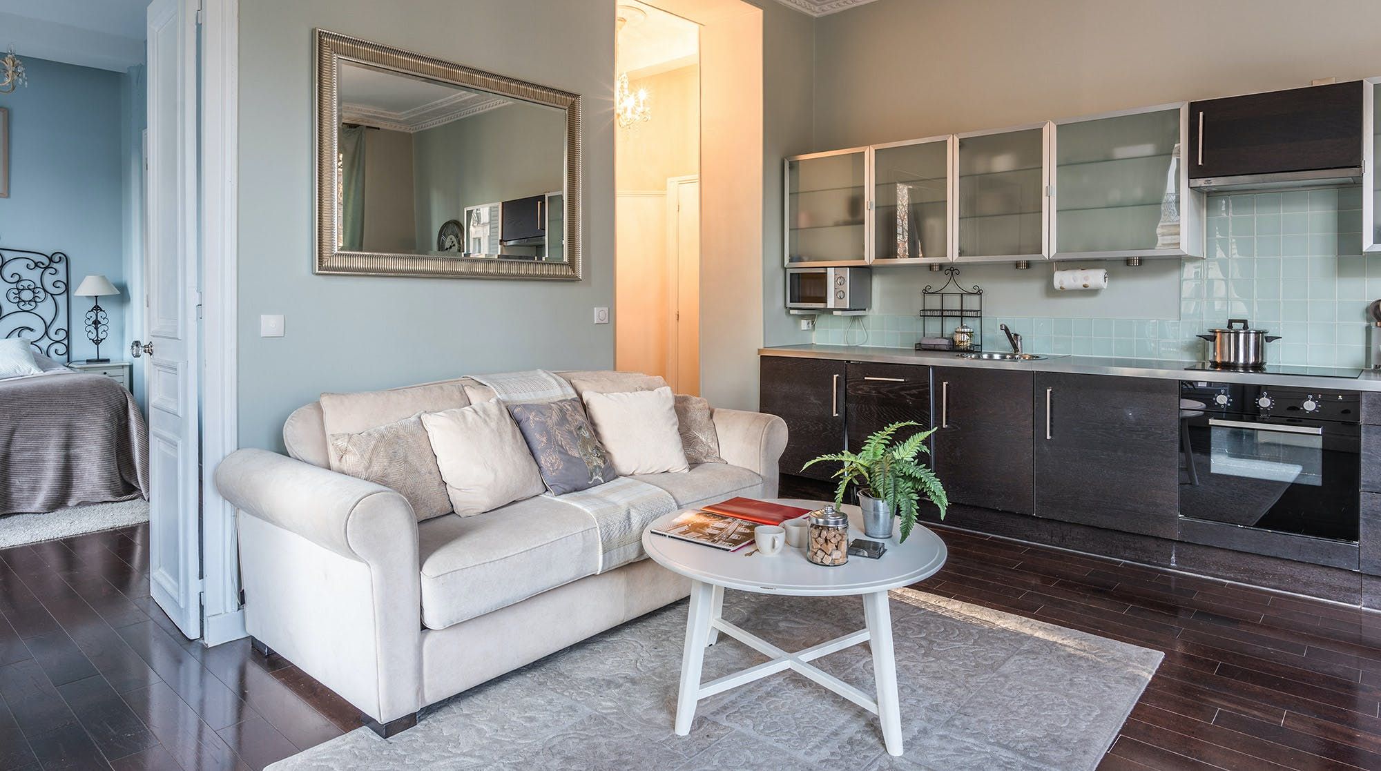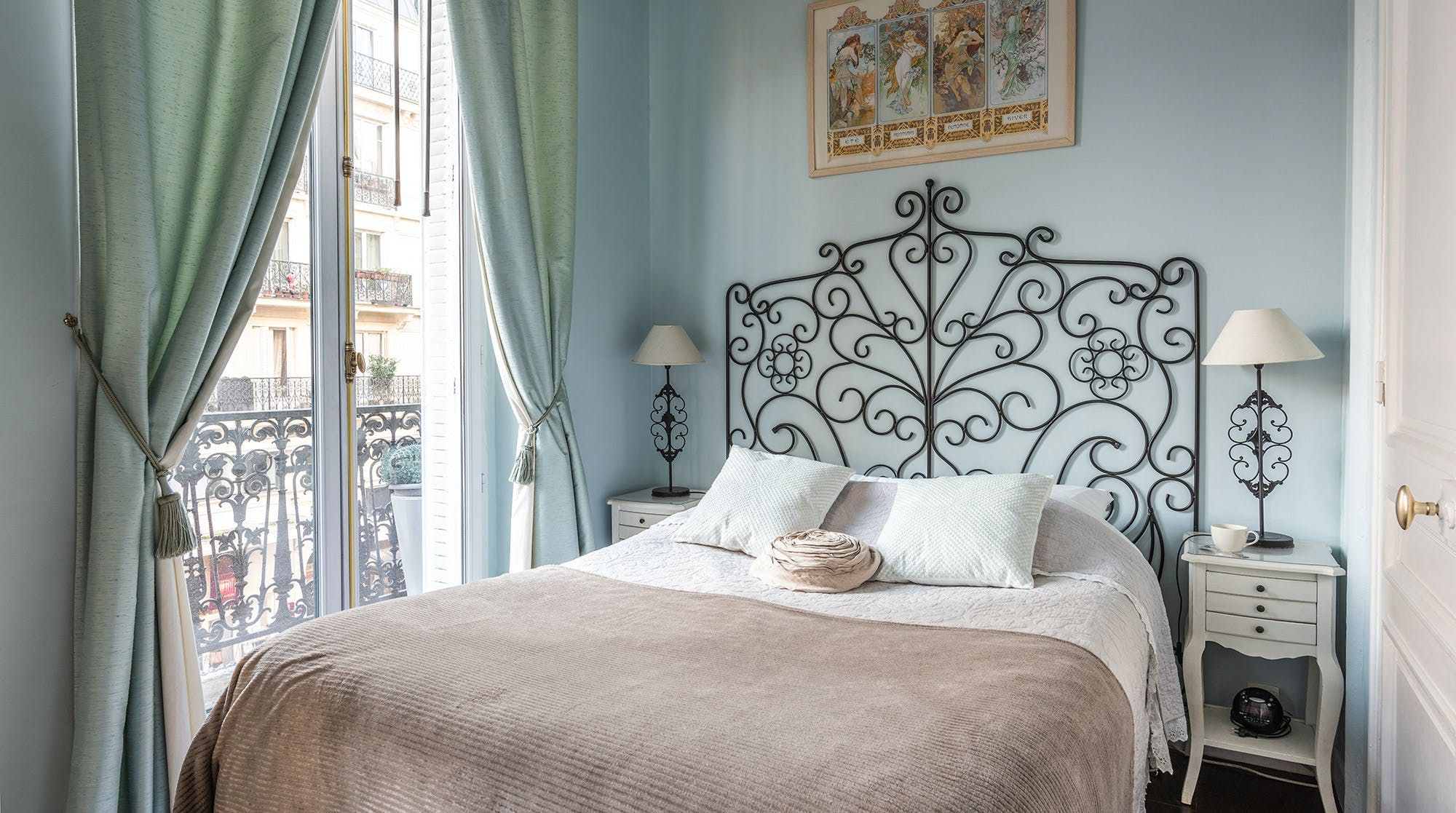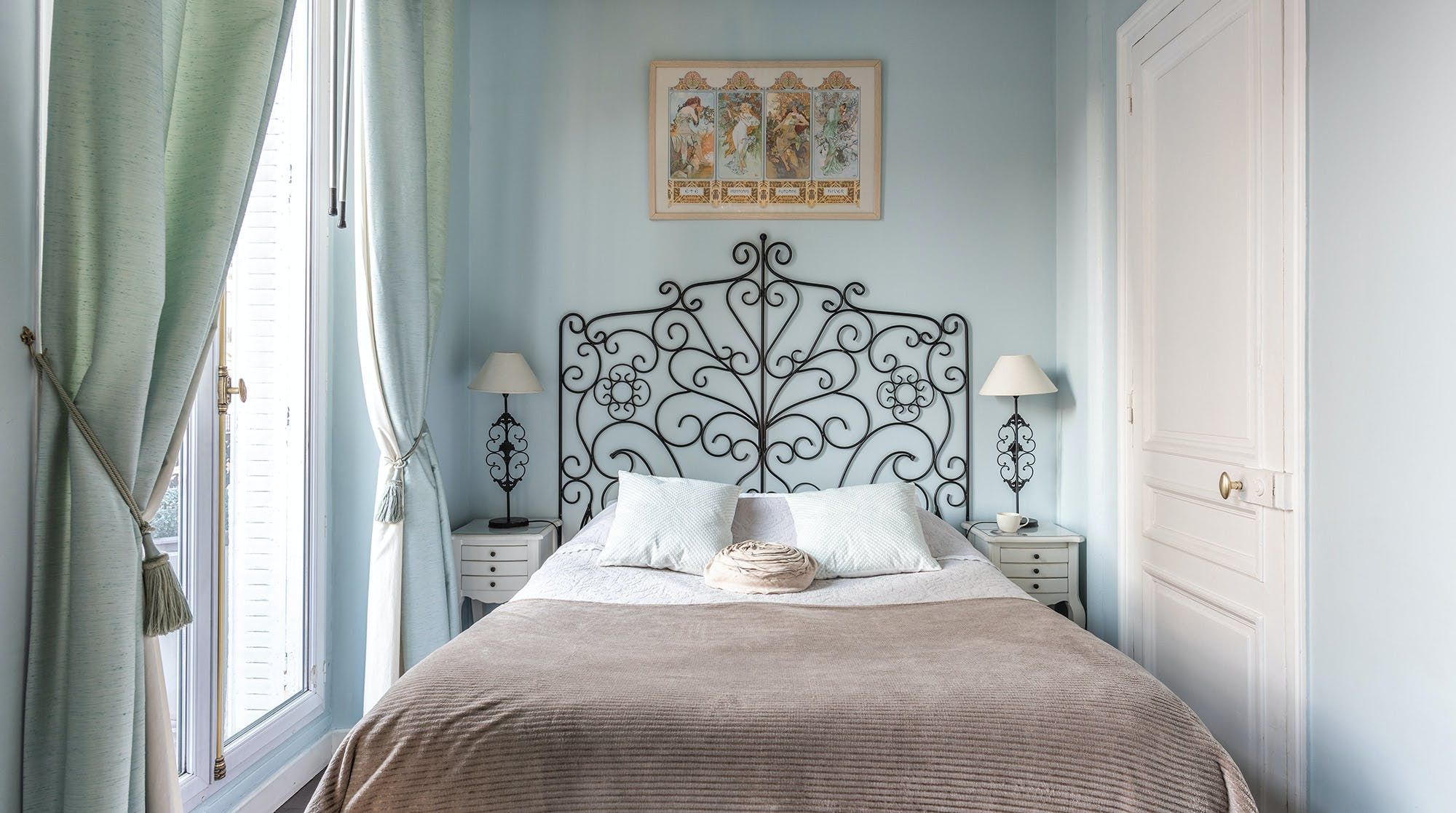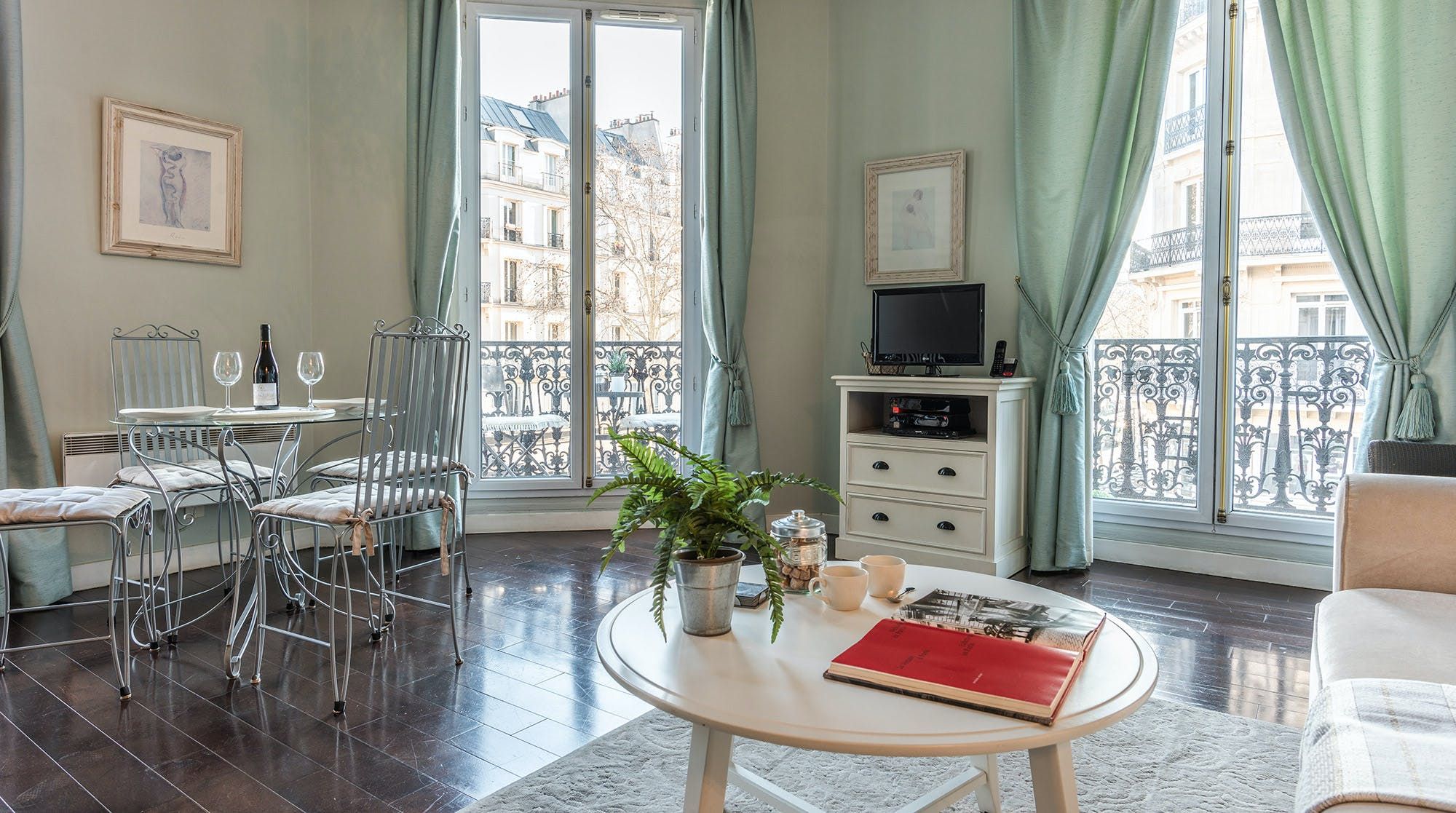 If you're looking for an elegantly Parisian pad in the heart of the hustle and bustle of one of the city's most thriving areas, then this place is for you. Located on the border of three uniquely characterful districts (1st, 2nd and arrondissement) you'll get to sample three different quintessentially Parisian atmospheres through leisurely walks around the local area. And with the nearest metro stop just a two-minute walk away, you'll be as equally well-connected to the rest of what Paris has to offer in no time. The beautifully refined apartment combines classic French architectural highlights with contemporary colours and design. Housed in a historic Haussmannian style building, some of the original features include the enormous French doors which open out onto a Juliet balcony that wraps around the entire living room. Head out to the Parisian Rue Montorgueil or Rue Rambuteau, just a five-minute stroll away, to pick up some fresh produce for a delicious lunch on the balcony.