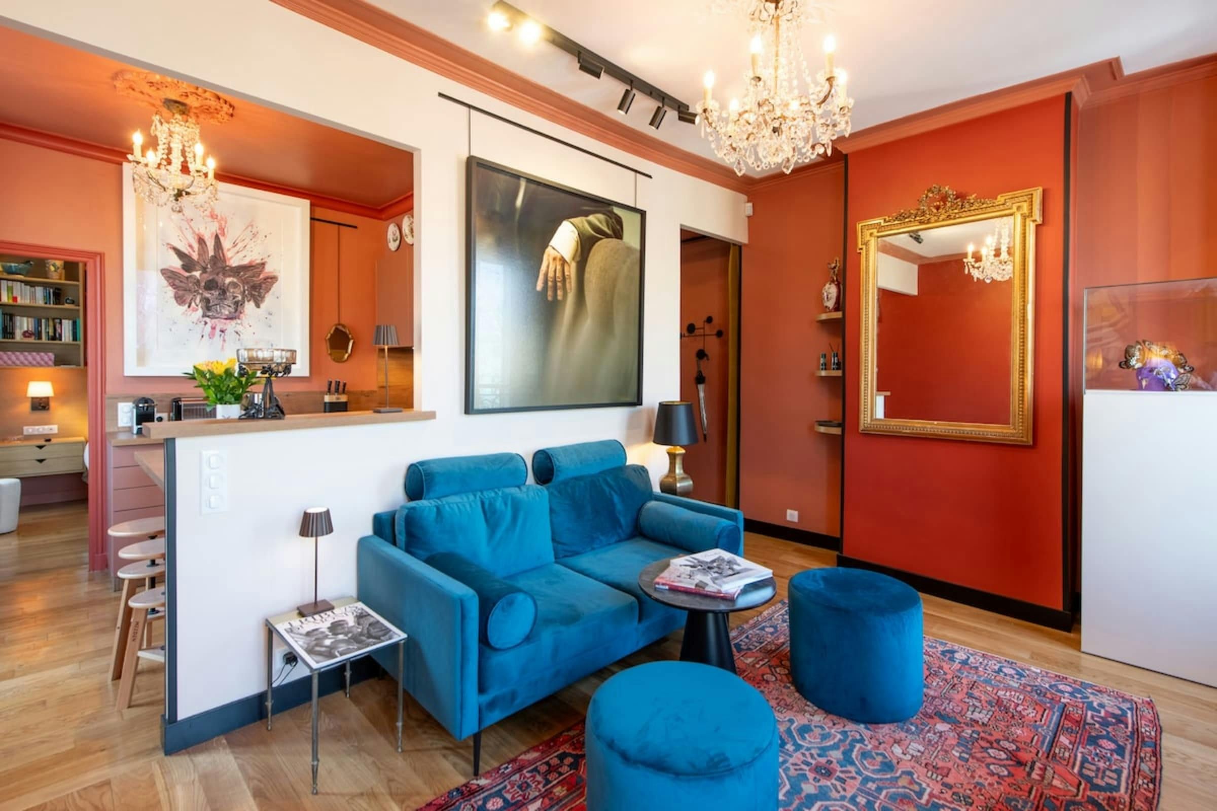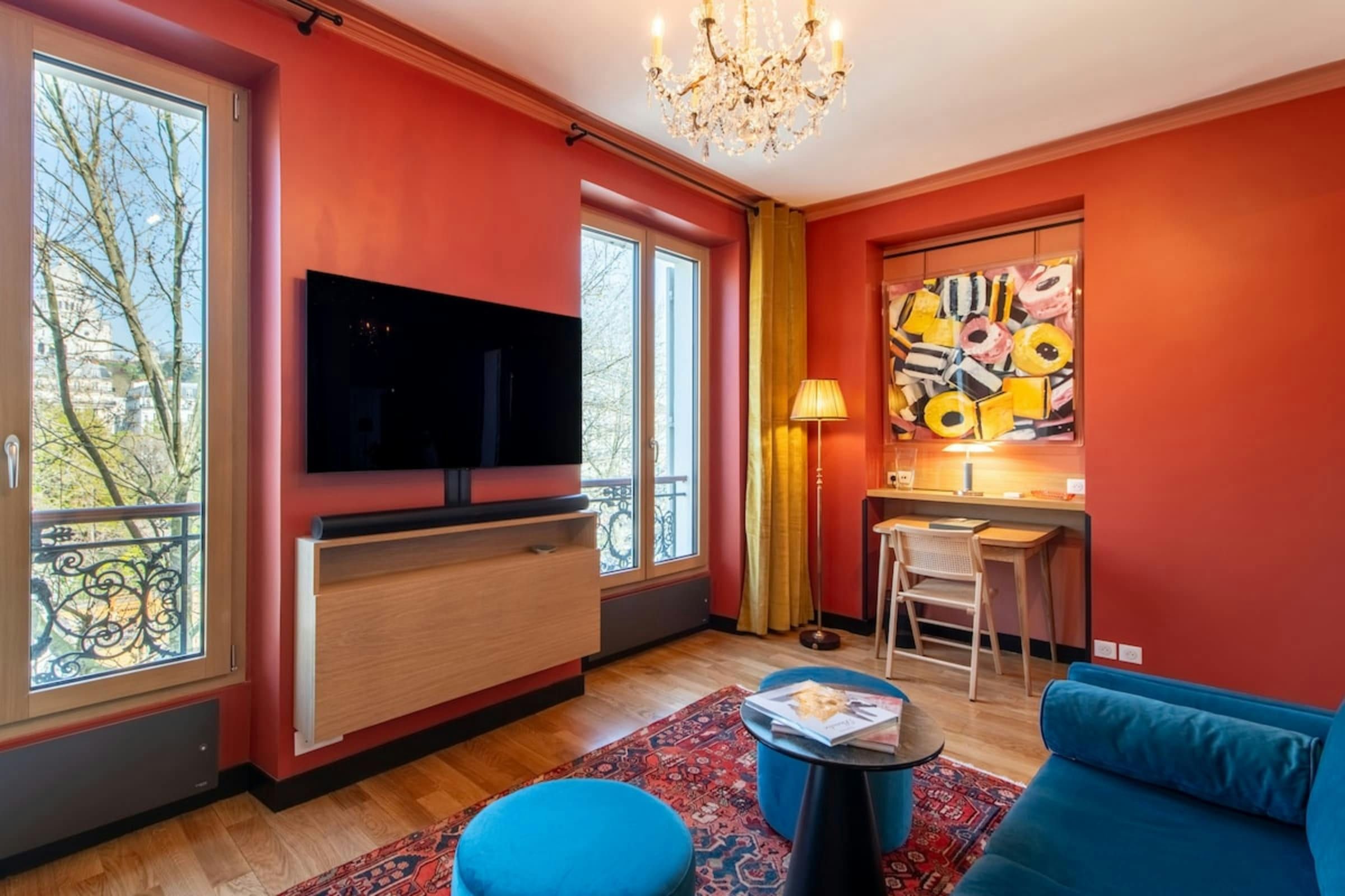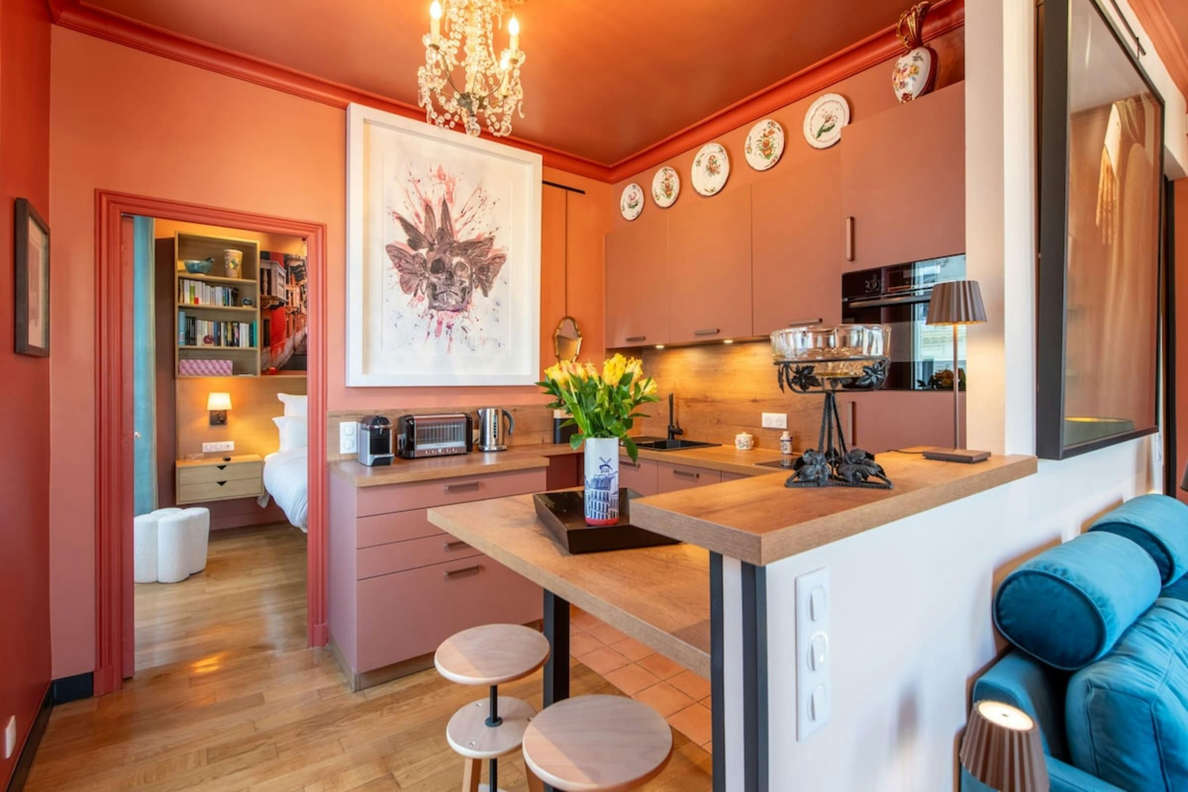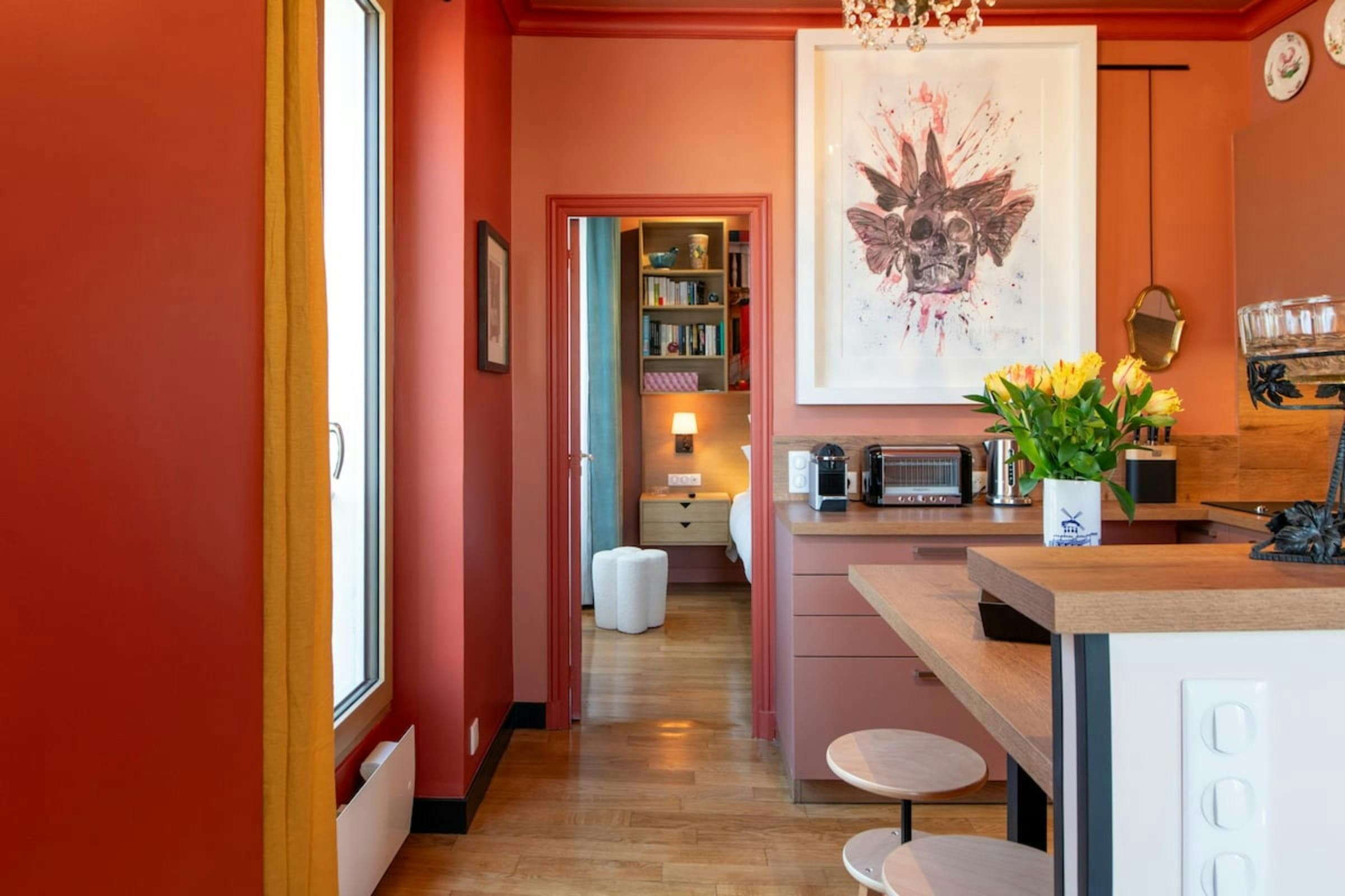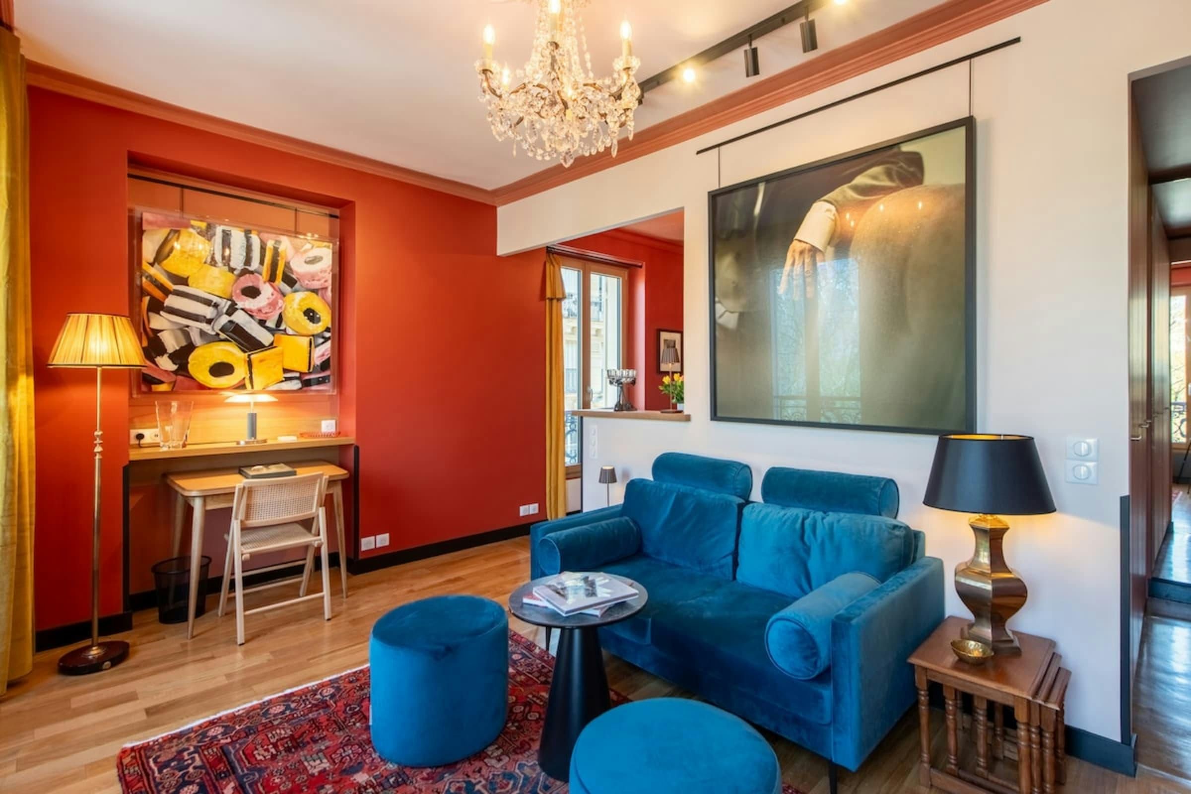 Anyone for allsorts? Traces of a renowned decorator are all over this characterful apartment, from vibrant art to tasteful furnishings. Found in the lively district of Avenue Trudaine, the home is full of colour and ideal for couples and solo travellers. The well equipped kitchen area has a small counter in place of a dining table, but otherwise there's plenty of space for relaxing and socialising, while the bedroom and blue-tiled en-suite bathroom have a pleasant character that stands apart from traditionally sterile hotel suites. You'll be fifteen minutes from Montmartre, and even have a stunning balcony view of the basilica in winter months, while Anvers metro station (on the versatile 2 line) is five minutes north.