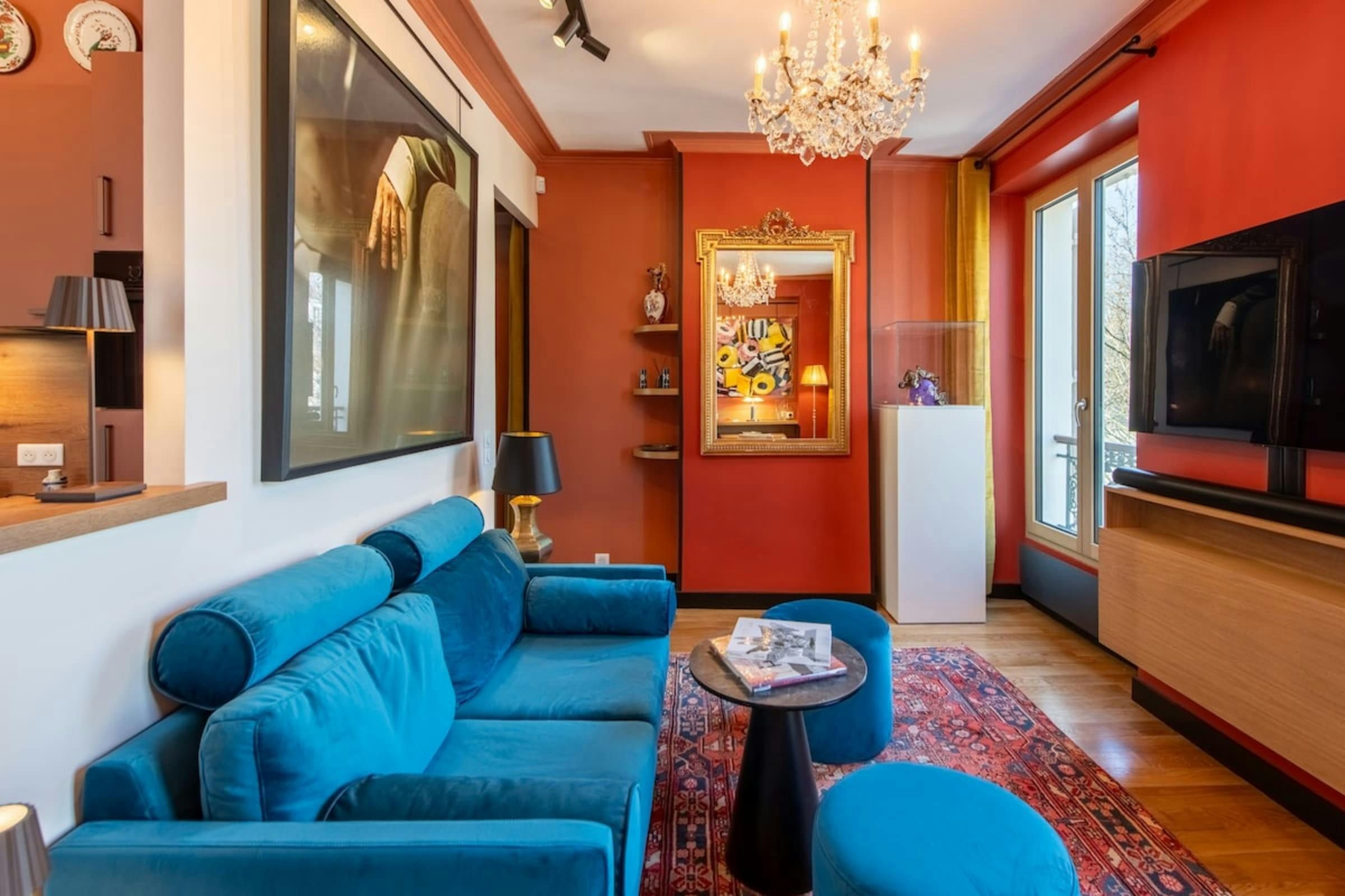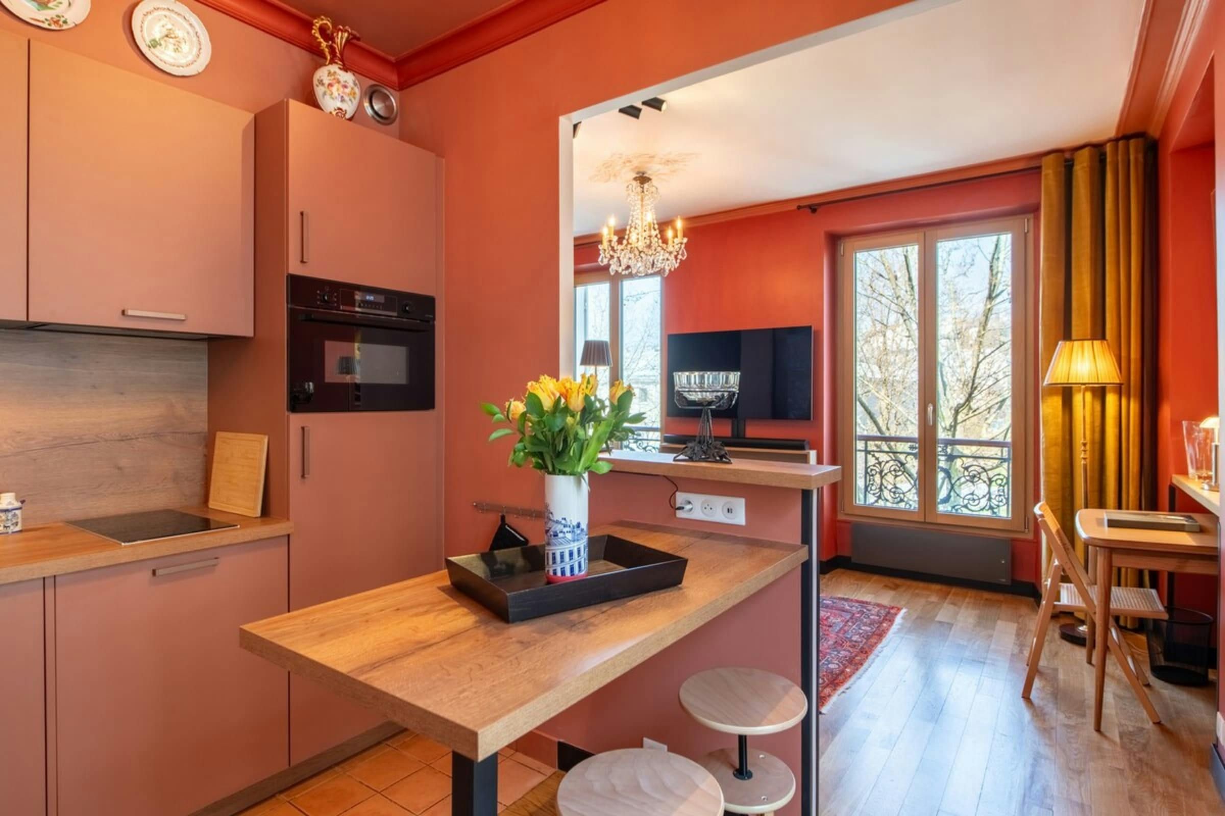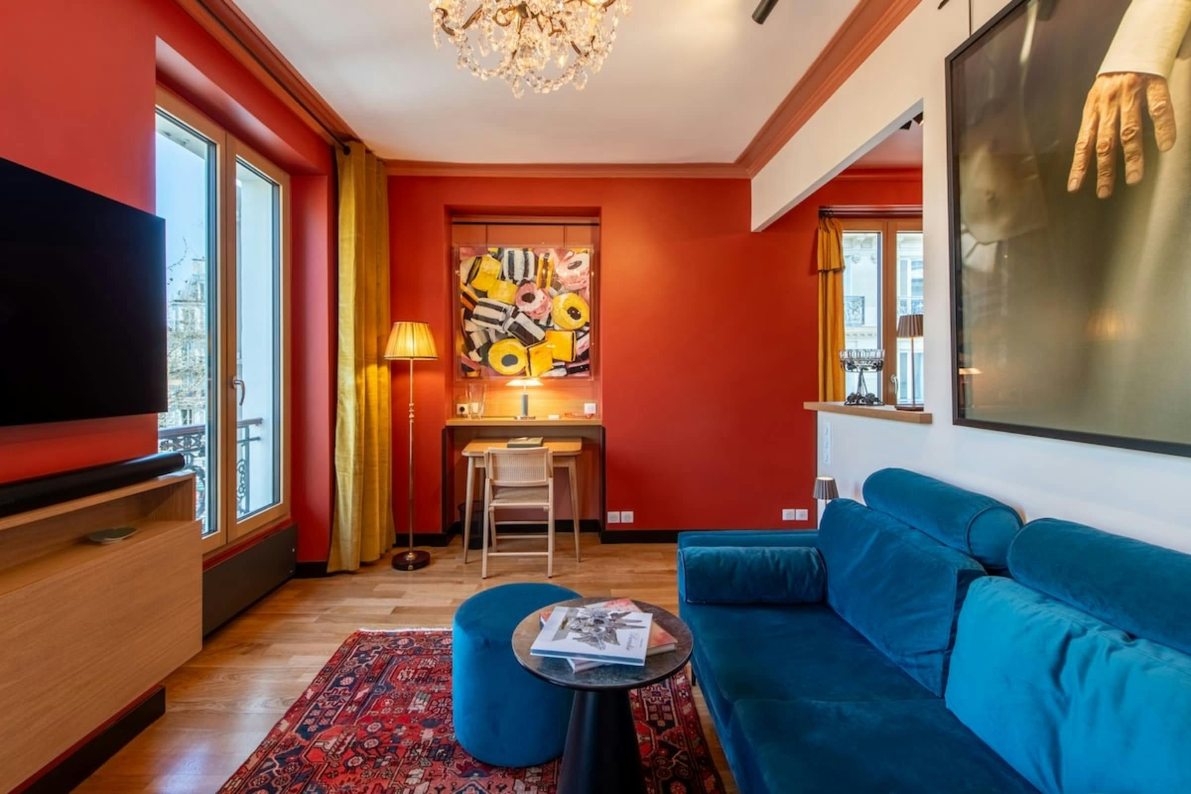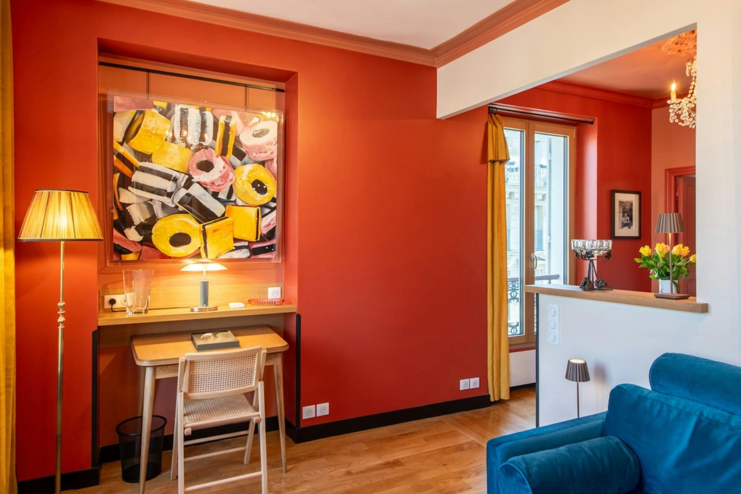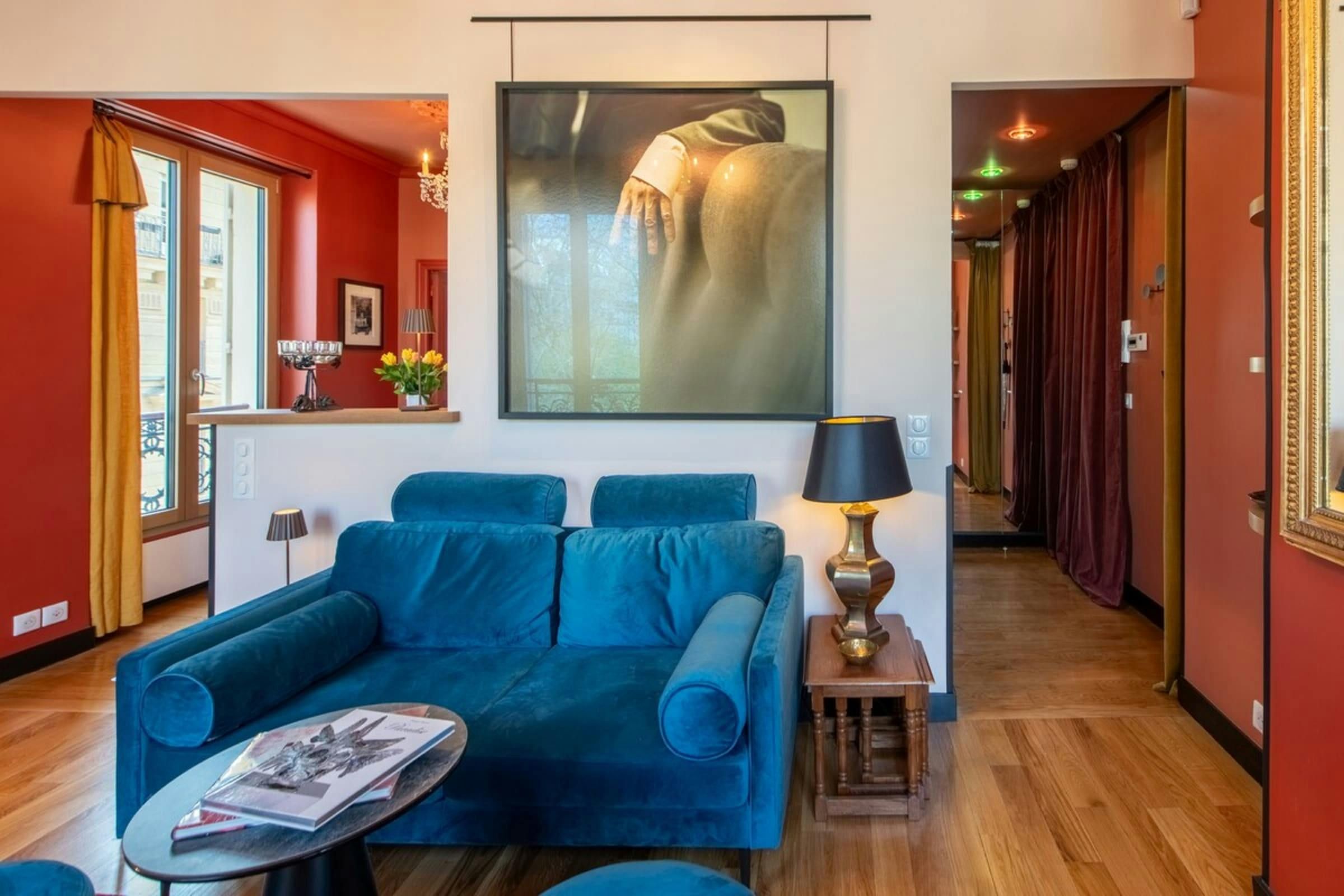 Anyone for allsorts? Traces of a renowned decorator are all over this characterful apartment, from vibrant art to tasteful furnishings. Found in the lively district of Avenue Trudaine, the home is full of colour and ideal for couples and solo travellers. The well equipped kitchen area has a small counter in place of a dining table, but otherwise there's plenty of space for relaxing and socialising, while the bedroom and blue-tiled en-suite bathroom have a pleasant character that stands apart from traditionally sterile hotel suites. You'll be fifteen minutes from Montmartre, and even have a stunning balcony view of the basilica in winter months, while Anvers metro station (on the versatile 2 line) is five minutes north.