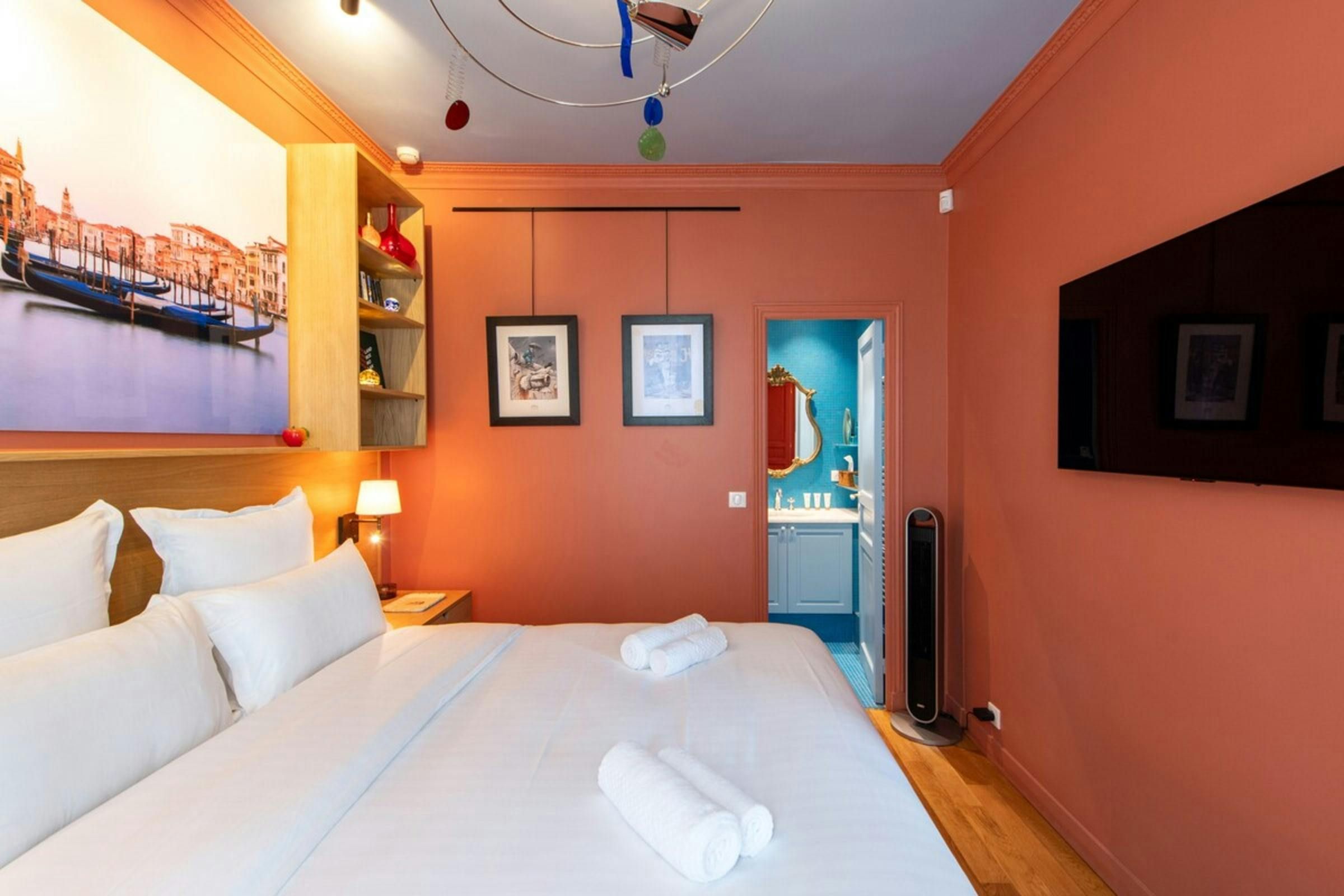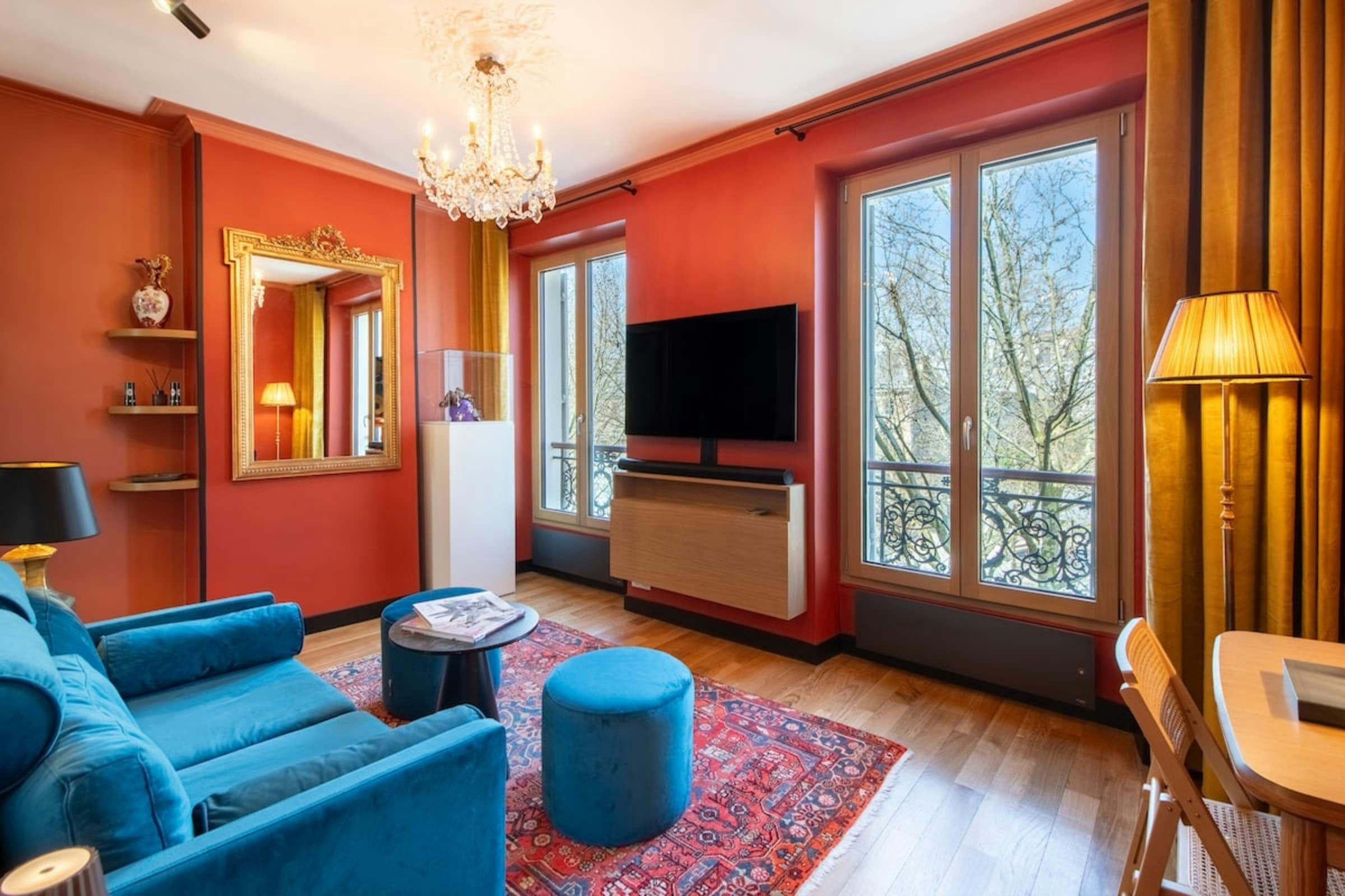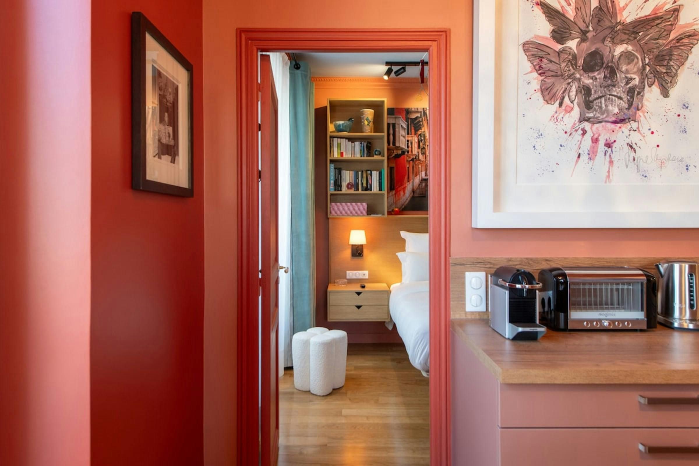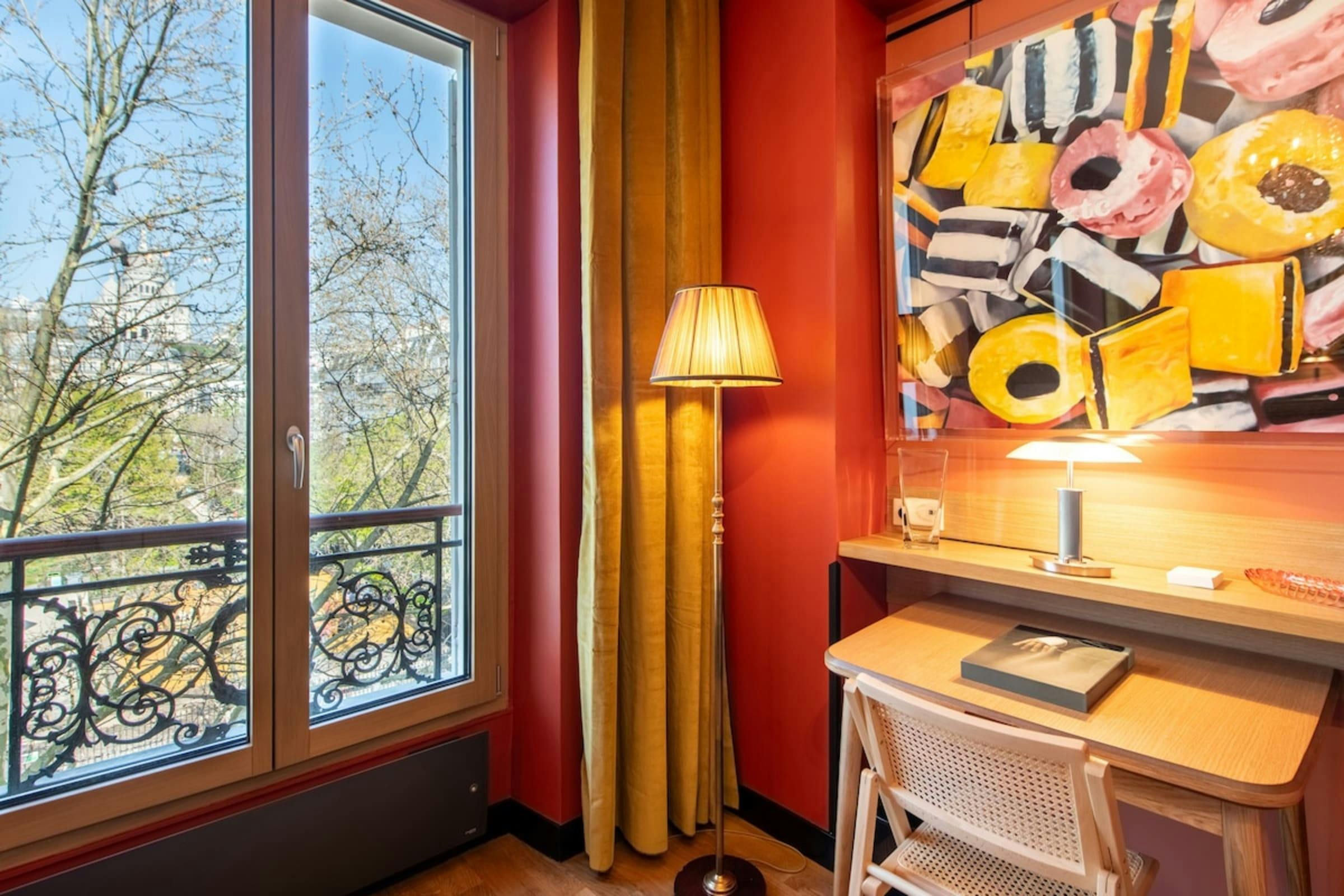 Anyone for allsorts? Traces of a renowned decorator are all over this characterful apartment, from vibrant art to tasteful furnishings. Found in the lively district of Avenue Trudaine, the home is full of colour and ideal for couples and solo travellers. The well equipped kitchen area has a small counter in place of a dining table, but otherwise there's plenty of space for relaxing and socialising, while the bedroom and blue-tiled en-suite bathroom have a pleasant character that stands apart from traditionally sterile hotel suites. You'll be fifteen minutes from Montmartre, and even have a stunning balcony view of the basilica in winter months, while Anvers metro station (on the versatile 2 line) is five minutes north.