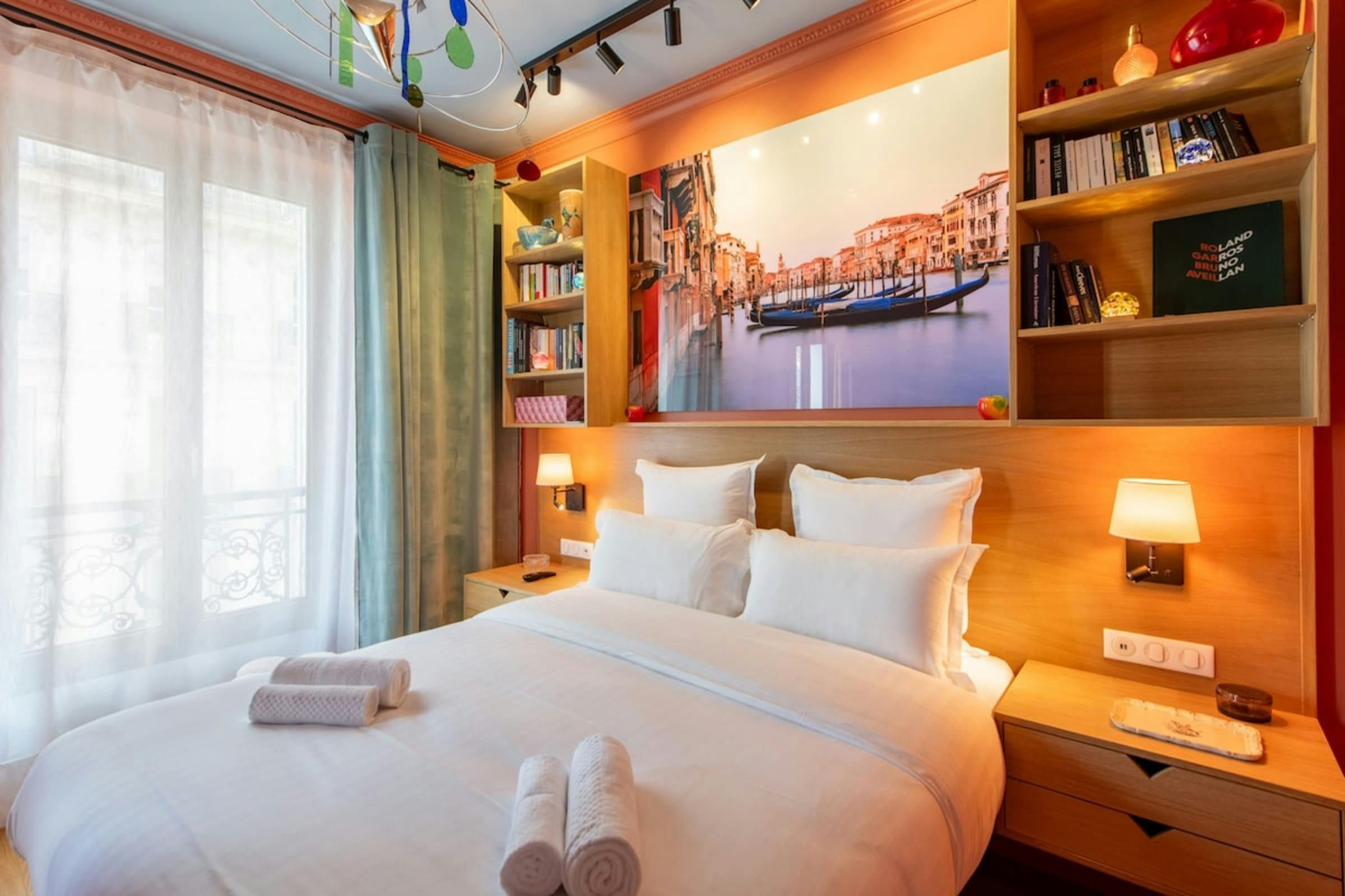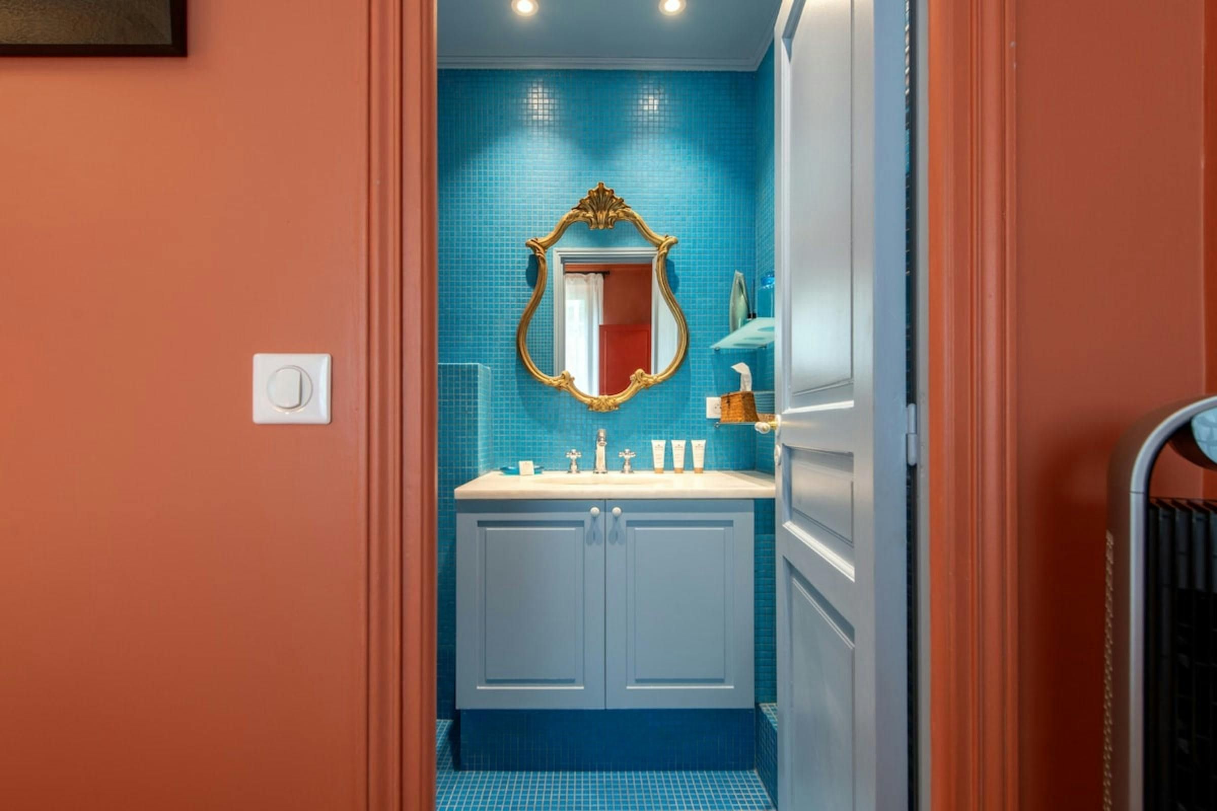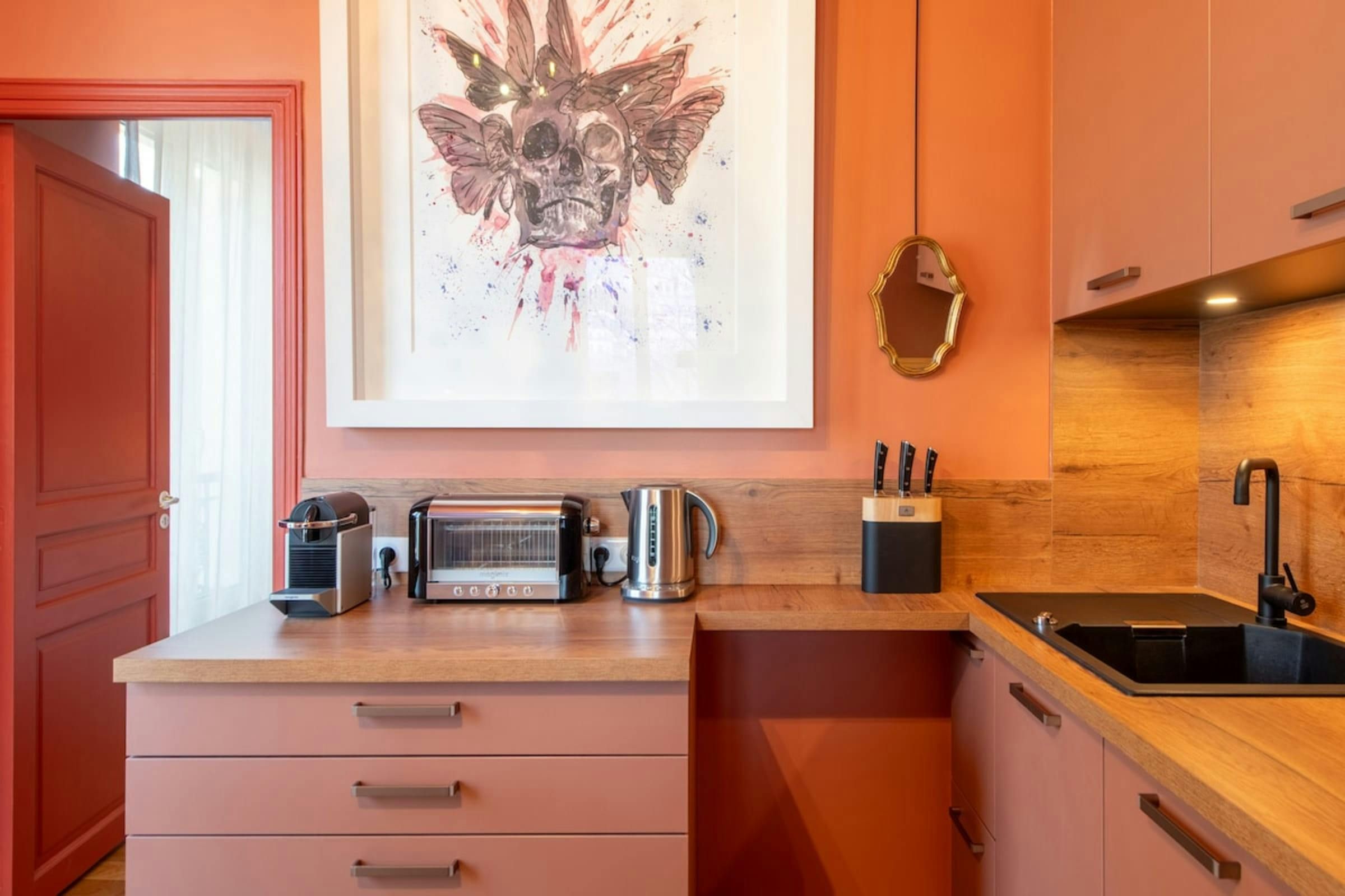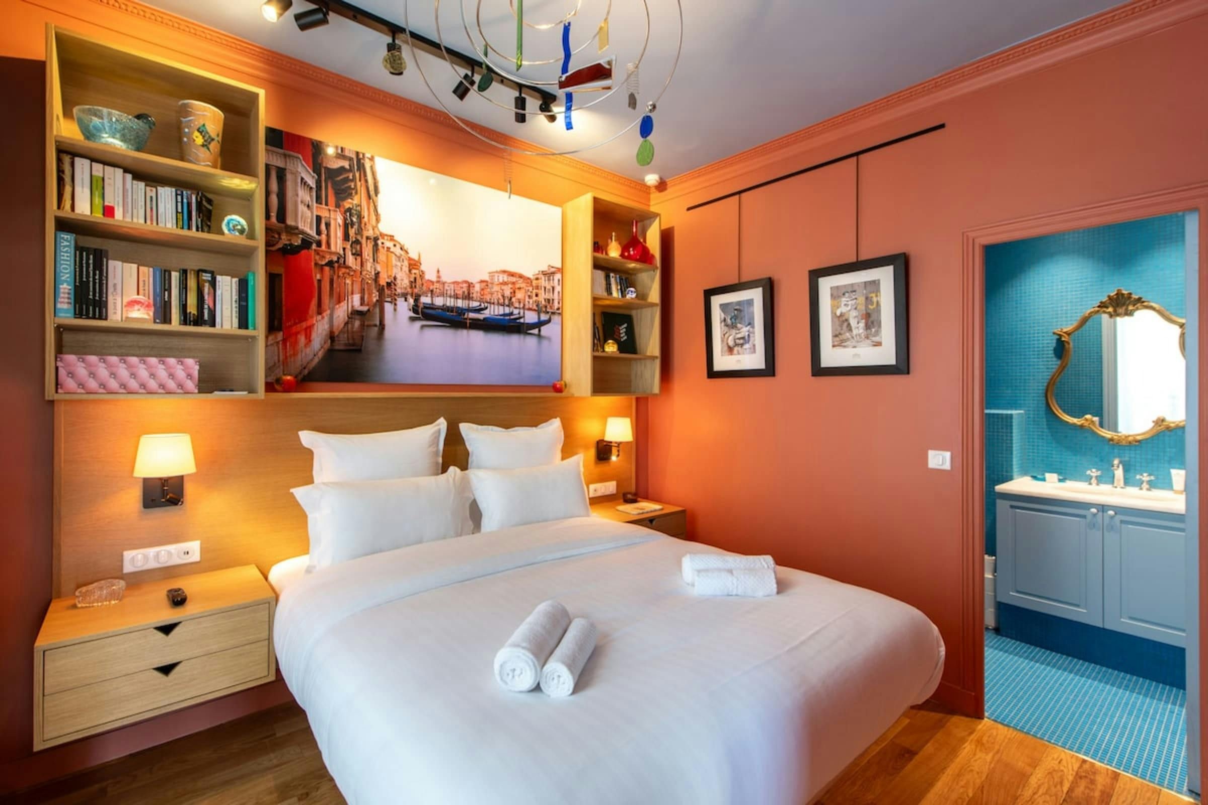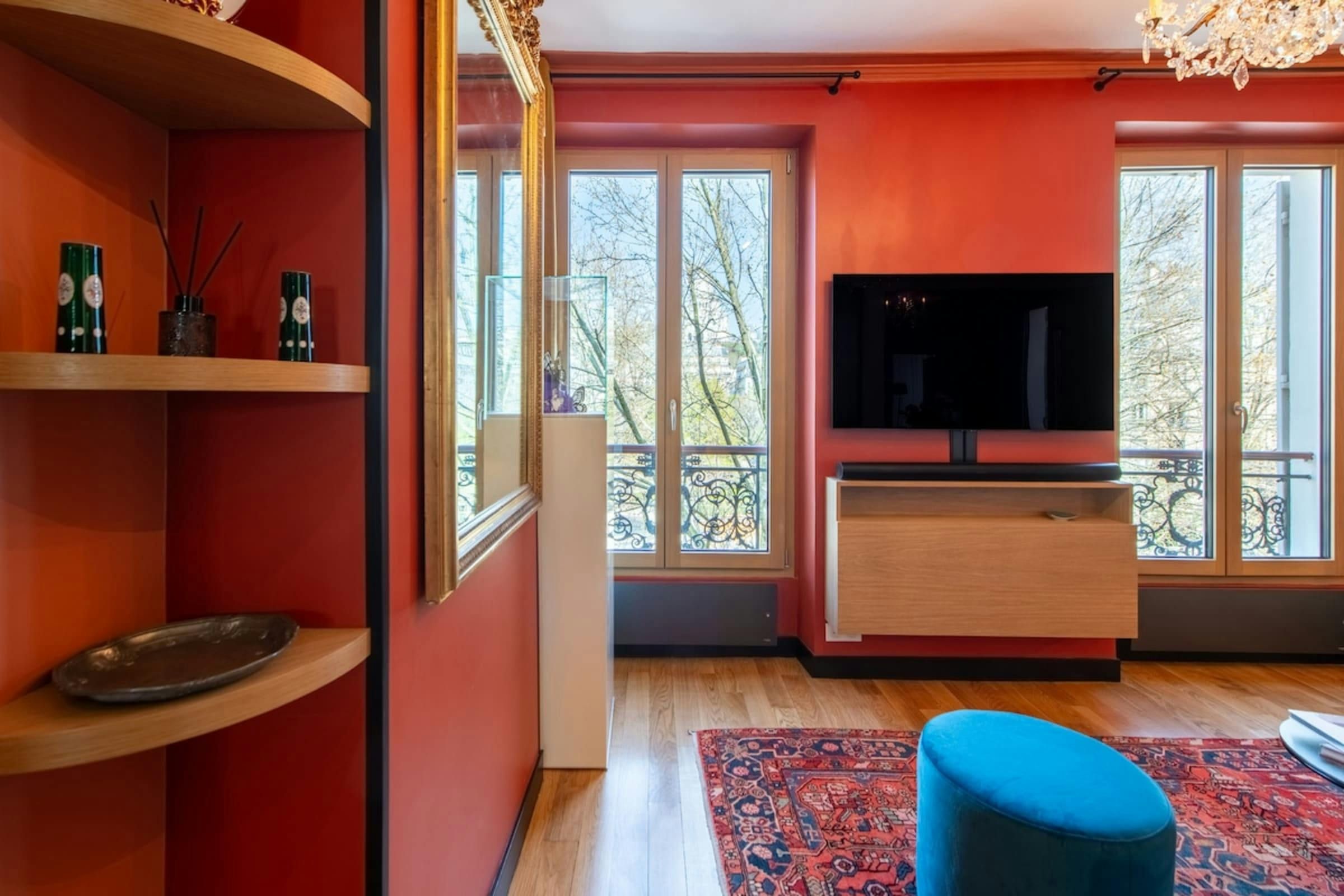 Anyone for allsorts? Traces of a renowned decorator are all over this characterful apartment, from vibrant art to tasteful furnishings. Found in the lively district of Avenue Trudaine, the home is full of colour and ideal for couples and solo travellers. The well equipped kitchen area has a small counter in place of a dining table, but otherwise there's plenty of space for relaxing and socialising, while the bedroom and blue-tiled en-suite bathroom have a pleasant character that stands apart from traditionally sterile hotel suites. You'll be fifteen minutes from Montmartre, and even have a stunning balcony view of the basilica in winter months, while Anvers metro station (on the versatile 2 line) is five minutes north.
