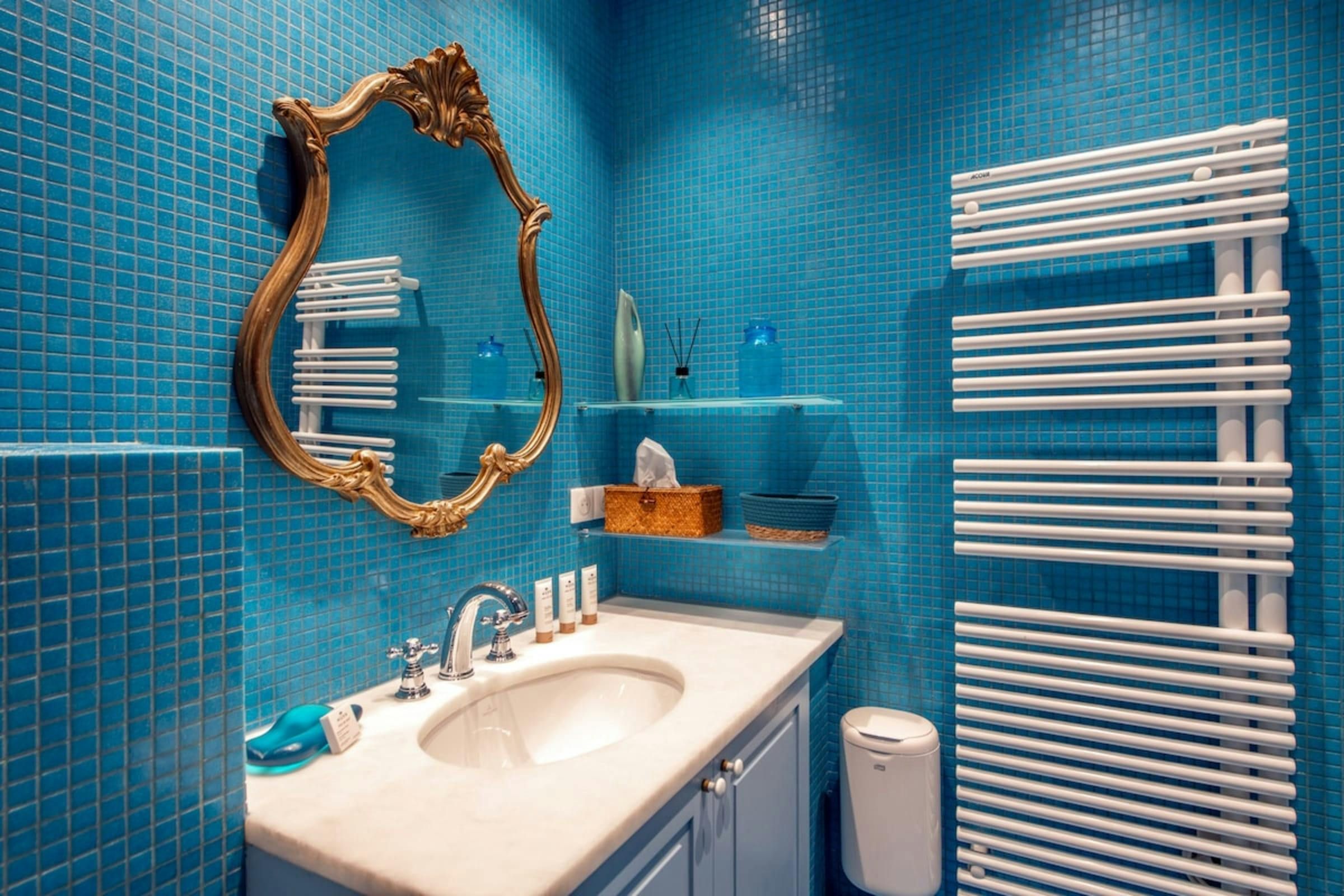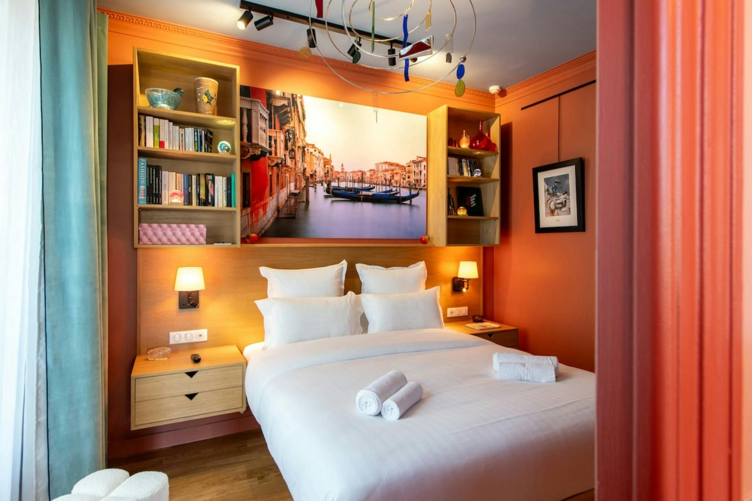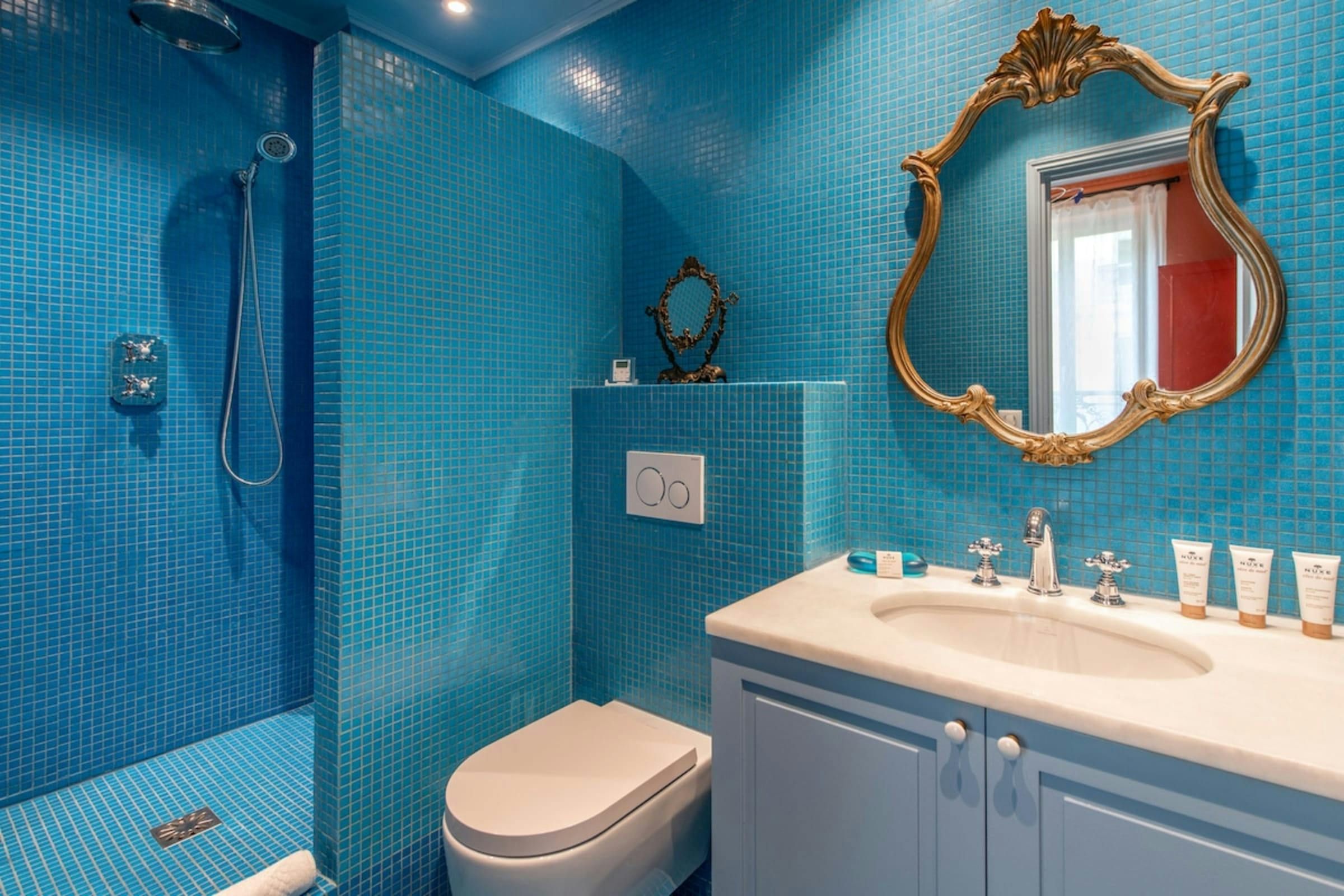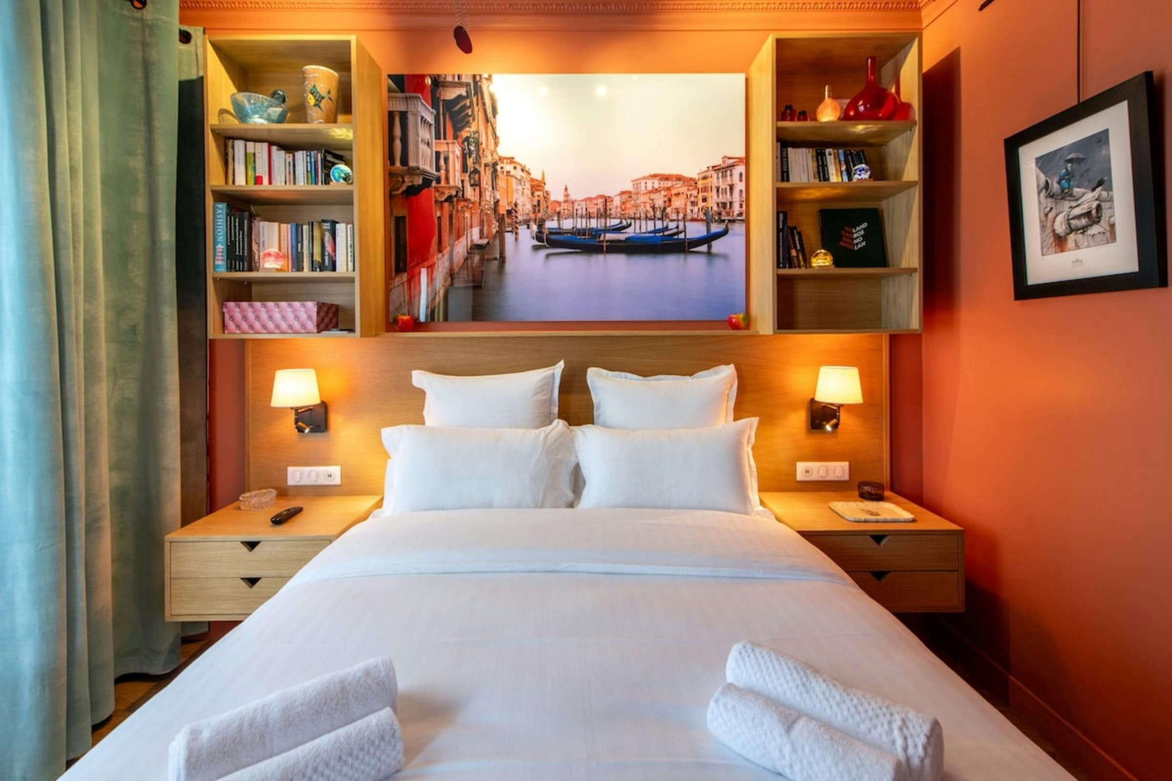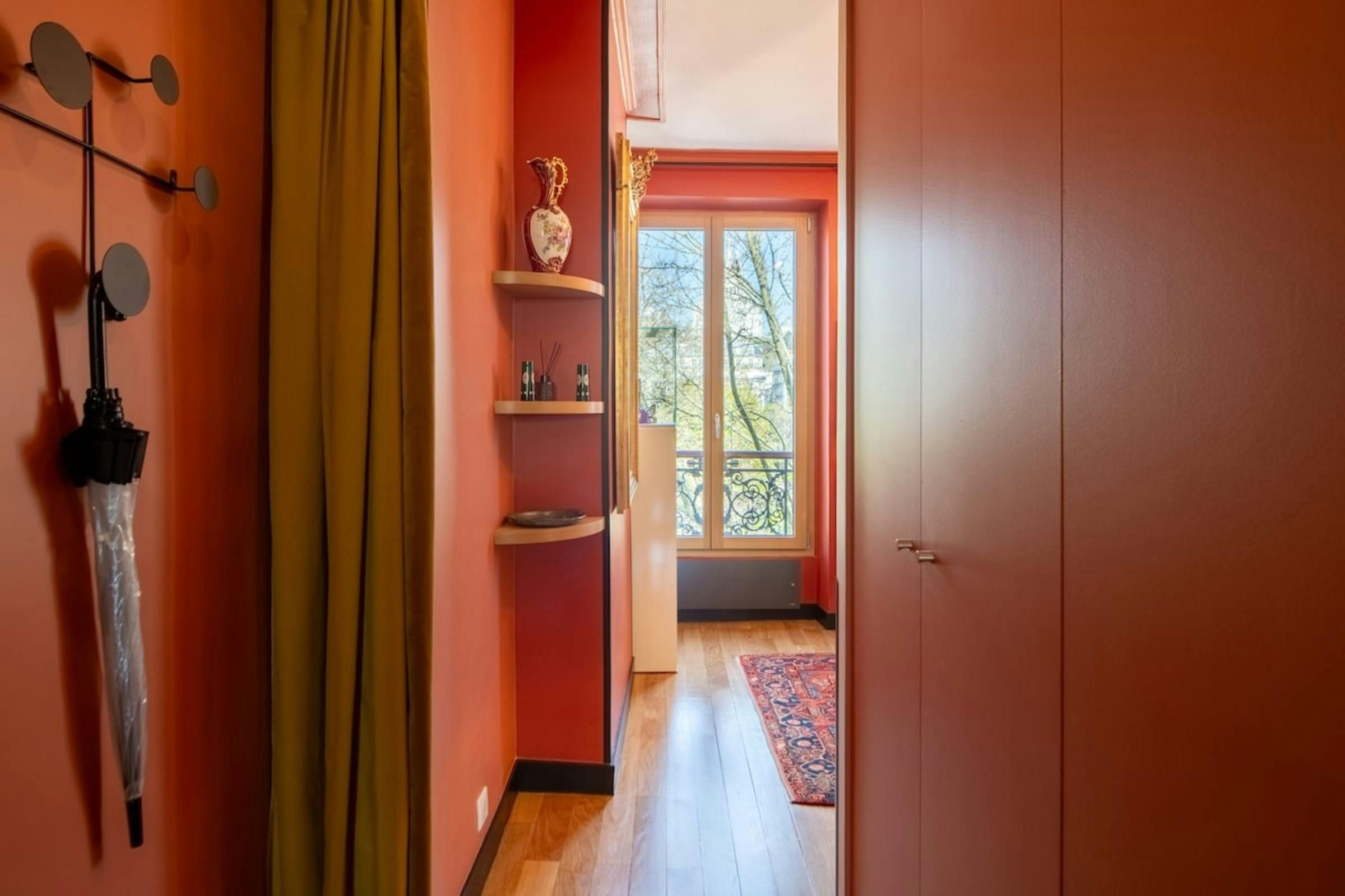 Anyone for allsorts? Traces of a renowned decorator are all over this characterful apartment, from vibrant art to tasteful furnishings. Found in the lively district of Avenue Trudaine, the home is full of colour and ideal for couples and solo travellers. The well equipped kitchen area has a small counter in place of a dining table, but otherwise there's plenty of space for relaxing and socialising, while the bedroom and blue-tiled en-suite bathroom have a pleasant character that stands apart from traditionally sterile hotel suites. You'll be fifteen minutes from Montmartre, and even have a stunning balcony view of the basilica in winter months, while Anvers metro station (on the versatile 2 line) is five minutes north.