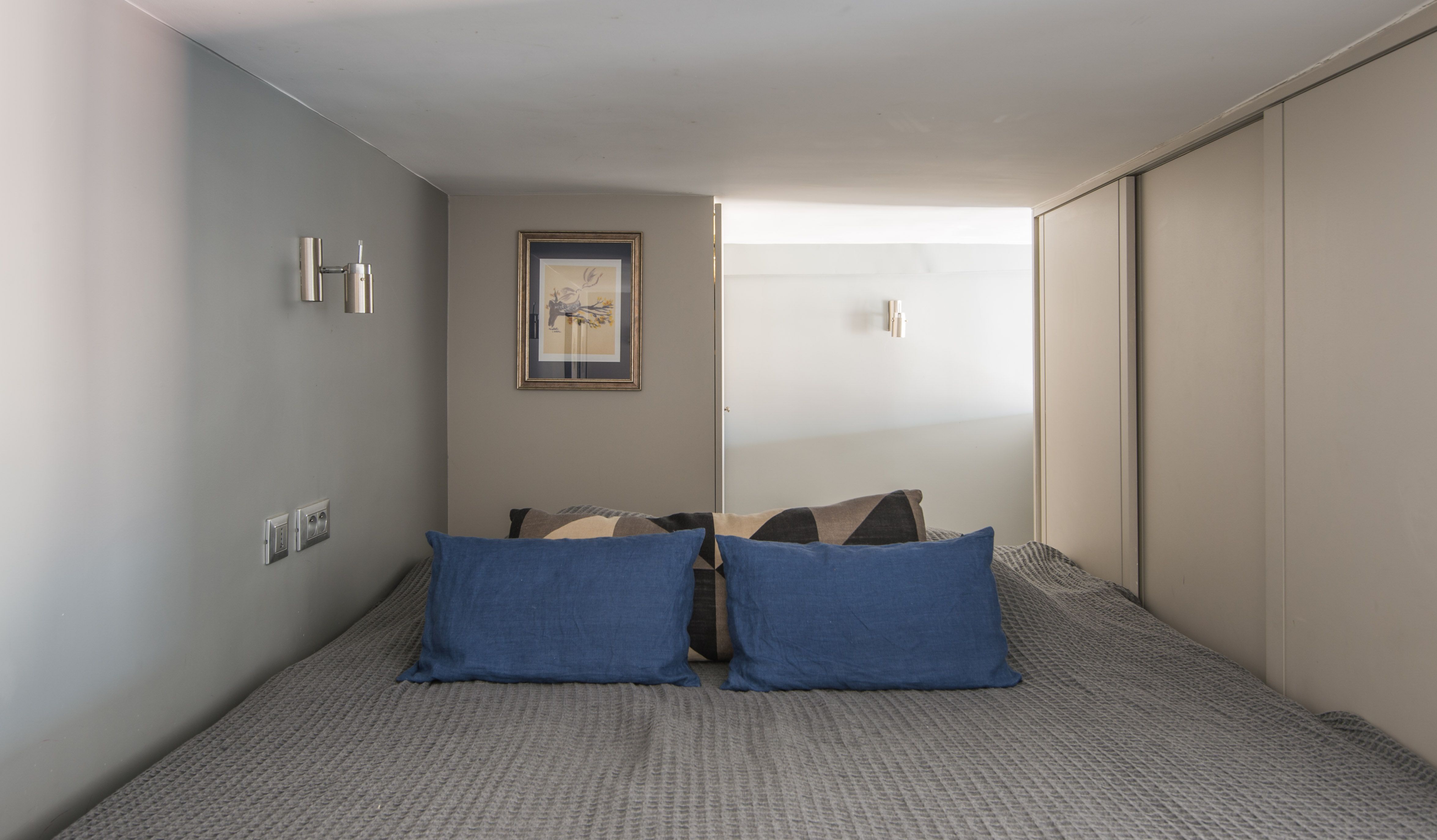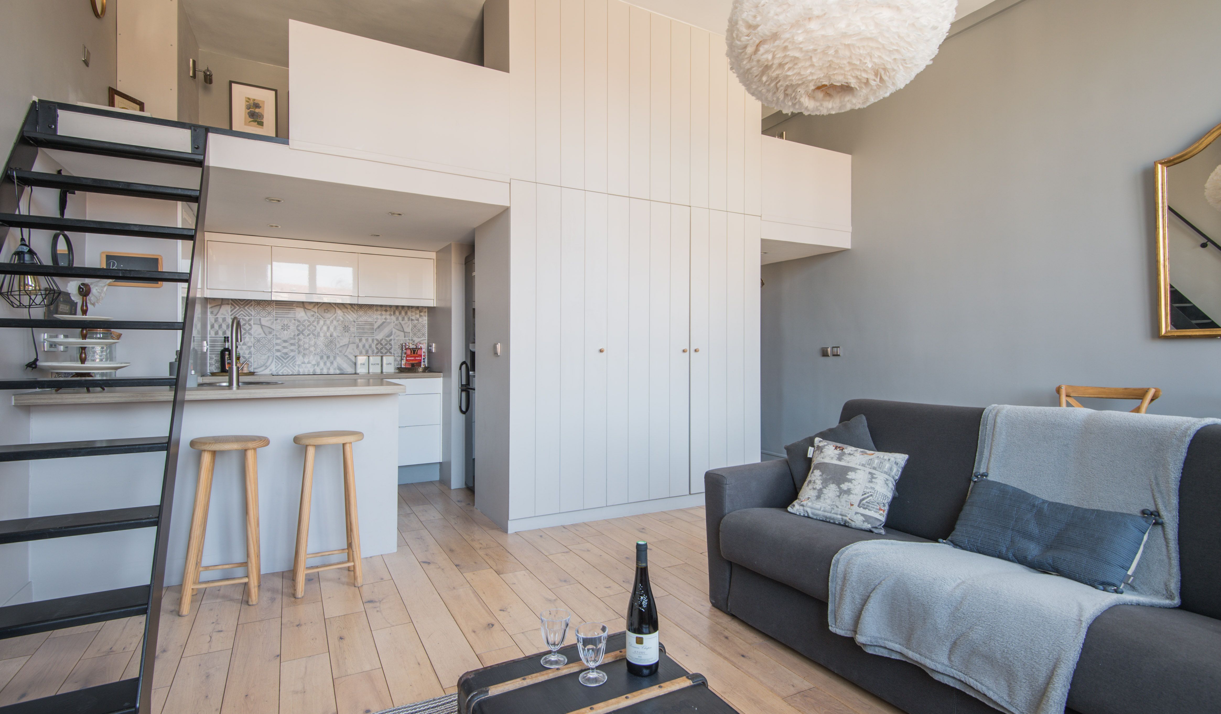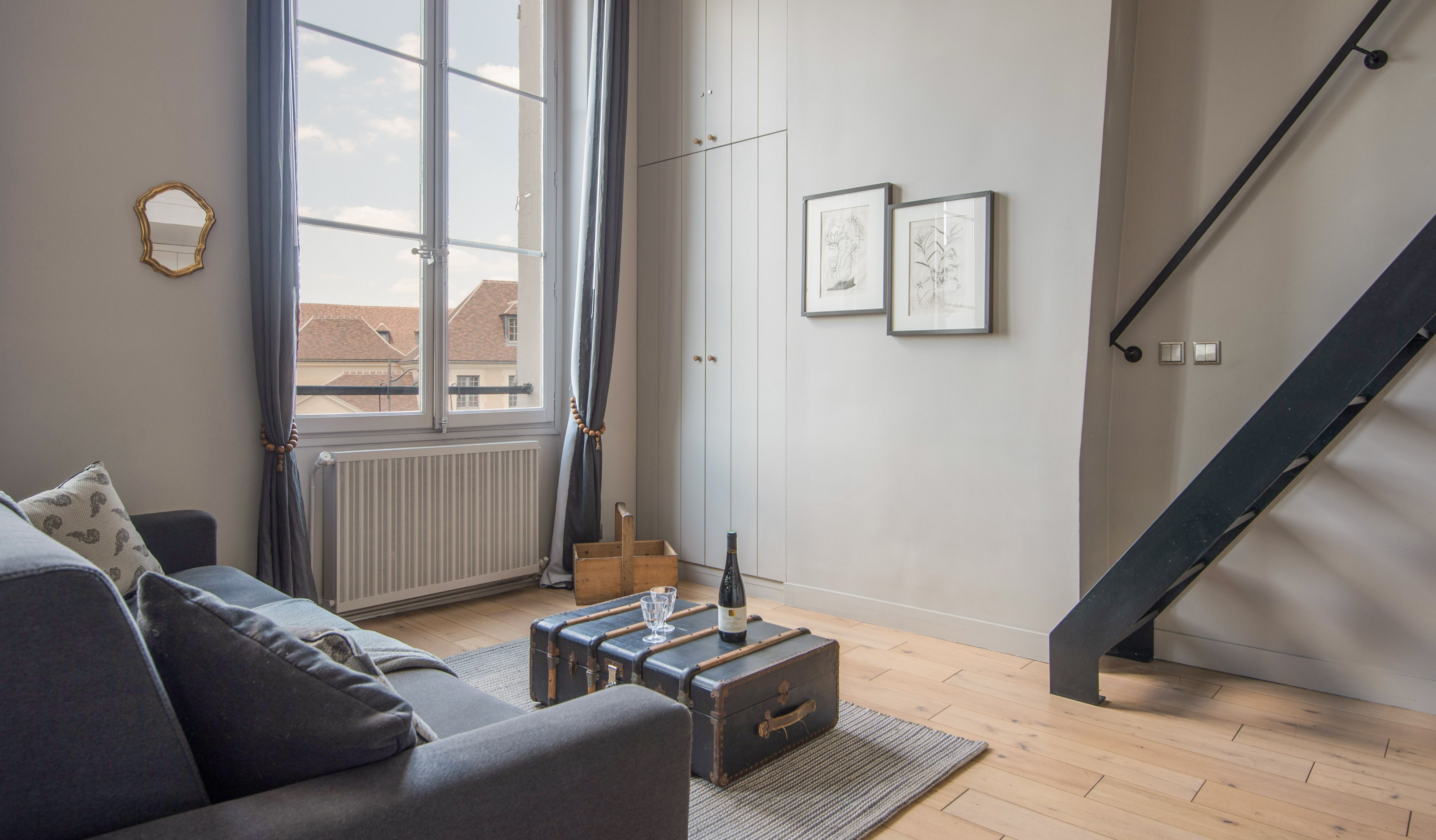 Located in the middle of the trendy Rive Gauche, this beautiful loft studio feels effortlessly chic and wonderfully Parisian. With its honey-hewed wood floors, tall ceilings, soft blue palette, and gold framed mirror, there's an air of regal sumptuousness here that feels oh so apt in its Saint-Germain-des-Prés neighbourhood. You'll instantly be dazzled by the floor-to-ceiling windows offering views of the 17th-century Hospice of Laennec and the top of the Eiffel Tower, which shimmers like glittering diamonds when the sun sets over the city. Take in the views from the plump blue sofa, enjoying your morning coffee while perusing the many Paris guide books and French cookbooks your host has provided before setting off for a day of exploring. You've got countless sights and monuments within easy reach on foot, including Rue du Bac (ten minutes away), the Luxembourg Gardens and Les Deux Magots (thirteen minutes), the Musée d'Orsay (twenty minutes) and the Eiffel Tower (thirty minutes). Meanwhile, the city's historic Le Bon Marché department store is right on your doorstep, as well as countless gourmet food shops and pâtisseries. After a day of sightseeing, come back home for a glass of wine and a meal at home before curling up on the sofa with one of the Paris-themed DVDs provided. Then climb the stairs up to your cosy mezzanine bedroom for a dreamy night's sleep.