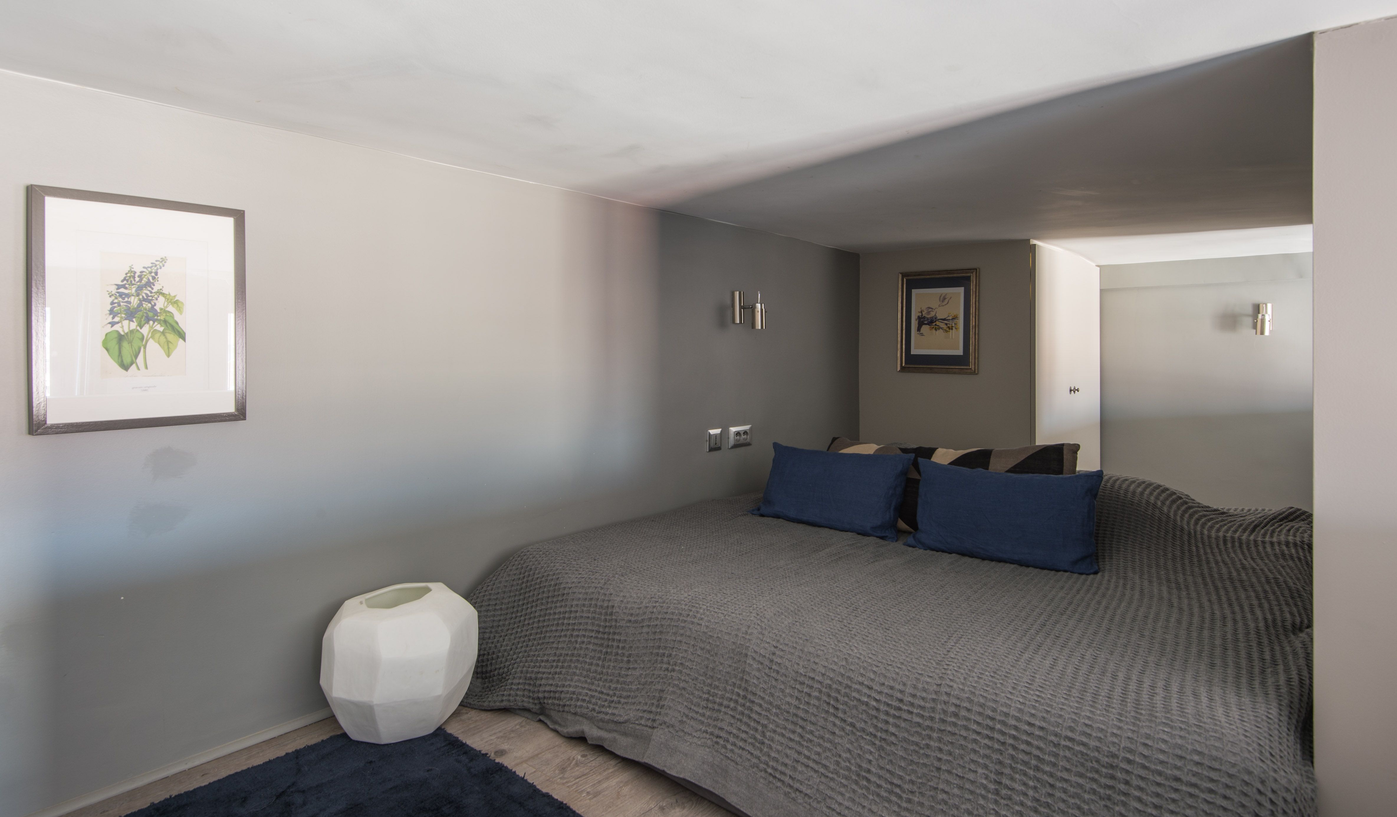 *The bed is on a mezzanine above the living space – there are stairs up to the mezzanine and it has low ceilings so you may need to duck to get into bed