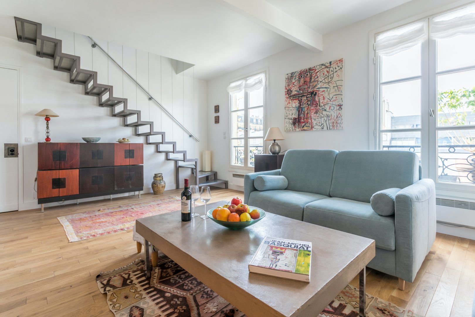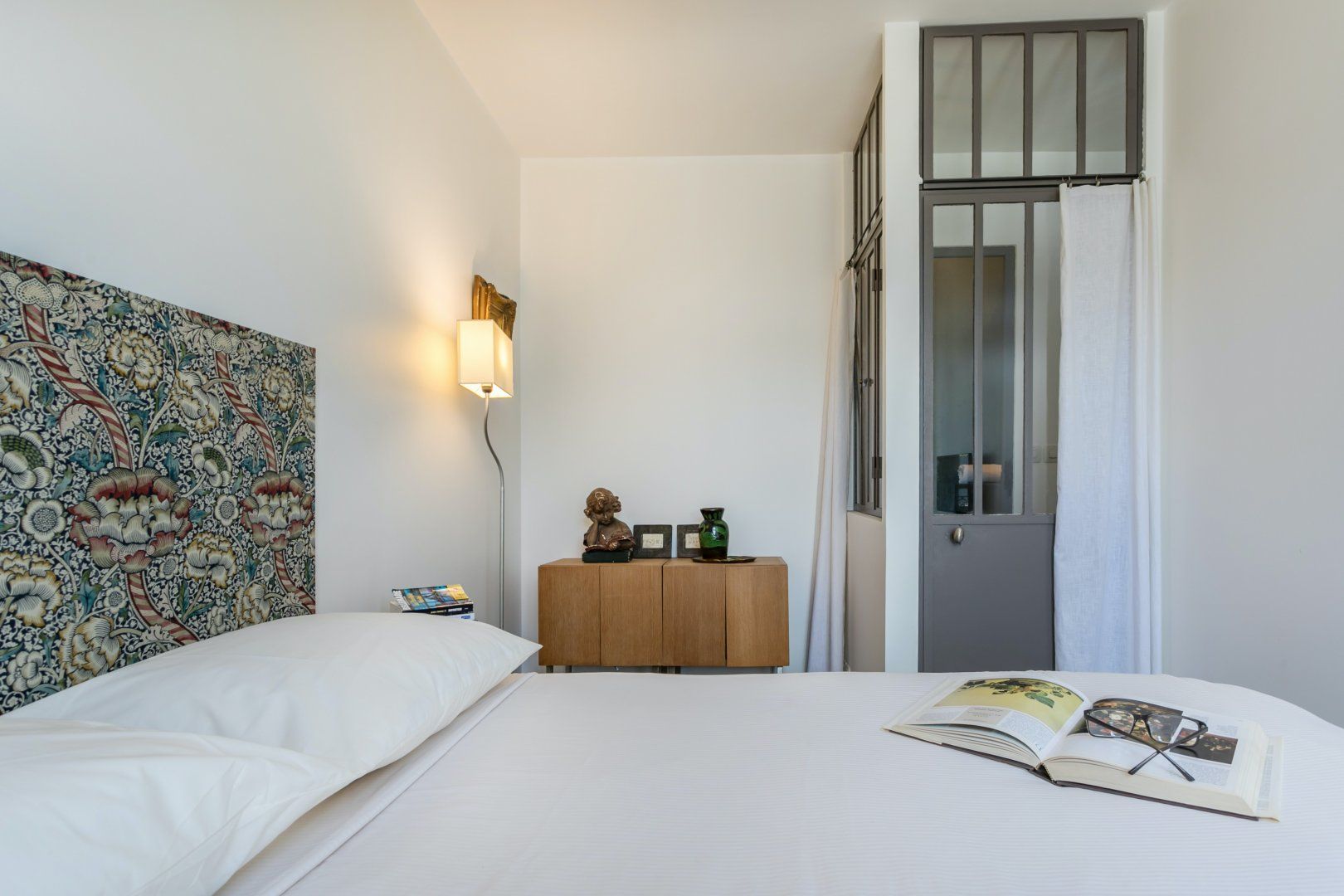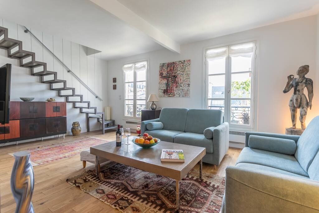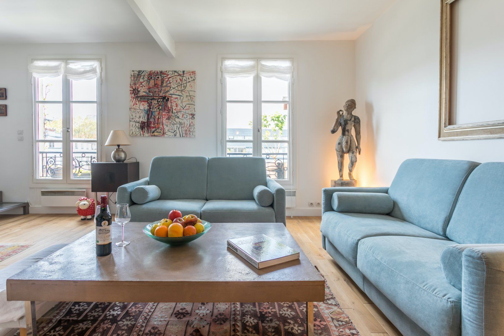 In the Bastille neighbourhood of Paris, this duplex provides a chic and elegant place to call home. Place de la Bastille is a fifteen-minute walk away and the nearest metro station is five minutes away at Ledru Rollin, whisking you to sights like The Louvre and Notre Dame in around fifteen minutes. Entering the apartment you instantly feel a sense of creativity and style. Striking sculptures stand proud in the living room and splashes of modern art worthy of a place in the Louvre liven up white walls. Big French windows fill the room with light and a bookcase stuffed with paperbacks and curios from around the world adds a homely touch. The kitchen is tucked away, and there’s a vaguely pastoral feeling to the green and honey walls. Spacious double beds are crowned with painted headboards in both bedrooms, so there’s no need to draw straws for the master.