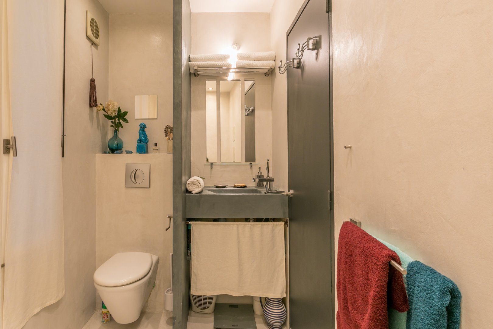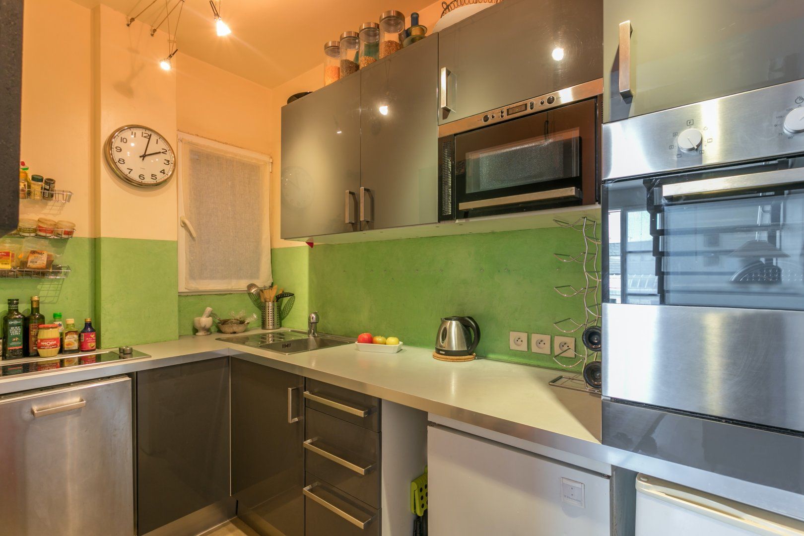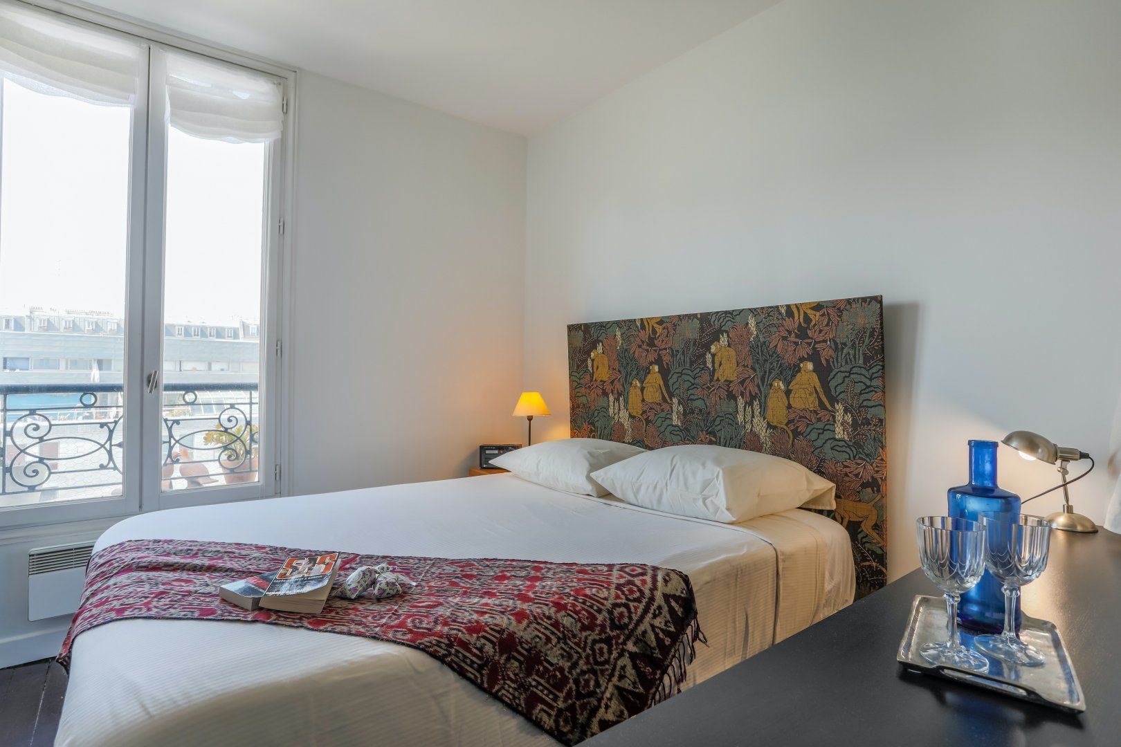 In the Bastille neighbourhood of Paris, this duplex provides a chic and elegant place to call home. Place de la Bastille is a fifteen-minute walk away and the nearest metro station is five minutes away at Ledru Rollin, whisking you to sights like The Louvre and Notre Dame in around fifteen minutes. Entering the apartment you instantly feel a sense of creativity and style. Striking sculptures stand proud in the living room and splashes of modern art worthy of a place in the Louvre liven up white walls. Big French windows fill the room with light and a bookcase stuffed with paperbacks and curios from around the world adds a homely touch. The kitchen is tucked away, and there’s a vaguely pastoral feeling to the green and honey walls. Spacious double beds are crowned with painted headboards in both bedrooms, so there’s no need to draw straws for the master.