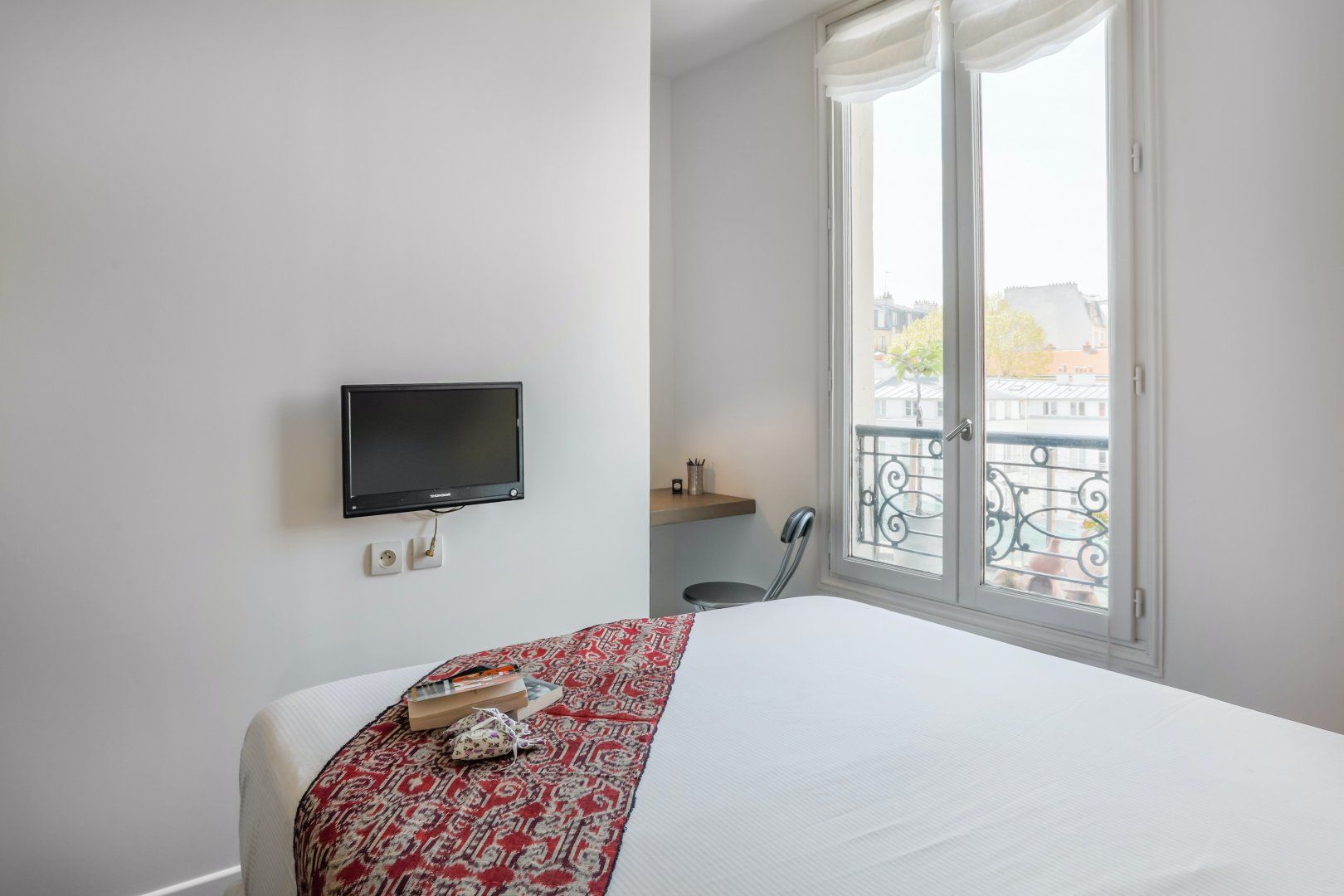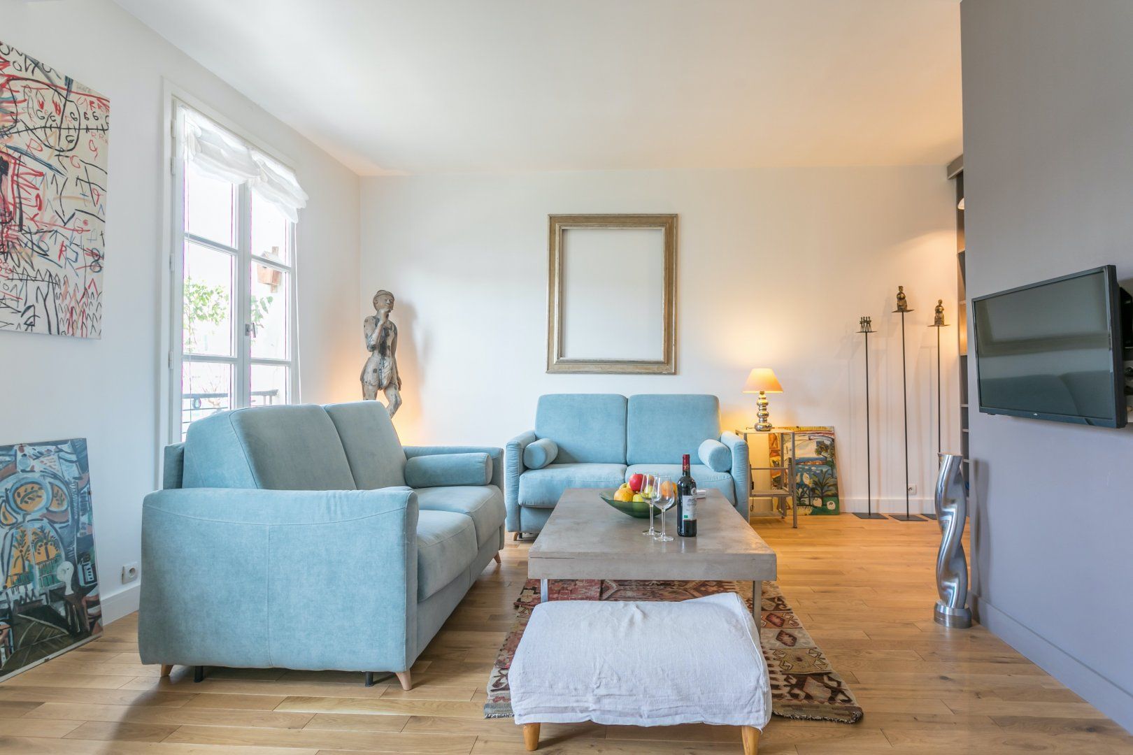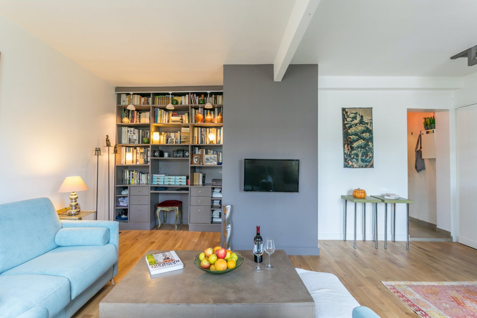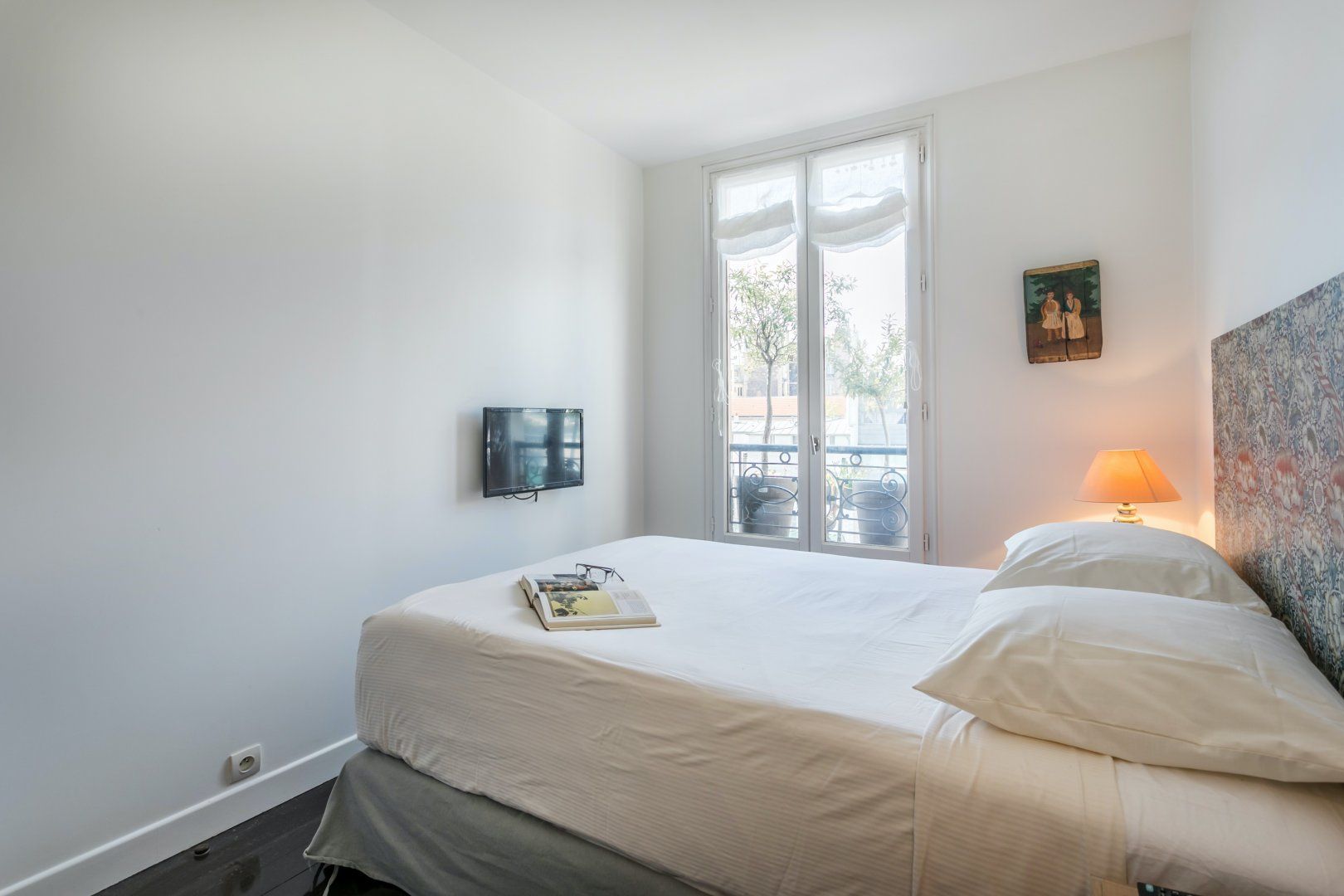 In the Bastille neighbourhood of Paris, this duplex provides a chic and elegant place to call home. Place de la Bastille is a fifteen-minute walk away and the nearest metro station is five minutes away at Ledru Rollin, whisking you to sights like The Louvre and Notre Dame in around fifteen minutes. Entering the apartment you instantly feel a sense of creativity and style. Striking sculptures stand proud in the living room and splashes of modern art worthy of a place in the Louvre liven up white walls. Big French windows fill the room with light and a bookcase stuffed with paperbacks and curios from around the world adds a homely touch. The kitchen is tucked away, and there’s a vaguely pastoral feeling to the green and honey walls. Spacious double beds are crowned with painted headboards in both bedrooms, so there’s no need to draw straws for the master.