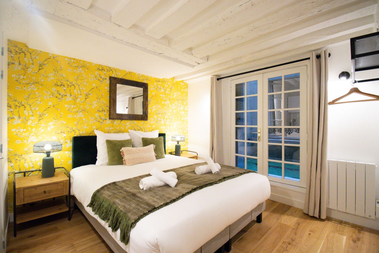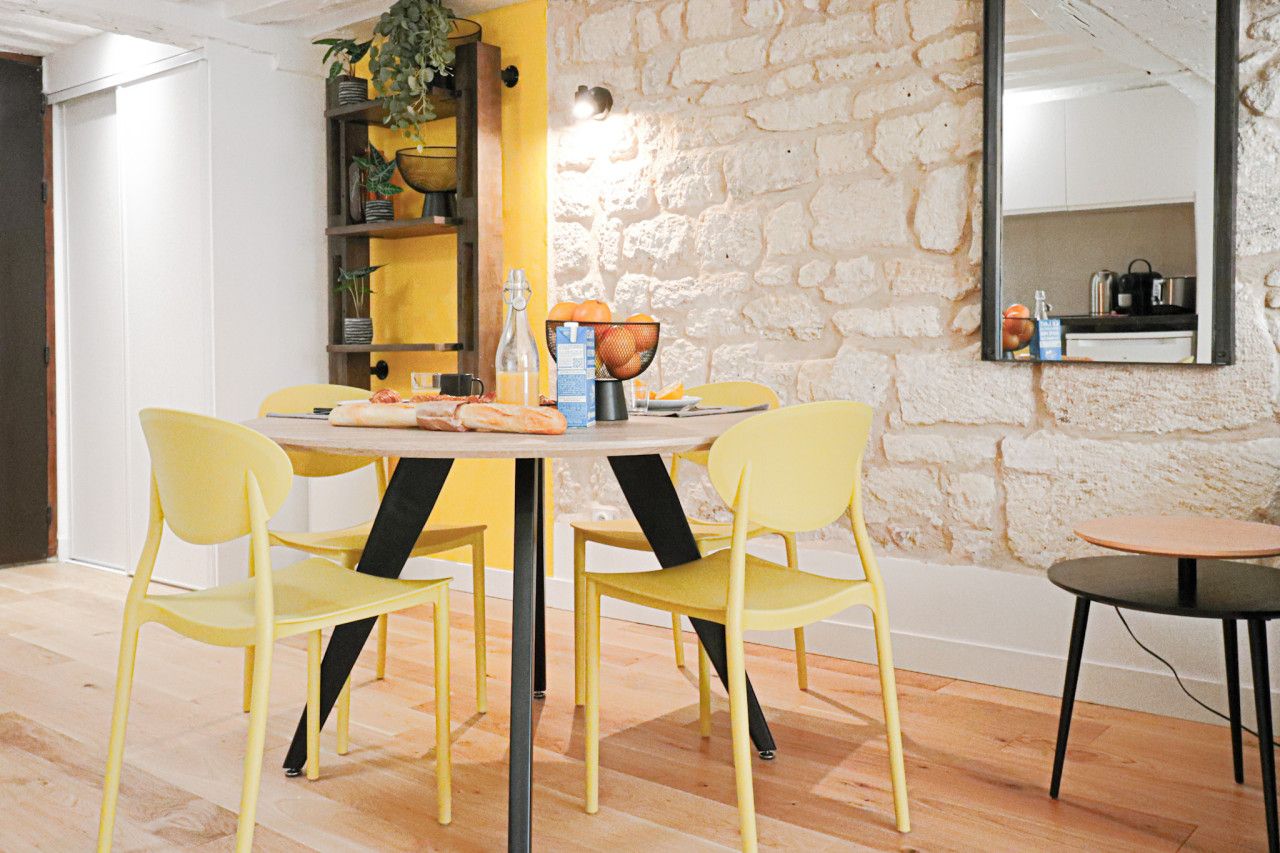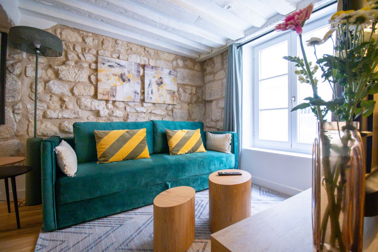 Located a short walk from the Place des Vosges, you’ll find plenty of things to see and do when you stay at this apartment. The National Archives Museum and the Pompidou Centre are within easy walking distance too. As you’d expect of such a great location, there are lots of cafes, bars and restaurants to explore. Having a number of eateries nearby is convenient, as this apartment’s kitchen doesn’t have an oven. We love the character features in the open-plan living space (this room also sleeps two guests on a sofa bed at full occupancy). This place is ideal for an unforgettable stay in the City of Light.