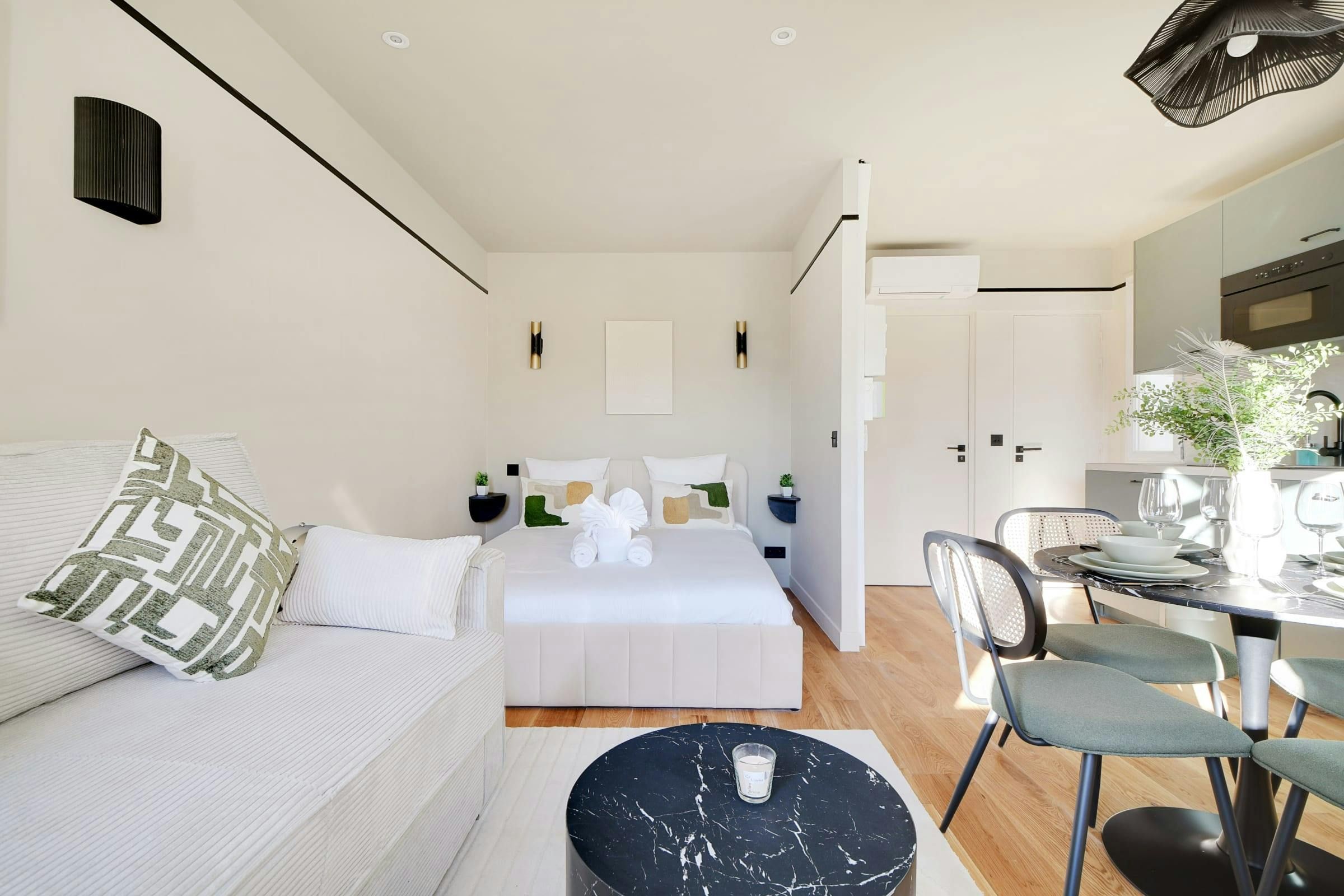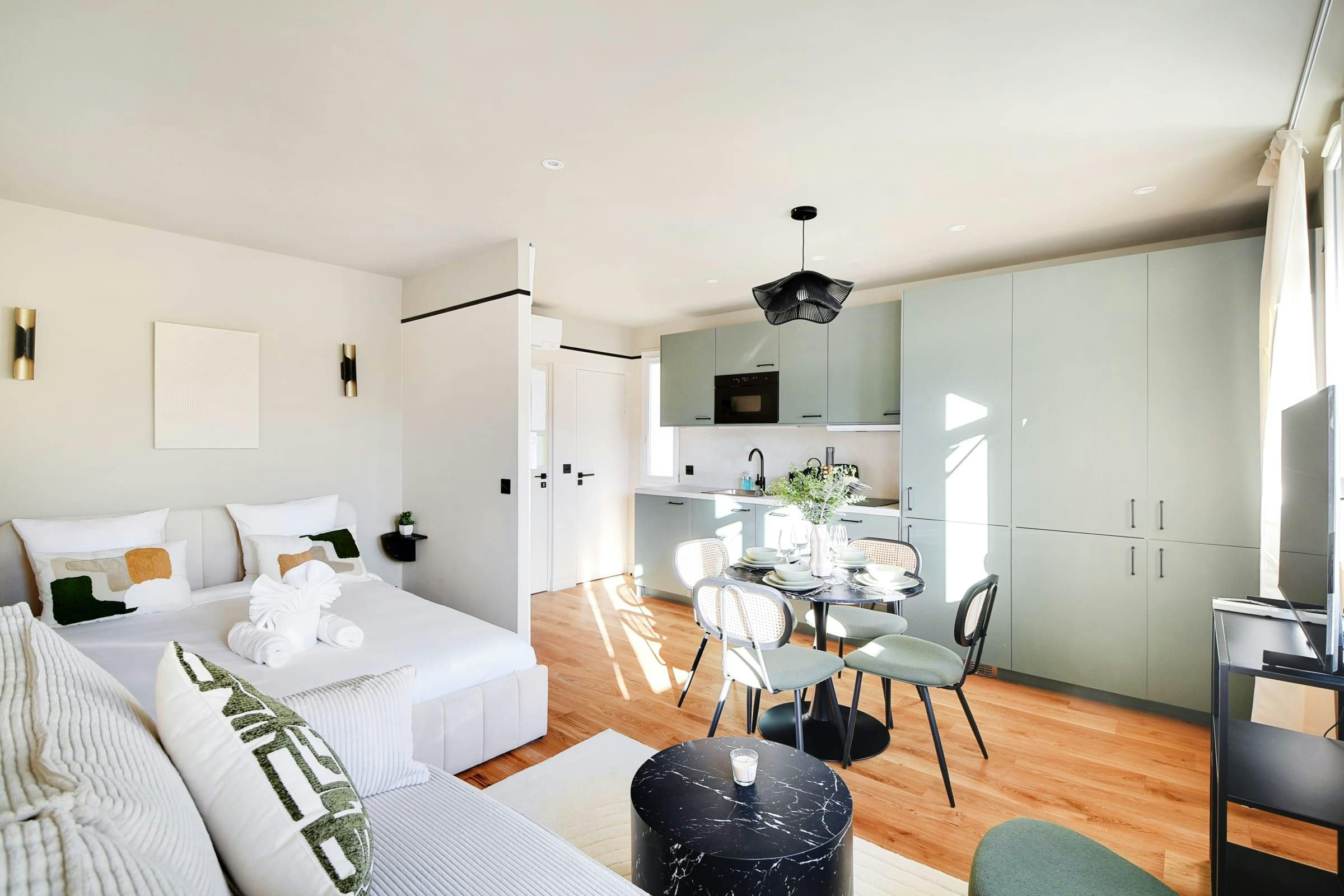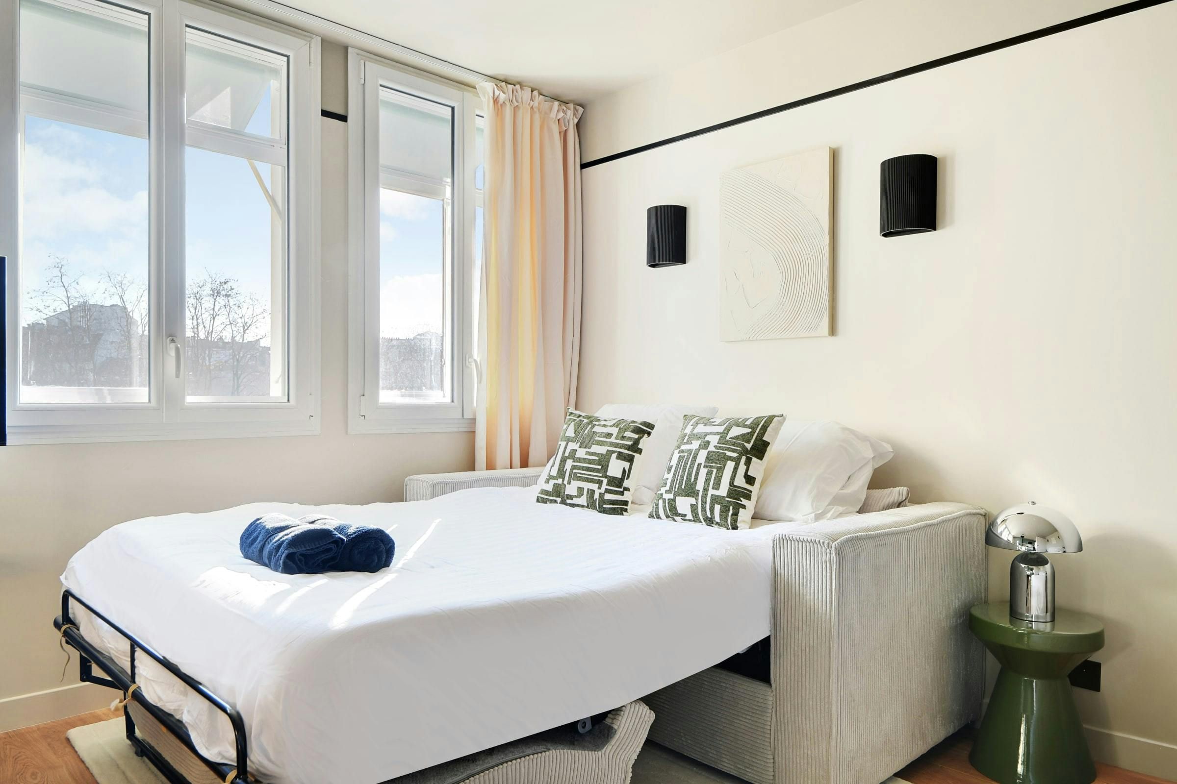 Whether you're here for work or play, this modern studio flat has you covered. Located on the edge of the city, it's a short walk to the peaceful greenery of Bois de Vincennes – with its castle, lake, and zoo – and an array of authentic bistros and bars. Inside, there's a kitchen for whipping up home-cooked meals, a dining table that can double up as a desk when work calls, and a sofa bed alongside the Queen-sized bed in the corner. It's got everything you need for a comfortable and well-connected stay.
