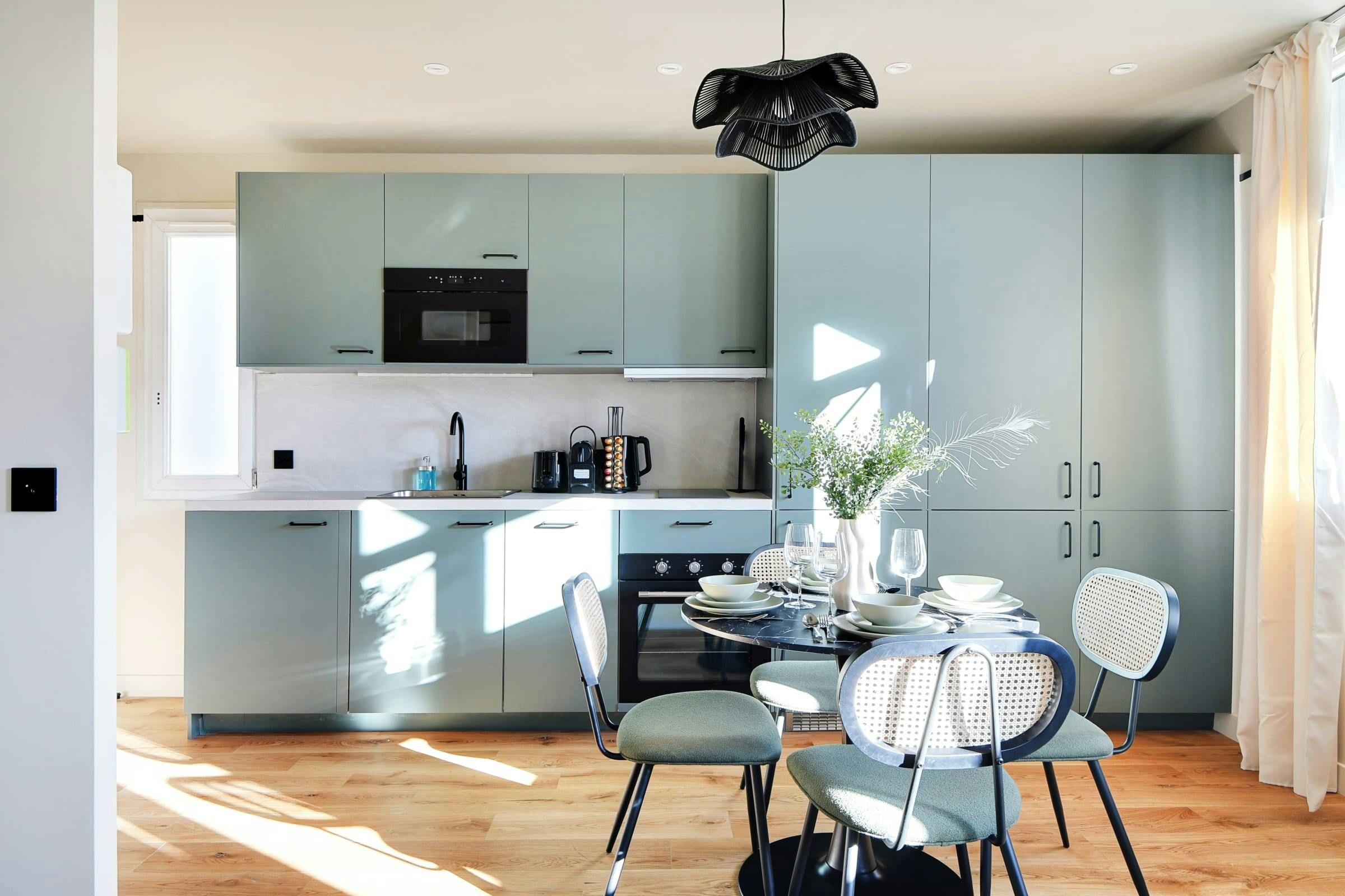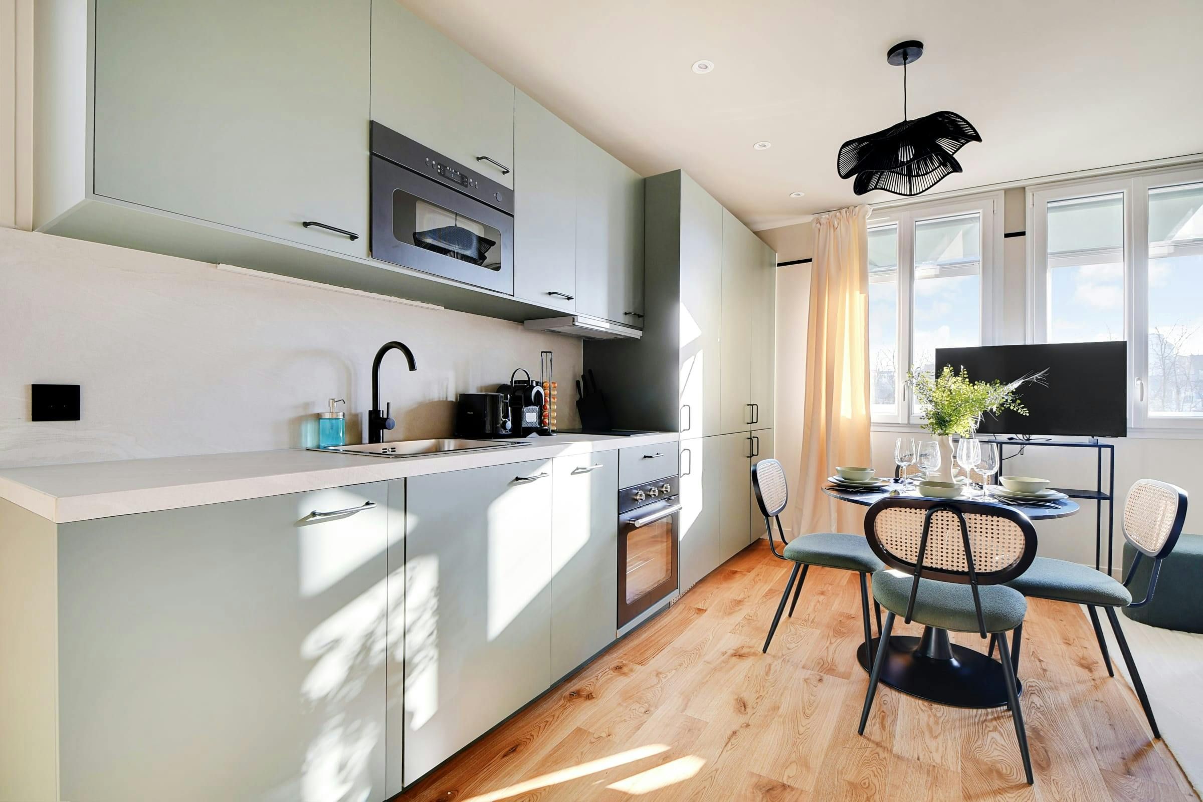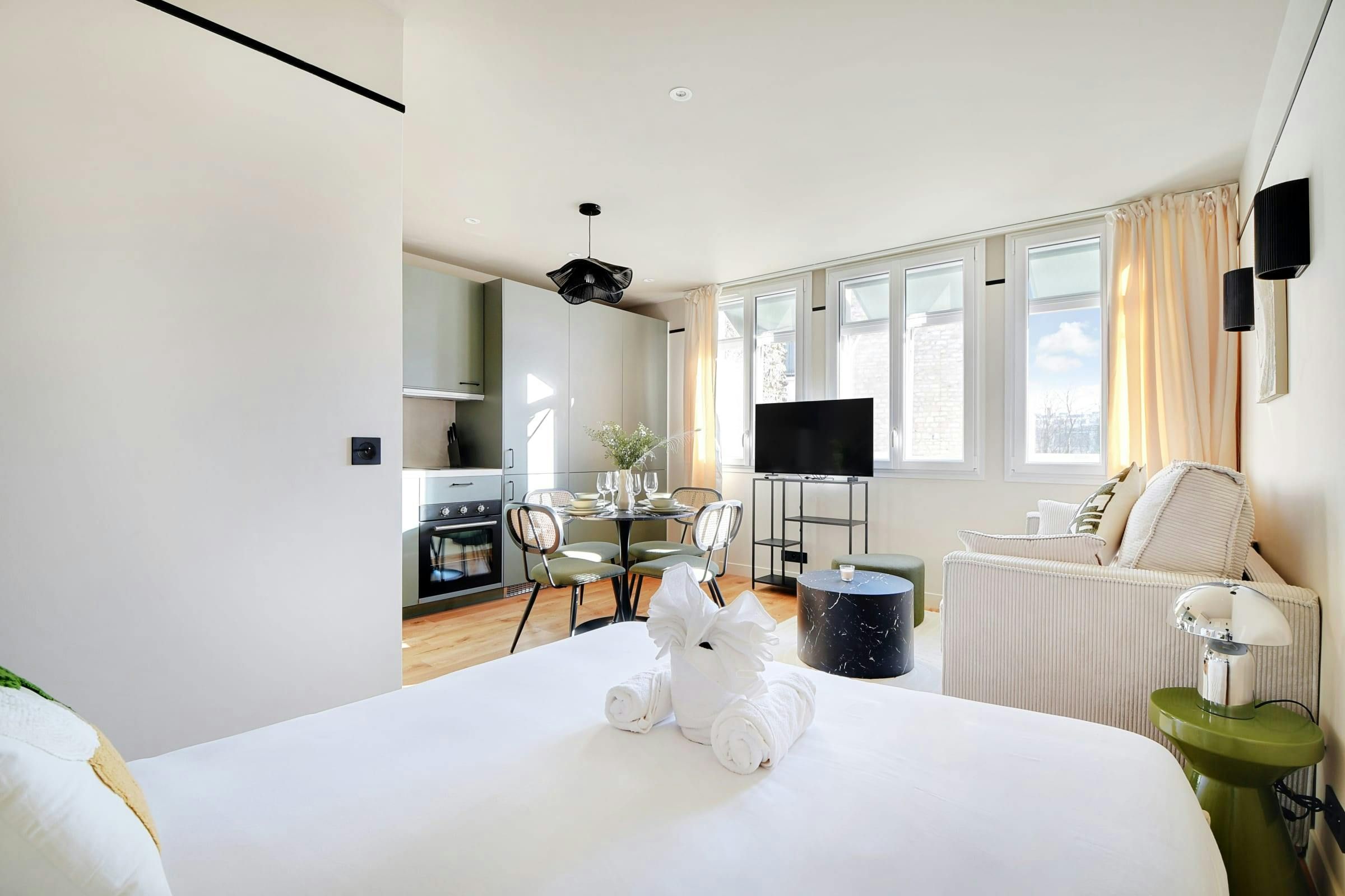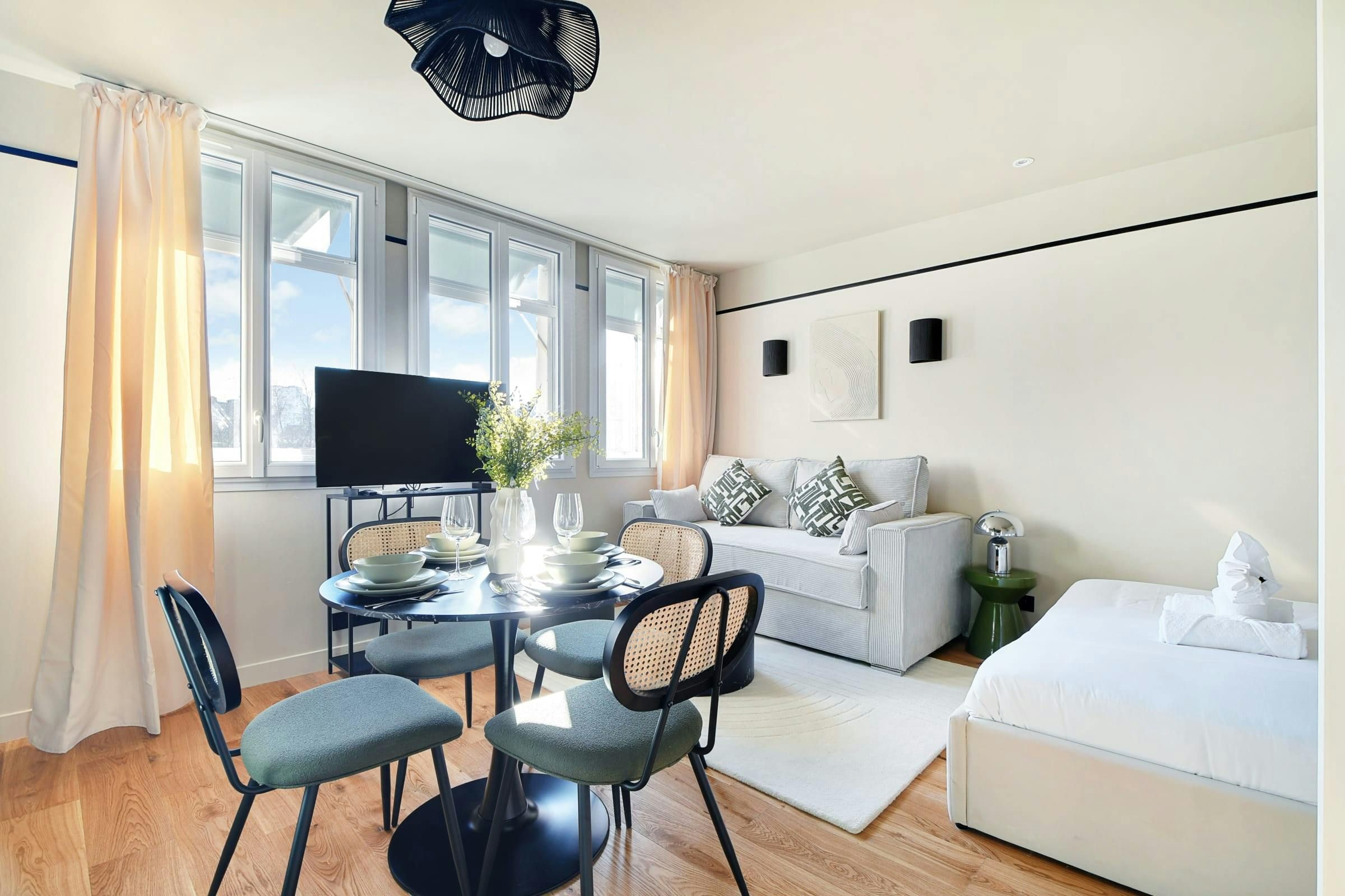 Whether you're here for work or play, this modern studio flat has you covered. Located on the edge of the city, it's a short walk to the peaceful greenery of Bois de Vincennes – with its castle, lake, and zoo – and an array of authentic bistros and bars. Inside, there's a kitchen for whipping up home-cooked meals, a dining table that can double up as a desk when work calls, and a sofa bed alongside the Queen-sized bed in the corner. It's got everything you need for a comfortable and well-connected stay.